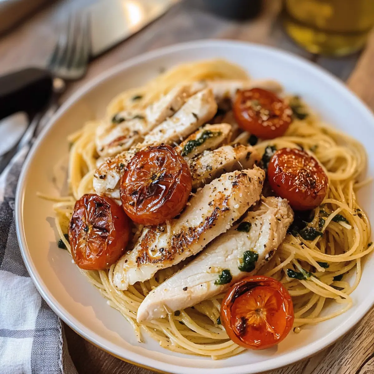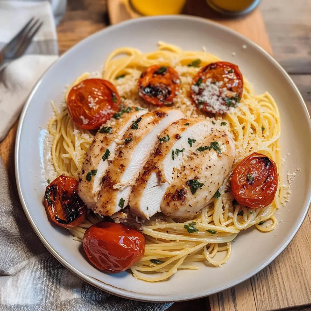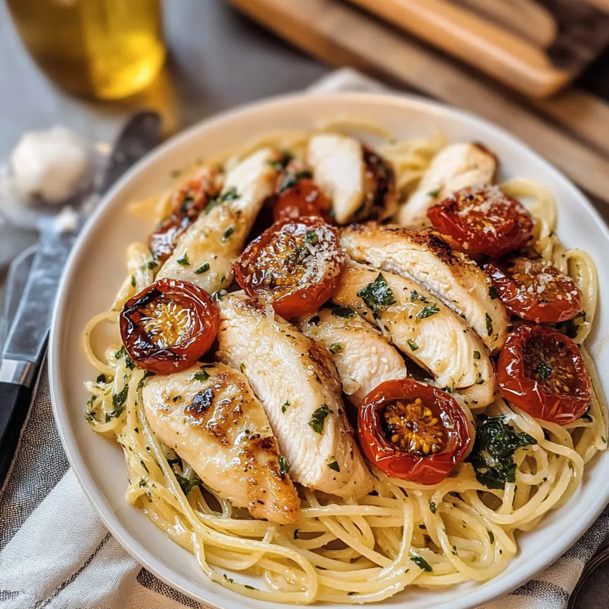 Es war ein hektischer Abend, und der Hunger nagte an mir. Ich wollte etwas, das nicht nur schnell zubereitet ist, sondern auch die Seele wärmt. Hier kommt das Knoblauch Parmesan Hähnchen Pasta ins Spiel – eine köstliche Kombination aus zartem Hähnchen, perfekt al dente Pasta und aromatischen, gerösteten Tomaten. Diese italienische Comfort Food-Kreation ist nicht nur einfach in der Zubereitung, sondern macht sich auch hervorragend bei einem gemütlichen Abendessen mit Freunden oder einem romantischen Date. Mit hellen Zitrusnoten von Zitrone und dem herzhaften Geschmack des Parmesan ist jedes Biss ein Genuss, der bleibt. Lust auf ein schnelles, köstliches Gericht, das garantiert gut ankommt? Dann bleibt dran! Warum werden Sie dieses Rezept lieben? Einfachheit: Die Zubereitung ist unkompliziert und erfordert nur grundlegende Kochkenntnisse, sodass auch Anfänger sofort loslegen können. Reichhaltiger Geschmack: Die Kombination aus Knoblauch und Parmesan sorgt für ein unvergessliches Aroma, das den Gaumen verwöhnt. Vielseitigkeit: Ob Sie frisches Gemüse hinzufügen oder die Hähnchenbrust durch Garnelen ersetzen – dieses Rezept passt sich Ihren Vorlieben an. Zeitersparnis: In nur 30 Minuten auf dem Tisch macht es ein perfektes Abendessen unter der Woche oder für ungeplante Gäste. Beliebtheit: Ihre Familie und Freunde werden sich nach diesem Gericht sehnen; es ist der heimliche Star jeder Dinnerparty. Probieren Sie dazu auch unser köstliches Thailaendisches Kokosnuss Garnelen Rezept aus! Knoblauch Parmesan Hähnchen Pasta Zutaten • Diese Zutaten bilden die Basis für Ihr leckeres Gericht! Für die Pasta Angel Hair Pasta – Ihre delikate Textur passt perfekt zur Sauce; ersetzen Sie sie bei Bedarf durch Spaghetti oder Fettuccine. Koscheres Salz – Verstärkt die Aromen; verwenden Sie Meersalz als Ersatz, wenn gewünscht. Für das Hähnchen Hähnchenbrust – Hauptprotein in diesem Gericht, sorgt für Herzhaftigkeit; verwenden Sie Hähnchenschenkel für eine saftigere Variante. Schwarzer Pfeffer – Fügt notwendige Schärfe hinzu; frisch gemahlener Pfeffer sorgt für das beste Aroma. Getrockneter Basilikum – Verleiht zusätzliche aromatische Tiefe; frischer Basilikum ist eine großartige Alternative. Für die Sauce Olivenöl – Wichtig für das Rösten und Kochen; bringt den gesamten Geschmack zur Geltung. Knoblauch – Sorgt für die aromatische Tiefe; gerösteter Knoblauch sorgt für einen milderen Geschmack. Butter – Fügt Reichhaltigkeit hinzu; kann durch eine pflanzliche Alternative für eine laktosefreie Option ersetzt werden. Geriebener Parmesan – Liefert Umami und Cremigkeit; verwenden Sie Grana Padano oder Pecorino Romano als Alternativen. Für das Gemüse Roma-Tomaten – Bringen Frische und Süße; bei Bedarf mit Kirschtomaten ersetzen. Zitrone – Verleiht dem Gericht mit ihrer Säure einen leuchtenden Akzent; verwenden Sie Limette für einen anderen Zitrusgeschmack. Für die Garnierung Frischer Basilikum – Sorgt für Frische und Farbe; probieren Sie Petersilie als alternatives Kraut. Jetzt sind Sie bereit, sich in die Zubereitung dieses köstlichen Knoblauch Parmesan Hähnchen Pasta zu stürzen! Schritt-für-Schritt-Anleitung für Knoblauch Parmesan Hähnchen Pasta Schritt 1: Pasta Kochen Bringen Sie in einem großen Topf ausreichend gesalzenes Wasser zum Kochen. Fügen Sie die Angel Hair Pasta hinzu und kochen Sie sie gemäß den Anweisungen auf der Verpackung al dente (ca. 3-5 Minuten). Wenn die Pasta fertig ist, gießen Sie sie in ein Sieb ab und stellen Sie sie beiseite, damit sie abkühlen kann. Schritt 2: Gemüse Rösten Heizen Sie den Ofen auf 230 °C vor. In einer Schüssel mischen Sie die Roma-Tomaten und die ungeschälten Knoblauchzehen mit Olivenöl, Koscherem Salz, schwarzem Pfeffer und getrocknetem Oregano. Verteilen Sie die Mischung gleichmäßig auf einem Backblech und rösten Sie sie etwa 10 Minuten. Entfernen Sie den Knoblauch und rösten Sie die Tomaten für weitere 20 Minuten, bis sie weich und leicht gebräunt sind. Schritt 3: Hähnchen Zubereiten Würzen Sie die Hähnchenbrust mit Koscherem Salz, schwarzem Pfeffer, getrocknetem Basilikum und Oregano. Erhitzen Sie in einer großen Pfanne mit etwas Olivenöl bei mittlerer Hitze und legen Sie die Hähnchenbrüste hinein. Braten Sie sie etwa 2-3 Minuten pro Seite, bis sie goldbraun und durchgegart sind (eine Innentemperatur von 75 °C ist ideal). Lassen Sie das Hähnchen danach kurz ruhen, bevor Sie es in Scheiben schneiden. Schritt 4: Sauce Zubereiten Geben Sie den gerösteten Knoblauch zurück in dieselbe Pfanne, in der Sie das Hähnchen zubereitet haben, und lassen Sie ihn kurz anbraten. Fügen Sie die Butter hinzu und lassen Sie sie schmelzen. Geben Sie dann die abgetropfte Pasta in die Pfanne und vermischen Sie alles gut, bis die Pasta gleichmäßig mit der Butter und dem Knoblauch überzogen ist. Schritt 5: Zutaten Kombinieren Fügen Sie nun die rotierten Tomaten, die in Scheiben geschnittenen Hähnchenbruststücke, frischen Basilikum und den Saft einer Zitrone hinzu. Mischen Sie alles gründlich, damit die Aromen verschmelzen. Streuen Sie großzügig frisch geriebenen Parmesan über die gesamte Pasta. Bereiten Sie alles zum Servieren vor, indem Sie es gut durchmischen und auf Tellern anrichten. Was passt gut zu Knoblauch Parmesan Hähnchen Pasta? Ein köstliches Abendessen sollte immer gut abgerundet sein. Lassen Sie sich von diesen wunderbaren Begleitgerichten inspirieren, die Ihr Essen komplettieren. Cremige Polenta: Die weiche, cremige Textur der Polenta bietet einen schönen Kontrast zur Pasta. Sie nimmt die Aromen auf und sorgt für ein unverwechselbares Geschmackserlebnis. Rucola-Salat: Frisch und leicht, verleiht dieser Salat mit seiner Pfeffrigkeit eine ausgezeichnete Balance. Ein Spritzer Zitronensaft hebt die Aromen und harmoniert perfekt mit dem Hähnchen. Knoblauchbrot: Knuspriges, aromatisches Knoblauchbrot ergänzt die Pasta herrlich. Es eignet sich hervorragend, um