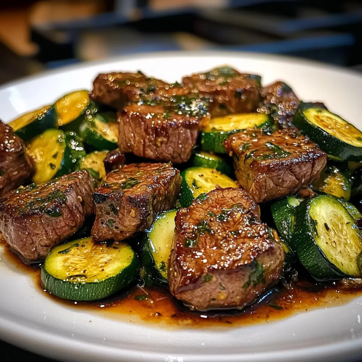 Genieße in nur 15 Minuten köstliche Knoblauchbutter-Steakbissen mit Zucchini – perfekt für ein schnelles, kohlenhydratarmes Abendessen!