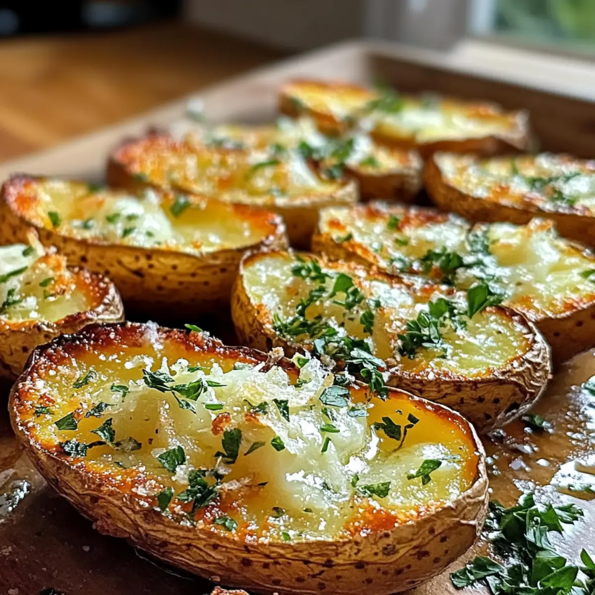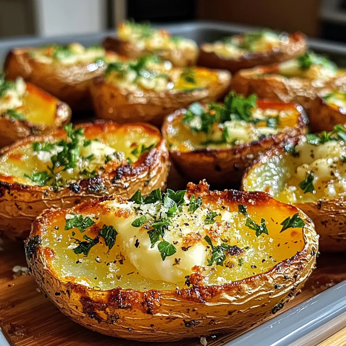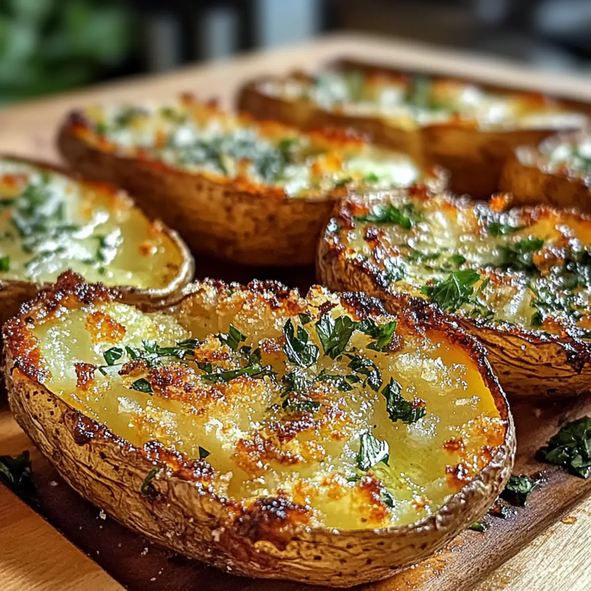 Als ich neulich in der Küche stand, begann mein Herd den verlockenden Duft von frisch gerösteten Kartoffeln und aromatischen Kräutern zu verbreiten. Das Rezept für knusprige Knoblauch-Kräuter-Röstkartoffelhäute ist nicht nur eine köstliche Abwechslung zu Fast Food, sondern auch eine wunderbare Möglichkeit, etwas Leckeres und Einladendes zu zaubern. Diese knusprigen Häute sind perfekt für dein nächstes Frühstück oder Brunch und lassen sich in weniger als einer Stunde zubereiten. Zudem bieten sie die Flexibilität, glutenfrei oder vegan zubereitet zu werden, damit sie jedem schmecken! Und wer möchte nicht ein Gericht genießen, das gleichzeitig einfach vorzubereiten und unwiderstehlich im Geschmack ist? Neugierig, wie du die perfekte Balance aus Knusprigkeit und Kräuteraroma erreichst? Lass uns gemeinsam in die Zubereitung eintauchen! Warum sind diese Kartoffelhäute so besonders? Knusprigkeit garantiert: Diese Röstkartoffelhäute sind außen goldbraun und knusprig, während sie innen fluffig bleiben – eine perfekte Textur! Aromatische Vielfalt: Mit frischem Knoblauch und einer Mischung aus Kräutern verleihen sie jedem Biss einen intensiven Geschmack. Einfache Zubereitung: In weniger als einer Stunde hast du ein köstliches Gericht, das ideal für Brunch oder das nächste Familienessen ist. Vielseitige Varianten: Egal, ob du sie glutenfrei oder vegan zubereiten möchtest, du kannst sie ganz einfach anpassen. Perfekte Zugabe: Diese Rundstücke machen sich hervorragend als Appetizer oder Beilage und überzeugen auch die größten Gourmetliebhaber! Knusprige Knoblauch-Kräuter-Röstkartoffelhäute Zutaten • Entdecke die besten Zutaten für dieses unwiderstehliche Gericht! Für die Kartoffelhäute • Russische Kartoffeln – sorgen für eine fluffige Innenseite und eine robuste Schale; Süßkartoffeln bieten eine süßere Variante. • Olivenöl – fördert das gleichmäßige Bräunen und sorgt für die herrlich knusprige Textur; verwende hochwertiges, natives Olivenöl für besseren Geschmack. • Ungesalzene Butter – verleiht den Kartoffelhäuten eine reichhaltige Note; für eine milchfreie Option kannst du pflanzliche Margarine oder geschmolzenes Kokosöl verwenden. Für die Kräuterbutter • Knoblauch (gehackt) – bringt intensiven Geschmack; frischer Knoblauch verstärkt das Aroma, kann aber bei Bedarf weggelassen werden. • Frischer Rosmarin (fein gehackt) – verbindet das Gericht mit erdigen Aromen; ersetze ihn durch Thymian oder Salbei, wenn gewünscht. • Frische Thymianblätter – ergänzen den Rosmarin mit aromatischen Noten; bei Bedarf mit getrocknetem Thymian ersetzen (1/3 der Menge verwenden). • Frische Petersilie (gehackt) – sorgt für eine frische Note und verschönert das Gericht; kannst sie durch Schnittlauch oder Koriander ersetzen. • Zitronenschale – fügt eine erfrischende Note hinzu; in der Not kann Essig als säuerlicher Ersatz verwendet werden. Für die Würzung • Meersalz – hebt die anderen Aromen hervor; abschmecken und darauf achten, nicht zu viel zu verwenden, um die Kräuteraromen zu bewahren. • Schwarzer Pfeffer (frisch gemahlen) – bringt Wärme und Tiefe; weißer Pfeffer kann für einen milderen Geschmack verwendet werden. • Rote Paprikaflocken (optional) – fügt eine subtile Schärfe hinzu; weglassen für eine milde Variante oder mit geräuchertem Paprika ersetzen für eine rauchige Note. Mit diesen Zutaten bist du bestens gerüstet, um die köstlichen Knusprigen Knoblauch-Kräuter-Röstkartoffelhäute zuzubereiten, die jedem Geschmack gerecht werden! Schritt-für-Schritt-Anleitung für Knusprige Knoblauch-Kräuter-Röstkartoffelhäute Step 1: Ofen vorheizen Heize den Ofen auf 220 °C vor, idealerweise mit Umluft, um gleichmäßige Bräunung zu gewährleisten. Ein vorgeheizter Ofen sorgt dafür, dass die Kartoffelhäute sofort beginnen zu rösten, was zur perfekten Knusprigkeit führt. Bereite ein Backblech vor, indem du es mit Backpapier auslegst, um ein Anhaften zu vermeiden. Step 2: Kartoffeln vorbereiten Wasche die russischen Kartoffeln gründlich unter kaltem Wasser und trockne sie mit einem Küchentuch ab. Schneide die Kartoffeln nun der Länge nach in zwei Hälften. Diese Vorbereitung ist wichtig, damit die Kartoffelhäute eine gleichmäßige Bräunung erreichen und innen fluffig bleiben. Step 3: Kartoffeln würzen Pinsel beide Seiten der Kartoffelhälften großzügig mit hochwertigem Olivenöl ein. Streue dann Meersalz und frisch gemahlenen schwarzen Pfeffer über die Hälften, um die Aromen zu betonen. Diese würzige Basis trägt dazu bei, dass die Knusprigen Knoblauch-Kräuter-Röstkartoffelhäute geschmacklich überzeugen. Step 4: Kartoffeln rösten Lege die gewürzten Kartoffelhälften mit der Schnittfläche nach unten auf das Backblech. Röste die Kartoffeln im vorgeheizten Ofen für etwa 20-25 Minuten, bis die Schalen außen goldbraun und knusprig sind. Achte darauf, sie während des Röstens nicht zu übersehen, damit sie nicht verbrennen. Step 5: Kräuterbutter herstellen Während die Kartoffeln rösten, kannst du die aromatische Kräuterbutter zubereiten. Vermische die weiche, ungesalzene Butter in einer Schüssel mit dem gehackten Knoblauch, Rosmarin, Thymian, Petersilie, Zitronenschale und den optionalen roten Paprikaflocken. Rühre gut um, bis eine glatte Paste entsteht, die später auf die Häute aufgetragen wird. Step 6: Kartoffeln umdrehen und bestreichen Nimm die gerösteten Kartoffelhälften aus dem Ofen und drehe sie vorsichtig um, sodass die Schnittfläche nach oben zeigt. Verteiler die vorbereitete Kräuterbutter großzügig auf den heißen Kartoffelhäuten. Dies sorgt dafür, dass die Aromen in die Häute einziehen und sie noch schmackhafter machen. Step 7: Zweite Röstphase Setze die Kartoffeln für weitere 10-15 Minuten zurück in den Ofen, bis sie goldbraun und knusprig sind. Behalte sie im Auge, um sicherzustellen, dass sie nicht zu dunkel werden. Diese zweite Rösti-Phase ist e