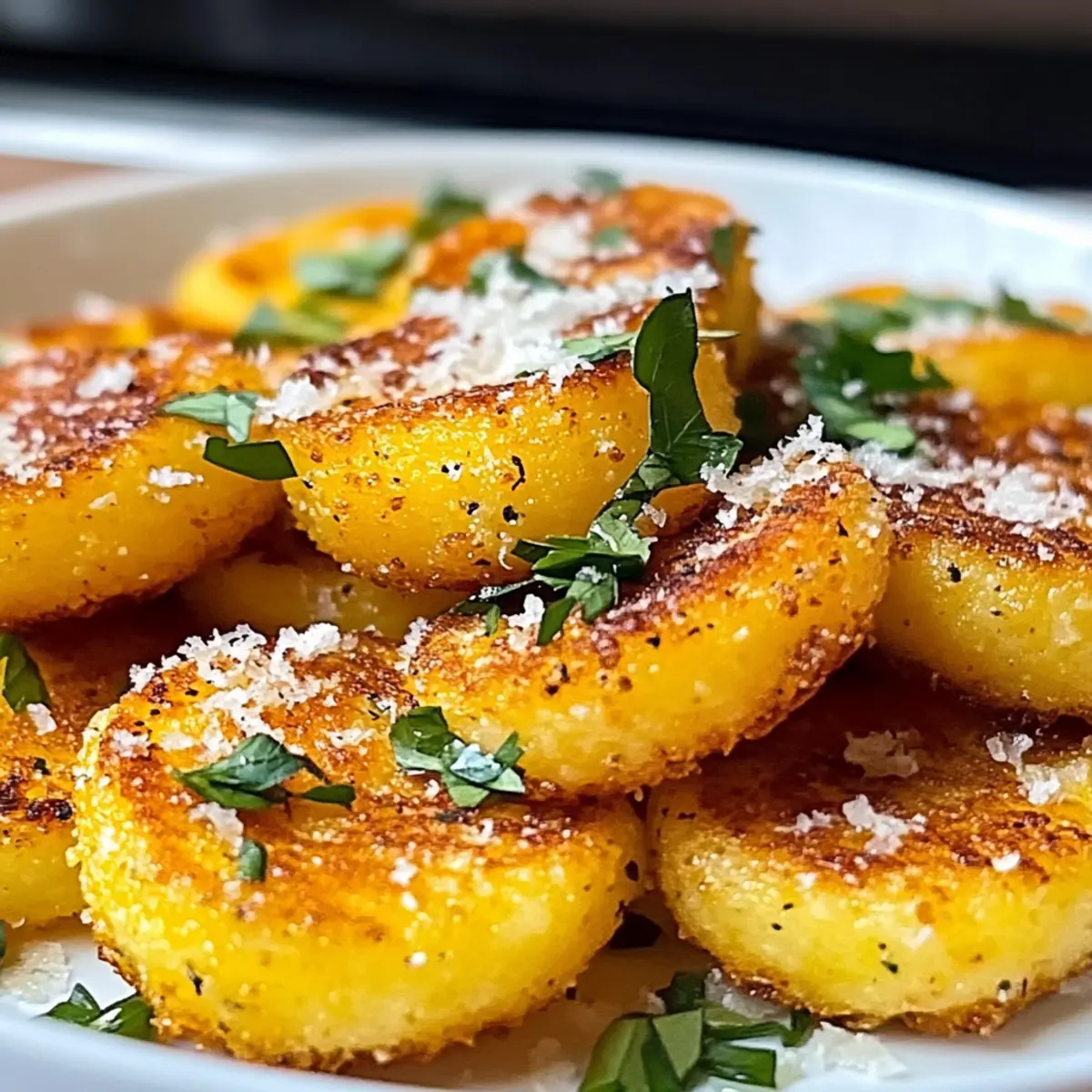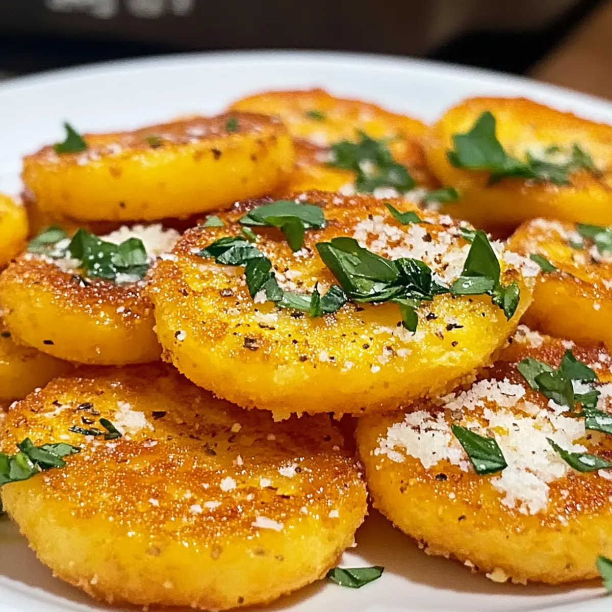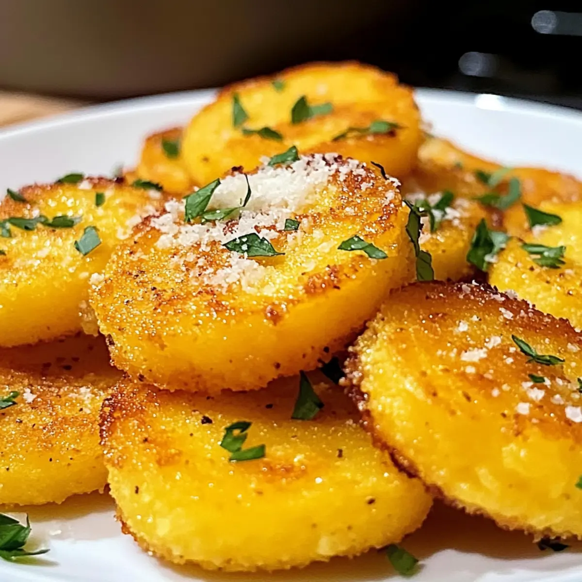 In einem gemütlichen Café in der italienischen Toskana zischten frische polentafrittierte Snacks in der Pfanne, und der verführerische Duft von geriebenem Parmesan erfüllte die Luft. Diese knusprigen Parmesan-Polenta-Runden sind nicht nur ein Hochgenuss für den Gaumen, sondern auch ein schnelles, glutenfreies Snackwunder, das sich perfekt für gesellige Abende oder entspannte Nachmittage eignet. Mit ihrer goldbraunen Kruste und dem herzhaften Käseüberzug sind sie eine Einladung zum Ausprobieren – ganz gleich, ob du sie mit klassischem Pesto oder einer würzigen Marinara-Sauce servierst. Sie sind vielseitig und lassen sich mit verschiedenen Toppings individuell anpassen, was sie zu einem absoluten Publikumsliebling macht. Bist du bereit, den nächsten kulinarischen Hit in deiner Küche auszuprobieren? Lass uns loslegen! Warum sind diese Polenta-Runden so besonders? Knusprigkeit in Perfektion: Die goldbraune Kruste der Polenta-Runden sorgt für einen unwiderstehlichen Crunch, der jeden Snackabend aufpeppt. Vielfalt der Toppings: Egal ob mit Pesto, Käse oder Gemüse – die Möglichkeiten sind endlos und passen zu jedem Geschmack. Schnelle Zubereitung: In nur wenigen Minuten hast du einen köstlichen Snack, perfekt für Überraschungsbesuche oder eine gemütliche Auffrischung für dich selbst. Glutenfrei und vegetarisch: Ideal für alle, die gesunde Alternativen zu traditionellen Snacks suchen. Diese Runden sind ein Hit, auch bei Gästen mit speziellen diätetischen Bedürfnissen. Hast du Lust auf weitere Ideen? Schau dir auch unsere Philly Cheesesteak Schalen oder das Keto Philly Cheesesteak an, um dein Appetit zu stillen! Knusprige Parmesan-Polenta-Runden Zutaten Für die Polenta-Runden: Röhrenpolenta – Die Basiszutat, sofort einsatzbereit und spart Zeit in der Vorbereitung. Geriebener Parmesan – Sorgt für eine herzhafte Kruste; stelle ihn bei Bedarf durch Hefeflocken als milchfreie Option ein. Knoblauchpulver – Verleiht zusätzlichen Geschmack; frischer, gehackter Knoblauch sorgt für einen intensiveren Aroma. Salz & Pfeffer – Zum Würzen; nach Geschmack anpassen. Olivenöl – Zum Braten verwendet; kann durch Raps- oder Avocadoöl ersetzt werden. Für das Servieren: Frische Kräuter – Für eine aromatische Garnitur und einen frischen Geschmack. Dips oder Saucen – Probiere Klassisches wie Marinara oder etwas Ausgefallenes wie Basilikumpesto. Diese knusprigen Parmesan-Polenta-Runden sind ein schmackhaftes Highlight und können nach Belieben angepasst werden! Schritt-für-Schritt-Anleitung für Knusprige Parmesan-Polenta-Runden Step 1: Polenta vorbereiten Schneide die Röhrenpolenta in 1,5 cm dicke Runden und lege sie auf ein sauberes Küchentuch. Achte darauf, dass die Runden trocken sind, damit sie später schön knusprig werden. Diese Vorbereitungszeit dauert etwa 5 Minuten und ist entscheidend für die Textur der knusprigen Parmesan-Polenta-Runden. Step 2: Runden wälzen Bestreue die Polenta-Runden gleichmäßig mit Knoblauchpulver, Salz, Pfeffer und einer großzügigen Schicht geriebenem Parmesan auf beiden Seiten. Drücke die Gewürze sanft an, sodass sie gut haften. Dies trägt zur Intensität des Geschmacks bei und dauert nur etwa 5 Minuten. Step 3: Braten Erhitze 2 Esslöffel Olivenöl in einer großen beschichteten Pfanne bei mittlerer Hitze. Wenn das Öl heiß ist, lege die Polenta-Runden vorsichtig in die Pfanne, aber überfülle sie nicht. Brate die Runden für etwa 4-5 Minuten auf jeder Seite, bis sie goldbraun und knusprig sind. Achte auf einen schönen Bräunungston. Step 4: Servieren Übertrage die knusprigen Parmesan-Polenta-Runden auf einen mit Küchenpapier ausgelegten Teller, um überschüssiges Öl abtropfen zu lassen. Garniere die Runden mit frischen Kräutern, wenn gewünscht, und serviere sie warm mit deinen bevorzugten Dips oder Saucen. Diese herzhaften Snacks sind jetzt bereit, genossen zu werden! Was passt zu knusprigen Parmesan-Polenta-Runden? Die perfekten Begleiter verwandeln deine knusprigen Parmesan-Polenta-Runden in ein komplettes Geschmackserlebnis, das alle begeistert. Frische Kräutersalat: Ein leichter, grüner Salat aus Rucola und Basilikum bringt Frische und Geschmack und harmoniert wunderbar mit den herzhaften Runden. Klassische Marinara-Sauce: Diese aromatische Tomatensauce ergänzt die Polenta-Runden perfekt und bringt eine schöne Säure ins Spiel. Es ist der ideale Dip, der jeden Bissen aufregend macht. Basilikumpesto: Der nussige, intense Geschmack von Pesto bietet einen wundervollen Kontrast zur Käsigkeit der Polenta. Es verleiht jedem Bissen ein mediterranes Flair und passt hervorragend zur Textur. Geröstetes Gemüse: Eine Mischung aus buntem, geröstetem Gemüse wie Paprika und Zucchini sorgt für einen köstlichen, süßen Kontrast und bringt Farbe sowie Nährstoffe auf den Teller. Diese gesunde Beilage ist ein Hit! Cremige Aioli: Dieses Knoblauch-Dip verleiht den Runden eine zusätzliche Schicht von Geschmack, während die cremige Textur und der würzige Geschmack perfekt zusammenpassen. Ein Muss für Liebhaber von intensiven Aromen! Weißwein: Ein Glas trockener Weißwein, wie Sauvignon Blanc, ergänzt die herzhaften Polenta-Runden und bringt eine erfrischende Note in dein Essen. Ideal, um die Aromen zu verheiraten und das Erlebnis zu verfeinern. Aufbewahrungstipps für Knusprige Parmesan-Polenta-Runden Raumtemperatur: Lass die Runden vollständig abkühlen, bevor du sie bei Raumtemperatur für bis zu 2 Stunden aufbewahrst. Kühlschrank: Bewahre übrig gebliebene knusprige Parmesan-Polenta-Runden in einem luftdichten Behälter im Kühlschrank auf, um ihre Frische bis zu 3 Tage zu erhalten. Gefriertruhe: Für eine längere Lagerung kannst du die Runden einzeln auf einem Teller einfrieren, bevor du sie in einen vakuumierten Beutel umpackst. Gefroren halten sie bis zu 2 Monate. Wiederaufwärmen: Für die beste Textur empfehle ich, die Runden vor dem Servieren in einer Pfanne bei mittlerer Hitze erneut zu braten, bis
