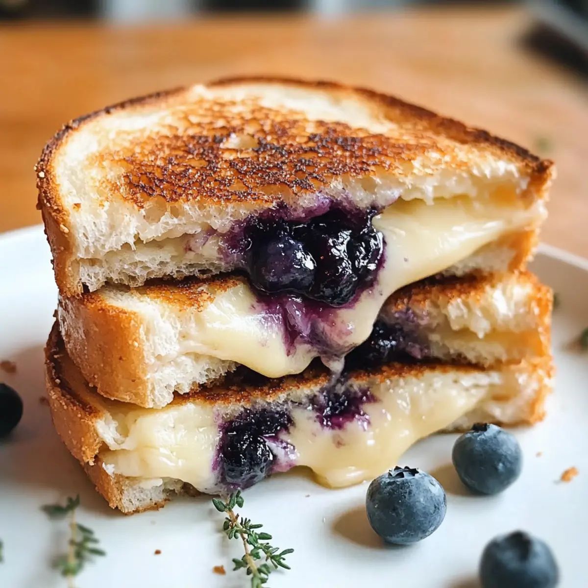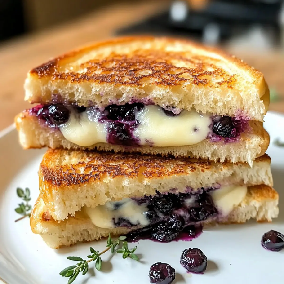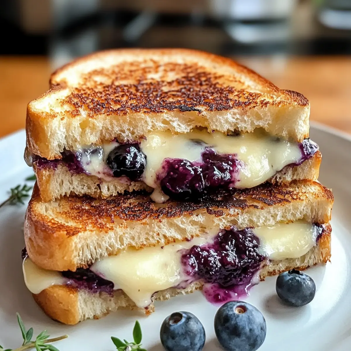 Sobald die Sandwiches fertig sind, nehmen Sie sie aus der Pfanne und lassen Sie sie ein paar Sekunden ruhen. Schneiden Sie sie in der Mitte durch und servieren Sie sie warm. Optional können Sie die Sandwiches mit etwas zusätzlichem Zitronenthymian oder einer Prise Meersalz bestreuen, um den Geschmack zu verfeinern. Jetzt können Sie Ihren Knusprigen Blaubeer-Überbackenen Käse genießen!