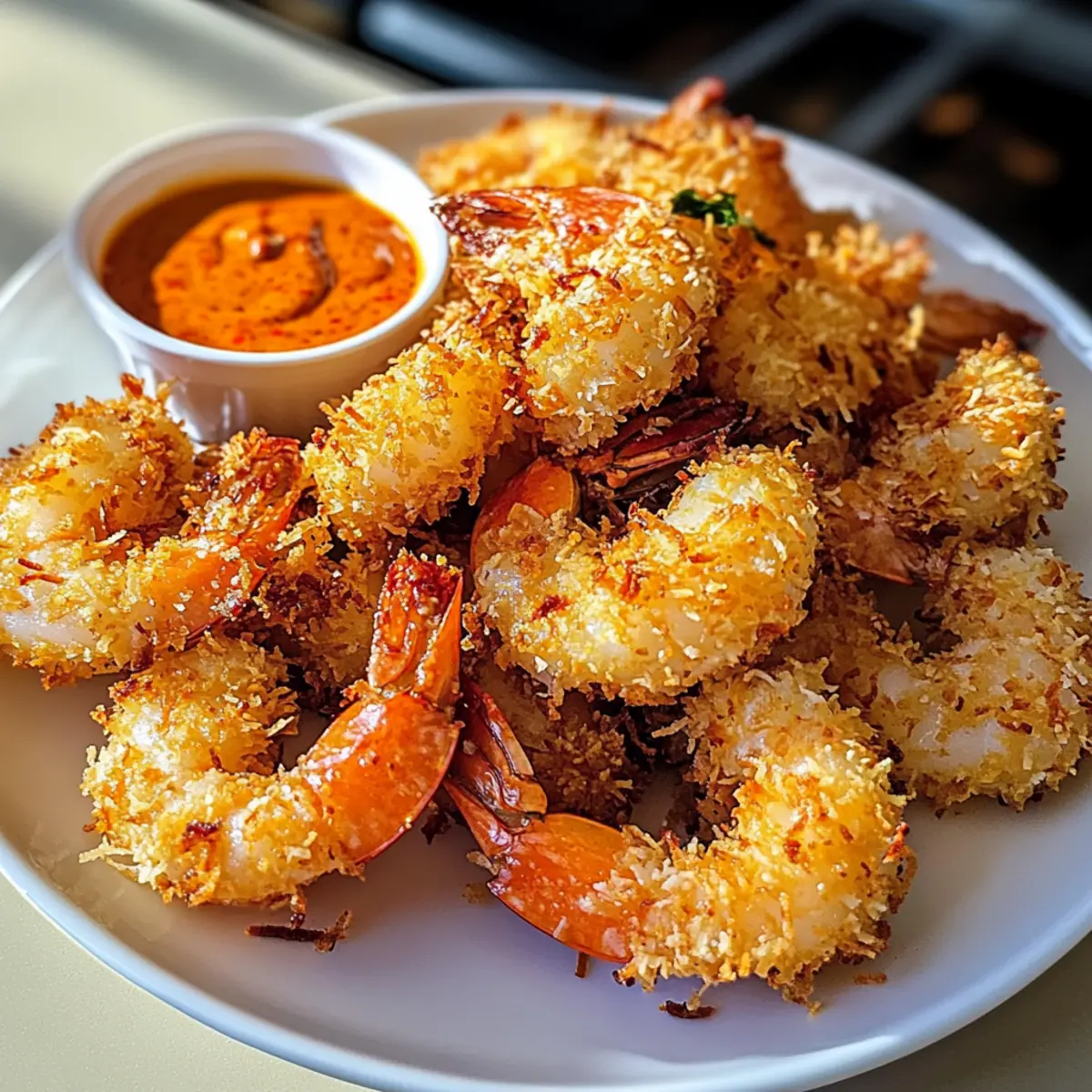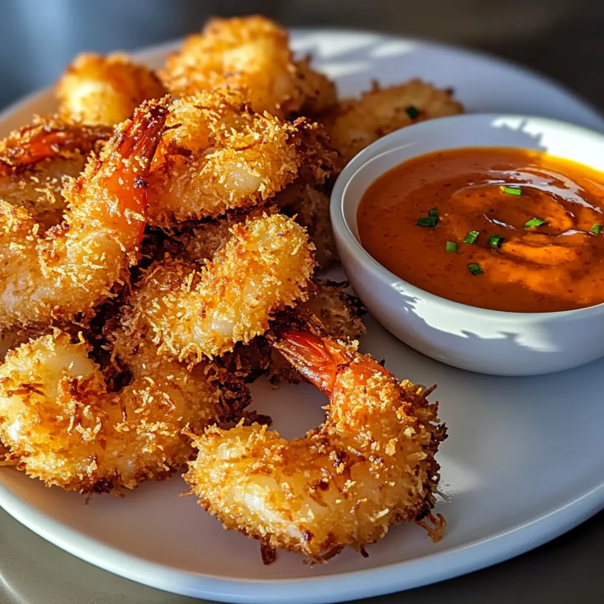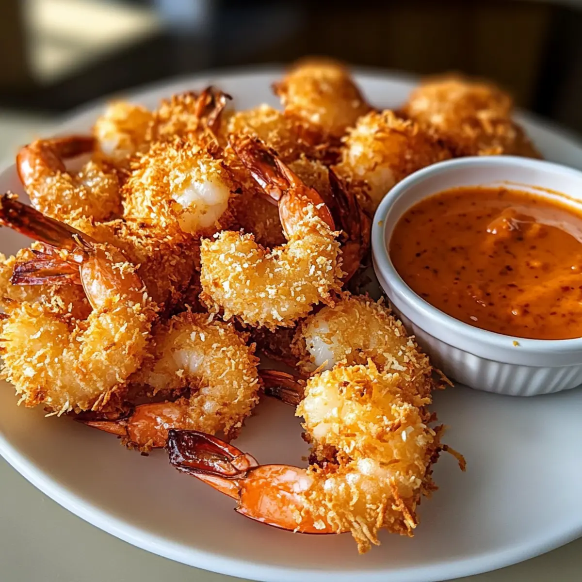 Als ich neulich auf einer tropischen Insel entspannte, wurde mir klar, dass nichts die Urlaubssehnüchte so sehr wecken kann wie Kokosnussgarnelen. Mit ihrer perfekten Knusprigkeit und dem süßen Aroma von Kokosnuss erwecken sie Erinnerungen an unbeschwerte Sommerabende. Dieses Rezept für knusprige Kokosnussgarnelen mit einer unwiderstehlichen süß-scharfen Chili-Mayo ist nicht nur ein echter Hingucker für jede Party, sondern auch kinderleicht zuzubereiten! Perfekt als Appetizer oder Hauptgericht, bieten sie eine schmackhafte Abwechslung zu den üblichen Schnellgerichten. Außerdem kannst du sie nach Belieben im Ofen oder Airfryer zubereiten, was gleich noch eine gesunde Variante darstellt. Bist du bereit, deine Gäste mit diesem tropischen Genuss zu überraschen? Warum sind diese Kokosnussgarnelen unwiderstehlich? Knusprige Textur: Die perfekte Kombination aus Panko und Kokosnuss sorgt für einen köstlichen Crunch, der begeistert. Einfache Zubereitung: Dieses Rezept erfordert kein Kochen auf Restaurantniveau – du kannst es spielend leicht zu Hause nachmachen! Vielseitig: Ob im Ofen oder Airfryer, du hast die Wahl, wie du deine Garnelen zubereiten möchtest. Tropisches Aroma: Jeder Biss erinnert an den Sommer und weckt Urlaubsgefühle. Großer Publikumsliebling: Diese Garnelen sind ein echter Hit auf jeder Party und ideal als Fingerfood. Verwöhne deine Gäste auch mit einem frischen Salat oder einer schmackhaften Beilage, um das Erlebnis abzurunden! Kokosnussgarnelen Zutaten • Damit deine Kokosnussgarnelen perfekt gelingen, findest du hier die wichtigsten Zutaten und einige nützliche Tipps! Für die Garnelen Große Garnelen – Achte darauf, dass sie geschält und entdarmt sind, um die beste Textur zu erhalten. Allzweckmehl – Dieses Mehl bietet eine gewürzte Schicht, die für die Struktur sorgt; du kannst auch glutenfreies Mehl verwenden. Eier – Sie wirken als Kleber für die Panade und sorgen für eine gleichmäßige Beschichtung. Gesüßte Kokosnussraspeln – Verleihen jedem Biss eine süße tropische Note; ungesüßte Kokosnuss kann ebenfalls verwendet werden, aber eventuell mit zusätzlichem Zucker. Panko-Brösel – Diese sorgen für die knusprige Textur, die das Erlebnis abrundet; reguläre Semmelbrösel sind ein Ersatz, aber liefern nicht den gleichen Crunch. Salz und schwarzer Pfeffer – Würze das Mehl für zusätzlichen Geschmack; nach Belieben anpassen. Pflanzenöl – Damit frittierst du die Garnelen und sorgst für die knusprige Textur; achte darauf, dass das Öl eine Temperatur von 175°C hat. Für die Dipsauce Mayonnaise – Die Basis der Sauce für cremigen Geschmack. Süße Chilisauce – Fügt eine süße und leicht würzige Note hinzu; perfekt als Begleiter zu deinen Kokosnussgarnelen. Limettensaft – Gibt eine säuerliche Frische, die die Reichhaltigkeit der Garnelen ausgleicht. Zucker – Intensiviert die Süße der Salsa; nach Geschmack anpassen. Viel Spaß beim Zubereiten deiner Kokosnussgarnelen! Schritt-für-Schritt-Anleitung für Kokosnussgarnelen mit süßer Chili-Mayo Schritt 1: Garnelen vorbereiten Trockne die großen Garnelen gründlich mit Küchenpapier ab, damit die Panade optimal haftet. Achte darauf, dass die Garnelen geschält und entdarmt sind. Diese Vorbereitung sorgt für eine bessere Textur und verhindert, dass sie beim Frittieren wässerig werden. Schritt 2: Panierstation einrichten Richte drei flache Schalen für die Panierarbeit ein: Die erste mit gewürztem Allzweckmehl, die zweite mit verquirlten Eiern, und die dritte mit einer Mischung aus gesüßten Kokosnussraspeln und Panko-Bröseln. Achte darauf, dass die Schalen nahe beieinander stehen, um einen reibungslosen Ablauf zu gewährleisten. Schritt 3: Garnelen panieren Nimm eine Garnelen und wälze sie zuerst im gewürzten Mehl, bis sie gleichmäßig bedeckt sind. Tauche sie dann in die verquirlten Eier, bevor du sie gründlich in der Kokosnuss-Panko-Mischung wendest. Lege die panierten Garnelen auf ein Backblech und wiederhole diesen Vorgang mit den restlichen Garnelen. Schritt 4: Dipsauce zubereiten In einer Schüssel die Mayonnaise mit der süßen Chilisauce, dem Limettensaft und dem Zucker gut vermischen, bis eine glatte Sauce entsteht. Schmecke die Sauce ab und passe die Süße nach deinem Geschmack an. Stelle die Dipsauce beiseite, damit sie die Aromenziehen kann. Schritt 5: Öl erhitzen Erhitze in einer tiefen Pfanne das Pflanzenöl auf 175°C (350°F). Verwende ein Kü thermometer, um die Temperatur genau im Auge zu behalten. Das heiße Öl sorgt dafür, dass die Kokosnussgarnelen rundum knusprig werden. Schritt 6: Garnelen frittieren Frittiere die Garnelen portionsweise für etwa 2-3 Minuten pro Seite, bis sie goldbraun und knusprig sind. Achte darauf, die Pfanne nicht zu überfüllen, damit die Garnelen gleichmäßig garen können und ihre schöne goldene Farbe erhalten. Schritt 7: Garnelen abtropfen lassen Entferne die frittierten Garnelen mit einem Schaumlöffel und lege sie auf ein Drahtgestell über Küchenpapier, um überschüssiges Öl abtropfen zu lassen. So bleibt die knusprige Textur erhalten und die Garnelen werden nicht ölig. Schritt 8: Servieren Die Kokosnussgarnelen warm servieren und mit der süßen Chili-Mayo-Dipsauce anrichten. Platziere sie auf einem schönen Teller und genieße den tropischen Geschmack mit jedem Biss. Expertentipps für Kokosnussgarnelen Garnelen vorbereiten: Trockne die Garnelen gründlich ab, damit die Panade optimal haftet und nicht abfällt. Feuchtigkeit ist der Feind knuspriger Kokosnussgarnelen! Panade richtig anwenden: Achte darauf, dass die Garnelen gleichmäßig im Mehl, Ei und der Kokosnuss-Panko-Mischung gewälzt sind. Ungleichmäßige Beschichtung führt zu ungleichmäßigem Frittieren. Öltemperatur überwachen: Halte die Öltemperatur bei 175°C (350°F). Eine stetige Temperatur ist entscheidend für knusprige Kokosnussgarnelen; zu heißes Öl kann sie verbrennen, zu kaltes Öl macht sie weich. Keine Überfüllung: F
