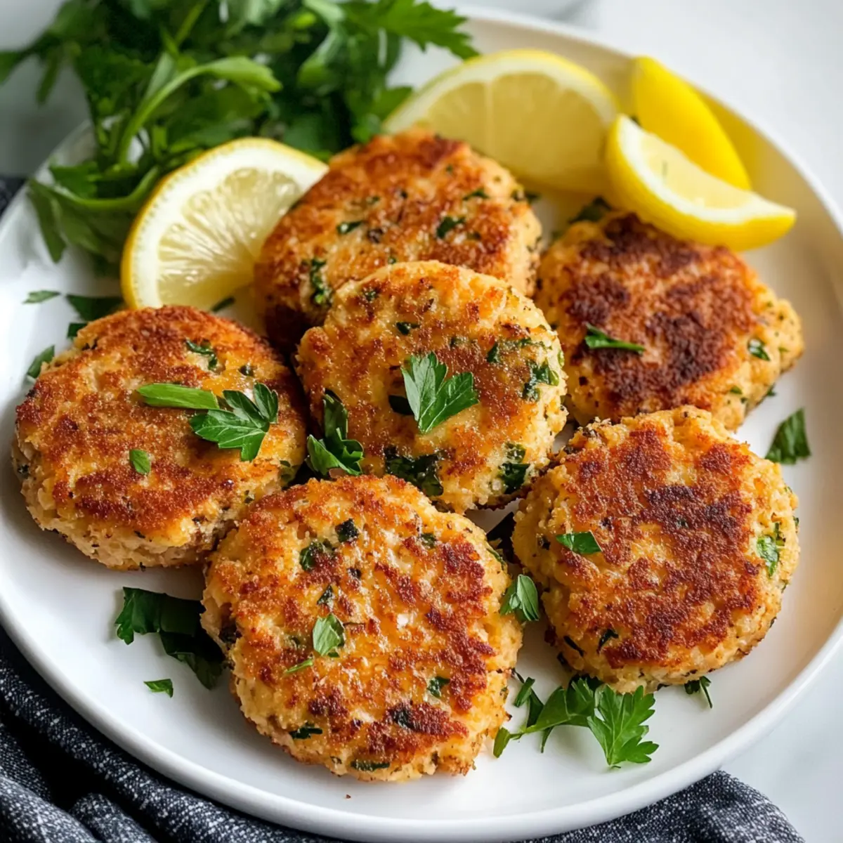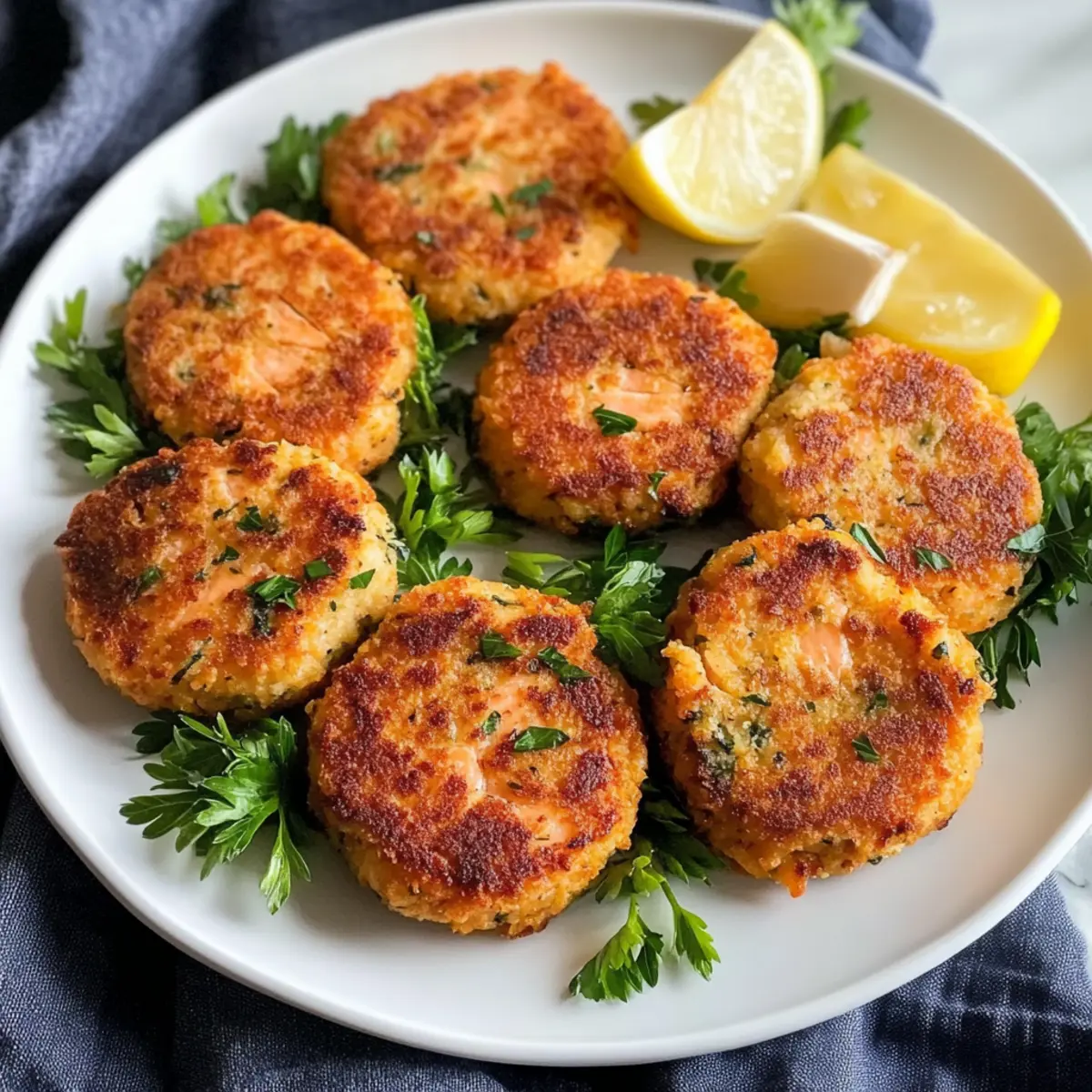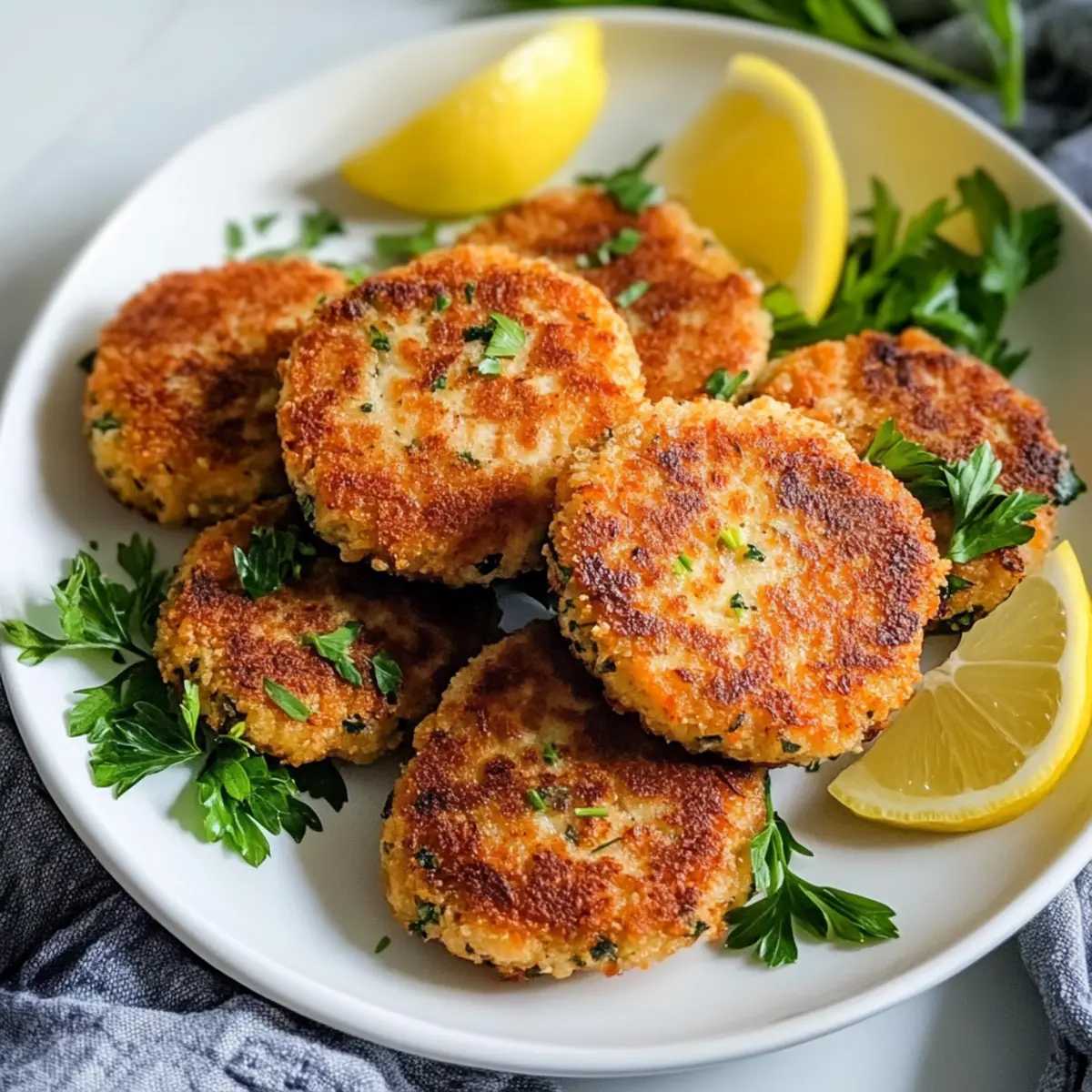 Es war einmal ein spätsommerlicher Abend, als ich auf der Suche nach einer schnellen, aber köstlichen Mahlzeit war. Die Idee, Lachsfrikadellen mit Zitrone zuzubereiten, hatte mich sofort begeistert. Diese kleinen Köstlichkeiten vereinen einen wunderbar knusprigen Außenrand mit einem zarten, saftigen Inneren, das von einem spritzigen Zitronenkick belebt wird. Das Beste daran? Sie sind nicht nur blitzschnell zubereitet, sondern auch ein gesundes Komfortessen, das jeden Esstisch aufwertet. Mit ein wenig Kreativität lassen sie sich ganz nach deinem Geschmack anpassen, sodass du deiner Kulinarik freien Lauf lassen kannst. Bist du bereit, deine eigenen Lachsfrikadellen zu zaubern und für Begeisterung bei Familie und Freunden zu sorgen? Warum sind Lachsfrikadellen so beliebt? Einfachheit, die begeistert: Die Zubereitung dieser Lachsfrikadellen ist wirklich unkompliziert und erfordert nur grundlegende Kochkenntnisse. Vielfältige Anpassungsmöglichkeiten: Du kannst die Zutaten leicht variieren, indem du deiner Kreativität freien Lauf lässt—beispielsweise durch die Zugabe von frischen Kräutern wie Dill oder Koriander. Gesunde Genussmomente: Diese Patties sind nicht nur lecker, sondern auch eine hervorragende Quelle für Omega-3-Fettsäuren — ideal für eine ausgewogene Ernährung! Kombinationsfreudig: Perfekt als Snack, Hauptgericht oder sogar als Slider mit Avocado und Remoulade. Dazu passen frische Salate oder knusprige Ofenkartoffeln, wie die Gebackenen Kartoffelscheiben. Schneller Erfolg: In weniger als 30 Minuten bist du fertig und bereit, deine Gäste zu beeindrucken — probiere es aus und entdecke, wie einfach selbstgemachtes Fast Food sein kann! Lachsfrikadellen mit Zitrone Zutaten • Diese Zutatenliste für Lachsfrikadellen mit Zitrone wird dich sicher inspirieren! Für die Frikadellen Hautloser Lachs – die Hauptproteinquelle, die für den besten Geschmack frisch oder aufgetaut sein sollte. Panko-Semmelbrösel – sorgt für eine knusprige Panade und verhindert, dass die Frikadellen zu dicht werden. Frische Petersilie – bringt eine lebendige Frische und einen schönen Farbkontrast. Frühlingzwiebeln – milder Zwiebelgeschmack, der die anderen Aromen ergänzt, ohne sie zu überdecken. Knoblauchzehe – fügt eine subtile, herzhafte Tiefe hinzu; Geschmack nach Belieben anpassen. Mayonnaise – sorgt für Feuchtigkeit und Reichhaltigkeit; für eine kalorienärmere Variante verwende leichte Mayonnaise. Zitronenschale und -stücke – verleiht einen spritzigen, zitrusartigen Geschmack – wichtig für die passende Servierung. Dijon-Senf – bietet einen würzigen Geschmack, der den Lachs perfekt ergänzt. Old Bay Gewürzmischung – klassische Meeresfrüchte-Gewürze, die den Gesamtgeschmack verstärken. Eigelb – dient als Bindemittel und sorgt dafür, dass die Frikadellen ihre Form behalten und trotzdem zart sind. Salz und schwarzer Pfeffer – für die grundlegende Würzung; nach Geschmack anpassen. Olivenöl – wird zum Braten verwendet und gibt den Frikadellen eine goldene Kruste. Für das Servieren Frische Zitronenscheiben – zum Garnieren und für zusätzlichen Geschmack. Mehr frische Petersilie – zur Dekoration und für mehr Frische. Entdecke die köstlichen Möglichkeiten, die dir diese Lachsfrikadellen mit Zitrone bieten! Schritt-für-Schritt-Anleitung für Lachsfrikadellen mit Zitrone Step 1: Lachs vorbereiten Zuerst den hautlosen Lachs grob in 0,5 cm große Stücke schneiden oder in einer Küchenmaschine kurz pürieren, bis er zerkleinert ist. Achte darauf, ihn nicht zu übermixen, um die Textur zu erhalten. Dies dauert nur wenige Minuten und ist der erste Schritt zu deinen köstlichen Lachsfrikadellen mit Zitrone. Step 2: Zutaten vermengen In einer mittelgroßen Schüssel 60 ml Panko-Semmelbrösel, frische Petersilie, gehackte Frühlingszwiebeln, die zerdrückte Knoblauchzehe, Mayonnaise, Zitronenschale, Dijon-Senf, Old Bay Gewürzmischung, Eigelb, Salz und Pfeffer gut vermischen. Rühre die Mischung mit einem Löffel oder einem Schneebesen für etwa 2-3 Minuten, bis alles gleichmäßig verteilt ist. Step 3: Lachs kombinieren Nun den vorbereiteten Lachs vorsichtig in die Mischung einfügen. Mit einem Spatel sanft unterheben, bis der Lachs gleichmäßig mit der Mischung überzogen ist. Achte darauf, nicht zu stark zu rühren, da die Patties sonst dicht werden können. Dies dauert etwa 2 Minuten. Step 4: Frikadellen formen Nehme jeweils etwa 80 ml der Mischung und forme sie zu 8 Patties, die etwa 7,5 cm im Durchmesser und 1,5 cm dick sind. Rolle die Patties in den restlichen Panko-Semmelbröseln, wobei du sicherstellst, dass sie gleichmäßig bedeckt sind. Dies hilft, die knusprige Textur deiner Lachsfrikadellen mit Zitrone zu erzeugen. Step 5: Frikadellen braten Erhitze in einer großen Pfanne bei mittlerer bis hoher Temperatur 30 ml Olivenöl. Füge die Lachsfrikadellen vorsichtig hinzu und brate sie für etwa 2-3 Minuten pro Seite, bis sie goldbraun und durchgegart sind. Achte darauf, sie nicht zu überfüllen, um ein gleichmäßiges Braten zu gewährleisten. Step 6: Servieren Nimm die gebratenen Frikadellen aus der Pfanne und lasse sie auf Küchenpapier abtropfen, um überschüssiges Öl zu entfernen. Garniere sie mit frischen Zitronenscheiben und zusätzlicher Petersilie. Jetzt sind deine Lachsfrikadellen mit Zitrone bereit, warm serviert zu werden! Lachsfrikadellen mit Zitrone: Anpassungsmöglichkeiten Entfalte deine Kreativität in der Küche und gestalte die Lachsfrikadellen ganz nach deinem Geschmack – es ist einfacher, als du denkst! Frische Kräuter: Ersetze die Petersilie durch Dill oder Koriander für eine neue geschmackliche Dimension. Eine frische Note bringt Abwechslung, die deine Gäste überraschen wird. Cremiger Genuss: Nutze griechischen Joghurt anstelle von Mayo, um eine gesündere, aber dennoch cremige Textur zu erreichen. Diese Variante ist leicht und erfrischend! Klassiker: Verwende Thunfisch aus der Dose anstelle von Lachs, wenn d