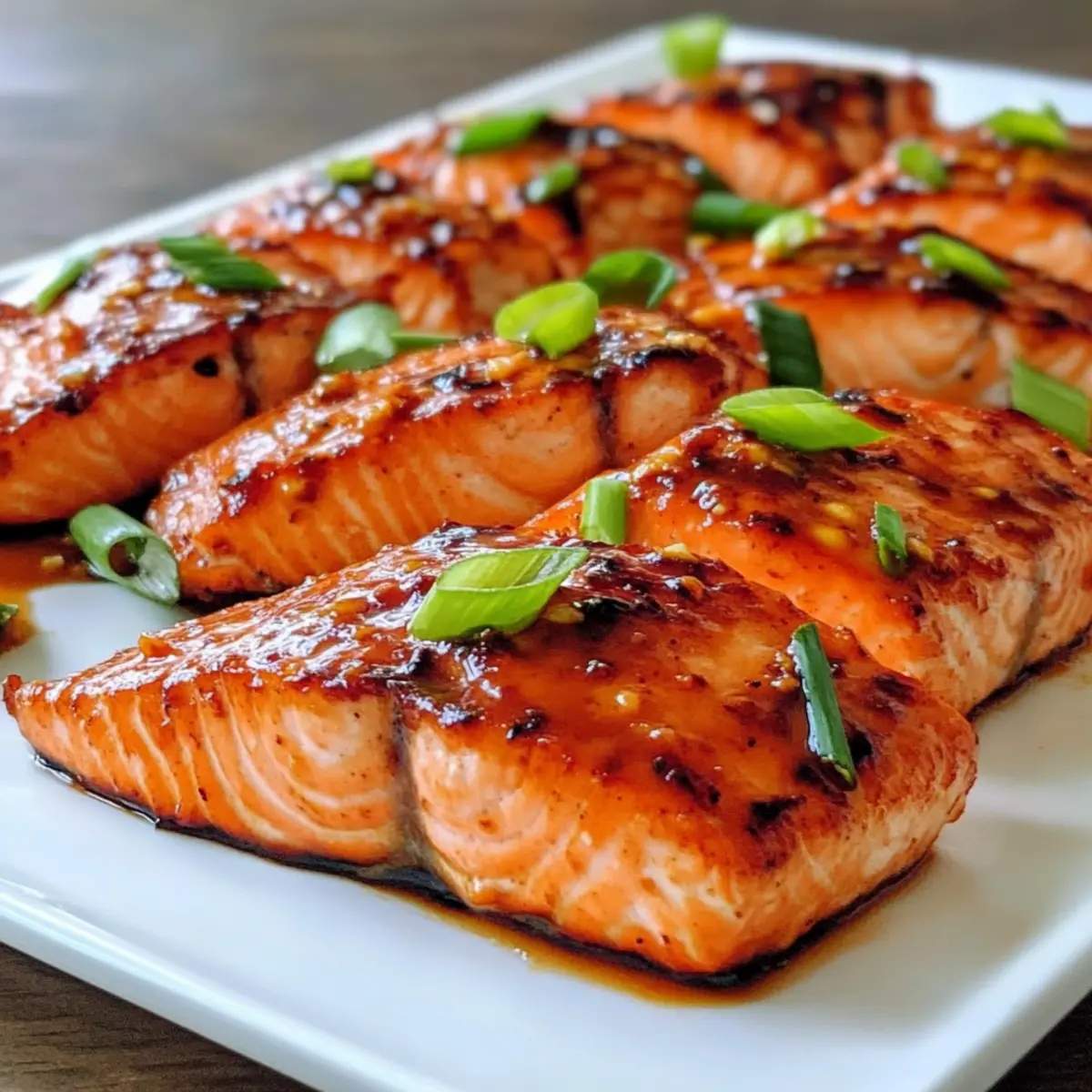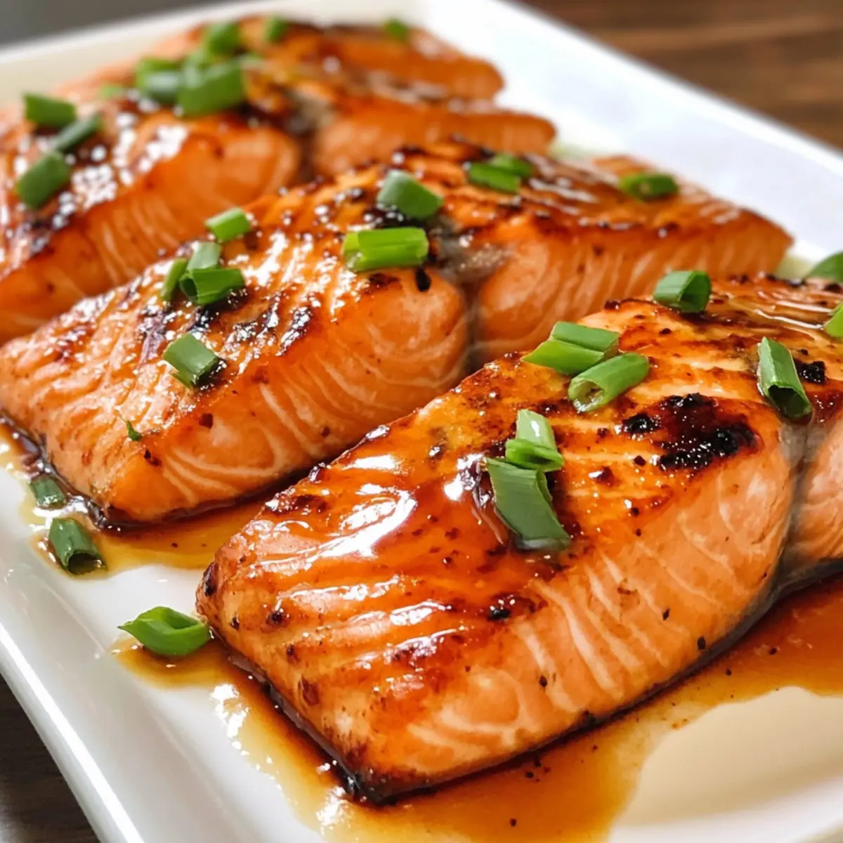 Als ich vor kurzem in einer kleinen thailändischen Küche saß und den verführerischen Duft von süßer Chili-Glasur schnupperte, wusste ich, dass ich diesen Geschmack in meine eigene Küche bringen musste. Heute teile ich mein Rezept für Lachs mit thailändischer süßer Chili-Glasur, ein Gericht, das nicht nur einfach zuzubereiten ist, sondern auch perfekt für ein schnelles Abendessen unter der Woche geeignet ist. Die zarten Lachsfilets werden in einer einzigartig würzigen Marinade aus süßer Chili, Sojasauce und frischem Ingwer eingelegt, die den Fisch bei der Zubereitung unter dem Grill zu einem köstlichen Hochgenuss verwandelt. Dieses Rezept ist nicht nur glutenfrei, sondern begeistert auch alle, die Qualität und Geschmack schätzen, ohne viel Zeit in der Küche verbringen zu müssen. Bist du bereit, dich in die Aromen Thailands zu verlieben und deinen Liebsten eine Freude zu machen? Lass uns kochen! Warum wirst du dieses Rezept lieben? Einfachheit: Die Zubereitung ist mühelos und erfordert keine speziellen Küchentechniken. Ideal für hektische Abende! Aromatische Vielfalt: Die Kombination aus süßer Chili und frischem Ingwer sorgt für einen unvergesslichen Geschmack, der deine Geschmacksknospen verzaubert. Schnelles Abendessen: In nur wenigen Schritten kannst du ein köstliches Gericht zaubern, perfekt für spontane Feierlichkeiten oder ein gemütliches Familienessen. Gesund & Glutenfrei: Dieses Rezept ist nicht nur lecker, sondern auch gesund und glutenfrei – ideal für jeden, der auf seine Ernährung achtet. Beeindruckende Präsentation: Serviere den Lachs mit frischen Frühlingszwiebeln und genieße bewundernde Blicke am Esstisch. Entdecke auch meinen erfrischenden Ananas Gurken Salat, der perfekt zu diesem Gericht passt! Zutaten für Lachs mit thailändischer süßer Chili-Glasur • Ein einfaches und köstliches Rezept, das den Gaumen erfreut! Für den Lachs Lachs (1½ lbs oder vier 6-oz Stücke) – Der Hauptbestandteil; verwende die Haut nach Belieben. Thai Süße Chili Sauce (6 Esslöffel) – Bringt den perfekten süßen und würzigen Geschmack; sorge für eine hochwertige Marke wie Mae Ploy. Sojasauce (3 Esslöffel) – Fügt Tiefe und Umami hinzu; als Soja-Alternative eignen sich kokosaminos. Frischer Ingwer (1 Esslöffel, fein gerieben) – Verleiht ein warmes, würziges Aroma; frischer Ingwer sorgt für den besten Geschmack. Frühlingszwiebeln (2, in dünne Ringe geschnitten) – Für Frische und eine schöne Garnitur. Jetzt bist du bereit, mit diesen Zutaten ein wunderbares Abendessen zu zaubern! Schritt-für-Schritt-Anleitung für Lachs mit thailändischer süßer Chili-Glasur Step 1: Lachs marinieren In einer flachen Auflaufform die süße Chili-Sauce, Sojasauce und den geriebenen Ingwer gut vermischen. Bewahre ¼ Tasse der Marinade für später auf. Lege die Lachsfilets mit der Hautseite nach oben in die restliche Marinade und lasse sie 1 Stunde im Kühlschrank ziehen, damit der Lachs die köstlichen Aromen aufnehmen kann. Step 2: Backblech vorbereiten Heize den Grill deines Ofens vor und lege ein Backblech mit Aluminiumfolie aus, um das spätere Reinigen zu erleichtern. Besprühe die Folie leicht mit einem Antihaftspray, damit der Lachs nicht festklebt und sich nach dem Grillen problemlos entnehmen lässt. Step 3: Lachs grillen Lege die marinierten Lachsfilets mit der Hautseite nach unten auf das vorbereitete Backblech und träufle etwas von der übrig gebliebenen Marinade darüber. Grille den Lachs für 6 bis 10 Minuten, bis die Oberfläche goldbraun ist und der Fisch in der Mitte fast opak erscheint. Halte ein Auge darauf, damit er nicht verbrennt. Step 4: Servieren Nehme den gegrillten Lachs vorsichtig aus dem Ofen und platziere ihn auf einem Servierteller. Träufle die beiseite gestellte Marinade über die Filets und garniere sie mit frischen Frühlingszwiebeln. Dieser Lachs mit thailändischer süßer Chili-Glasur wird sicher allen am Tisch schmecken! Was passt zu Lachs mit thailändischer süßer Chili-Glasur? Der Geschmack des Lachs wird durch diese köstlichen Beilagen wunderbar ergänzt, und sie schaffen ein komplettes und harmonisches Abendessen. Dampfgemüse: Die Frische von Brokkoli und Karotten bringt eine knackige Textur und gesunde Farben auf den Teller, perfekt als Ergänzung zu dem zarten Lachs. Diese grünen und orangefarbenen Farben erfreuen das Auge und die Geschmacksknospen gleichermaßen. Jasminreis: Der duftende und leicht klebrige Jasminreis nimmt die Aromen der süßen Chili-Glasur wunderbar auf. Um das Gericht zu verfeinern, kannst du den Reis mit etwas Limettensaft und frischem Koriander verfeinern. Mango-Salsa: Die süße und fruchtige Mango-Salsa bringt einen erfrischenden Kontrast zu dem würzigen Lachs. Mit einer Prise Limette und frischem Koriander wird sie zum perfekten Begleiter, während die Kombination deine Sinne verzaubert. Aromatisiertes Wasser: Ein spritziges Getränk, wie mit Limette oder Gurke aromatisiertes Wasser, erfrischt und ergänzt die Aromen des Gerichts. Es ist eine leichte und gesunde Option, die die Mahlzeit abrundet. Kokosnuss-Pudding: Für eine süße Note am Ende der Mahlzeit sorgt ein cremiger Kokosnuss-Pudding mit frischen Früchten für den perfekten Abschluss. Die Mischung aus süß und cremig wird dein Dessert zu einem unvergesslichen Erlebnis machen. Tipps zur Vorbereitung für Lachs mit thailändischer süßer Chili-Glasur Diese Lachs mit thailändischer süßer Chili-Glasur sind perfekt für alle, die ihre Mahlzeiten im Voraus planen möchten! Du kannst die Lachsfilets bis zu 24 Stunden im Voraus marinieren, indem du sie einfach in der Marinade (süße Chili-Sauce, Sojasauce und Ingwer) einlegst und abgedeckt im Kühlschrank aufbewahrst; das sorgt dafür, dass der Fisch die Aromen intensiv aufnehmen kann. Auch die Marinade selbst kann bereits einen Tag zuvor zubereitet werden, um noch mehr Zeit zu sparen. Achte darauf, die Marinade in einem luftdichten Behälter zu lagern, um die Frische
