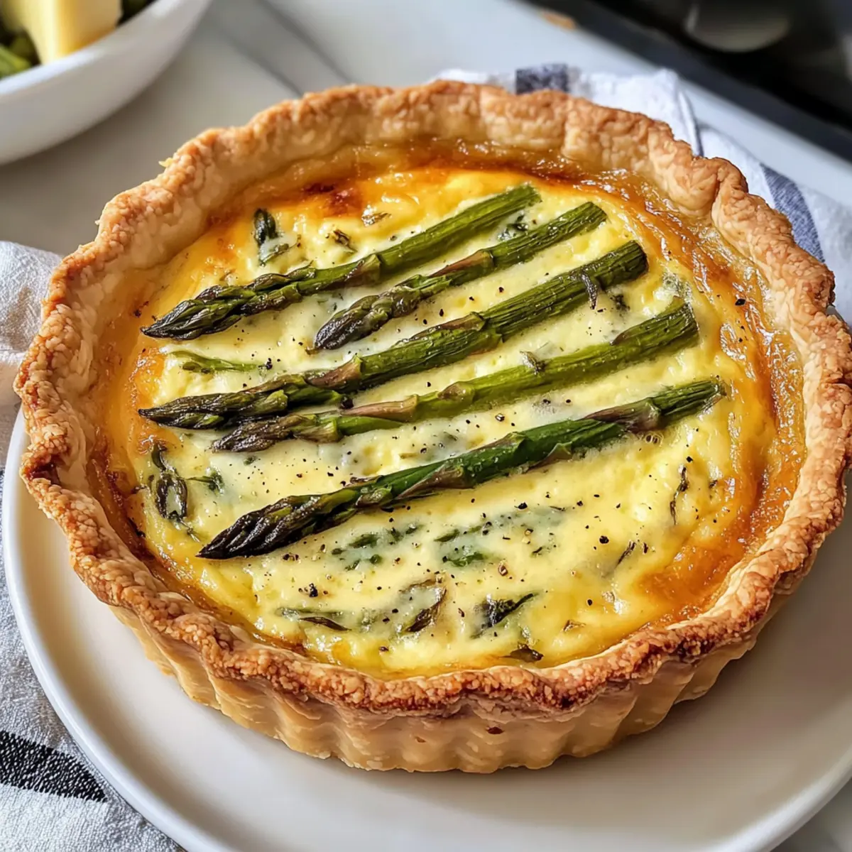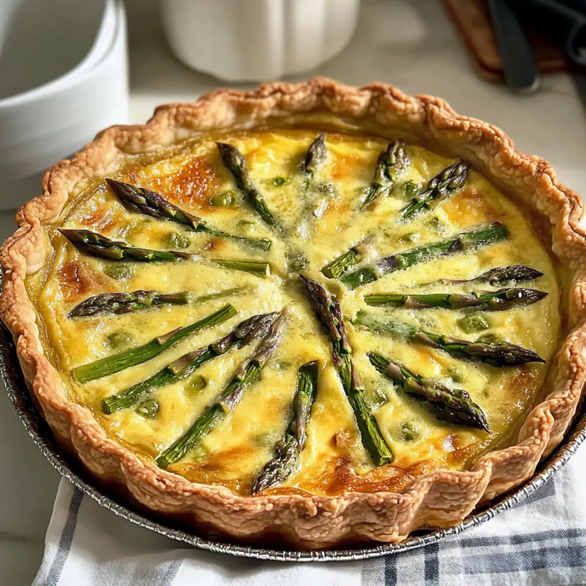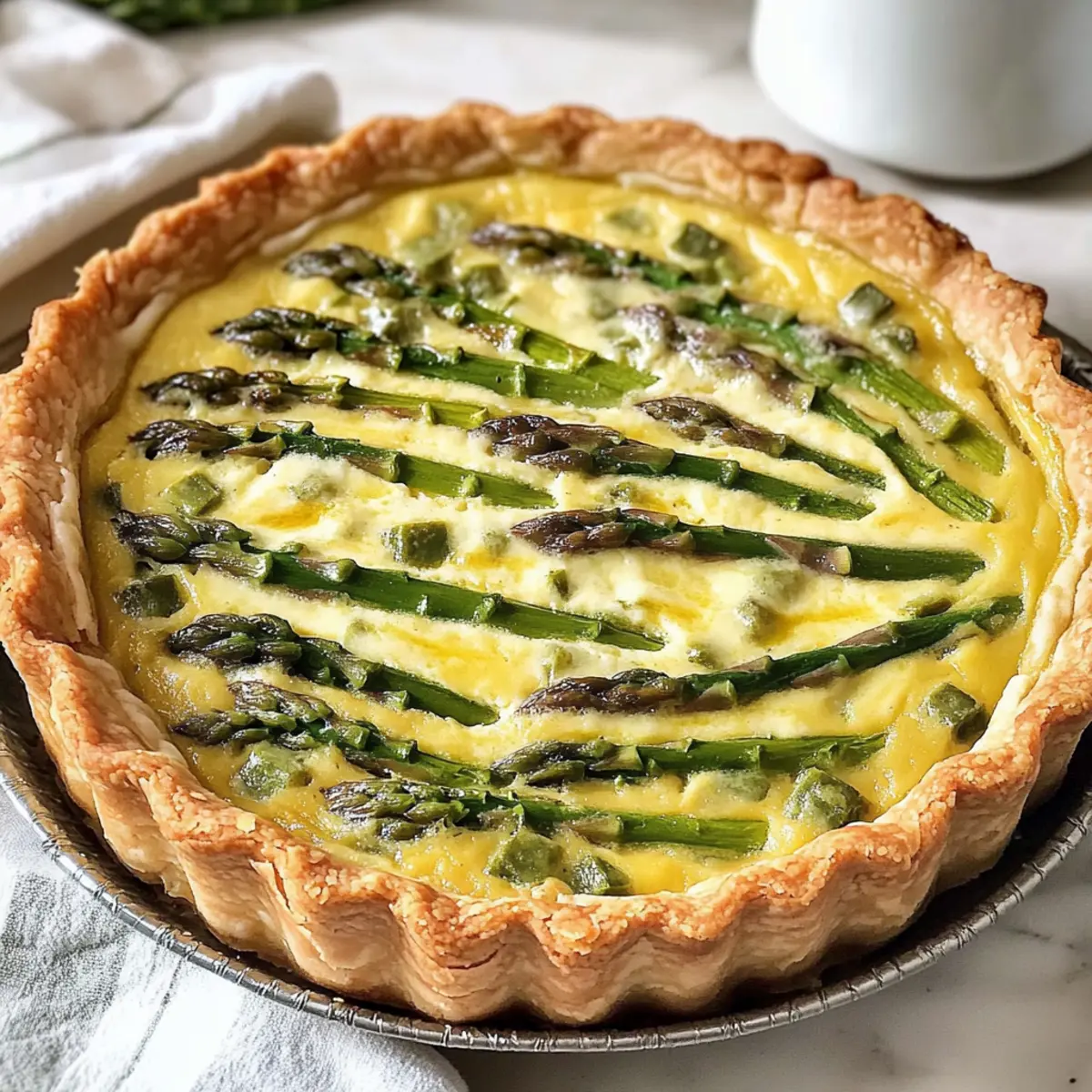 Stell dir vor, du stehst an einem sonnigen Morgen in deiner Küche, der Duft von frisch gebackenem Gebäck in der Luft. Heute zauberst du eine leckere Spargel und Gruyère Quiche, die nicht nur den perfekten Rahmen für ein entspanntes Brunch bietet, sondern auch die Herzen deiner Gäste im Sturm erobern wird. Diese Quiche ist nicht nur einfach zuzubereiten – das meiste kannst du bereits am Vorabend erledigen – sie ist auch vielseitig, denn sie schmeckt warm oder bei Raumtemperatur hervorragend. Mit ihrem buttrigen, knusprigen Boden und der cremigen Füllung aus zartem Spargel und aromatischem Gruyère wird sie schnell zu deinem neuen Lieblingsrezept! Bist du bereit, die Küche zum Leben zu erwecken? Lass uns gemeinsam loslegen! Warum wirst du dieses Rezept lieben? Einfachheit, auch wenn du keine Profiköchin bist: Die Zubereitung dieser Quiche erfordert nur grundlegende Kochskills! Reiche Aromen: Die harmonische Kombination aus frischem Spargel und würzigem Gruyère schafft einen Geschmack, der überzeugt. Vielseitig: Ob warm zum Brunch oder bei Zimmertemperatur – diese Quiche lässt sich wunderbar anpassen. Zeitersparnis: Bereite den Großteil der Zutaten am Vortag vor und genieße einen stressfreien Morgen. Publikumsfavorit: Egal ob Familie oder Freunde, alle werden von dieser köstlichen Quiche begeistert sein! Wenn du noch weitere einfache Rezepte suchst, schau dir unsere Brunch-Rezepte an! Leckerer Spargel und Gruyère Quiche Zutaten • Diese Zutatenliste ist der erste Schritt zu deinem köstlichen Brunch-Erlebnis! Für den Boden Refrigerated Pie Crust – Verwende eine fertige Teigkruste für die einfache Zubereitung oder bereite eine hausgemachte Version für den persönlichen Touch zu. Für die Füllung Große Eier – Sorgen für Struktur und Reichhaltigkeit; stelle sicher, dass die Eier Zimmertemperatur haben, damit sie sich gleichmäßig vermischen. Half and Half – Trägt zur Cremigkeit der Füllung bei; kann für eine reichhaltigere Textur durch Schlagsahne ersetzt werden. Spargel – Fügt einen frischen, erdigen Geschmack und lebendige Farbe hinzu; mittelgroße Stangen sind ideal. Frisch ist am besten, aber aufgetauter gefrorener Spargel ist ebenfalls akzeptabel. Gruyère Käse – Bringt eine cremige Konsistenz und einen nussigen Geschmack; frisch geriebener Käse schmilzt besser als vorgeriebene Sorten. Herbes de Provence – Verleiht der Füllung eine aromatische Note; kann leicht durch italienische Gewürze ersetzt werden, um einen anderen Akzent zu setzen. Koshersalz & schwarzer Pfeffer – Steigern das Gesamtgeschmackserlebnis; nach Belieben anpassen. Mit diesen Zutaten wird deine leckere Spargel und Gruyère Quiche ein voller Erfolg! Schritt-für-Schritt-Anleitung für Leckerer Spargel und Gruyère Quiche Step 1: Teig vorbereiten Nimm die fertige Teigkruste aus dem Kühlschrank und lasse sie für etwa 5 Minuten bei Zimmertemperatur antauen. Rolle den Teig vorsichtig in eine 9-Zoll-Quiche- oder Tarteform aus und forme die Ränder nach Belieben. Steche den Boden mit einer Gabel ein, um Blasenbildung zu vermeiden. Step 2: Teig vorbacken Heize den Ofen auf 220°C vor. Backe den Teig für etwa 10 Minuten vor, bis er fest ist, aber noch hell bleibt. Dieser Schritt sorgt dafür, dass die Kruste schön knusprig wird und nicht durchweicht, wenn die Füllung hinzugefügt wird. Step 3: Füllung mischen In einer großen Schüssel verquirlst du die Eier mit der Half and Half, den Herbes de Provence, Salz und Pfeffer. Schaue, dass die Mischung leicht schaumig wird, was zeigt, dass deine Eier gut vermischt sind. Dieser cremige Mix gibt deiner Leckerer Spargel und Gruyère Quiche die gewünschte Textur. Step 4: Spargel und Käse hinzufügen Verteile 3/4 Tasse des frisch geriebenen Gruyère-Käses gleichmäßig über dem vorgebackenen Teig. Gieße dann die Eiermischung darüber und verteile den vorbereiteten Spargel gleichmäßig. Bestreue die Quiche abschließend mit dem restlichen Käse, um eine köstliche goldene Kruste zu erhalten. Step 5: Quiche backen Reduziere die Ofentemperatur auf 175°C und backe die Quiche für etwa 40 Minuten. Halte Ausschau danach, dass die Füllung in der Mitte nur leicht wackelt, wenn du die Quiche herausnimmst. Diese Indikation zeigt dir, dass die aufeianderfolgenden Schichten optimal gegart sind. Step 6: Ruhen lassen Lasse die Quiche nach dem Backen für 5 bis 10 Minuten ruhen, bevor du sie anschneidest. Dies ermöglicht eine bessere Schnittkante und verhindert, dass die Füllung herausläuft. Deine Leckerer Spargel und Gruyère Quiche kann nun warm oder bei Raumtemperatur serviert werden. Leckerer Spargel und Gruyère Quiche Varianten Fühl dich frei, deine Quiche nach deinem Geschmack zu gestalten und mit verschiedenen Zutaten zu experimentieren! Vegetarisch: Ersetze den Spargel durch Spinat oder Pilze für eine neue Geschmacksrichtung. Diese Variation bringt frische Aromen und fügt eine zusätzliche Dimension hinzu. Käsewechsel: Tausche den Gruyère-Käse gegen Cheddar oder Feta aus. Diese Käsesorten geben deiner Quiche einen anderen, überraschenden Geschmack. Laktosefrei: Verwende laktosefreie Milch oder Sahne anstelle von Half and Half. So kannst du die cremige Textur behalten, ohne auf Laktose zu stoßen. Zusätzliche Gewürze: Füge eine Prise Muskatnuss oder geräuchertes Paprikapulver hinzu, um der Füllung einen festlichen Touch zu verleihen. Diese subtile Note kann das gesamte Gericht verwandeln. Ein Hauch von Schärfe: Für diejenigen, die es gerne würzig mögen, füge etwas frische, gehackte Chili oder Cayennepfeffer zur Eiermischung hinzu. Ein kleiner Kick kann neue Geschmackserlebnisse schaffen. Gartenfrische: Würze mit frischen Kräutern wie Thymian oder Basilikum anstelle von Herbes de Provence. Dies bringt eine duftende Frische in die Quiche, die deine Gäste begeistern wird. Süße Note: Kombination aus Gemüse und Süße kann spannend sein: Füge karamellisierte Zwiebeln oder geröstete Paprika hinzu, um eine sü
