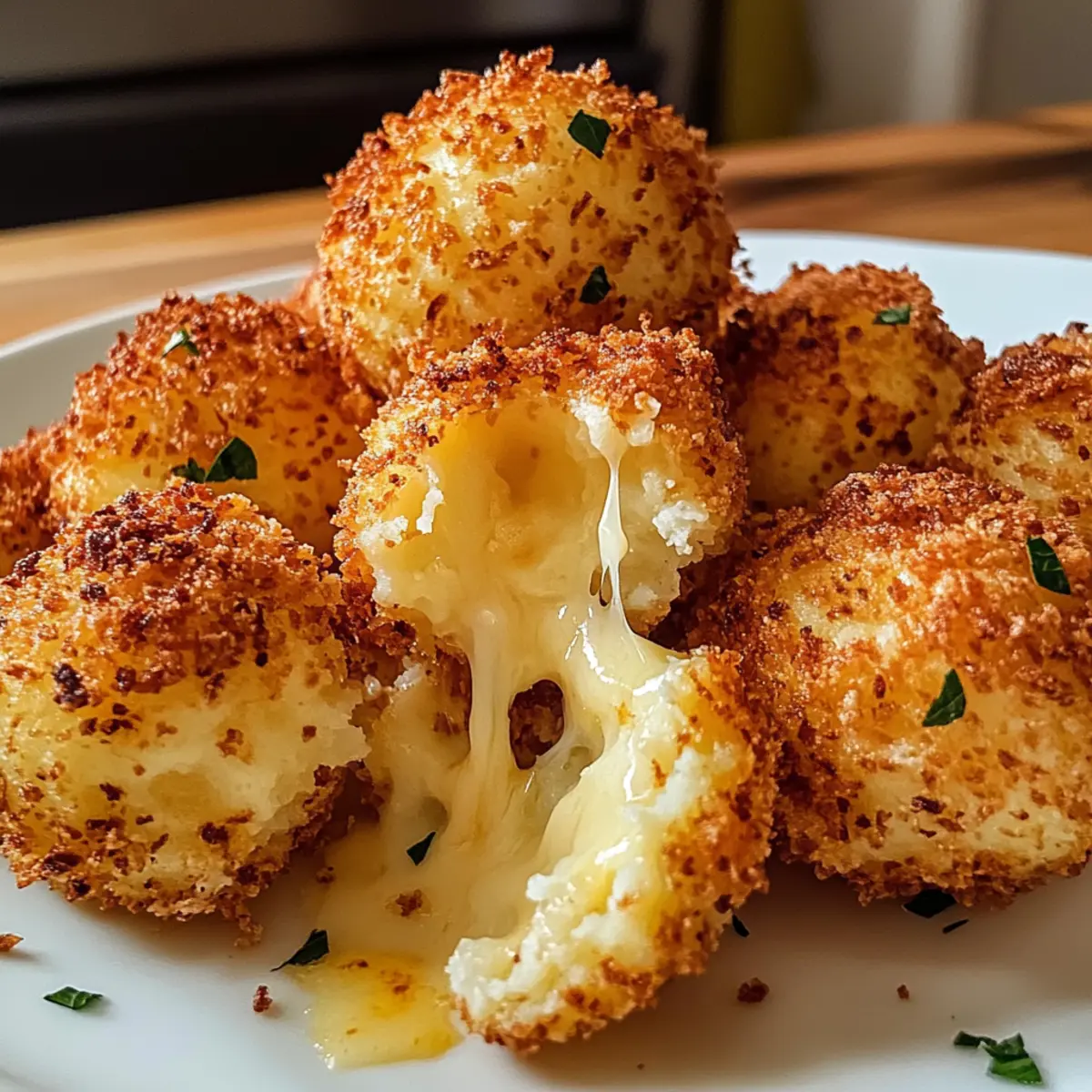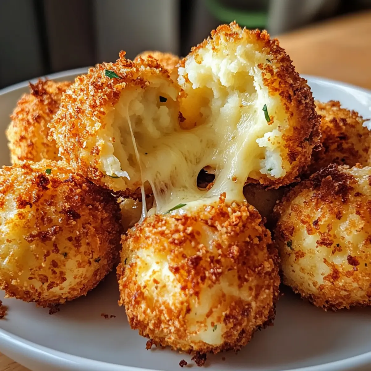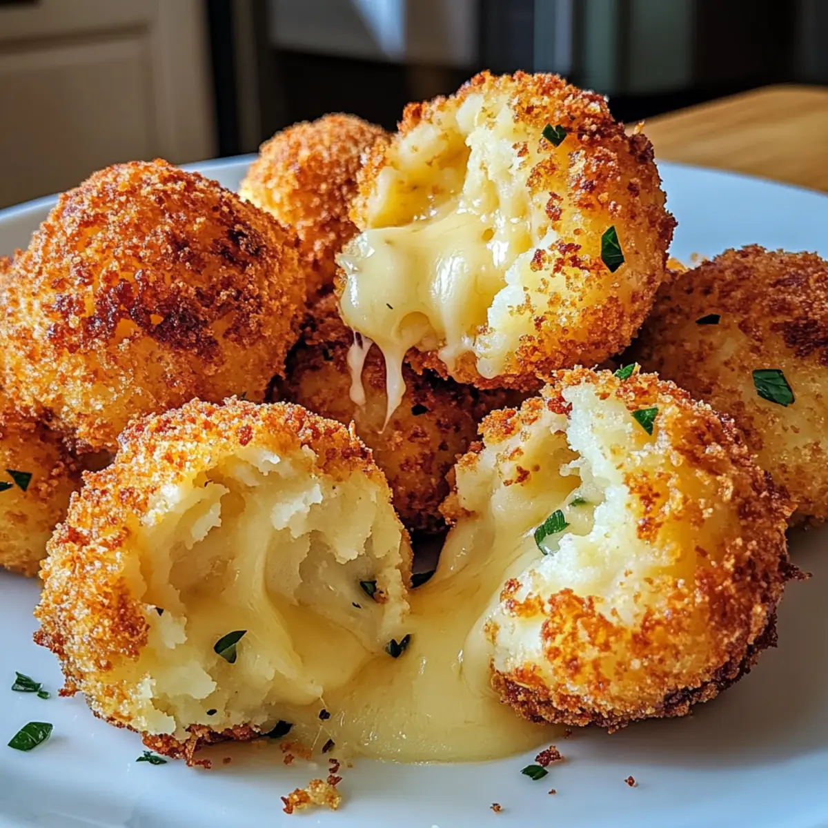 Eines Abends, als ich die Reste von einem köstlichen Kartoffelstampf sah, hatte ich einen Geistesblitz: Warum nicht etwas Magisches daraus zaubern? So entstanden die Luftfritteuse Käse Kartoffel Bällchen, die sowohl knusprig als auch wunderbar cremig sind. Mit jeder Bissschicht offenbart sich eine geschmolzene Käsefüllung, die nicht nur meine Familie begeistert hat, sondern auch perfekt für Feste und Spieleabende ist. Diese kleinen Köstlichkeiten sind in nur 10 Minuten zubereitet und verwandeln verbliebenen Kartoffelbrei in einen schmackhaften Snack, der gesünder ist als herkömmlich frittierte Varianten. Neugierig, wie diese einfachen Zutaten in eine wunderbare Delikatesse verwandelt werden? Lass uns gemeinsam den Kochlöffel schwingen! Warum sind diese Bällchen so besonders? Vielseitigkeit: Anpassbar nach deinem Geschmack! Du kannst verschiedene Käsesorten wie Gouda oder Cheddar ausprobieren, um eine ganz neue Note zu entdecken. Einfachheit: In nur 10 Minuten kannst du diese leckeren Bällchen zubereiten – perfekt für spontane Snacks oder Partys. Gesundheitsbewusst: Mit der Luftfritteuse zauberst du knusprige Köstlichkeiten, ohne viel Öl zu verwenden, was sie zu einer gesünderen Alternative macht. Familienfreundlich: Kinder und Erwachsene lieben sie gleichermaßen; sie sind der perfekte Begleiter zu einem Spieleabend oder anderen Anlässen. Resteverwertung: Nutze deine übrig gebliebenen Kartoffeln kreativ! Diese Bällchen sind die ideale Lösung, um mit wenig Aufwand aus Resten ein neues Gericht zu kreieren. Luftfritteuse Käse Kartoffel Bällchen Zutaten Hier sind die Zutaten für die perfekten Luftfritteuse Käse Kartoffel Bällchen: Für den Teig: Kartoffelbrei – bildet die cremige Basis für die Bällchen; am besten eignen sich Reste von gestern. Mozzarella – sorgt für eine reichhaltige, schmelzende Textur; für eine spicy Note kannst du auch Pepper Jack verwenden. Parmesan – verleiht den Bällchen eine savoury Tiefe; Pecorino ist ebenfalls eine gute Alternative. Paniermehl – sorgt für eine knusprige Außenschicht; mit Panko-Paniermehl erreichst du extra Knusprigkeit. Ei – bindet die Zutaten zusammen; für eine vegane Option ersetze es durch Leinsamen oder Chiasamen. Salz – verstärkt den Geschmack; passe die Menge je nach Salzgehalt des Kartoffelbreis an. Pfeffer – gibt den Bällchen eine würzige Note; ist optional, je nach Geschmack. Für die Zubereitung: Ölspray – sorgt dafür, dass die Bällchen außen schön knusprig werden; sprühe großzügig für besten Effekt. Viel Spaß beim Zubereiten deiner luftfrittieren Käse Kartoffel Bällchen – ein köstlicher Snack für jeden Anlass! Schritt-für-Schritt Anleitung für Luftfritteuse Käse Kartoffel Bällchen Step 1: Luftfritteuse vorheizen Heize deine Luftfritteuse auf 190 °C (375 °F) vor, indem du sie für etwa 5 Minuten laufen lässt. Dies sorgt dafür, dass die Luftzirkulation optimal ist und die Bällchen gleichmäßig knusprig werden. Während die Luftfritteuse vorheizt, kannst du mit der Vorbereitung der Füllung beginnen. Step 2: Zutaten vermengen In einer großen Schüssel die abgekühlten Kartoffeln, Mozzarella, Parmesan, Paniermehl, das Ei, Salz und Pfeffer gründlich vermischen. Achte darauf, dass alle Zutaten gleichmäßig verteilt sind, um eine homogene Masse zu erhalten. Diese Mischung ist die Basis für deine Luftfritteuse Käse Kartoffel Bällchen und sollte eine cremige, gut kombinierte Konsistenz haben. Step 3: Bällchen formen Nimm etwas von der Mischung und forme sie in etwa 2,5 cm große Kugeln (ca. 30 g). Achte darauf, dass die Bällchen kompakt und gleichmäßig geformt sind, damit sie beim Frittieren ihre Form behalten. Lege die geformten Bällchen auf einen Teller, während du den Rest der Mischung verarbeitest. Step 4: Bällchen panieren Jede Kugel im Paniermehl wälzen, um eine knusprige Außenschicht zu erzeugen. Achte darauf, dass jede Bällchenoberfläche gut mit Paniermehl bedeckt ist. Sprühe sie anschließend leicht mit Ölspray ein, um sicherzustellen, dass sie beim Frittieren goldbraun und knusprig werden. Step 5: Bällchen luftfrittieren Platziere die Bällchen in der Luftfritteuse in einer einzigen Schicht, ohne dass sie sich berühren. Frittieren sie für 10-12 Minuten oder bis sie goldbraun und knackig sind. Überprüfe während des Garvorgangs regelmäßig, damit sie nicht verbrennen, und schüttle den Korb eventuell einmal, um eine gleichmäßige Bräunung zu gewährleisten. Step 6: Servieren Sobald die Luftfritteuse Käse Kartoffel Bällchen fertig sind, nimm sie vorsichtig heraus und lass sie kurz abkühlen. Genieße sie warm mit deiner Wahl an Dip-Saucen wie Marinara, Ranch oder Knoblauch-Aioli. Diese köstlichen Bällchen sind der perfekte Snack für jede Gelegenheit! Was passt zu Luftfritteuse Käse Kartoffel Bällchen? Egal ob für eine Party oder einfach nur für einen gemütlichen Abend zu Hause, diese herzhaften Bällchen harmonieren perfekt mit verschiedenen Beilagen und Getränken, um ein komplettes Menü zu kreieren. Cremige Dip-Saucen: Ein würziger Knoblauch-Aioli oder eine klassische Marinara-Sauce bringt den Käsegeschmack der Bällchen zur Geltung und sorgt für ein aufregendes Geschmackserlebnis. Diese Kombination macht das Essen besonders angenehm und verleiht den Bällchen das gewisse Etwas. Frischer grüner Salat: Ein knackiger Salat mit Gurken, Cherrytomaten und einem leichten Dressing sorgt für die nötige Frische und einen perfekten Kontrast zur herzhaften Textur der Bällchen. Die Farben des Salates machen das Gericht visuell ansprechend und laden zum Genießen ein. Kartoffelsalat: Ein cremiger Kartoffelsalat mit frischen Kräutern fügt eine zusätzliche Schicht von Aromen hinzu und hält dennoch das Kartoffelthema aufrecht. Seine sanfte Textur und die milden Zutaten harmonieren gut mit den knusprigen Bällchen. Eisgekühltes Getränk: Ein erfrischendes Getränk, wie spritziger Apfel- oder Birnensaft, bietet eine leichte S