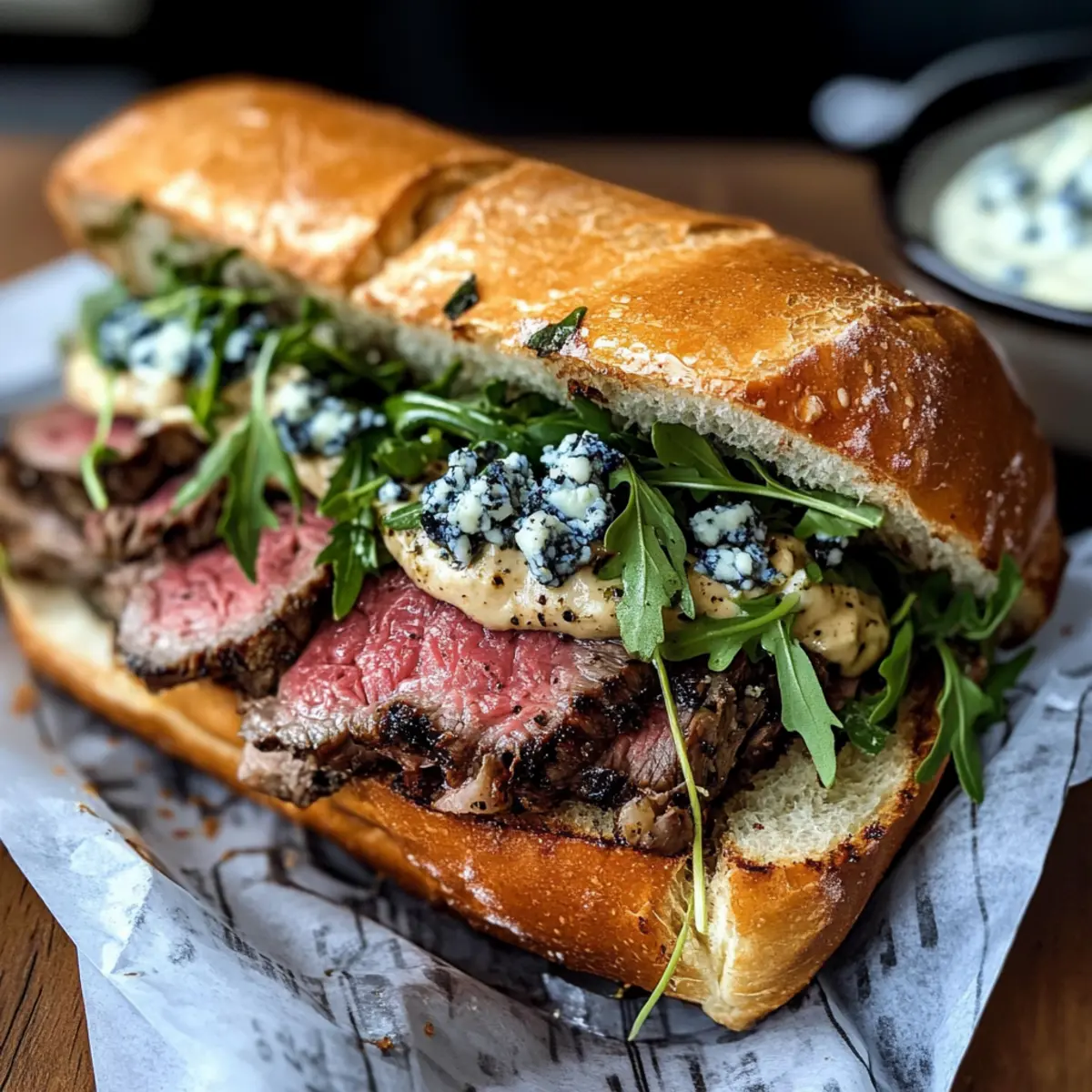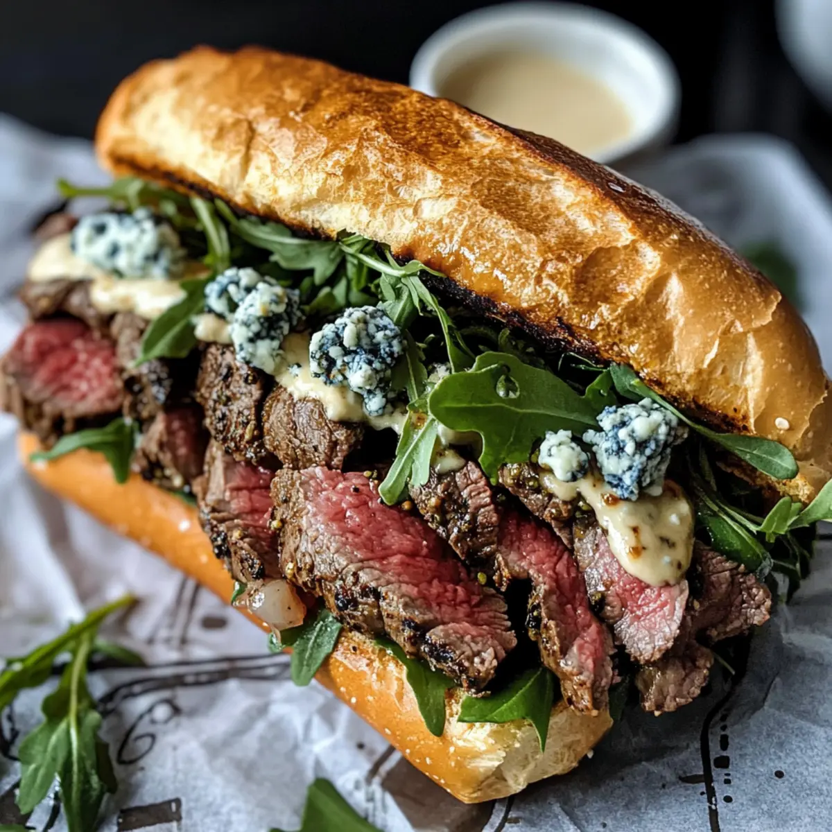 Ein aromatischer Traum entfaltet sich, wenn ich die Küche betrete und den Duft von mariniertem Flankensteak rieche. Das Rezept für ein mariniertes Flankensteak-Sandwich ist der Inbegriff von herzhaftem Genuss, das perfekt für gesellige Grillabende oder schnelle Familienmahlzeiten geeignet ist. Dieses Sandwich überzeugt nicht nur durch die zarte Steakfüllung, sondern auch durch die cremige verbrannte Zwiebel-Aioli, die ihm einen einzigartigen Touch verleiht. Die Kombination aus würzigem, frischem Rucola und herzhaftem Blauschimmelkäse sorgt für eine Geschmacksexplosion, die nicht nur verwöhnt, sondern auch garantiert jeden am Tisch begeistert. Neugierig, wie du dieses Meisterwerk selbst zaubern kannst? Lass dich inspirieren und entdecke die Freuden des Kochens! Warum solltest du dieses Sandwich lieben? Einfachheit, die begeistert: Mit nur wenigen Zutaten und einem klaren Ablauf zauberst du ein herzhaftes Festmahl. Aromatische Vielfalt: Die Kombination aus zartem Flankensteak, cremiger Aioli und knackigem Rucola bringt aufregende Geschmäcker auf deinen Teller. Vielseitigkeit: Du kannst das Sandwich ganz nach deinem Geschmack anpassen, indem du verschiedene Käse oder Brotvariationen ausprobierst. Zeitersparnis: Dank der Marinierzeit bleibt dir genug Raum, um die Aioli im Voraus zuzubereiten – perfekt für spontane Grillabende. Beliebtheit: Egal, ob für Familie oder Freunde, dieses Rezept zieht alle an und wird ein echter Hit bei jedem Anlass! Mariniertes Flankensteak-Sandwich Zutaten • Entdecke die köstlichen Zutaten, die deinem marinierten Flankensteak-Sandwich Leben einhauchen! Für das Steak Flankensteak – Hauptprotein, zart und aromatisch, ideal zum Marinieren; mariniere für mindestens 30 Minuten, bis zu 4 Stunden für besten Geschmack. Olivenöl – Fügt Feuchtigkeit zur Marinade hinzu; kannst auch Pflanzenöl verwenden, wenn nötig. Rotweinessig – Verleiht der Marinade Säure; Apfelessig ist eine geeignete Alternative. Brauner Zucker – Fügt eine süße Note hinzu; kann durch Honig oder Agavensirup ersetzt werden. Koshersalz und schwarzer Pfeffer – Unverzichtbar für die Würze; benutze weniger Tischsalz, da es salziger ist. Knoblauch – Verstärkt den Geschmack der Marinade; fein gehackt für beste Vermischung. Für die Aioli Gelbe Zwiebeln – Geben der Aioli Süße und Tiefe; keine direkte Substitution empfohlen für den Geschmacksausgleich. Mayonnaise – Basis der Aioli für Cremigkeit; kann auch durch griechischen Joghurt ersetzt werden für eine leichtere Option. Frischer Thymian – Fügt der Aioli Kräuternoten hinzu; trockener Thymian kann verwendet werden, aber Menge reduzieren. Für das Sandwich Ciabatta-Brötchen – Bieten die Sandwichstruktur; andere feste Brötchen oder Baguettes können ebenfalls verwendet werden. Blauschimmelkäse – Fügt einen reichen, würzigen Geschmack hinzu; kann mit Feta ersetzt oder weggelassen werden, wenn du auf Milchprodukte verzichten möchtest. Rucola – Bringt eine pfeffrige Frische; Spinat oder Mischsalat sind mögliche Alternativen. Genieße die Vorbereitung deines marinierten Flankensteak-Sandwichs und tauche ein in die Aromen, die jeden Bissen zu einem unvergleichlichen Erlebnis machen! Schritt-für-Schritt-Anleitung für mariniertes Flankensteak-Sandwich Step 1: Aioli zubereiten Heize den Ofen auf 230 °C vor. Vermenge gewürfelte Zwiebeln mit Olivenöl, Salz, Pfeffer und frischem Thymian auf einem Backblech und röste sie für etwa 35 Minuten, dabei alle 15 Minuten umrühren, bis sie schön gebräunt sind. Püriere die gerösteten Zwiebeln anschließend mit Zitronensaft und Mayonnaise in einem Mixer, bis die Aioli cremig und glatt ist. Step 2: Flankensteak marinieren Nimm einen Ziplock-Beutel und füge Olivenöl, Rotweinessig, braunen Zucker, gehackten Knoblauch, Salz und Pfeffer hinzu. Lege das Flankensteak in den Beutel, verschließe ihn gut und schüttele die Marinade, um das Steak gleichmäßig zu überziehen. Lasse das Steak für 1 bis 4 Stunden im Kühlschrank marinieren, um den Geschmack optimal zu entfalten. Step 3: Steak garen Erhitze eine gleichmäßige beschichtete Pfanne bei mittelhoher Temperatur. Nimm das Flankensteak aus der Marinade, trocken tupfen und leicht mit Salz würzen. Brate das Steak ca. 4 Minuten pro Seite an oder bis eine schöne Kruste entstanden ist und das Fleisch innen medium-rare ist. Lass das Steak nach dem Braten 5 bis 10 Minuten ruhen, damit es zart bleibt. Step 4: Ciabatta vorbereiten Heize den Ofen auf 200 °C vor. Lege die Ciabatta-Brötchen auf ein Backblech und backe sie etwa 5 bis 7 Minuten, bis sie goldbraun und knusprig sind. Die Brötchen sollten beim Anfassen frisch und warm sein, um die köstlichen Aromen des marinierten Flankensteak-Sandwichs zu unterstützen. Step 5: Sandwich zusammenstellen Schneide die Ciabatta-Brötchen auf und streiche eine großzügige Menge der verbrannten Zwiebel-Aioli auf die Innenflächen. Lege die in dünne Scheiben geschnittene Flankensteak-Portion darauf und kröne sie mit zerbröseltem Blauschimmelkäse und frischem Rucola. Bereite das Sandwich warm zur Genusserfahrung vor und genieße jede köstliche Biss! Vorbereitung für das mariniertes Flankensteak-Sandwich Die marinierten Flankensteak-Sandwich sind eine exzellente Wahl für alle, die in der Woche Zeit sparen möchten! Du kannst das Flankensteak bis zu 4 Stunden im Voraus marinieren, um es zart und aromatisch zu machen. Die verbrannte Zwiebel-Aioli kann bereits bis zu 2 Wochen im Voraus zubereitet und in einem luftdichten Behälter im Kühlschrank aufbewahrt werden, ohne an Qualität zu verlieren. Wenn du bereit bist, das Sandwich zu genießen, brate das Steak einfach frisch an, während die Ciabatta-Brötchen im Ofen goldbraun gebacken werden (ca. 5-7 Minuten). Diese Vorbereitungen garantieren, dass dein Gericht nicht nur zeitsparend, sondern auch wunderbar schmackhaft ist – perfekt für ein schnelles Abendessen unter der Woche! Mariniertes Flankensteak-Sandwich Vari