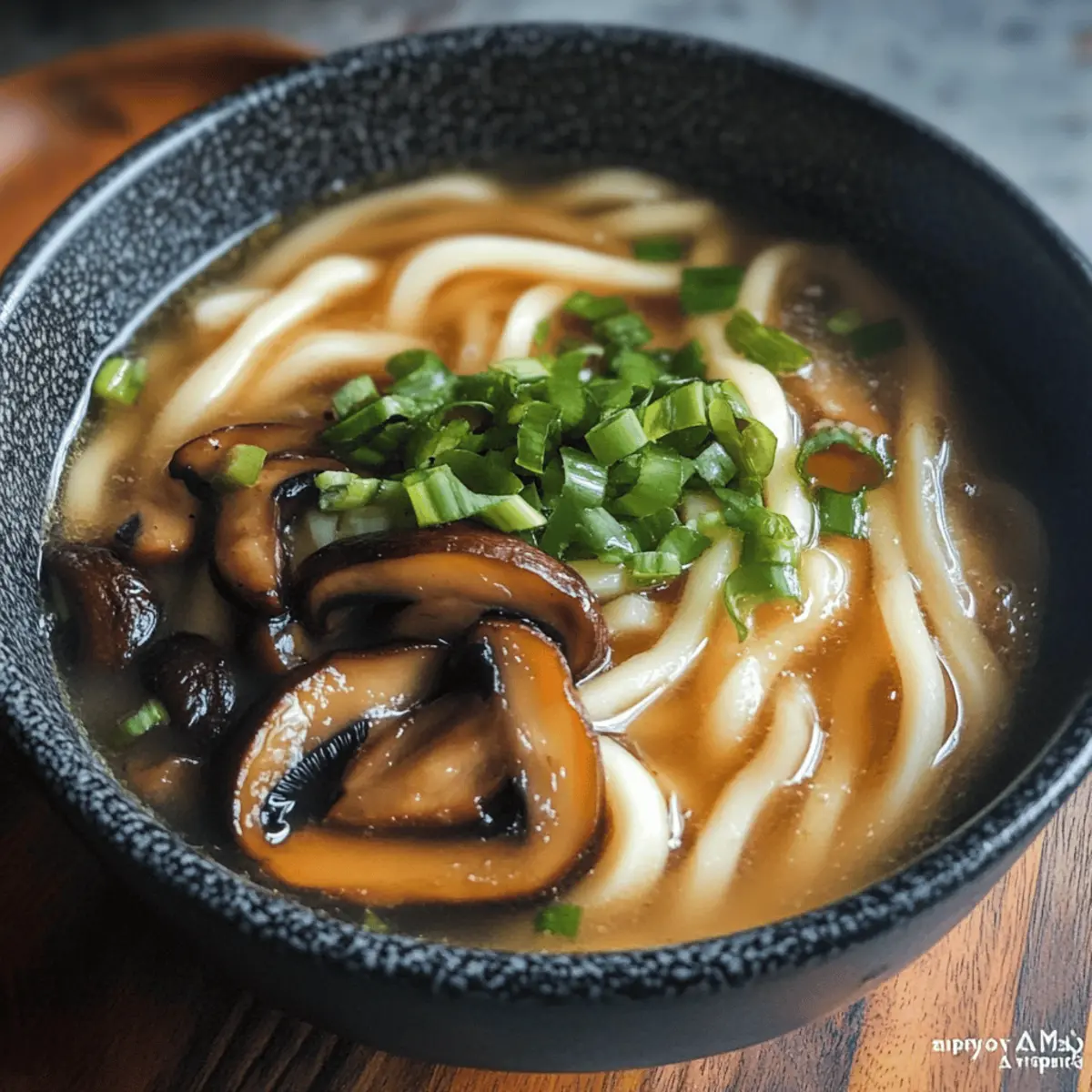 Verteile die gekochten Udon-Nudeln gleichmäßig in Schalen. Gieße die heiße Brühe vorsichtig über die Nudeln und decke sie mit den glasierten Teriyaki-Pilzen. Bestreue die Suppe mit fein gehackten Frühlingszwiebeln und optionally Japanischem Chiliöl für etwas zusätzliche Schärfe. Sofort genießen, während die Suppe noch dampft.