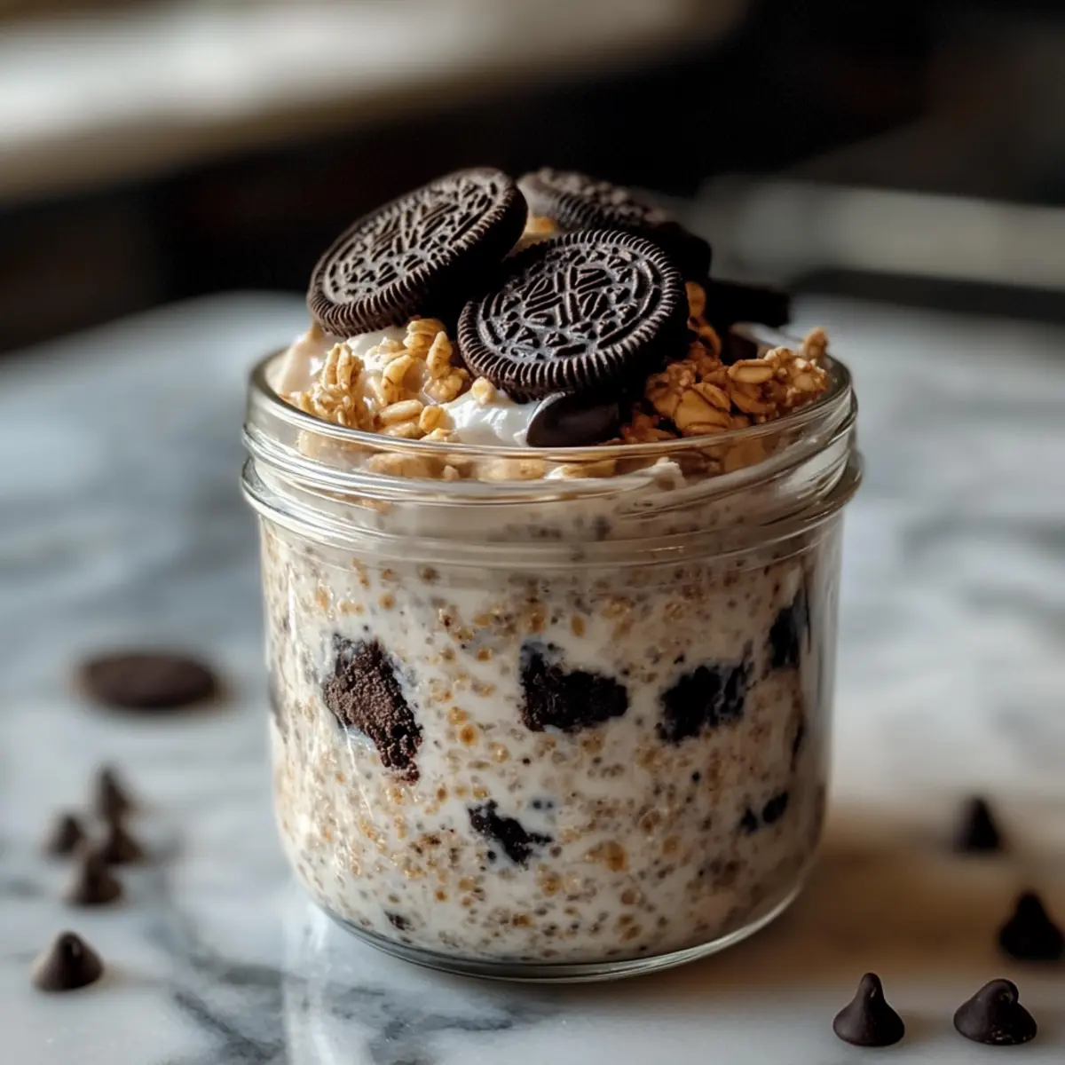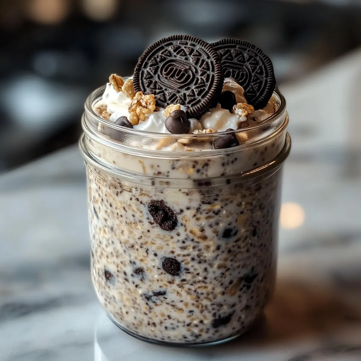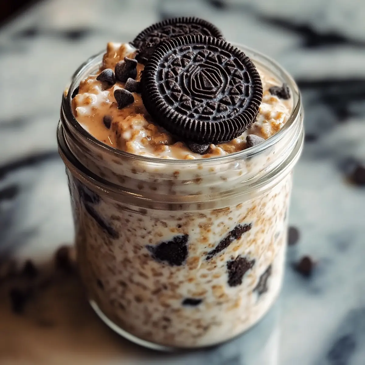 Kaffeduft lagert in der Luft, als ich die Luxuriösität dieses einfachen Frühstücks entdecke. Ah, Oreo Übernacht Haferflocken – eine gelungene Verbindung aus cremigen Haferflocken und knusprigen Oreos, die jeden Morgen zu einem kleinen Festmahl macht. Diese no-cook Variante ist perfekt für jeden, der es eilig hat, aber trotzdem das Gefühl von Wohlbefinden und Genuss möchte. Mit nur wenigen Zutaten bietet dieses Rezept nicht nur eine schnelle Zubereitung, sondern bringt auch die Freude eines Desserts in eine nahrhafte Frühstücksoption. Wer könnte da widerstehen? Bist du bereit, dein Frühstückserlebnis mit einem Hauch von Süße und einem aufregenden Crunch zu bereichern? Warum sind diese Oreos so verführerisch? Köstliche Kombination: Diese Oreo Übernacht Haferflocken bieten eine himmlische Mischung aus Cremigkeit und Crunch, die den perfekten Start in den Tag garantiert. Einfache Zubereitung: In weniger als 10 Minuten zubereitet, sind sie ideal für hektische Morgen; einfach alle Zutaten in ein Glas geben und über Nacht im Kühlschrank lassen. Vielseitig: Experimentiere mit verschiedenen Toppings wie frischen Beeren oder sogar einem Schuss Karamellsauce für zusätzlichen Genuss – die Möglichkeiten sind schier endlos! Gesund und nahrhaft: Dieses Rezept vereint das Beste aus beiden Welten: den köstlichen Geschmack von Keksen und die nahrhaften Vorteile von Hafer, ideal für gesunde Frühstücksgenießer. Schmackhaft und beliebt: Egal, ob für dich selbst oder für Besuch, dieses Rezept sorgt immer für Begeisterung – und wer könnte dem Charme von Oreos widerstehen? Oreo Übernacht Haferflocken Zutaten • Entdecke die perfekte Mischung für ein schnelles Frühstück! Für die Haferflocken Alte Haferflocken – sorgen für die beste Textur und Konsistenz; vermeide Instant- oder Stahlhafer für optimalen Geschmack. Milch (Milch oder pflanzlich) – sorgt für cremige Konsistenz; Mandeldrink oder Hafermilch sind tolle Alternativen. Griechischer Joghurt – macht die Mischung dick und liefert extra Protein. Chiasamen – wirken als Verdickungsmittel und sind reich an Omega-3-Fettsäuren und Ballaststoffen. Für die Süße und den Geschmack Ahornsirup oder Honig – fügt eine natürliche Süße hinzu; wähle je nach Vorliebe aus. Vanilleextrakt – verstärkt den Keks-Geschmack. Zerkleinerte Oreos – die Hauptzutat für den schokoladigen Genuss; spare einige für das Topping. Mini-Schokoladenstückchen (optional) – für zusätzlichen Schokoladengeschmack; nach Belieben anpassen. Genieße diese Oreo Übernacht Haferflocken nicht nur als köstliches Frühstück, sondern auch als kreatives Dessert – es ist eine süße Überraschung, die jeden Morgen lebendiger macht! Schritt-für-Schritt-Anleitung für Oreo Übernacht Haferflocken Step 1: Zutaten kombinieren In einer großen Schüssel oder einem Einmachglas die alten Haferflocken, Milch, griechischen Joghurt, Chiasamen, Ahornsirup und Vanilleextrakt gut miteinander vermengen. Rühre alles für etwa 1-2 Minuten, bis eine glatte Mischung entsteht. Achte darauf, dass keine Klumpen zurückbleiben, da dies die Textur der Oreo Übernacht Haferflocken beeinflussen kann. Step 2: Oreos einarbeiten Füge vorsichtig die zerkleinerten Oreos und optional die Schokoladenstückchen zur Hafermischung hinzu. Verwende einen Spatel, um die Zutaten leicht unterzuheben, sodass der Keksgeschmack gleichmäßig verteilt ist. Achte darauf, nicht zu stark zu rühren, um die knusprigen Stücke nicht zu zerdrücken und eine schöne Crunch-Textur zu erhalten. Step 3: Vorbereitung für die Kühlung Decke das Glas oder die Schüssel mit einem Deckel oder Frischhaltefolie ab. Stelle sicher, dass alles gut verschlossen ist, damit keine Luft eindringt. Plaziere das Gefäß im Kühlschrank und lasse die Mischung mindestens 4 Stunden, besser über Nacht, ruhen. So können sich die Aromen entfalten und die Haferflocken die Flüssigkeit aufnehmen. Step 4: Servieren Am nächsten Morgen nimm die Oreo Übernacht Haferflocken aus dem Kühlschrank und rühre sie gut um, um eine cremige Konsistenz zu erreichen. Falls die Mischung zu dick ist, füge einen Schuss Milch hinzu und rühre erneut. Portioniere die Haferflocken in Schalen und garniere sie mit weiteren zerkleinerten Oreos und Schokoladenstückchen für einen optischen Genuss. Step 5: Genießen! Um die Oreo Übernacht Haferflocken zu genießen, serviere sie gekühlt direkt nach dem Zubereiten oder lasse sie etwa 10 Minuten bei Raumtemperatur stehen, um sie etwas weicher zu machen. Diese köstliche Kombination aus cremigen und knusprigen Texturen ist die perfekte, schnelle Frühstücksoption oder ein verführerisches Dessert, das jedem schmeckt! Expertentipps für Oreo Übernacht Haferflocken Optimale Textur: Achte darauf, alte Haferflocken zu verwenden; Instant-Hafer können matschig werden und beeinträchtigen die Struktur der Oreo Übernacht Haferflocken. Kreative Toppings: Probiere frische Früchte oder Nüsse aus, um zusätzliche Nährstoffe hinzuzufügen und den Geschmack zu variieren; die Möglichkeiten sind endlos! Anpassung der Süße: Je nach individueller Vorliebe kannst du den Ahornsirup oder Honig nach Geschmack anpassen; wichtig ist, nicht zu viel hinzuzufügen, damit die Creme nicht zu süß wird. Für die besten Aromen: Lasse die Mischung über Nacht im Kühlschrank ruhen, damit sich die Aromen wirklich entfalten und die Haferflocken die Flüssigkeit optimal aufnehmen können. Softere Konsistenz: Falls die Mischung zu dick ist, fügen Sie vor dem Servieren einen Schuss Milch hinzu, um die perfekte cremige Konsistenz der Oreo Übernacht Haferflocken zu erreichen. Vorbereitung für die Oreo Übernacht Haferflocken Die Oreo Übernacht Haferflocken sind ideal für eine stressfreie Meal Prep! Du kannst die gesamte Mischung bis 24 Stunden im Voraus zubereiten, indem du die alten Haferflocken, Milch, griechischen Joghurt, Chiasamen, Ahornsirup und Vanilleextrakt in einem Glas vermischst. Füge d
