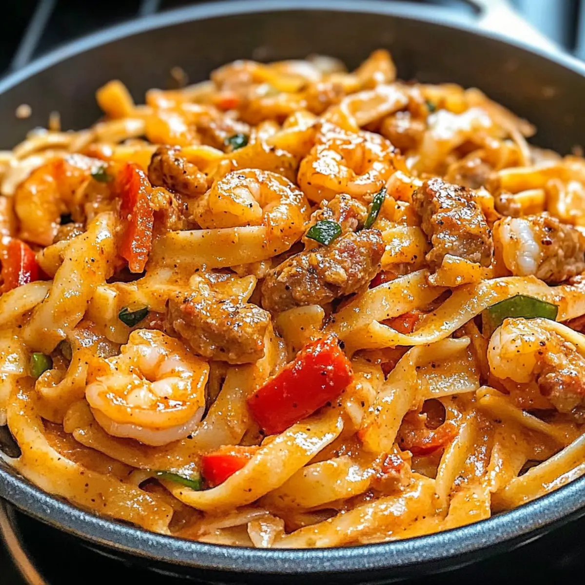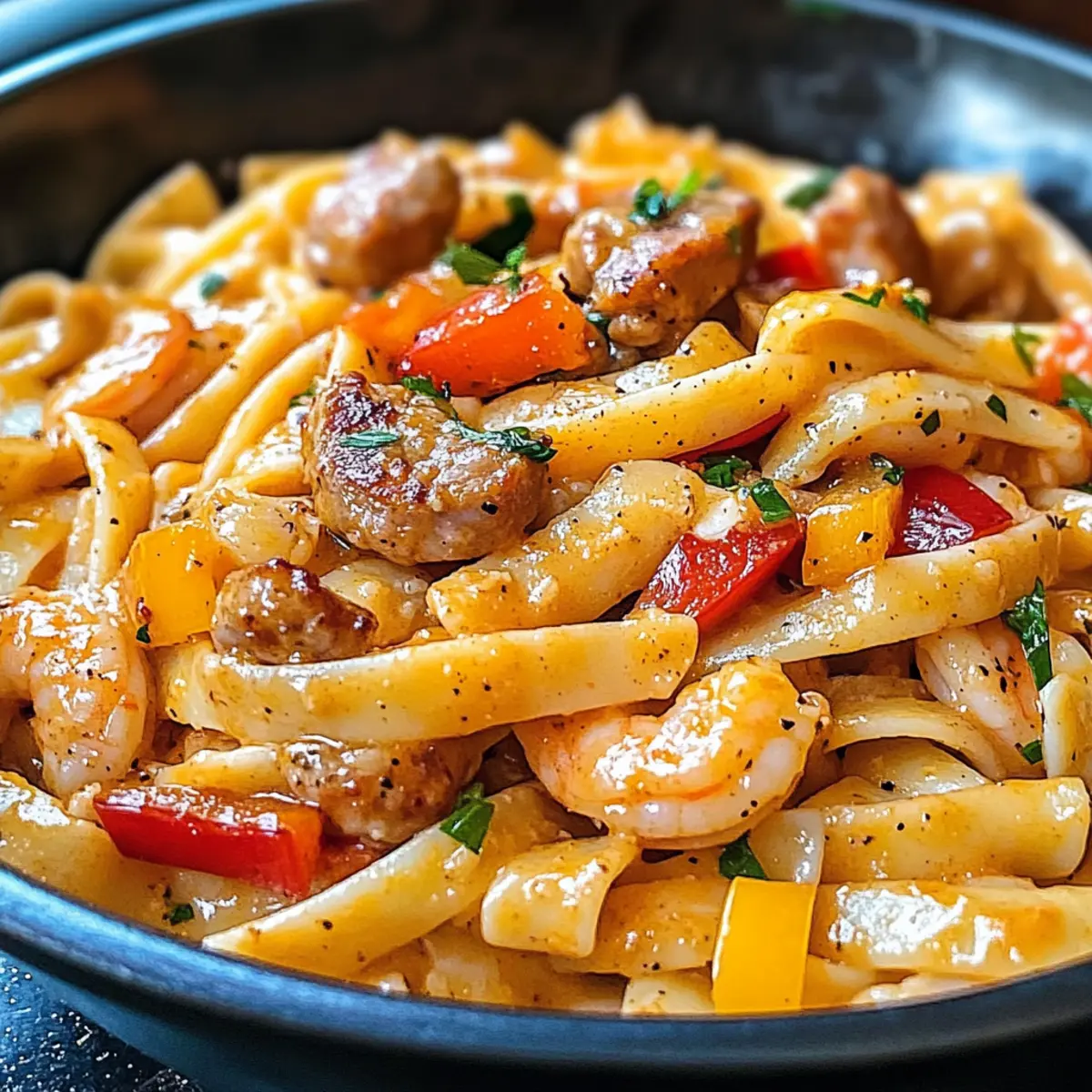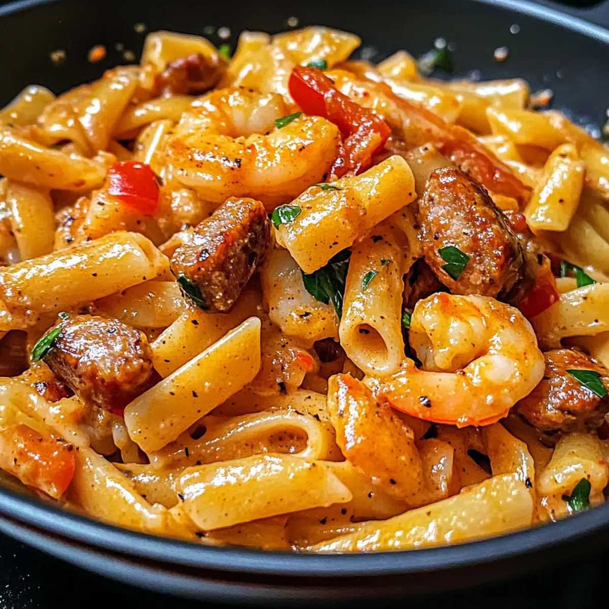 Hast du schon einmal das Gefühl gehabt, dass eine Mahlzeit dich direkt in eine Feststimmung versetzen kann? Bei diesem Rezept für die Creamy Cajun Pappadeaux Mardi Gras Pasta ist genau das der Fall! Diese köstliche Mischung aus saftigen Garnelen, würziger Andouille-Wurst und einer cremigen Cajun-Sauce verwandelt dein Abendessen in ein wahres Fest der Aromen. Ideal für hektische Tage, lässt sich dieses Gericht in nur 40 Minuten zubereiten, sodass du deinen Gaumen nicht mit schnellem Essen verwöhnen musst. Egal, ob du für die Familie kochst oder einen gemütlichen Abend mit Freunden planst, diese Pasta wird deine Gäste begeistern und ihnen das Gefühl geben, als wären sie bei einer Feier im Herzen von New Orleans. Bist du bereit, deinem Kochkünsten einen Hauch von Cajun-Feuer zu verleihen? Warum wirst du dieses Rezept lieben? Ein Fest für den Gaumen: Dieses Gericht bietet eine geschmackvolle Explosion aus Aromen, die dich sofort in Urlaubslaune versetzen. Schnelle Zubereitung: In nur 40 Minuten zauberst du mit dieser einfachen Zubereitung ein köstliches Dinner, ideal für hektische Abende. Vielseitige Variationen: Ob mit Hähnchen oder Scallops statt Garnelen – du kannst die Zutaten ganz nach deinem Geschmack anpassen. Cremige Textur: Die reichhaltige Sauce vereint die Aromen perfekt und sorgt für ein unwiderstehliches Mundgefühl. Crowd-Pleaser: Dieses Gericht begeistert sowohl Familie als auch Freunde und bringt das richtige Cajun-Feeling auf den Tisch. Für mehr Ideen, wie du deine Pasta aufpeppen kannst, schau dir unsere Tipps zur perfekten Pastazubereitung an! Pappadeaux Mardi Gras Pasta Zutaten Linguine oder Fettuccine Pasta – Dient als Basis des Gerichts und sorgt für den richtigen Biss; verwende glutenfreie Pasta als Alternative. Olivenöl – Unentbehrlich für das Anbraten; neutrales Öl kann ebenfalls verwendet werden. Zwiebel – Bringt Geschmack und Aroma; weiße oder gelbe Zwiebeln sind gute Substitute. Rote Paprika – Fügt Süße und Farbigkeit hinzu; gelbe oder orange Paprika sind ebenfalls möglich. Grüne Paprika – Sorgt für Frische und Textur; andere Paprikafarben sind ebenfalls geeignet. Knoblauch – Verstärkt den Geschmack; frischer Knoblauch ist ideal, bei Bedarf kann auch Knoblauchpulver verwendet werden. Andouille-Wurst – Liefert einen rauchigen, würzigen Geschmack; geräucherte Wurst oder Chorizo sind schmackhafte Alternativen. Garnelen – Bringen eine Meeresnote und Proteine ins Spiel; frische oder tiefgefrorene Garnelen können genutzt werden, lass tiefgefrorene vorher auftauen. Dosen-Tomaten – Fügt Säure und Feuchtigkeit hinzu; frische Tomaten sind in der Saison eine großartige Alternative. Schlagsahne – Macht die Sauce cremig und reichhaltig; halb und halb eignet sich für eine leichtere Option. Cajun-Gewürz – Verleiht dem Gericht den typischen Kick; Anpassung nach Geschmack – rote Pfefferflocken für mehr Schärfe. Salz und Pfeffer – Essentiell zum Würzen; nach Belieben verwenden. Frische Petersilie – Fügt Frische und Farbe als Garnitur hinzu; Koriander kann ebenfalls verwendet werden, wenn gewünscht. Geriebener Parmesan – Sorgt für Cremigkeit und einen umami Geschmack; nutritional yeast als milchfreie Option ist möglich. Diese Pappadeaux Mardi Gras Pasta wird dich dank ihrer vielfältigen Zutaten und Geschmäcker in eine kulinarische Feier verwöhnen! Schritt-für-Schritt-Anleitung für Pappadeaux Mardi Gras Pasta Step 1: Pasta kochen Bringe einen großen Topf gesalzenes Wasser zum Kochen. Gib die Linguine oder Fettuccine hinein und koche sie für 8–10 Minuten, bis sie al dente sind. Rühre gelegentlich um, damit sie nicht zusammenkleben. Sobald die Pasta fertig ist, gieße sie ab und stelle sie beiseite. Step 2: Gemüse anbraten Erhitze in einer großen Pfanne bei mittlerer Hitze 2 Esslöffel Olivenöl. Füge gewürfelte Zwiebeln und die geschnittenen Paprika hinzu und brate sie etwa 5 Minuten lang an, bis sie weich und leicht angebraten sind. Achte darauf, dass das Gemüse eine schöne Farbgebung entwickelt, was den Geschmack verstärkt. Step 3: Knoblauch und Wurst hinzufügen Rühre den gehackten Knoblauch und die Andouille-Wurst in die Pfanne und koche alles für weitere 3–4 Minuten. Die Wurst sollte anfangen, leicht braun zu werden, während der Knoblauch köstlich duftet. Achte darauf, die Mischung ständig zu rühren, um ein Anbrennen zu vermeiden. Step 4: Garnelen garen Gib die Garnelen in die Pfanne und brate sie für 3–4 Minuten, bis sie eine rosa Farbe annehmen. Achte darauf, dass die Garnelen gleichmäßig garen, ohne zu überkochen, damit sie zart bleiben. Rühre regelmäßig um, damit sie gleichmäßig gegart werden. Step 5: Sauce zubereiten Gieße die Dosen-Tomaten und die Schlagsahne in die Pfanne und rühre gut um. Würze die Mischung mit Cajun-Gewürz, Salz und Pfeffer nach Geschmack. Lasse die Sauce bei schwacher Hitze etwa 5–7 Minuten köcheln, bis sie leicht eingedickt ist und ein herzhaftes Aroma verbreitet. Step 6: Pasta und Sauce kombinieren Füge die gekochte Pasta in die Pfanne und vermenge alles gründlich, sodass die Pasta gleichmäßig mit der Sauce überzogen ist. Erhitze die Mischung nochmals für 2–3 Minuten, bis alles gut durchgewärmt ist. Dies sorgt dafür, dass sich die Aromen perfekt verbinden. Step 7: Gericht vollenden Nimm die Pfanne vom Herd und mische die gehackte Petersilie und den geriebenen Parmesan unter. Die frische Petersilie bringt Farbe und einen Aromakick, während der Parmesan für eine cremige Note sorgt. Serviere die Pappadeaux Mardi Gras Pasta sofort und genieße das Fest der Aromen! Tipps für die beste Pappadeaux Mardi Gras Pasta Die richtige Pasta: Verwende Linguine oder Fettuccine für die perfekte Grundlage. Da diese Pasta besser die Sauce hält, wird jede Gabel voll mit Geschmack sein. Achte auf die Garzeit der Garnelen: Koche die Garnelen nur, bis sie rosa sind. Überkoche sie nicht, da sie sonst gummig werden, was du bei deiner Pappadea