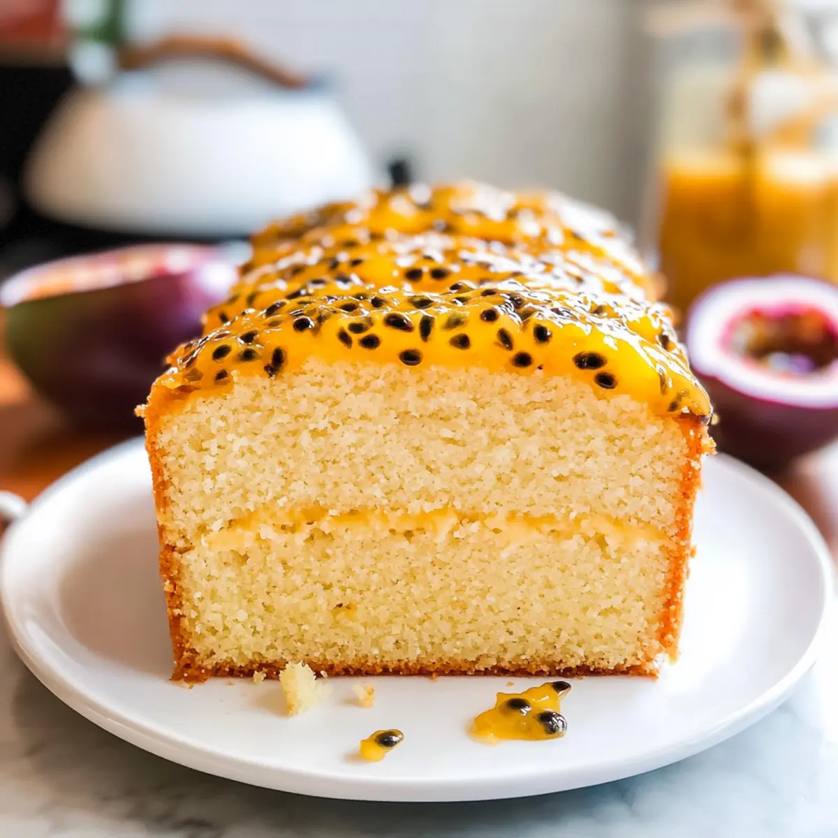 Ein leiser Duft von tropischen Früchten schwebt durch meine Küche, während ich an meinem neuen Lieblingsrezept arbeite: dem Passionsfruchtkuchen! Diese zarte, saftige Köstlichkeit bringt nicht nur den exotischen Geschmack von Passionsfrüchten und Limetten auf den Tisch, sondern ist auch ideal für jede Gelegenheit – sei es ein gemütlicher Nachmittagskaffee oder eine festliche Feier mit Freunden. Mit seiner einfachen Zubereitung ist dieser Kuchen sowohl für erfahrene Hobbyköche als auch für Neulinge perfekt geeignet. Und das Beste daran? Der frisch zubereitete Sirup aus Passionsfrüchten sorgt für einen fruchtigen Kick und macht jedes Stück zu einem unverwechselbaren Genuss. Neugierig, wie du diesen tropischen Genuss nachbacken kannst? Lass uns gleich loslegen! Warum wirst du dieses Rezept lieben? Einfachheit: Dieser saftige Passionsfruchtkuchen ist unkompliziert und erfordert nur wenige grundlegende Backkenntnisse. Fruchtiger Genuss: Die Kombination aus Passionsfrüchten und Limetten sorgt für einen erfrischenden, tropischen Geschmack, der jeden Biss zu einem Erlebnis macht. Vielseitigkeit: Perfekt für jeden Anlass, ob Teestunde oder festliche Feier – dieser Kuchen passt immer! Du kannst ihn auch einfach mit etwas Sahne oder frischen Früchten servieren. Einmalige Textur: Mit seiner feuchten, fluffigen Konsistenz und dem glänzenden Sirup-Topping ist dieser Kuchen ein echter Hingucker. Ideale Vorbereitung: Der Kuchen lässt sich wunderbar im Voraus zubereiten, gerade rechtzeitig für kurzfristige Gäste. Probiere zusätzlich die Variationen für Passionsfruchtkuchen, um ihn ganz nach deinem Geschmack anzupassen! Passionsfruchtkuchen Zutaten Für den Teig Ungesalzene Butter – sorgt für reichhaltigen Geschmack und Feuchtigkeit; vor dem Gebrauch auf Zimmertemperatur bringen. Zucker (fein) – süßt den Kuchen und trägt zur zarten Textur bei. Große Eier – verleihen Struktur und Feuchtigkeit; ebenfalls auf Zimmertemperatur bringen für bestes Mischverhalten. Selbstantauendes Mehl – sorgt für die nötige Lockerheit; kann auch durch normales Mehl mit Backpulver ersetzt werden. Salz – verstärkt das Geschmacksprofil des Kuchens. Sauerrahm – fügt zusätzliche Feuchtigkeit und Cremigkeit hinzu; griechischer Joghurt oder Buttermilch sind gute Alternativen. Mittlere Passionsfrucht – schenkt dem Kuchen sein einzigartiges, tropisches Aroma; unbedingt reif verwenden. Mittlere Limetten – sorgen für einen frischen, spritzigen Kontrast; nur den Saft für den Sirup nutzen. Zusätzlicher Zucker (für den Sirup) – süßt die Mischung und sorgt für einen glänzenden Überzug. Für den Sirup Passionsfruchtsaft – für ein intensives, fruchtiges Aroma; die besten Ergebnisse erfordert frischer Saft. Limettensaft – fügt zusätzliche Frische hinzu und balanciert die Süße aus. Genieße diesen köstlichen Passionsfruchtkuchen, der mit seiner tropischen Geschmacksvielfalt sicher beeindrucken wird! Step-by-Step Instructions for Passionsfruchtkuchen Step 1: Ofen vorheizen Heize deinen Ofen auf 180°C (160°C Umluft) vor. Dies ist wichtig, damit der Passionsfruchtkuchen gleichmäßig backt und die perfekte Konsistenz erhält. Vergiss nicht, deine Backform im nächsten Schritt vorzubereiten, sodass alles bereit ist, wenn der Ofen fertig ist. Step 2: Backform vorbereiten Fette eine 1,2-Liter-Kastenform gründlich ein und lege sie mit Backpapier aus. Dies verhindert, dass der Passionsfruchtkuchen kleben bleibt und sorgt für ein einfaches Herauslösen nach dem Backen. Achte darauf, dass die Form gleichmäßig gefettet ist, damit der Teig gut aufgeht. Step 3: Butter und Zucker cremig schlagen Verrühre die Zimmertemperaturbutter und den feinen Zucker mit einem elektrischen Mixer für etwa 3-4 Minuten, bis die Mischung hell und fluffig ist. Achte darauf, dass du die Seiten der Schüssel zwischenzeitlich abkratzen, um alles gleichmäßig zu vermischen. Step 4: Eier nach und nach hinzufügen Gib die geschlagenen Eier nacheinander hinzu – jeweils einen Esslöffel – und achte darauf, dass jedes Ei vollständig eingearbeitet ist, bevor du das nächste hinzufügst. Dies sorgt für eine gleichmäßige Textur im Passionsfruchtkuchen und verhindert, dass der Teig gerinnt. Step 5: Trockene Zutaten einarbeiten Siebe die Hälfte des selbstantauenden Mehls und das Salz über die Mischung und falte sie vorsichtig unter. Füge dann den Sauerrahm hinzu und vermische alles, bis es gerade so verbunden ist. Füge das restliche Mehl hinzu und falte es sanft unter, bis keine großen Mehlstücke mehr sichtbar sind. Step 6: Backen Gieße den Teig in die vorbereitete Form und glätte die Oberfläche mit einem Spatel. Backe den Passionsfruchtkuchen für etwa 1 Stunde oder bis ein Zahnstocher in der Mitte sauber herauskommt. Achte darauf, dass der Kuchen leicht goldbraun ist und beim Drücken zurückfedert. Step 7: Abkühlen lassen Lasse den Kuchen 10 Minuten in der Form abkühlen, bevor du ihn vorsichtig auf ein Kuchengitter umsetzt. Dies verhindert, dass er beim Abkühlen durch die Form dampfnass wird, und sorgt für eine bessere Kruste. Step 8: Sirup vorbereiten Extrahiere den Saft aus den Passionsfrüchten und mische ihn mit dem Limettensaft in einer kleinen Schüssel. Sobald der Kuchen abgekühlt ist, steche mit einem Holzspieß vorsichtig Löcher in den Kuchen und bestreiche ihn mit der Hälfte der Saftmischung, sodass er die Aromen gut aufnehmen kann. Step 9: Letzte Verfeinerung Vermische den restlichen Saft mit den aufbewahrten Samen und dem zusätzlichen Zucker. Diese Mischung gieße gleichmäßig über den Kuchen, um ihm eine glänzende Kruste zu verleihen. Lass den Passionsfruchtkuchen einige Minuten setzen, bevor du ihn servierst, damit der Sirup gut einziehen kann. Vorbereitungen für den Passionsfruchtkuchen • Diese köstlichen Passionsfruchtkuchen sind ideal für alle, die ihre Mahlzeiten im Voraus planen möchten! Du kannst den Boden des Kuchens bis zu 24 Stunden im Voraus backen un