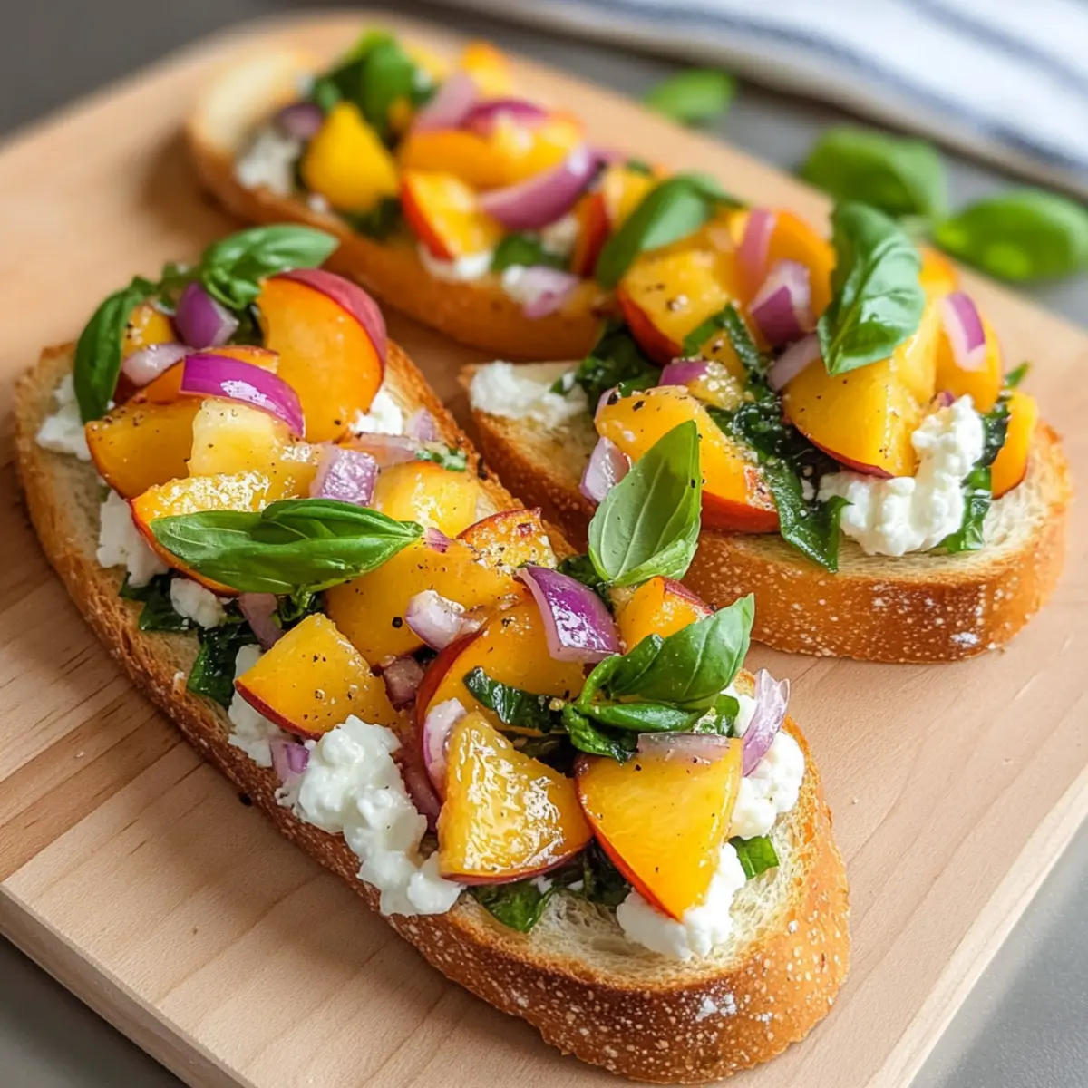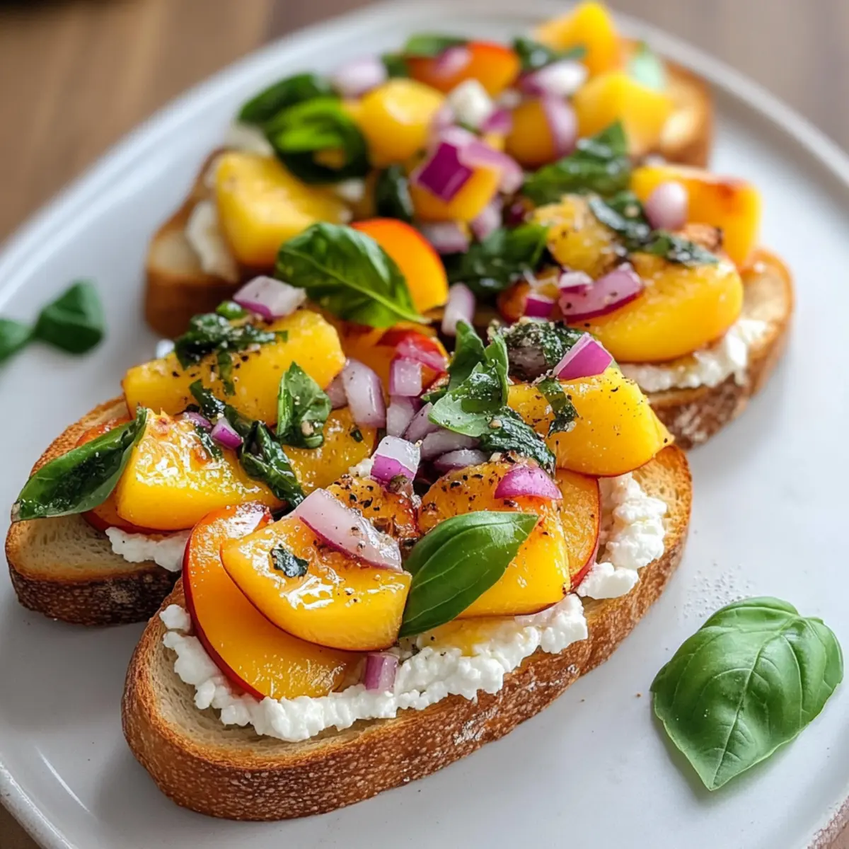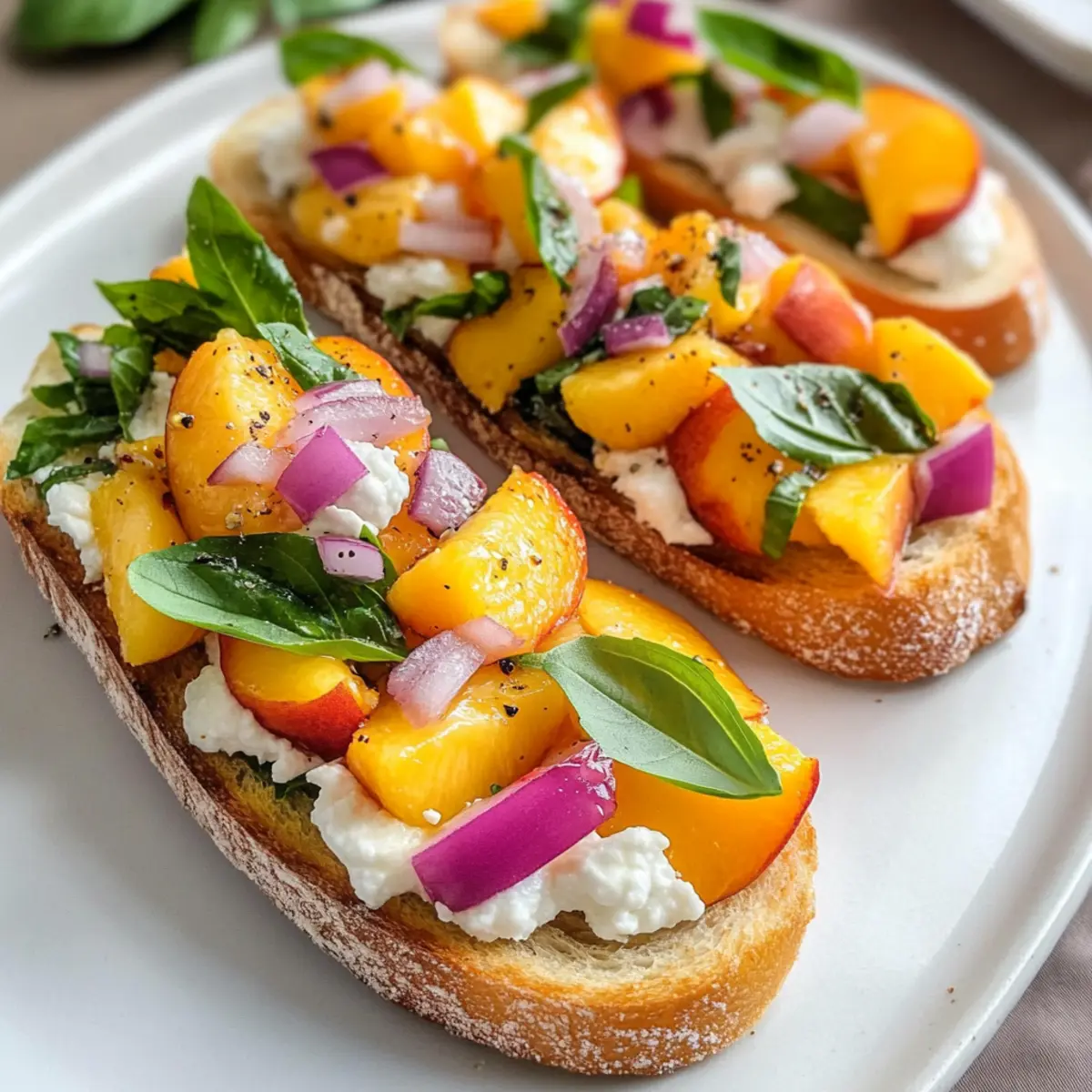 Es war ein sonniger Sonntagnachmittag, als ich in den örtlichen Markt schlenderte und die Farben des Sommers auf mich wirken ließ. Plötzlich sah ich sie: die saftigsten Pfirsiche, die direkt nach Reife dufteten. Kurz darauf entstand die Idee für meine Pfirsich Bruschetta – eine einfache, aber köstliche Kombination aus süßen Pfirsichen, cremigem Ziegenkäse und frischem Basilikum auf knusprigen Baguettescheiben. Dieses Rezept bringt nicht nur sommerliche Aromen auf den Tisch, sondern ist auch ein wahrer Publikumsliebling, der sich perfekt für Partys oder entspannte Nachmittage eignet. Die Zubereitung ist schnell und unkompliziert, sodass du mehr Zeit mit deinen Gästen verbringen kannst. Bist du bereit, dich in diesen köstlichen Genuss zu verwöhnen? Warum wirst du Pfirsich Bruschetta lieben? Einfachheit verbindet: Dieses Rezept für Pfirsich Bruschetta ist ein Kinderspiel – selbst wenn du kein Küchenprofi bist, gelingt dir dieses Gericht mühelos. Saisonale Frische: Die Verwendung saftiger, reifer Pfirsiche zusammen mit aromatischem Basilikum bringt die Essenz des Sommers in jede Biss. Crowd-Pleaser: Perfekt für jede Veranstaltung, von BBQs bis zu formellen Dinnerpartys – deine Gäste werden begeistert sein! Flexibilität und Vielfalt: Probiere auch andere Früchte oder Käsesorten aus, um deine eigene, einzigartige Variante zu kreieren. Wenn du nach weiteren köstlichen Rezepten suchst, kannst du auch unsere Zitronen Brownies Einfach oder die Herzhafte Minestrone Suppe entdecken! Schnelle Zubereitungszeit: In nur wenigen Minuten hast du ein beeindruckendes Gericht auf dem Tisch – ideal für spontane Anlässe und gesellige Runden. Pfirsich Bruschetta Zutaten • Entdecke alle Zutaten für dieses sommerliche Vergnügen! Für die Baguettebasis Baguette – – Die Basis für die Bruschetta; broiliere es, bis es goldbraun und knusprig ist. Für das Topping Pfirsiche – – Verwende feste, reife Pfirsiche für optimale Süße und Textur. Rote Zwiebel – – Fein gehackt, sorgt sie für eine subtile Schärfe und schöne Farbkontraste. Knoblauch – – Minziert für einen herzhaften Geschmack, optional auf den warmen Scheiben reiben. Frisches Basilikum – – Kurz vor dem Servieren hinzugefügt, bringt es frische Aromen und Farbe. Ziegenkäse (Chèvre) – – Cremige Basis, die eine köstliche, säuerliche Note hinzufügt. Olivenöl & Honig – – Ein spritziger Drizzel sorgt für Glanz und eine angenehme Süße. Schritt-für-Schritt-Anleitung für Pfirsich Bruschetta Step 1: Baguette broilen Schneide ein großes Baguette in 24 gleichmäßige Scheiben. Heize deinen Ofen auf die Grillfunktion (Broil) vor. Lege die Baguettescheiben auf ein Backblech und grille sie auf der obersten Schiene für 2–3 Minuten, bis die Ränder leicht goldbraun und knusprig sind. Achte darauf, sie nicht zu lange zu grillen, um ein Verbrennen zu vermeiden. Lass die Baguettescheiben anschließend abkühlen. Step 2: Topping zubereiten In einer großen Schüssel vermenge die fein gehackten Pfirsiche, rote Zwiebel, den minced Knoblauch und die in Streifen geschnittenen Basilikumblätter. Mische alles vorsichtig mit einem Löffel, damit die Pfirsiche nicht zerdrückt werden. Lasse die Mischung etwa 5 Minuten ruhen, damit sich die Aromen entfalten können, wodurch das Topping für die Pfirsich Bruschetta noch geschmackvoller wird. Step 3: Bruschetta zusammensetzen Nimm die abgekühlten Baguettescheiben und verteile auf jeder Scheibe etwa 1 Teelöffel Ziegenkäse gleichmäßig. Diese cremige Basis ist perfekt, um die Aromen der frischen Pfirsiche zu ergänzen. Platzieren dann auf jeder Scheibe etwa 1 Esslöffel der vorbereiteten Pfirsich-Mischung. Achte darauf, großzügig zu sein, damit jede Bruschetta schön fest belegt ist. Step 4: Fertigstellen & Servieren Arrangiere die Pfirsich Bruschetta auf einem Servierteller. Träufle vor dem Servieren etwas Olivenöl und Honig über die Bruschetta, um ihnen zusätzlichen Glanz und eine süße Note zu verleihen. Vergewissere dich, dass die Bruschetta bei Zimmertemperatur serviert werden. Dies sorgt dafür, dass die Texturen und Aromen ihrer vollen Entfaltung kommen. Pfirsich Bruschetta Variationen Lass deiner Kreativität freien Lauf und passe dieses köstliche Rezept nach deinem Geschmack an! Nektarinen: Tausche die Pfirsiche gegen Nektarinen für eine andere süße Variante. Die Textur bleibt cremig und lecker. Rote Zwiebel Variationen: Verwende Schalotten anstelle von roten Zwiebeln für einen milderen Geschmack. Sie verleihen der Mischung eine feine Note, die wunderbar harmoniert. Ziegenkäse-Alternativen: Ersetze Ziegenkäse durch cremige Ricotta oder einen milden Brie. Diese Käsesorten bringen eine andere Dimension, die ebenso köstlich ist. Kräuterwechsel: Probiere frischen Thymian statt Basilikum aus. Der erdige Geschmack des Thymians ergibt eine köstliche Kombination mit den süßen Pfirsichen. Würzige Note: Füge zerdrückte rote Pfefferflocken hinzu, um einen scharfen Kick zu erreichen. Diese kleine Veränderung sorgt für aufregende Geschmackserlebnisse. Honig-Variationen: Experimentiere mit verschiedenen Honigsorten wie Lavendel- oder Thymianhonig. Die Aromen werden deine Bruschetta auf ein neues Level heben! Nussiger Crunch: Streue gehackte Mandeln oder Walnüsse über die Bruschetta, um zusätzlichen Crunch und nussigen Geschmack zu verleihen. Dies bringt eine wunderbare Textur zur cremigen Füllung. Fruchtige Fusion: Mische Pfirsiche mit frischen Himbeeren oder Blaubeeren für ein fruchtiges Update. Diese Beeren verleihen den Toasts eine schöne Farbe und säuerliche Frische. Wenn du nach weiteren köstlichen Rezepten suchst, schau dir auch unsere Zitronen Brownies Einfach oder die Herzhafte Minestrone Suppe an! Perfekte Vorbereitungen für Pfirsich Bruschetta Die Pfirsich Bruschetta ist ideal für alle, die Zeit sparen möchten! Um die Zubereitung zu erleichtern, kannst du die Topping-Mischung aus Pfirsichen, roten Zwiebeln, Knoblauch 