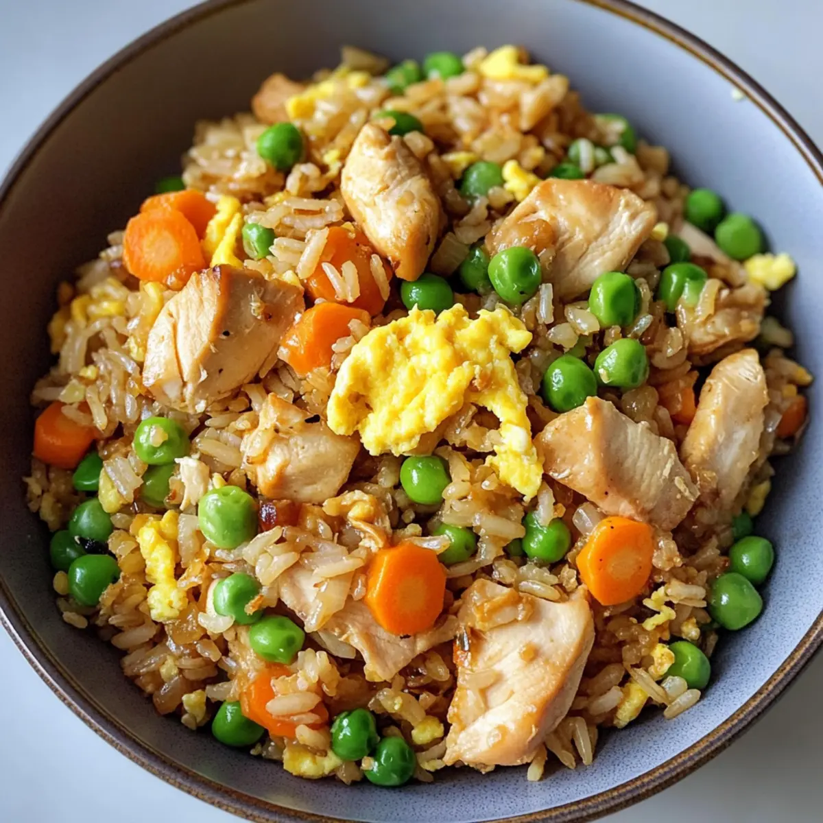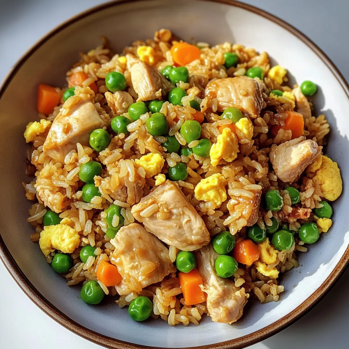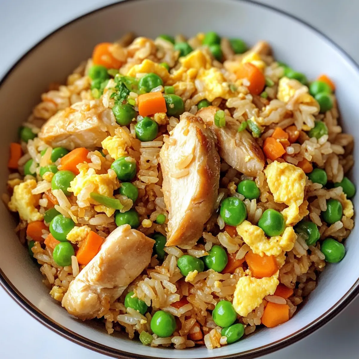 Das Aroma von frisch gebratenem Reis schleicht sich in meine Küche und lässt mir das Wasser im Mund zusammenlaufen. Heute präsentiere ich euch ein Rezept für Protein-reiches Hähnchen gebratenen Reis, das nicht nur rasch zubereitet ist, sondern auch vollgepackt mit zartem Hühnchen, buntem Gemüse und aromatischen Saucen. Ideal für hektische Wochentage, vereint dieses Gericht gesunde Zutaten mit köstlichem Geschmack – jede Gabel ist wie eine wärmende Umarmung. Und das Beste daran? Es ist total anpassbar: Ihr könnt die Zutaten je nach Vorlieben und diätetischen Bedürfnissen abwandeln! Bereit für ein aufregendes Kocherlebnis? Lasst uns gemeinsam loslegen! Warum wirst du dieses Rezept lieben? Einfachheit: Dieses Rezept ist kinderleicht! Mit nur wenigen Zutaten und schnellen Schritten gelingt dir ein köstliches Gericht, das sogar nach einem langen Arbeitstag nicht viel Zeit in Anspruch nimmt. Gesund und nährstoffreich: Mit proteinreichem Hühnchen und buntem Gemüse versorgst du deinen Körper nicht nur mit Energie, sondern auch mit vitalen Nährstoffen. Vielseitigkeit: Egal, ob du eine vegetarische Variante mit Tofu oder eine glutenfreie Option mit Tamari möchtest, dieses Rezept ist extrem anpassbar und passt sich jeder Vorliebe an. Schnelle Zubereitung: In weniger als 30 Minuten hast du ein schmackhaftes Gericht auf dem Tisch – perfekt für stressige Wochentage oder spontane Gäste. Beliebtheit: Fried Rice ist ein zeitloser Klassiker, der bei Familien und Freunden immer gut ankommt – und das ganz zu Recht! Probiere es aus und erlebe die Begeisterung selbst! Protein-reiches Hähnchen gebratener Reis Zutaten • Hier sind die Zutaten, die du benötigst: Für das Öl: Pflanzenöl – Ein neutrales Öl wie Raps- oder Avocadoöl eignet sich hervorragend zum Braten. Für das Hähnchen: Hähnchenbrustfilets ohne Haut und Knochen – Diese mageren Proteinquellen sind schnell gar und können durch Garnelen oder Tofu ersetzt werden. Für die Grundgewürze: Salz und Pfeffer – Grundwürze, die den Geschmack des Gerichts hervorhebt. Für den Reis: Gekochter, gekühlter Vollkornreis – Er sorgt für eine angenehme Bissfestigkeit und liefert gesunde Ballaststoffe; weißer Reis ist eine gute Alternative. Für die Eier: Große Eier – Sie fügen dem Gericht eine cremige Konsistenz und zusätzlichen Eiweißgehalt hinzu; frische Eier werden empfohlen. Für das Gemüse: Gefrorene Erbsen und Karotten – Diese sorgen für Farbe und sind sofort einsatzbereit; frisches Gemüse erfordert jedoch mehr Garzeit. Für den Geschmack: Knoblauch (gehackt) – Er bringt eine aromatische Grundlage ins Spiel und verbessert den Geschmack; frischer oder pulverisierter Knoblauch sind geeignet. Weiße Zwiebel (gewürfelt) – Sie gibt Süße und Knackigkeit; bis sie durchsichtig ist, anbraten. Grüne Zwiebeln sind eine milde Alternative. Für die Saucen: Sojasauce (low sodium) – Sie bringt Umami und Tiefe; nutze sie, um den Salzgehalt zu kontrollieren. Tamari ist perfekt für glutenfreie Optionen. Austernsauce – Sie sorgt für eine süße und reichhaltige Note; kann auch durch eine Mischung aus Sojasauce und etwas Zucker ersetzt werden. Sesamöl – Für ein nussiges Aroma; sparsam einsetzen, da der Geschmack sehr intensiv ist. Für das Finish: Grüne Zwiebeln (in Ringe geschnitten) – Fügen Frische und einen milden Zwiebelgeschmack hinzu; am Ende einrühren für Knackigkeit. Sesamkörner (optional) – Sie verleihen zusätzlichen Crunch; zum Garnieren verwenden. Entdecke die Vielfalt des protein-reichen Hähnchen gebratenen Reis und genieße jede köstliche Gabel! Schritt-für-Schritt-Anleitung für Protein-reiches Hähnchen gebratener Reis Step 1: Öl erhitzen Erhitze 1 Esslöffel Pflanzenöl in einer tiefen Pfanne oder Wok bei mittlerer bis hoher Temperatur. Achte darauf, dass das Öl heiß genug ist, bevor du das Hähnchen hinzufügst, um ein Anhaften zu verhindern und ein leichtes Spritzen zu vermeiden. Du solltest das Öl leicht schimmern sehen, wenn es bereit ist. Step 2: Hähnchen braten Würze die gewürfelten Hähnchenbrustfilets großzügig mit Salz und Pfeffer. Gebe das Hähnchen in die heiße Pfanne und brate es 5-6 Minuten lang, bis es goldbraun und durchgegart ist. Das Hähnchen sollte an allen Seiten schön gebräunt sein. Danach nimm es aus der Pfanne und stelle es beiseite. Step 3: Zwiebeln und Knoblauch sautieren Füge das restliche Öl in die Pfanne hinzu und lasse es kurz aufheizen. Gebe die gewürfelte Zwiebel und den gehackten Knoblauch hinzu und brate sie etwa 2-3 Minuten, bis die Zwiebel durchsichtig und der Knoblauch aromatisch ist. Achte darauf, die Mischung nicht anbrennen zu lassen, um den Geschmack zu bewahren. Step 4: Eier in die Pfanne geben Schlage die großen Eier in eine Schüssel und verquirle sie gut. Gieße die Eier in die Pfanne, wo die Zwiebeln und der Knoblauch sind, und rühre sie stetig um, bis sie vollständig gar sind. Es dauert nur 1-2 Minuten, bis die Eier fest werden und eine lockere Textur erhalten. Step 5: Reis hinzufügen Füge nun den gekühlten Vollkornreis in die Pfanne hinzu. Breche eventuell angeklumpte Reiskörner mit einer Holzspachtel auf und vermische den Reis gut mit den anderen Zutaten. Brate die Mischung für etwa 3 Minuten, bis der Reis gründlich erwärmt ist und leicht knusprig wird. Step 6: Gemüse und Saucen einmischen Gebe die gefrorenen Erbsen und Karotten, das bereits gebratene Hähnchen sowie die Sojasauce, Austernsauce und das Sesamöl hinzu. Rühre alles gut um und brate für weitere 2-3 Minuten, bis das Gemüse aufgetaut ist und alles gut vermischt ist. Der Duft von deinem protein-reichen Hähnchen gebratenen Reis sollte jetzt deine Küche erfüllen. Step 7: Finale Zubereitung Nimm die Pfanne vom Herd und füge die geschnittenen grünen Zwiebeln hinzu. Mische alles sanft, damit die Zwiebeln frisch und knackig bleiben. Achte darauf, nicht zu fest zu rühren, damit die Zutaten nicht zerdrückt werden. Step 8: Servieren Servier