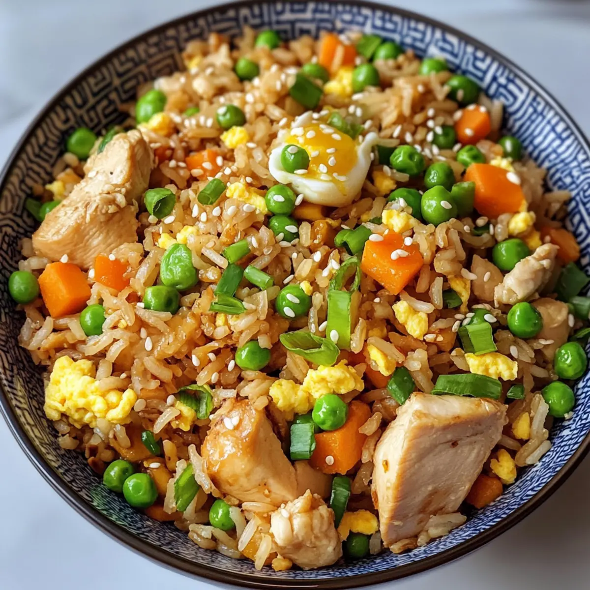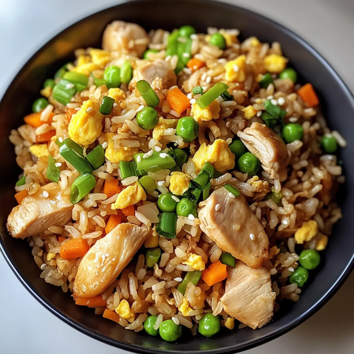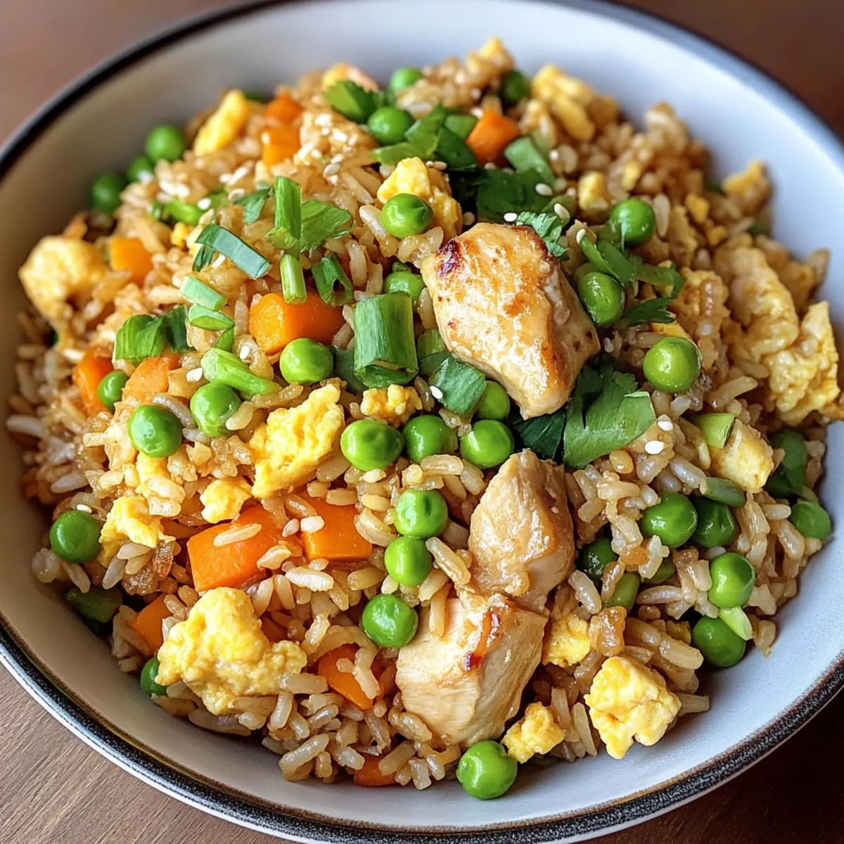 In meiner kleinen Küche hörte ich das leise Zischen der Pfanne, das sofort Erinnerungen an warme Familienabende und köstliche Mahlzeiten wachruft. Unser heutiges Rezept für proteinreichen Hähnchen-Bratreis wird nicht nur Ihre Geschmacksknospen verwöhnen, sondern auch in weniger als 30 Minuten zubereitet! Diese leckere Kombination aus zartem Hähnchen, nahrhaftem braunem Reis und bunten Gemüsesorten ist nicht nur ein Genuss, sondern auch eine gesunde Wahl für hektische Wochentage. Mit einer Prise Sojasauce, dem Aroma von Knoblauch und einem Hauch von geröstetem Sesamöl wird dieses Gericht zum Star Ihres Abendessens. Sind Sie bereit, gemeinsam das Geheimnis eines gesunden und schnellen Abendessens zu entdecken? Warum werden Sie dieses Rezept lieben? Einfache Zubereitung: Die Schritte sind leicht nachvollziehbar, und mit minimalen Küchengeräten können Sie in kürzester Zeit ein vollkommenes Gericht zaubern. Nährstoffreich: Mit zartem Hähnchen und farbenfrohen Gemüsesorten ist dieser Hähnchen-Bratreis nicht nur lecker, sondern liefert auch jede Menge Protein und Vitamine. Vielseitigkeit: Sie können ihn nach Belieben abwandeln, sei es mit Tofu für eine vegetarische Variante oder mit Blumenkohlreis für eine kohlenhydratarme Option. Familienliebling: Dieses Gericht kommt garantiert bei der ganzen Familie gut an und sorgt für glückliche Gesichter am Esstisch! Zeitsparend: In weniger als 30 Minuten haben Sie ein vollwertiges und schmackhaftes Abendessen, das perfekt für hektische Wochentage ist. Genießen Sie dazu gerne auch einen leckeren Spinatsalat mit Feta oder einen Gebackenen Lachs mit frischem Gemüse für ein abgerundetes Menü! Proteinreicher Hähnchen-Bratreis Zutaten Für das Öl • Pflanzenöl – dient als Kochmedium, um Anhaften zu verhindern; nutzen Sie auch Raps- oder Avocadoöl als Alternativen. Für das Hähnchen • Hähnchenbrustfilets, ohne Haut – die Hauptproteinquelle, in Würfel geschnitten für schnelles Garen; kann durch Garnelen, Tofu oder andere mageren Proteine ersetzt werden. Für die Würze • Salz und Pfeffer – verleihen den natürlichen Aromen einen Kick; nach Geschmack anpassen. • Sojasauce, natriumreduziert – sorgt für Umami-Geschmack; verwenden Sie Tamari für eine glutenfreie Option. • Austernsauce – bringt Süße und Reichhaltigkeit; alternativ können Sie Hoisin-Sauce oder eine Mischung aus Sojasauce und Zucker nutzen. Für die Reisbasis • Gekochter brauner Reis (vorzugsweise gekühlt) – bildet die Grundlage des Gerichts mit nussigem Geschmack; weißer Reis kann als Substitute verwendet werden, jedoch sind die Kochzeiten anzupassen. • Große Eier – fügen Proteine und Geschmeidigkeit hinzu; separat verrühren für eine fluffige Textur. Für das Gemüse • Gefrorene Erbsen und Karottenmischung – bequeme, bunte Gemüse für Süße und Vitamine; frische Alternativen können ebenfalls fein gewürfelt werden. • Frische Knoblauchzehen (gehackt) – verleiht aromatische Tiefe; bei Bedarf kann auch Knoblauchpulver verwendet werden. • Weiße Zwiebel (gewürfelt) – gibt natürliche Süße und Knusprigkeit; Schalotten können alternativ verwendet werden. • Frühlingszwiebeln (in Ringe geschnitten) – Garniert für Frische und milden Zwiebelgeschmack; können auch durch Schnittlauch oder Lauch ersetzt werden. Für das Finish • Sesamöl – für das Finishing, verleiht einen nussigen Aroma; vorsichtig dosieren, da ein wenig viel bewirken kann. • Optional: Sesamsamen – für eine zusätzliche Garnitur und Knusprigkeit. Dieser proteinreiche Hähnchen-Bratreis ist die perfekte Wahl für ein schnelles und gesundes Abendessen! Schritt-für-Schritt-Anleitung für Proteinreicher Hähnchen-Bratreis Step 1: Öl erhitzen Erhitzen Sie 1 Esslöffel Pflanzenöl in einer großen Pfanne oder einem Wok bei mittlerer bis hoher Hitze. Das Öl sollte schimmern, wenn es bereit ist. Diese Basis verhindert, dass die Zutaten ankleben und sorgt für ein gleichmäßiges Anbraten. Step 2: Hähnchen anbraten Würzen Sie die gewürfelten Hähnchenbrustfilets mit Salz und Pfeffer und geben Sie sie in die heiße Pfanne. Braten Sie das Hähnchen 5–6 Minuten lang, bis es goldbraun und durchgegart ist. Nehmen Sie das Hähnchen aus der Pfanne und legen Sie es zur Seite. Step 3: Zwiebeln und Knoblauch dünsten Fügen Sie das restliche Öl in die Pfanne hinzu und sautieren Sie die gewürfelte Zwiebel und den gehackten Knoblauch 2–3 Minuten lang, bis die Zwiebel weich und transparent ist. Achten Sie darauf, dass der Knoblauch nicht verbrennt, denn das kann bitter werden. Step 4: Eier hinzufügen Schieben Sie die Zwiebeln und den Knoblauch an eine Seite der Pfanne. Geben Sie die geschlagenen Eier hinein und rühren Sie sie, bis sie vollständig durchgegart sind und eine lockere, fluffige Textur entsteht. Dies sollte etwa 1–2 Minuten dauern. Step 5: Reis einrühren Fügen Sie den gekühlten braunen Reis in die Pfanne hinzu und brechen Sie eventuelle Klumpen auf. Braten Sie den Reis 3 Minuten lang unter ständigem Rühren an, bis er gleichmäßig erhitzt ist. Dies gibt dem Proteinreichen Hähnchen-Bratreis eine nussige Geschmacksnote. Step 6: Gemüse und Saucen mischen Mischen Sie die gefrorene Erbsen- und Karottenmischung, das Hähnchen, die Sojasauce, die Austernsauce und das Sesamöl in die Pfanne. Kochen Sie alles für weitere 2–3 Minuten unter Rühren, bis das Gemüse aufgetaut und alles gut vermischt ist. Step 7: Frühlingszwiebeln einarbeiten Nachdem der Hähnchen-Bratreis durchgegart ist, nehmen Sie die Pfanne vom Herd und fügen Sie die geschnittenen Frühlingszwiebeln hinzu. Mischen Sie sie sanft unter, um frische Aromen zu integrieren und Ihrem Gericht einen Farbenfrohen Touch zu verleihen. Step 8: Servieren und garnieren Servieren Sie den Proteinreichen Hähnchen-Bratreis warm auf Tellern, garniert mit optionalen Sesamsamen, wenn gewünscht. Genießen Sie das köstliche und nahrhafte Gericht! Lagerungstipps für Proteinreicher H