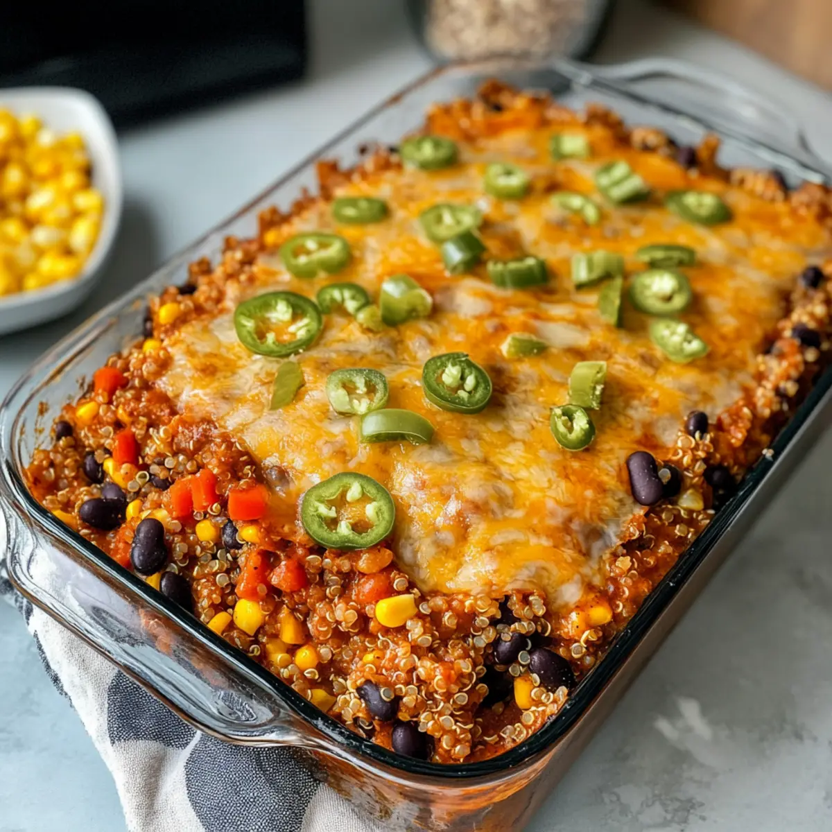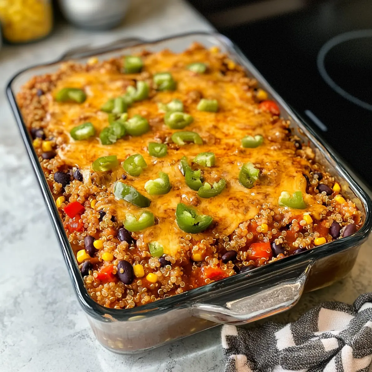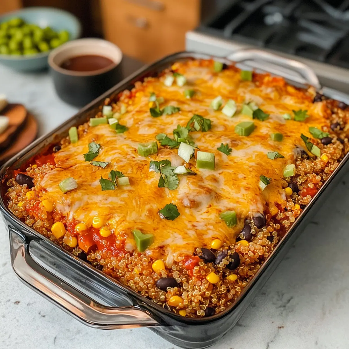 In einem kleinen Café im Herzen von Mexiko entdeckte ich einmal ein Gericht, das mich sofort verzauberte. Die Kombination aus cremigem Käse und herzhaft gewürztem Enchilada-Sauce ließ mich nicht mehr los. Heute lade ich dich ein, dieses Geschmackserlebnis in Form eines einfachen Quinoa Enchilada Auflaufs nachzukochen! Dieses Rezept ist ideal für all jene, die auf der Suche nach einer gesunden, vegetarischen Mahlzeit sind, die sowohl schnell zuzubereiten als auch perfekt für stressige Wochentage geeignet ist. Mit der Dump-and-Bake-Methode bleibt nicht nur die Küche sauber, sondern du kannst auch die köstlichen Aromen genießen, die beim Backen entstehen. Hast du schon einmal eine so einfache Art entdeckt, ein so befriedigendes Gericht zuzubereiten? Lass uns gemeinsam diesen köstlichen Auflauf zubereiten! Warum ist dieser Quinoa Enchilada Auflauf besonders? Vielfalt der Aromen: Dieser Auflauf kombiniert cremige Käse- und herzhaft gewürzte Enchilada-Sauce zu einem unvergleichlichen Geschmackserlebnis. Gesunde Zutaten: Quinoa und frisches Gemüse machen jedes Bisschen nährstoffreich und sättigend. Einfache Zubereitung: Die Dump-and-Bake-Methode bedeutet, minimal Zeit in der Küche zu verbringen, sodass du mehr Zeit für Familie oder Freunde hast. Küchenfreundlich: Mit nur einer Auflaufform bleibt die Küche ordentlich, und die Reinigung ist ein Kinderspiel. Vielseitige Anpassungen: Fülle deinen Auflauf ganz nach Belieben mit zusätzlichem Gemüse wie Zucchini oder Spinat – die Möglichkeiten sind endlos! Vorbereitung für den Alltag: Ideal für stressige Wochentage, genieße einen gesunden, leckeren Auflauf, ohne viel Aufwand. Quinoa Enchilada Auflauf Zutaten Für die Basis Quinoa – sorgt für eine proteinreiche Grundlage und ist leicht zuzubereiten. Enchilada-Sauce – bringt Tiefe und Feuchtigkeit ins Gericht; wähle zwischen milder oder scharfer Variante. Schwarze Bohnen – fügen Ballaststoffe und eine herzhafte Textur hinzu; alternativ können auch Kidney- oder Pintobohnen verwendet werden. Mais (gefroren oder aus der Dose) – sorgt für Süße und Knusprigkeit; frischer Mais kann für noch mehr Biss verwendet werden. Für die Cremigkeit Käse (gerieben, wie Cheddar oder Monterey Jack) – schmilzt perfekt und bildet eine köstliche Kruste; verwende für eine vegane Option Käsealternative. Für den Frischekick Paprika – steigert die Frische sowie den Crunch; fein hacken, wenn frisch verwendet, oder ganz weglassen. Optionale Zutaten Olivenöl (optional) – verleiht zusätzlichen Geschmack und hilft, die Zutaten zu vermischen; ist bei einer leichteren Version nicht unbedingt nötig. Genieße die Zubereitung deines Quinoa Enchilada Auflaufs – eine gesunde und einfache Möglichkeit, leckeres Essen auf den Tisch zu bringen! Schritt-für-Schritt-Anleitung für den Quinoa Enchilada Auflauf Step 1: Ofen vorheizen Heize den Ofen auf 190°C (375°F) vor. Dies ist wichtig, damit der Quinoa Enchilada Auflauf gleichmäßig garen kann. Das Vorheizen sorgt dafür, dass alle Zutaten bei der richtigen Temperatur beginnen, wodurch der Auflauf schön durchgegart und der Käse wunderbar schmelzen kann. Step 2: Zutaten kombinieren Nehme eine große Auflaufform und gebe die trockene Quinoa, Enchilada-Sauce, die gut abgespülten schwarzen Bohnen, den Mais, die fein gehackten Paprika und den geriebenen Käse hinein. Rühre alles gut durch, bis alle Zutaten gleichmäßig miteinander vermischt sind und die leckeren Aromen der Sauce sich entfalten. Step 3: Flüssigkeit hinzufügen Gieße Wasser oder Gemüsebrühe gleichmäßig über die Mischung in der Auflaufform. Achte darauf, die Flüssigkeit gleichmäßig zu verteilen, damit die Quinoa beim Garen ausreichend Feuchtigkeit aufnehmen kann. Rühre nochmals vorsichtig um, um sicherzustellen, dass alle Zutaten gut vermischt sind. Step 4: Abdecken und backen Decke die Auflaufform mit Aluminiumfolie ab, um die Feuchtigkeit zu halten, und stelle sie in den vorgeheizten Ofen. Backe den Quinoa Enchilada Auflauf für 50 Minuten. Während dieser Zeit wird die Quinoa weich und die Aromen können perfekt miteinander verschmelzen. Step 5: Folie entfernen und weiterbacken Nach 50 Minuten nimm die Folie ab und backe den Auflauf für weitere 10 Minuten. Das Entfernen der Folie lässt den Käse schön blubbern und goldbraun werden. Du erkennst, dass der Auflauf fertig ist, wenn die Quinoa zart ist und die Käsekruste eine köstliche Farbe angenommen hat. Step 6: Ruhen lassen Lass den Quinoa Enchilada Auflauf nach dem Backen einige Minuten stehen, damit sich die Aromen setzen können. Dies erleichtert das Servieren und sorgt dafür, dass er in schönen Portionen aufgeteilt werden kann. Du kannst ihn nach Belieben mit frischem Koriander oder Avocado garnieren, um noch mehr Geschmack hinzuzufügen. Quinoa Enchilada Auflauf Variationen Lass deiner Kreativität freien Lauf und passe dieses köstliche Rezept ganz nach deinem Geschmack an! Glutenfrei: Verwende glutenfreie Haferflocken anstelle von Brotkrumen für einen knusprigen Belag ohne Gluten. Schärfer: Ergänze etwas Jalapeño oder eine Prise Cayennepfeffer für einen zusätzlichen Kick und mehr Würze. Extra Gemüse: Füge gewürfelte Zucchini oder Spinat hinzu, um noch mehr Nährstoffe und Farben in den Auflauf zu bringen. So wird er noch gesünder und schmackhafter! Proteinreich: Ersetze die schwarzen Bohnen durch Linsen oder Kichererbsen, um die Proteinzufuhr zu erhöhen. Diese Hülsenfrüchte fügen eine interessante Textur hinzu. Käsevariationen: Tausche den Cheddar gegen Gouda oder Feta aus für andere Geschmacksrichtungen; jeder Käse bringt seine eigene Note in den Auflauf. Kräuter: Füge frische Kräuter wie Koriander oder Petersilie nach dem Backen hinzu, um einen frischen Geschmack und eine ansprechende Farbe hinzuzufügen. Vegane Option: Verwende Nusskäse oder veganen Käse, um eine köstliche, pflanzliche Variante zu schaffen, die trotzdem cremig und lecker ist. So bleibt der Genuss ho