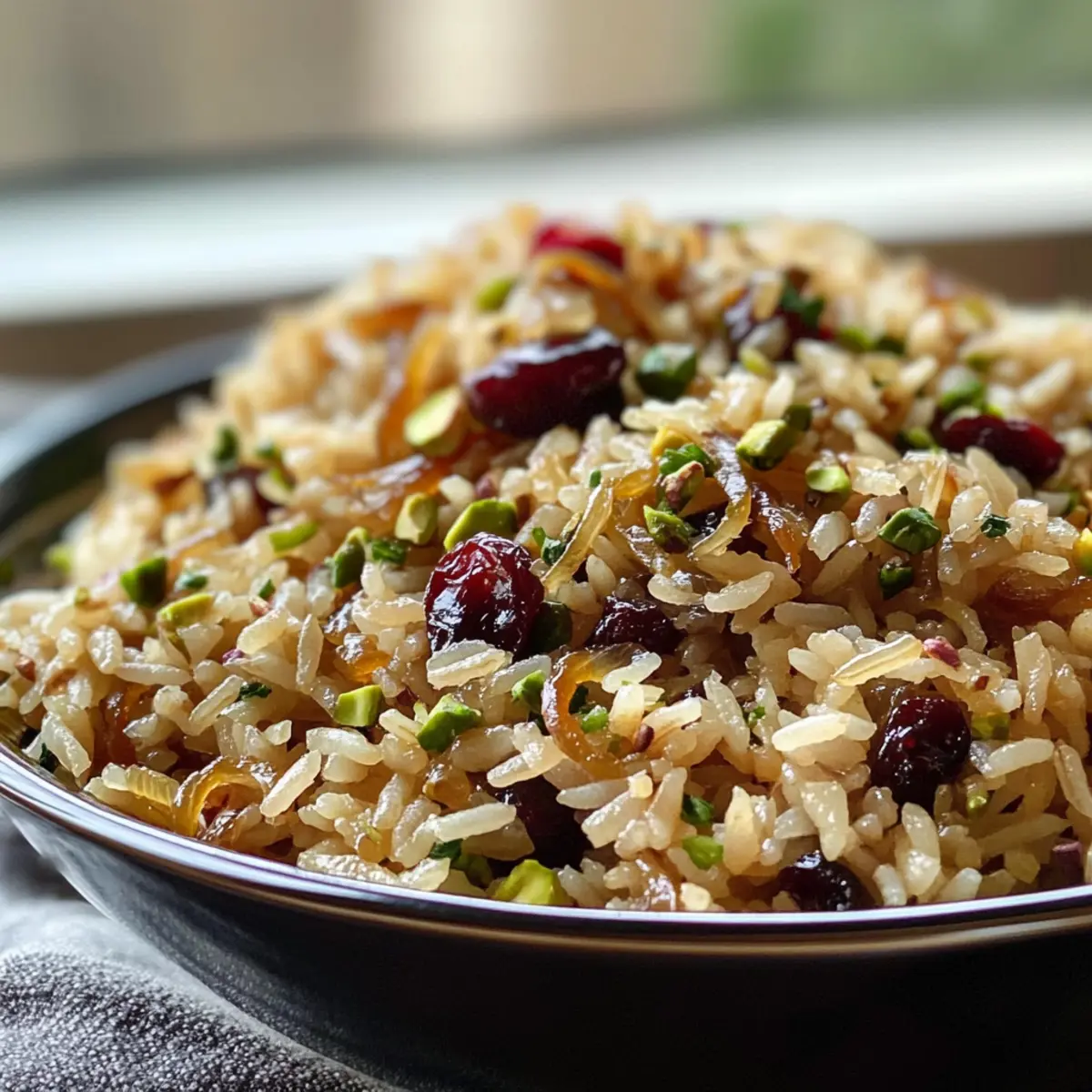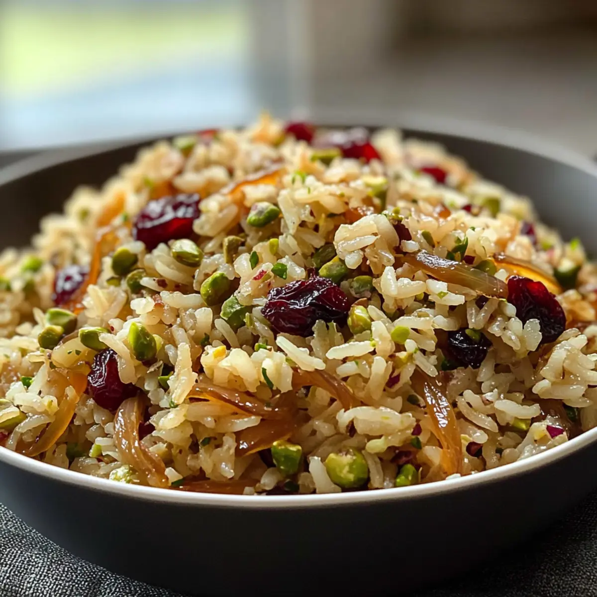 Lockere den Reis vorsichtig mit einer Gabel auf und füge die zuvor karamellisierten Zwiebeln, 1 Tasse getrocknete Kirschen, 1/2 Tasse geschälte Pistazien und den Abrieb einer Orange hinzu. Mische alles gut durch und passe die Gewürze nach Geschmack an, um deinen Reis-Pilaw mit karamellisierten Zwiebeln und Kirschen perfekt abzustimmen.