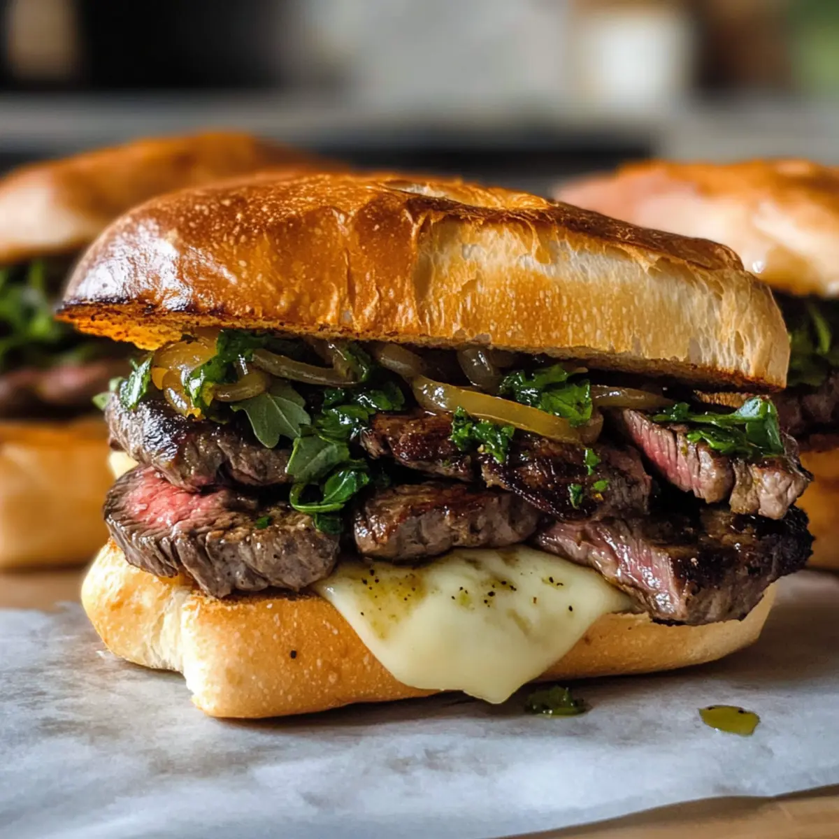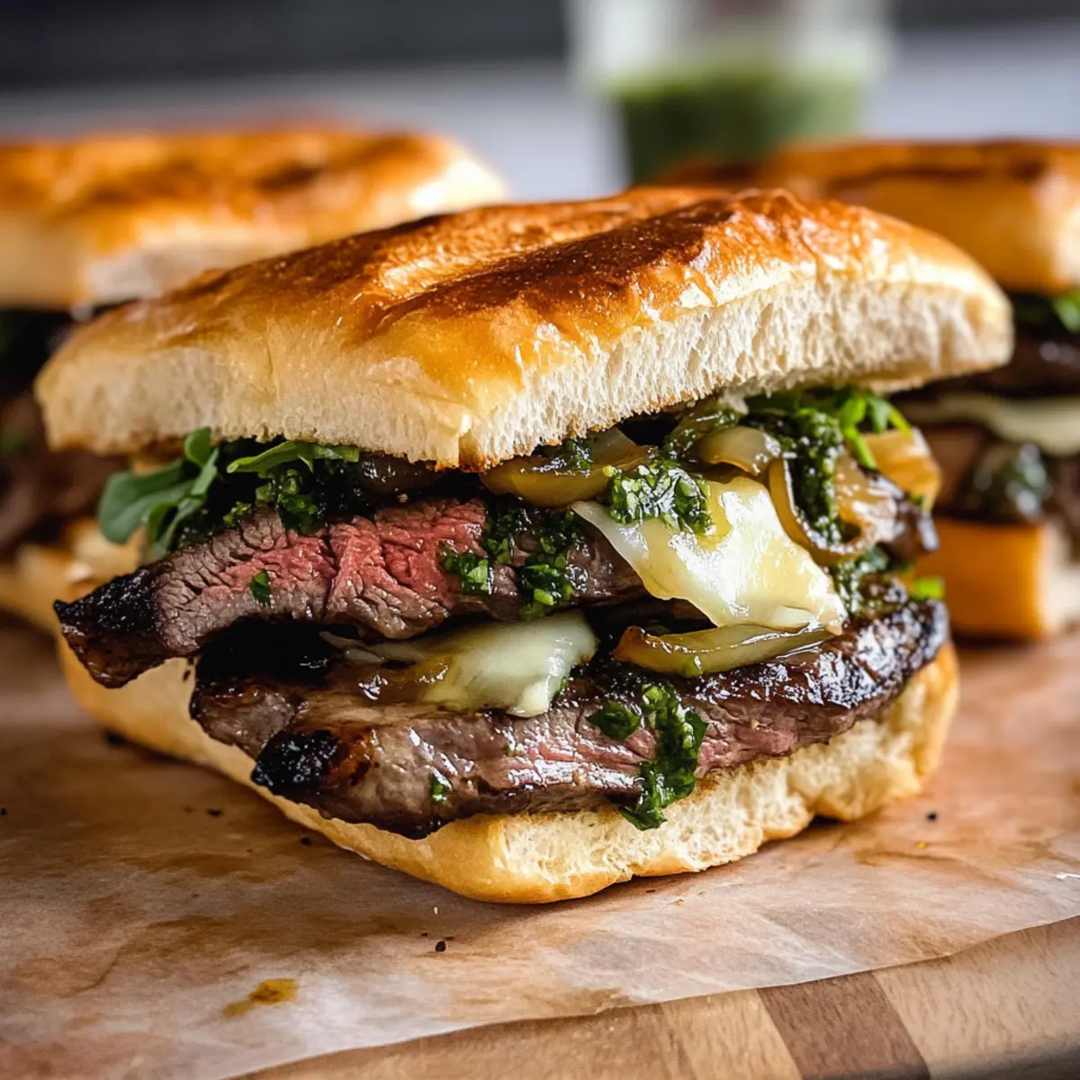 Stellen Sie sich vor, Sie beißen in ein saftiges Ribeye-Steak-Sandwich, das nicht nur die Geschmacksknospen kitzelt, sondern auch Erinnerungen an gemütliche Grillabende weckt. Dieses Ribeye-Steak-Sandwich mit Chimichurri, begleitet von süßen, karamellisierten Zwiebeln und cremigem Havarti-Käse, ist ein echtes Komfortessen, das in weniger als 30 Minuten zubereitet werden kann. Die knackige Ciabatta-Brötchen umschließen die Aromen perfekt und machen es zu einer schnellen und leckeren Mahlzeit, die sowohl bei einem entspannten Mittagessen als auch beim herzhaften Abendessen all Ihre Gäste begeistert. Sind Sie bereit, Ihren Grillabend auf das nächste Level zu heben? Lassen Sie uns loslegen! Warum lieben Sie dieses Sandwich? Einfachheit: Die Zubereitung dieses Sandwiches ist kinderleicht und benötigt nur grundlegende Kochkünste, sodass es auch in der schnelllebigen Woche gelingen kann. Würziges Aroma: Die Kombination aus frischem Chimichurri und karamellisierten Zwiebeln sorgt für einen Geschmack, der Ihre Sinne begeistern wird. Vielfalt: Variieren Sie das Rezept mit verschiedenen Käsesorten oder Fleischoptionen, wie flank oder skirt steak, um ganz neue Geschmäcker zu entdecken. Schnelligkeit: In weniger als 30 Minuten haben Sie eine köstliche und nahrhafte Mahlzeit auf dem Tisch, perfekt nach einem langen Tag. Gäste-Sache: Dieses Sandwich wird Ihre Gäste beeindrucken – es ist einfach zu teilen und jeder wird um einen Bissen bitten wollen. Probieren Sie dazu eine Beilage wie Räucherlachs Teesandwiches Ostern oder eine frische Salatbeilage, um das Erlebnis zu vervollständigen! Ribeye-Steak-Sandwich mit Chimichurri Zutaten Für die Chimichurri • Petersilie – Frischer Kräutergrundlage für Chimichurri; liefert einen lebhaften grünen Geschmack. Verwenden Sie Koriander als Ersatz für eine andere Kräuternote. • Rotweinessig – Fügt Säure in das Chimichurri hinzu; hebt die Aromen hervor. Weißweinessig kann als Alternative genutzt werden. • Knoblauch – Aromatisches Element, das Tiefe verleiht; kann geröstet werden für einen milderen Geschmack. • Getrockneter Oregano – Kräuterlicher Akzent im Chimichurri; sorgt für Erdigkeit. Frischer Oregano kann getrockneten ersetzen. • Zerstoßener roter Pfeffer – Würziger Kick für das Chimichurri; nach Geschmack anpassen. • Küchen-Salz – Hebt die Aromen in Chimichurri und Steak hervor. Meersalz oder Tafelsalz können substituiert werden. • Schwarzer Pfeffer – Fügt Gewürz hinzu; frisch gemahlen bietet besseren Geschmack. • Olivenöl – Vereint die Zutaten des Chimichurris und verleiht Reichtum; Avocadoöl ist eine gute Alternative. Für das Sandwich • Gelbe Zwiebeln – Süße, die beim Karamellisieren entsteht; verwenden Sie Schalotten für einen milderen Geschmack. • Rinder-Ribeye-Steaks – Zartes Fleisch, das Saftigkeit erhält; kann durch flank oder skirt steak ersetzt werden. • Ciabatta-Brötchen – Grundlage für das Sandwich; bietet eine knusprige und zugleich weiche Textur. Alternativen oder andere Brötchensorten sind ebenfalls möglich. • Havarti-Käse – Cremige Ergänzung; probieren Sie Provolone oder Mozzarella für verschiedene Geschmäcker. • Flaky Meersalz – Abschlusssalz, das den Fleischgeschmack verstärkt; auch hier kann koscheres Salz verwendet werden. • Mayonnaise – Fügt Cremigkeit zum Sandwich hinzu; kann durch Aioli für zusätzlichen Geschmack ersetzt werden. • Rucola – Sorgt für eine pfeffrige Frische; Spinat oder gemischte Blattsalate können substituiert werden. Mit diesen frisch ausgewählten Zutaten ist Ihr Riesengeschmackserlebnis mit dem Ribeye-Steak-Sandwich mit Chimichurri nur einen Schritt entfernt! Schritt-für-Schritt-Anleitung für das Ribeye-Steak-Sandwich mit Chimichurri Step 1: Chimichurri zubereiten Zuerst bereiten Sie das Chimichurri vor. In einem Mixer kombinieren Sie frische Petersilie, Rotweinessig, Knoblauch, getrockneten Oregano, zerstoßenen roten Pfeffer, Küchen-Salz, schwarzen Pfeffer und Olivenöl. Pulsieren Sie die Mischung, bis sie leicht stückig ist, und stellen Sie sie dann beiseite, damit die Aromen sich entfalten können. Step 2: Zwiebeln karamellisieren Erhitzen Sie eine große Pfanne bei niedriger Temperatur und geben Sie etwas Olivenöl sowie die geschnittenen gelben Zwiebeln hinzu. Lassen Sie die Zwiebeln für etwa 5-10 Minuten sanft garen, ohne sie zu rühren. Rühren Sie gelegentlich um, bis die Zwiebeln weich und goldbraun sind, und würzen Sie sie am Ende mit einer Prise Salz. Step 3: Steak braten Heizen Sie den Ofen auf 200°C vor. Erhitzen Sie in einer weiteren Pfanne etwas Olivenöl auf mittlerer Hitze. Würzen Sie eine Seite der Ribeye-Steaks mit Salz und Pfeffer und legen Sie sie mit der gewürzten Seite nach unten in die Pfanne. Braten Sie das Steak für 2 Minuten, wenden Sie es, würzen Sie die andere Seite und braten Sie es für weitere 2 Minuten. Nehmen Sie das Steak von der Hitze und lassen Sie es kurz ruhen. Step 4: Brötchen rösten Legen Sie die Ciabatta-Brötchen auf ein Backblech und belegen Sie sie mit Havarti-Käse. Rösten Sie die Brötchen im vorgeheizten Ofen für etwa 3-5 Minuten, bis der Käse geschmolzen und die Brötchen goldbraun sind. Step 5: Sandwich zusammenstellen Spülen Sie die Röster und das Steak ab, bevor Sie mit dem Zusammenstellen Ihres Ribeye-Steak-Sandwich mit Chimichurri beginnen. Bestreichen Sie die gerösteten Ciabatta-Brötchen mit Mayonnaise, schichten Sie das Steak darauf und bestreuen Sie es mit einer Prise Meersalz. Fügen Sie anschließend die karamellisierten Zwiebeln, das Chimichurri und eine Handvoll Rucola hinzu. Servieren Sie das Sandwich sofort und genießen Sie den köstlichen Geschmack! Aufbewahrungstipps für Ribeye-Steak-Sandwich mit Chimichurri Zimmertemperatur: Lassen Sie das Sandwich nicht länger als 2 Stunden bei Zimmertemperatur stehen, um die Frische und Sicherheit der Zutaten zu gewährleisten. Kühlschrank: Bewahren Sie übrig gebliebene Sand