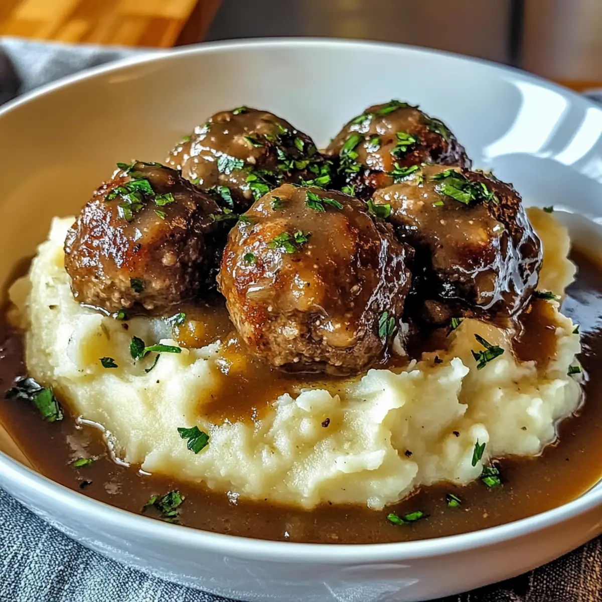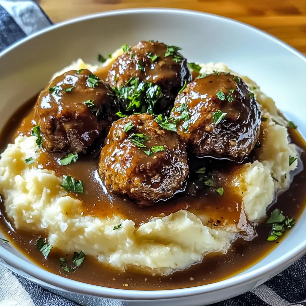 Schritt für Schritt in die Welt der herzhaften Küche: Die Salisbury-Steak-Fleischbällchen mit knoblauchigem Kräuterpüree sind ein echter Genuss. Dieses Rezept kombiniert die Aromen nostalgischer Familienabende mit saftigen, perfekt gewürzten Fleischbällchen und einer zarten Gravy, die auf einem Bett aus cremigem, aromatischem Püree serviert wird. Ideal für hektische Wochentage, gelingt dieses Gericht in weniger als einer Stunde und bietet nicht nur ein schnelles Abendessen, sondern auch ein großes Stück Komfort auf dem Teller. Zusätzlich gibt es variationsreiche Möglichkeiten – wer hätte gedacht, dass man auch eine glutenfreie Version zaubern kann? Welche der kreativen Alternativen wirst du ausprobieren? Warum sind diese Fleischbällchen so beliebt? Ein schnelles Abendessen: Dieses Rezept ist schnell und einfach, perfekt für geschäftige Wochentage! Herzhafter Komfort: Die Kombination aus saftigen Fleischbällchen und cremigen Kartoffeln ist einfach unwiderstehlich. Vielseitigkeit: Mit glutenfreien Optionen und zahlreichen Variationen kann jeder seine Lieblingsversion finden. Gesunde Alternativen: Integriere frisches Gemüse oder verwandle die Kartoffeln in ein leichtes Püree. Crowd-Pleaser: Ob Familie oder Freunde – diese herzhaften Fleischbällchen lieben alle, einfach mal ausprobieren! Salisbury-Steak-Fleischbällchen Zutaten Für die Fleischbällchen Rinderhackfleisch – Verwende 80/20 für optimalen Geschmack und Zartheit. Semmelbrösel – Dient als Bindemittel; für die glutenfreie Version ersetze sie durch glutenfreie Semmelbrösel. Ei – Hilft, die Fleischmischung zusammenzuhalten; essenziell für die Form der Fleischbällchen. Zwiebel (gehackt) – Fügt natürliche Süße und Tiefe hinzu. Knoblauch (gehackt) – Bringt aromatische Würze in die Fleischbällchen. Worcestershire-Sauce – Verleiht umami Geschmack; darauf achten, glutenfreie Variante zu wählen. Salz & Pfeffer – Gewürze, die den Gesamtschmack der Speise heben. Getrockneter Thymian – Fügt erdige Noten hinzu; frische Kräuter für mehr Aroma sind möglich. Für die Gravy Olivenöl – Zum Sautieren von Zwiebeln und Knoblauch. Rinderbrühe – Schlüsselingredienz für die Gravy, die reichhaltigen Geschmack liefert. Maisstärke – Verdicker für die Gravy; mit Wasser anrühren, um eine Slurry zu erstellen. Für die Kartoffelpüree Kartoffeln (Yukon Gold empfohlen) – Für eine cremige Textur im Püree. Milch – Sorgt für Cremigkeit im Püree. Butter – Verleiht den Kartoffeln einen luxuriösen Finish. Frische Petersilie – Bringt Farbe und Frische in das Gericht. Diese Salisbury-Steak-Fleischbällchen sind nicht nur schnell zubereitet, sondern bieten auch unzählige Optionen zur Anpassung – ideal für jeden Geschmack! Schritt-für-Schritt-Anleitung für Salisbury-Steak-Fleischbällchen mit cremigen Kartoffeln Step 1: Ofen vorheizen Heize deinen Ofen auf 200 °C (400 °F) vor. Diese Temperatur sorgt dafür, dass die Salisbury-Steak-Fleischbällchen gleichmäßig garen und außen schön goldbraun werden. Bereite währenddessen ein Backblech mit Backpapier vor, um die Fleischbällchen nach dem Formen gleichmäßigen Platz zum Garen zu bieten. Step 2: Fleischbällchen-Mischung vorbereiten In einer großen Schüssel vermengst du das Rinderhackfleisch, die Semmelbrösel, das Ei, die gehackte Zwiebel, den Knoblauch, die Worcestershire-Sauce, Salz, Pfeffer und den getrockneten Thymian. Nutze deine Hände, um die Zutaten sanft zu vermischen, bis sie gerade so verbunden sind; das hält die Fleischbällchen zart. Achte darauf, nicht zu lange zu kneten. Step 3: Fleischbällchen formen und backen Forme aus der Mischung gleichmäßige Bällchen von etwa 2,5 cm Durchmesser. Lege die geformten Fleischbällchen auf das vorbereitete Backblech, sodass sie genügend Abstand zueinander haben. Schiebe das Blech dann in den vorgeheizten Ofen und backe die Fleischbällchen für etwa 20 Minuten, bis sie goldbraun sind und eine Innentemperatur von 74 °C (165 °F) erreicht haben. Step 4: Zwiebeln und Knoblauch sautieren Erhitze in einer Pfanne bei mittlerer Hitze einen Esslöffel Olivenöl. Füge die gehackte Zwiebel und den Knoblauch hinzu und brate sie 3-4 Minuten lang an, bis die Zwiebeln weich und durchscheinend sind. Dies sorgt für eine aromatische Basis für die spätere Sauce. Achte darauf, die Hitze nicht zu hoch einzustellen, damit die Zwiebeln nicht verbrennen. Step 5: Gravy zubereiten Gieße dann die Rinderbrühe und einen Esslöffel Worcestershire-Sauce in die Pfanne mit den Zwiebeln und Knoblauch. Bringe die Mischung zum Köcheln und lass sie einige Minuten köcheln, um die Aromen zu vereinen. Verdicke schließlich die Sauce mit einer vorbereiteten Slurry aus Maisstärke und Wasser, bis die gewünschte Konsistenz erreicht ist. Step 6: Kartoffeln kochen In einem großen Topf bringst du Wasser zum Kochen und fügst die geschälten und gewürfelten Yukon Gold Kartoffeln sowie den restlichen Knoblauch hinzu. Koche alles 15-18 Minuten, bis die Kartoffeln zart sind. Teste sie mit einer Gabel; sie sollten leicht zerfallen. Anschließend abgießen und wieder in den Topf geben. Step 7: Kartoffelpüree anrühren Zu den heißen Kartoffeln fügst du nun Milch, Butter, Salz, Pfeffer und frisch gehackte Petersilie hinzu. Mit einem Kartoffelstampfer oder einem elektrischen Mixer pürierst du die Mischung, bis sie cremig und glatt ist. Achte darauf, nicht zu überarbeiten, damit das Püree schön luftig bleibt und die Aromen gut zur Geltung kommen. Step 8: Servieren Serviere die gebackenen Salisbury-Steak-Fleischbällchen auf einem Bett der cremigen Kartoffeln. Übergieße die Fleischbällchen großzügig mit der selbstgemachten Gravy und füge nach Belieben frische Petersilie als Garnitur hinzu. Diese Kombination wird jeder genießen und bringt ein Stück Heimat auf den Tisch. Tipps für die besten Salisbury-Steak-Fleischbällchen Richtige Mischung: Mische die Fleischball-Zutaten vorsichtig, um eine zähe T