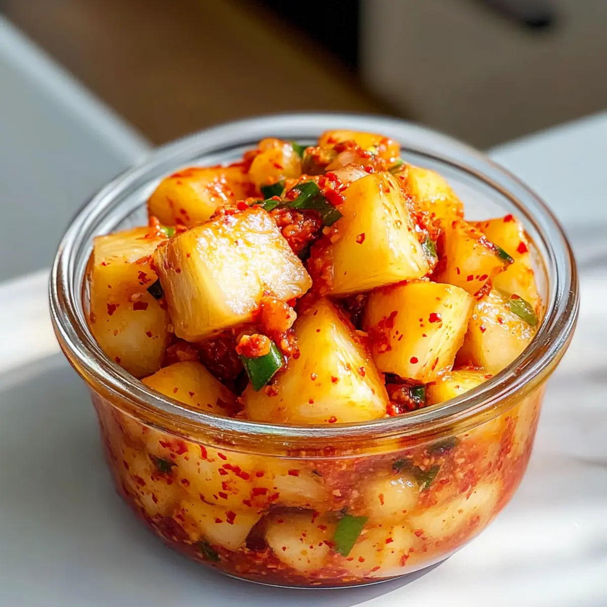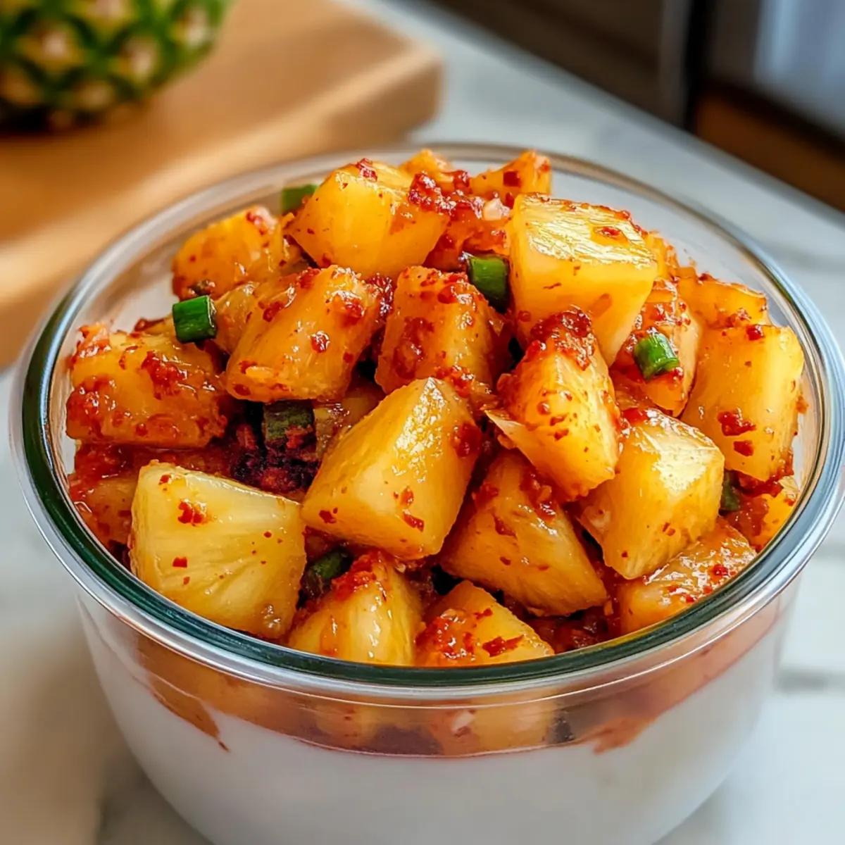 Während ich letzte Woche auf dem Markt stöberte, erblickte ich die strahlenden, saftigen Ananas und konnte der Versuchung nicht widerstehen. Ein Gedanke blitzte auf: Scharfe Ananaskimchi! Diese einfache, vegane und glutenfreie Rezeptur bringt die süße Frische reifer Ananas mit einer perfekten Prise Würze zusammen – ein wahres Geschmackserlebnis, das selbst eingefleischte Kimchi-Neulinge begeistern wird. Die Zubereitung benötigt kaum Zeit, und das Ergebnis ist nicht nur ein echter Gaumenschmaus, sondern auch eine gesunde Bereicherung für jede Mahlzeit. Egal, ob du es zu gebratenem Reis servierst oder als Auflage für dein nächstes Sandwich verwendest – dieses Kimchi wird deine Geschmacksknospen zum Tanzen bringen! Bist du bereit, deiner Küche einen Hauch von Asien zu verleihen? Warum solltest du Scharfe Ananaskimchi lieben? Einfachheit: Die Zubereitung ist kinderleicht und benötigt nur wenige Zutaten, die du wahrscheinlich schon zu Hause hast. Frische und Geschmack: Die Kombination aus saftiger Ananas und würzigen Aromen wird deine Sinne verzaubern. Gesund und nahrhaft: Diese vegane und glutenfreie Variante ist nicht nur lecker, sondern fördert auch die Gesundheit durch ihren hohen Gehalt an Probiotika. Vielfältige Einsatzmöglichkeiten: Verwende das Kimchi als Topping für Salate, in Wraps oder einfach als Beilage zu deinen Lieblingsgerichten für einen asiatischen Twist! Zeitersparnis: In weniger als 30 Minuten ist deine Marinade vorbereitet und das Fermentieren geschieht ganz von selbst. Familienfreundlich: Dieses Scharfe Ananaskimchi wird sowohl Kinder als auch Erwachsene beeindrucken – eine köstliche Möglichkeit, deine Familie für gesunde Ernährung zu begeistern! Mach dich bereit, deine Küche mit diesem aufregenden Rezept zu beleben und entdecke, warum Kimchi ein Muss in jeder modernen Küche ist! Scharfe Ananaskimchi Zutaten • Dieses Rezept für Scharfe Ananaskimchi bringt eine aufregende Kombination aus süß und scharf auf deinen Tisch! Für die Marinade Ananas – sorgt für Süße und Textur; wähle eine reife, aber feste Ananas, damit sie beim Fermentieren nicht matschig wird. Asiatische Birne – fügt natürliche Süße und Feuchtigkeit hinzu; kann auch durch eine andere saftige Frucht wie einen Apfel ersetzt werden. Gochugaru (koreanische Chilipulver) – gibt Hitze und Farbe; passe die Menge an, um den Schärfegrad zu steuern. Fischsauce – sorgt für Umami und tiefen Geschmack; für eine vegetarische Option kann sie durch Sojasauce oder Miso ersetzt werden. Knoblauch – liefert ein aromatisches Aroma; frischer gehackter Knoblauch ist am besten. Zucker – balanciert die Säure und fördert die Fermentation; Honig oder Agavennektar können für eine andere Süße verwendet werden. Ingwer – bringt wärmende Gewürze und Komplexität in den Geschmack; frischer, gehackter Ingwer sind die beste Wahl. Für die Aufbewahrung Luftdichter Behälter – bewahre das fermentierte Kimchi in einem luftdichten Glasbehälter auf, um die Frische zu erhalten und die Aromen zu bewahren. Schritt-für-Schritt-Anleitung für Scharfe Ananaskimchi Step 1: Ananasschneiden Schneide die reife, aber feste Ananas zuerst in Scheiben und dann in 1-Zoll große Würfel. Achte darauf, den harten Kern sowie alle ungenießbaren Teile zu entfernen. Dieser Schritt ist wichtig, um die richtige Textur für deinen Scharfen Ananaskimchi zu erzielen, damit er beim Fermentieren knackig bleibt. Step 2: Marinade zubereiten Gib die gewürfelte asiatische Birne, Gochugaru, Fischsauce, den gehackten Knoblauch, Zucker und den frischen Ingwer in einen Mixer. Mixe alles gut, bis eine glatte Marinade entsteht. Diese Mischung wird dem Kimchi seine köstliche Würze verleihen und die Aromen harmonisch verbinden. Step 3: Kombinieren Lege die Ananaswürfel in ein großes Glas oder einen luftdichten Behälter. Gieße die vorbereitete Marinade über die Ananas und rühre vorsichtig um, bis alle Stücke gleichmäßig bedeckt sind. Es ist wichtig, sicherzustellen, dass jede Ananaswürfeln den Geschmack des Scharfen Ananaskimchi absorbieren. Step 4: Marinieren Decke den Behälter mit einem Deckel oder Frischhaltefolie ab und stelle ihn für mindestens 2 Stunden in den Kühlschrank. Dies ermöglicht den Aromen, in die Ananas einzuziehen und bietet bereits ein erstes Geschmackserlebnis, bevor der Fermentationsprozess beginnt. Step 5: Fermentieren Nimm den Kimchi aus dem Kühlschrank und lasse ihn bei Raumtemperatur stehen, um ihn 1-2 Tage lang fermentieren zu lassen. Überprüfe täglich den Geschmack: Er sollte allmählich sauer und spritzig werden. Dies ist der entscheidende Schritt, um die charakteristische Spritzigkeit des Scharfen Ananaskimchi zu erreichen. Step 6: Aufbewahren Wenn das Kimchi den gewünschten Geschmack erreicht hat, fülle es in ein luftdichtes Glasgefäß um. Bewahre es im Kühlschrank auf, wo es bis zu 3 Wochen frisch bleibt. Mit jeder Woche wird der Geschmack intensiver und noch köstlicher, perfekt für deine nächsten Mahlzeiten! Aufbewahrungstipps für Scharfe Ananaskimchi Kühlschrank: Bewahre dein Scharfe Ananaskimchi in einem luftdichten Glasbehälter im Kühlschrank auf, wo es bis zu 3 Wochen frisch bleibt und die Aromen intensiver werden. Raumtemperatur: Während des Fermentationsprozesses kann Scharfe Ananaskimchi bis zu 1-2 Tage bei Raumtemperatur fermentieren; probiere täglich, um die gewünschte Säure zu erreichen. Verhindern von Verderb: Achte darauf, immer saubere Utensilien zu verwenden, um ungewollte Bakterien zu vermeiden und die Qualität deines Kimchis zu schützen. Wiedererwärmung: Zum Verzehr kannst du das Kimchi direkt aus dem Kühlschrank genießen; wenn du möchtest, kannst du es auch als würzige Beilage zu warmen Gerichten servieren. Was passt gut zu Scharfe Ananaskimchi? Die Kombination von Aromen und Texturen kann dein Essen auf ein neues Level heben und unvergessliche Geschmackserlebnisse schaffen. Gegrilltes Fleisch: Perfekt für die Kombination mit 