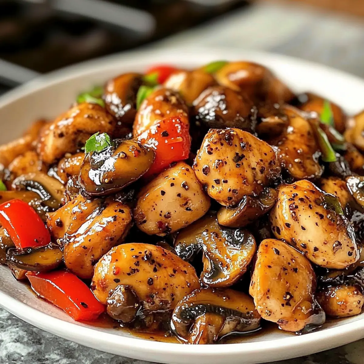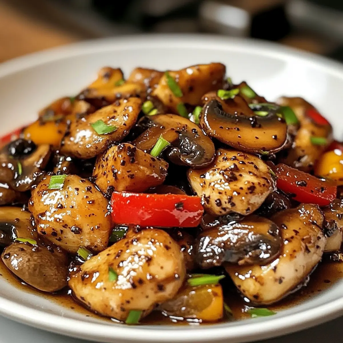 Der verführerische Duft von frisch gebratenem Hähnchen und aromatischen Pilzen schwebt durch meine Küche und lässt sofort das Wasser im Mund zusammenlaufen. Heute möchte ich euch in die Welt des Schwarzer Pfeffer Hähnchen mit Pilzen entführen – ein schnelles und köstliches Wokgericht, das in nur 30 Minuten zubereitet ist. Dieses Rezept ist nicht nur eine wahre Freude für die Geschmacksnerven, sondern auch eine flexible Wahl, die leicht mit verschiedenen Proteinen wie Garnelen oder Tofu variiert werden kann. Die harmonische Verbindung von süßen, knackigen Gemüse und der intensiven Schärfe frisch gemahlener Tellicherry-Pfefferkörner macht dieses Gericht zu einem unverzichtbaren Teil eurer wöchentlichen Essensplanung. Seid ihr bereit, eure Familie mit diesem schnellen Gaumenschmaus zu überraschen? Warum ist dieses Gericht so unwiderstehlich? Einfachheit: Die Zubereitung erfordert nur grundlegende Kochfähigkeiten, sodass jeder schnell ein köstliches Gericht zaubern kann. Vielfältige Zutaten: Ihr könnt Hähnchen durch Garnelen, Rindfleisch oder sogar Tofu ersetzen, was unendliche Variationen ermöglicht. Würzige Aromen: Die Kombination aus frischem Gemüse und der intensiven Schärfe des Pfeffers sorgt für ein Geschmackserlebnis, das begeistert. Schnell und unkompliziert: In nur 30 Minuten auf dem Tisch – ideal für hektische Wochenabende. Wenn ihr auf der Suche nach einem weiteren Rezept mit asiatischem Flair seid, schaut euch auch unser Wuerzige Chinakohl Rinderhack an! Schwarzer Pfeffer Hähnchen mit Pilzen Zutaten • Entdeckt die köstlichen und vielseitigen Zutaten für dieses Gericht! Für das Hähnchen Hähnchenbrust – mageres Protein, das für Struktur und Geschmack sorgt; kann durch Garnelen oder Rindfleisch ersetzt werden. Maizena – bindet mit dem Hähnchen und sorgt beim Kochen für eine knusprige Textur; kein direkter Ersatz empfohlen. Salz – hebt den Geschmack; Meersalz kann als Alternative verwendet werden. Schwarzer Pfeffer – verleiht Schärfe und Geschmack; frisch gemahlener Pfeffer wird empfohlen, weniger verwenden, wenn gewünscht. Für das Gemüse Zwiebel – bringt Süße und Tiefe ins Gericht; rote oder gelbe Zwiebeln sind austauschbar. Paprika – sorgt für Farbe und Biss; kann durch Zuckerschoten oder beliebiges Gemüse ersetzt werden. Champignons – liefern Erdigkeit und Textur; Shiitake- oder Champignonpilze sind ideal. Knoblauch – verleiht aromatische Note; frischer Knoblauch wird empfohlen, Pulver kann im Notfall verwendet werden. Für die Sauce Sojasauce – gibt eine salzige Umami-Basis für die Sauce; nutze natriumarme Sojasauce für eine leichtere Option. Austernsauce – verstärkt den Umami-Geschmack; kann durch Hoisinsauce für eine vegetarische Variante ersetzt werden. Honig – sorgt für Süße und Ausgewogenheit; Ahornsirup kann als Ersatz dienen. Reisessig – bringt Säure für die Balance; kann durch Apfelessig ersetzt werden. Für das Kochen Pflanzenöl – zum Braten verwendet; neutrales Öl wie Raps- oder Traubenkernöl kann ersetzt werden. Frühlingszwiebeln – dienen als Garnitur und fügen frischen Geschmack und Farbe hinzu. Jetzt seid ihr bereit, loszulegen und das köstliche Schwarzer Pfeffer Hähnchen mit Pilzen auf eurem Tisch zu genießen! Schritt-für-Schritt-Anleitung für Schwarzer Pfeffer Hähnchen mit Pilzen Schritt 1: Hähnchen vorbereiten Schneidet das Hähnchenbrustfilet in dünne Scheiben und mischt es in einer Schüssel mit der Maizena, Salz und ½ Teelöffel schwarzem Pfeffer, bis es gleichmäßig bedeckt ist. Lasst das Hähnchen etwa 10 Minuten ruhen, damit die Gewürze einziehen und die Textur verbessert wird. Schritt 2: Hähnchen anbraten Erhitzt 1 Esslöffel Pflanzenöl in einer großen Pfanne oder einem Wok bei mittelhoher Hitze. Gebt das marinierte Hähnchen in die Pfanne und bratet es 4-5 Minuten lang, bis es goldbraun und durchgegart ist. Nehmt das Hähnchen anschließend aus der Pfanne und stellt es beiseite. Schritt 3: Gemüse anbraten Fügt das restliche Pflanzenöl in die gleiche Pfanne hinzu und gebt die geschnittene Zwiebel und Paprika hinein. Bratet das Gemüse 2-3 Minuten lang unter ständigem Rühren an, bis es leicht weich wird und beginnt, Farbe zu bekommen. Schritt 4: Pilze und Knoblauch hinzufügen Gebt die geschnittenen Champignons und den gehackten Knoblauch dazu und bratet sie weiter für weitere 2-3 Minuten an. Achtet darauf, dass die Pilze weich werden und ihr Wasser abgeben, während sie ein angenehmes Aroma verbreiten. Schritt 5: Sauce zubereiten In einer kleinen Schüssel vermischt ihr Sojasauce, Austernsauce, Honig, Reisessig und 1 Teelöffel schwarzen Pfeffer. Rührt die Mischung gut um, bis alles gut kombiniert ist, und gebt sie dann über das angebratene Gemüse in der Pfanne. Schritt 6: Hähnchen zurückgeben Legt das kurz gebratene Hähnchen zurück in die Pfanne und mischt es gut mit den Gemüse und der Sauce. Lasst alles für etwa 1-2 Minuten bei mittlerer Hitze kochen, bis das Hähnchen gut durchgewärmt ist und die Aromen sich verbinden. Schritt 7: Garnitur und Servieren Nehmt die Pfanne vom Herd und garniert das Schwarze Pfeffer Hähnchen mit Pilzen mit frisch gehackten Frühlingszwiebeln. Serviert das Gericht sofort heiß über dampfendem Jasminreis oder Nudeln für ein köstliches und vollständiges Essen. Meal Prep für Schwarzer Pfeffer Hähnchen mit Pilzen Euer Schwarzer Pfeffer Hähnchen mit Pilzen ist perfekt für die Essensvorbereitung! Ihr könnt das Hähnchen bis zu 24 Stunden im Voraus mit Maizena, Salz und schwarz gemahlenem Pfeffer marinieren, um die Aromen einzuziehen und die Textur zu verbessern. Das geschnittene Gemüse wie Zwiebel, Paprika und Champignons kann ebenfalls bereits am Vortag vorbereitet und in einem luftdichten Behälter im Kühlschrank aufbewahrt werden, sodass es bis zu 3 Tage frisch bleibt. Wenn ihr bereit seid zu kochen, erhitzt einfach etwas Öl in der Pfanne, bratet das mariniert Hähnchen an, fügt das Gemüse hinzu
