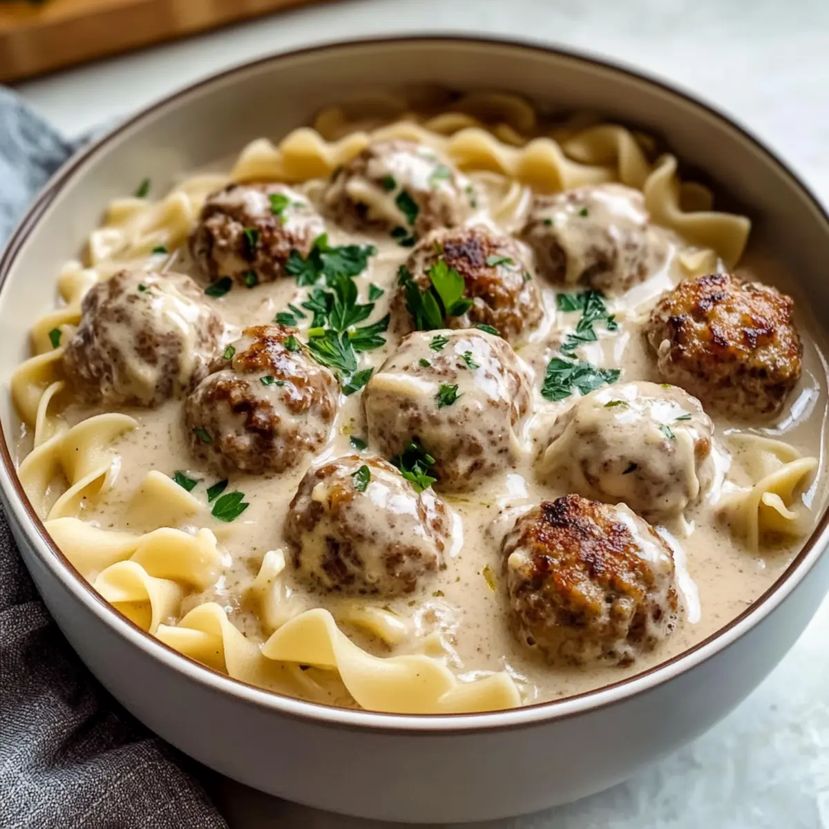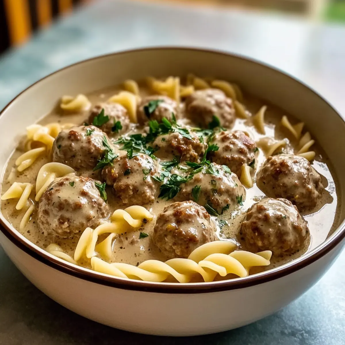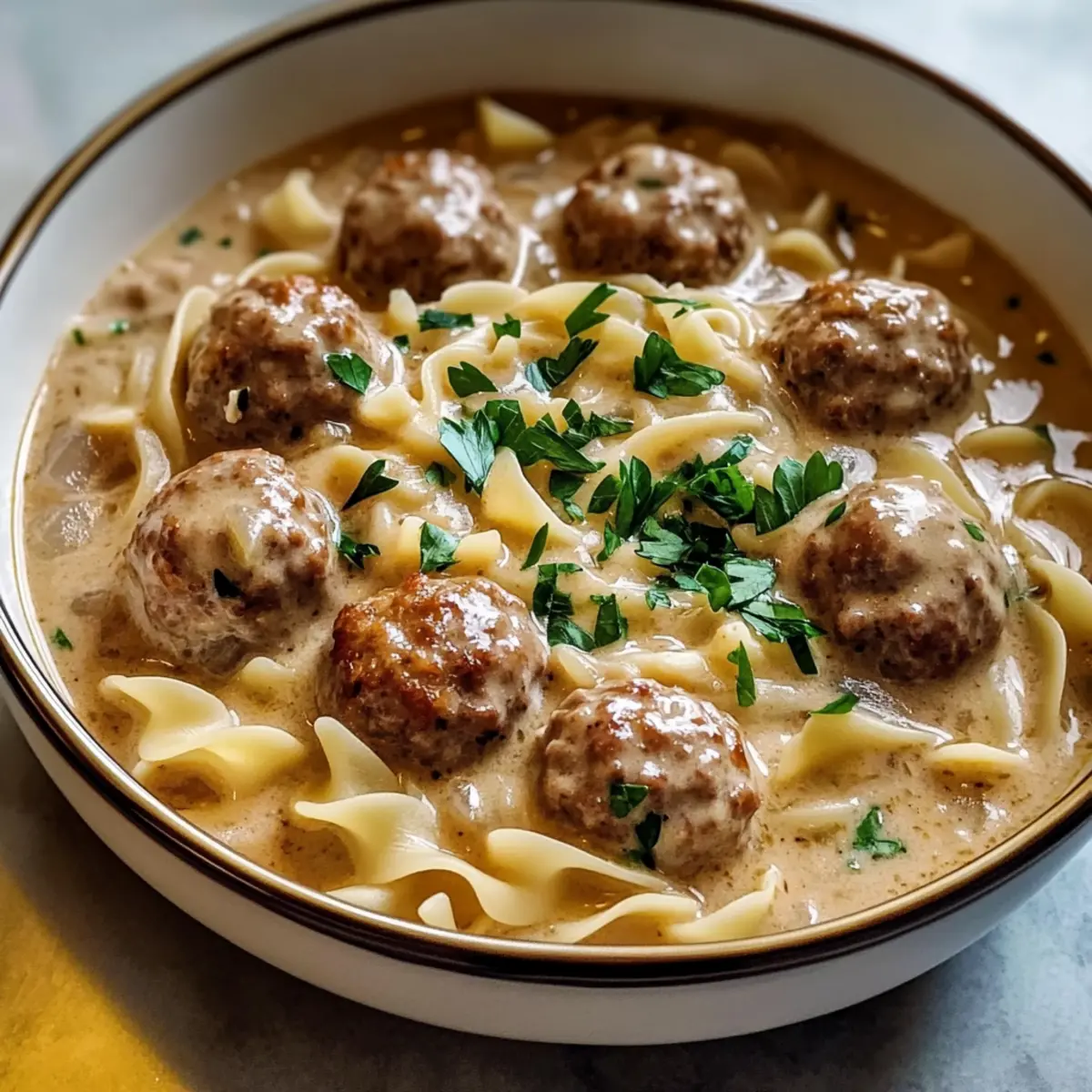 Als ich kürzlich an einem kalten Winterabend in meiner Küche stand, drang der verführerische Duft von Gewürzen und frisch gebratenen Fleischbällchen durch den Raum. Diese Schwedische Fleischbällchensuppe ist mehr als nur ein Gericht – sie ist eine Umarmung für den Gaumen, ideal für gemütliche Abende mit der Familie. Mit zarten, gewürzten Fleischbällchen, die in einer reichhaltigen, cremigen Brühe schwimmen, und den perfekten Eierteignudeln ist diese Suppe der Inbegriff von Comfort Food. Diese schnelle und einfache Zubereitung macht sie zum idealen Begleiter an hektischen Wochentagen oder für entspannende Sonntagnachmittage. Seid ihr bereit, eure Lieben mit dieser herzhaften Köstlichkeit zu verwöhnen? Let’s get cooking! Warum wird diese Suppe Ihr Herz erwärmen? Gemütlichkeit pur: Diese Schwedische Fleischbällchensuppe ist das perfekte Gericht für kalte Tage, da sie Wärme und Komfort in jeder Schüssel bietet. Einfache Zubereitung: Mit nur wenigen Schritten haben Sie ein köstliches Gericht, das jedem gelingt – sogar wenn Sie nicht viel Erfahrung in der Küche haben. Herzhafter Genuss: Die Kombination aus zarten Fleischbällchen und einer cremigen Brühe verspricht ein Geschmackserlebnis, das alle begeistert. Vielseitige Variationen: Passen Sie die Suppe mit saisonalem Gemüse oder verschiedenen Kräutern an – jede Variante ist ein neuer Genuss. Perfekt zum Teilen: Diese Suppe eignet sich großartig für Familienessen oder Einladungen, um mit Freunden zusammenzukommen und den Abend zu genießen. Zutaten für Schwedische Fleischbällchensuppe Erfahren Sie, welche köstlichen Zutaten Sie für diese herzhafte Schwedische Fleischbällchensuppe benötigen! Für die Fleischbällchen Mageres Rinderhackfleisch – sorgt für Struktur und zarte Fleischbällchen; ersetzen Sie es durch Putenhack für eine leichtere Variante. Paniermehl – bindet die Fleischbällchen, während die Gewürze wunderbar zur Geltung kommen; Panko sorgt für eine knackigere Textur. Ei – fungiert als Bindemittel; nutzen Sie ein Flax-Ei für eine vegane Alternative. Zwiebel (gehackt) – fügt eine subtile Süße und Feuchtigkeit hinzu; Alternativ können Sie auch Schalotten verwenden. Knoblauch (gehackt) – verstärkt den Geschmack sowohl in den Fleischbällchen als auch in der Suppe; frisch ist am besten. Getrocknete Petersilie – bringt Frische in die Fleischbällchen; frische Petersilie bietet ein intensiveres Aroma. Allgewürz und Muskatnuss – charakteristische Gewürze für Schwedische Fleischbällchen, die das Geschmacksprofil aufwerten. Pfeffer und Salz – unverzichtbare Gewürze zum Abschmecken; nach Belieben anpassen. Olivenöl – ideal zum Anbraten der Fleischbällchen, verleiht zusätzlichen Geschmack. Für die Suppe Butter – bildet die Basis für die Roux und sorgt für eine cremige Konsistenz. Zwiebel (gewürfelt) – verleiht der Suppe Textur und zusätzliche Aromen. Allzweckmehl – verdickt die Suppe; alternativ kann Maisstärke für eine glutenfreie Option verwendet werden. Rinderbrühe – sollte von hoher Qualität sein, um einen geschmackvollen Grundstock zu liefern. Sahne – sorgt für eine cremige Brühe, die nicht zu schwer ist; Ersatz: Vollmilch für eine leichtere Variante. Worcestershiresauce – fügt der Suppe eine tiefe Umami-Note hinzu. Dijon-Senf – sorgt für einen würzigen, hellen Akzent in der Brühe. Eierteignudeln – ideal, um die Brühe aufzusaugen; glutenfreie Pasta oder Reis sind gute Alternativen für spezielle Diäten. Vielfalt und Anpassungsfähigkeit machen diese Schwedische Fleischbällchensuppe zu einem herzlichen Genuss, der mit Leichtigkeit zubereitet werden kann! Schritt-für-Schritt-Anleitung für Schwedische Fleischbällchensuppe Step 1: Fleischbällchen zubereiten In einer großen Schüssel das mageres Rinderhackfleisch mit Paniermehl, einem Ei, gehackter Zwiebel, Knoblauch, Petersilie, Allgewürz, Muskatnuss, Salz und Pfeffer vermengen. Verwenden Sie Ihre Hände oder einen Löffel, um die Zutaten sanft zu vermischen, und vermeiden Sie es, die Mischung zu überarbeiten. Die zarte Konsistenz der Fleischbällchen bleibt so erhalten. Step 2: Fleischbällchen formen Die vorbereitete Mischung in etwa 20 Portionen aufteilen und jede Portion zu einer Kugel von ungefähr 1,5 Esslöffeln formen. Achten Sie darauf, die Fleischbällchen gleichmäßig zu formen, damit sie beim Garen gleichmäßig garen. Legen Sie sie auf einen Teller oder eine Backblech, während Sie die restlichen Fleischbällchen formen. Step 3: Fleischbällchen anbraten Erhitzen Sie in einem großen Topf Olivenöl bei mittelhoher Hitze. Geben Sie die Fleischbällchen vorsichtig hinein und braten Sie sie rundherum für etwa 10 Minuten goldbraun an. Achten Sie darauf, die Fleischbällchen gelegentlich zu wenden, damit sie gleichmäßig bräunen. Nach dem Bräunen die Fleischbällchen aus dem Topf nehmen und beiseitelegen. Step 4: Zwiebel für die Suppe anbraten Im selben Topf 2 Esslöffel Butter schmelzen und die gewürfelte Zwiebel hinzufügen. Lassen Sie die Zwiebel etwa 3 Minuten lang bei mittlerer Hitze dünsten, bis sie weich und glasig ist. Fügen Sie dann den gehackten Knoblauch hinzu und braten Sie ihn für weitere 1 Minute, bis er aromatisch ist. Step 5: Roux herstellen Streuen Sie 1/4 Tasse Allzweckmehl über die Zwiebel-Knoblauch-Mischung und verrühren Sie es gründlich, um einen Roux zu bilden. Lassen Sie das Mehl 1-2 Minuten kochen, bis der rohe Mehlgeschmack verschwunden ist. Rühren Sie kontinuierlich, um eine klumpenfreie Mischung zu gewährleisten. Step 6: Brühe hinzufügen Gießen Sie langsam 4 Tassen Rinderbrühe und 1 Tasse Sahne in den Topf und verquirlen Sie die Mischung gleichmäßig. Fügen Sie nach Belieben Worcestershiresauce und Dijon-Senf hinzu. Bringen Sie die Suppe langsam zum Kochen, rühren Sie regelmäßig um, und senken Sie dann die Hitze, um die Suppe sanft köcheln zu lassen. Step 7: Eierteignudeln kochen Fügen Sie 200 g Eierteignudeln zu