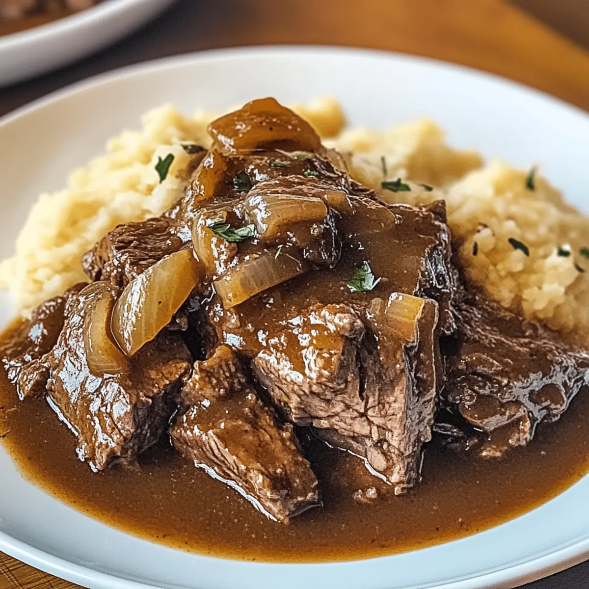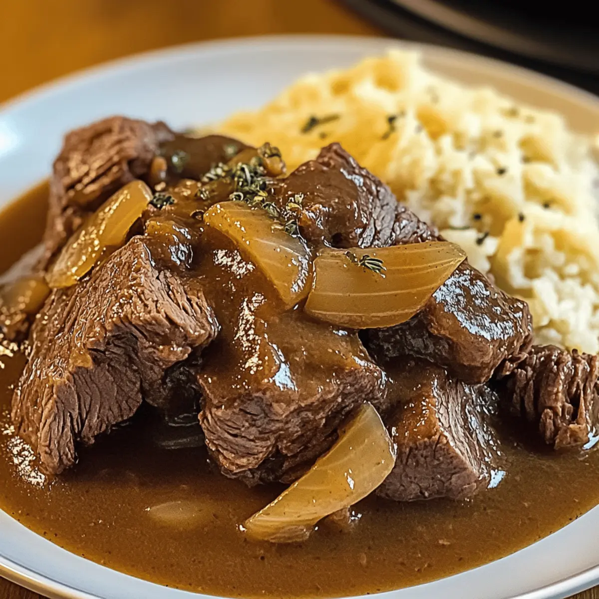 Während ich in meiner Küche stehe und den richen Duft des Slow Cooker Beef Manhattan wahrnehme, fühle ich sofort eine Welle der Zufriedenheit. Dieses Gericht bringt nicht nur herzlichen Komfort auf den Tisch, sondern es ist auch eine kinderleichte Lösung für hektische Wochentage. Mit zartem Rinderbraten, der in einer würzigen Soße vor sich hin simmernd, und dem verführerischen Aroma von Zwiebeln und Knoblauch, wird jeder Bissen zu einem wahren Genuss. Und das Beste daran? Du kannst es ganz entspannt vorbereiten und die ganze Familie wird begeistert sein. Hast du schon einmal überlegt, wie sich „Gemütlichkeit“ in einem Gericht anfühlen kann? Warum lieben alle diesen Klassiker? Herzlicher Komfort: Slow Cooker Beef Manhattan ist das perfekte Gericht, um an kalten Abenden Gemütlichkeit zu verbreiten. Einfachheit: Mit minimalem Aufwand zauberst du ein herzhaftes Essen, das jeder mag. Vielfalt: Du kannst es nach Belieben abwandeln – probiere zum Beispiel, einige Gemüse hinzuzufügen oder den Rindfleisch durch Hühnchen zu ersetzen. Aromatisch und lecker: Die Kombination aus knusprigen Zwiebeln und würzigem Knoblauch hebt den Geschmack auf ein neues Level. Und wenn du noch mehr Inspiration suchst, schau dir auch unser Rezept für die Herzhafte Minestrone Suppe oder die Zitronen Brownies Einfach an! Slow Cooker Beef Manhattan Zutaten • Entdecke die köstlichen Zutaten für dieses herzliche Gericht! Für das Fleisch Rinderbraten – Wähle gut marmorierte Stücke für optimale Zartheit und Geschmack. Zwiebeln – Verwende gelbe oder süße Variationen, die in feine Scheiben geschnitten sind, um mehr Süße und Tiefe zu erzielen. Knoblauch – Frisch gehackte Zehen bringen ein aromatisches Geschmackserlebnis in das Gericht. Worcestershire-Sauce – High-Quality Marken auswählen, um eine tiefere Geschmacksnote zu erhalten. Für die Flüssigkeit Rinderbrühe – Serviere die Brühe in einer abgemilderten Variante, um den Nahehalt niedrig zu halten. Für die Gewürze Thymian und Rosmarin – Frische Kräuter verleihen dem Gericht eine besondere Note; bei getrockneten Kräutern verwende die Hälfte der Menge. Für die Sauce Maisstärke – Mische sie mit kaltem Wasser, bevor du sie zur Flüssigkeit hinzufügst, um eine perfekte Konsistenz zu erzielen. Dieser Slow Cooker Beef Manhattan ist die perfekte Wahl für ein gemütliches Essen und sorgt für glückliche Gesichter am Tisch! Schritt-für-Schritt-Anleitungen für Slow Cooker Beef Manhattan Step 1: Rinderbraten vorbereiten Schneide den Rinderbraten in 2-Zoll große Stücke. Achte darauf, gut marmorierte Stücke auszuwählen, um Zartheit und Geschmack zu gewährleisten. Mince den Knoblauch und schneide die Zwiebeln in feine Scheiben. Diese Vorbereitung sorgt dafür, dass die Aromen im Slow Cooker Beef Manhattan harmonisch miteinander verschmelzen. Step 2: Zwiebeln und Knoblauch anbraten Erhitze etwas Öl in einer Pfanne bei mittlerer Hitze und füge die geschnittenen Zwiebeln hinzu. Brate sie an, bis sie goldbraun sind, was etwa 5-7 Minuten dauert. Danach füge den gehackten Knoblauch hinzu und brate ihn für 1-2 Minuten, bis er duftet. Diese aromatische Grundlage wird deiner Soße reichhaltigen Geschmack verleihen. Step 3: Zutaten in den Slow Cooker geben Übertrage die goldbraunen Zwiebeln und den Knoblauch in den Slow Cooker und lege die Rinderstücke darüber. Achte darauf, die Zutaten gleichmäßig zu verteilen. Dies ist der Grundstein für dein Slow Cooker Beef Manhattan, das später köstlich weich und aromatisch sein wird. Step 4: Flüssigkeit und Gewürze hinzufügen Gieße die Rinderbrühe und Worcestershire-Sauce über das Gemüse und das Fleisch im Slow Cooker. Streue frischen Thymian und Rosmarin darüber, um dem Gericht eine besondere Note zu verleihen. Rühre alles gut um, damit sich die Aromen vermischen und die Rinderstücke gut temperiert werden. Step 5: Kochen lassen Decke den Slow Cooker ab und stelle ihn auf niedrige Stufe für 8 Stunden oder hohe Stufe für 4 Stunden ein. Während dieser Zeit werden die Geschmäcker intensiv und das Fleisch wird mühelos zart, bereit für den perfekten Genuss. Lasse es einfach köcheln, während du die Zeit mit anderen Dingen verbringst. Step 6: Soße andicken Nach dem Kochprozess nehme das Rindfleisch aus dem Slow Cooker und stelle es beiseite. Mische etwa 2 Esslöffel Maisstärke mit kaltem Wasser in einer kleinen Schüssel, bis eine glatte Paste entsteht. Rühre diese Mischung in die Kochflüssigkeit im Slow Cooker ein, um die Soße zu verdicken. Step 7: Rindfleisch zurückgeben und servieren Gib das zarte Rindfleisch zurück in den Slow Cooker und lasse es nochmals für 10-15 Minuten im dicken Gravy ruhen, damit es die Aromen aufnehmen kann. Serviere dein Slow Cooker Beef Manhattan heiß über cremigem Kartoffelpüree oder auf knusprigem Brot, um das köstliche Aroma perfekt zu genießen. Variationen & Alternativen für Slow Cooker Beef Manhattan Lass deiner Kreativität freien Lauf und passe das Rezept ganz nach deinem Geschmack an! Hühnchen: Ersetze Rindfleisch durch Hühnchen und koche es auf niedriger Stufe für ca. 6 Stunden. Zart und köstlich! Veggie-Version: Nutze Linsen oder Kichererbsen als proteinreiche Alternative und füge extra Gemüse wie Karotten und Sellerie hinzu. Würziger Kick: Ergänze frische Chili oder Cayennepfeffer, um dem Gericht einen aufregenden, scharfen Geschmack zu verleihen. Perfekt für alle, die es gerne feurig mögen! Thymian oder Oregano: Tausche Thymian gegen Oregano aus, um dem Gericht eine italienische Note zu geben. Dieser Kräuterwechsel sorgt für eine spannende Geschmacksrichtung. Wurzeln: Karotten und Pastinaken sind großartige Ergänzungen. Sie bringen nicht nur mehr Farbe ins Spiel, sondern auch süße Aromen, die perfekt harmonieren. Süßes Aroma: Füge einen Hauch von Honig oder braunem Zucker hinzu, um eine süßere Geschmacksbalance zu schaffen, die die herzhaften Noten ergänzt. Glutenfrei: Stelle sicher, dass die 