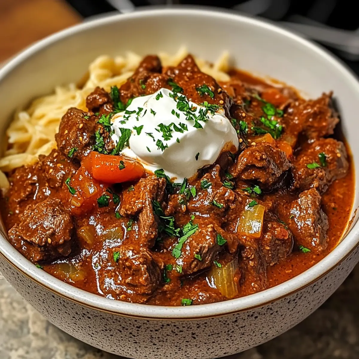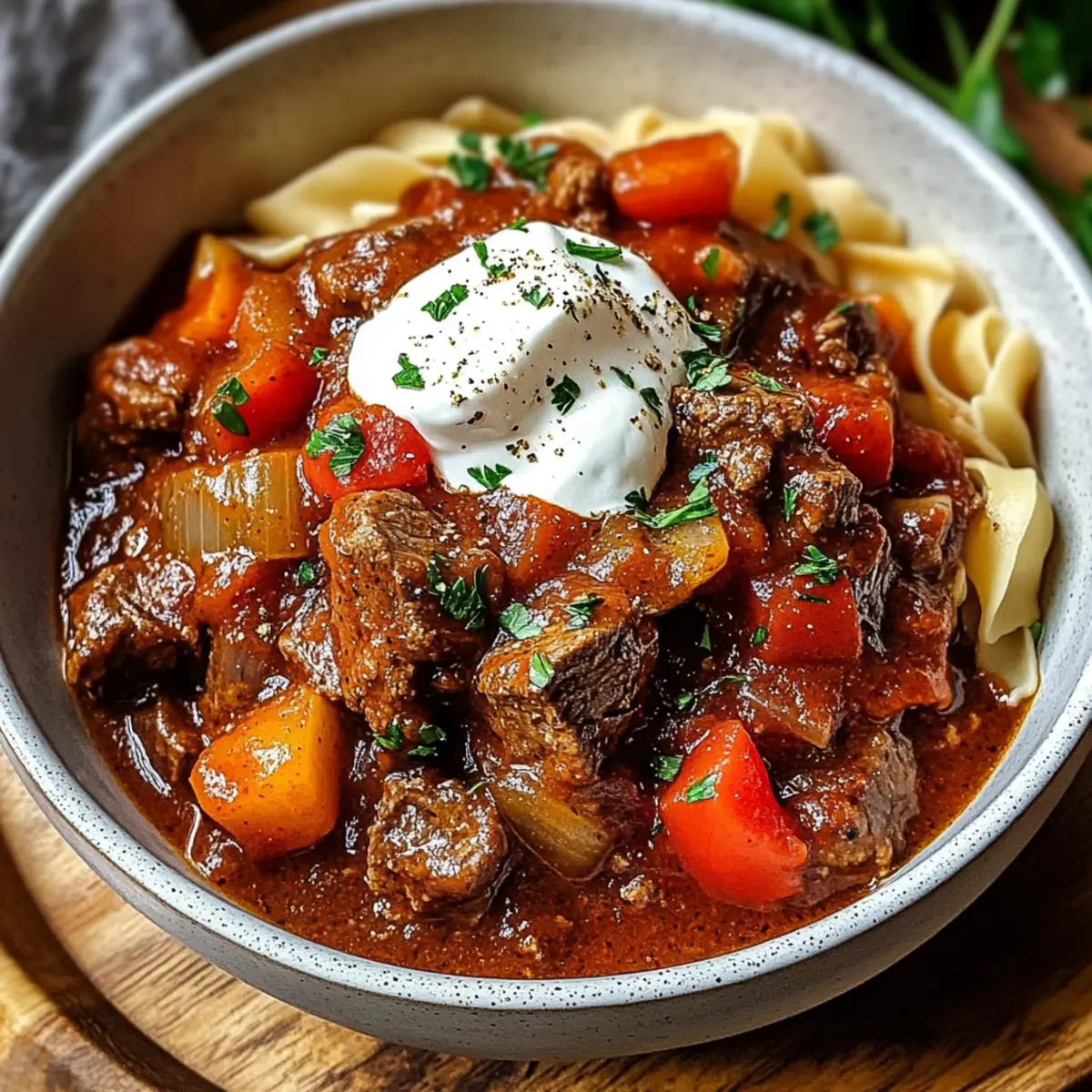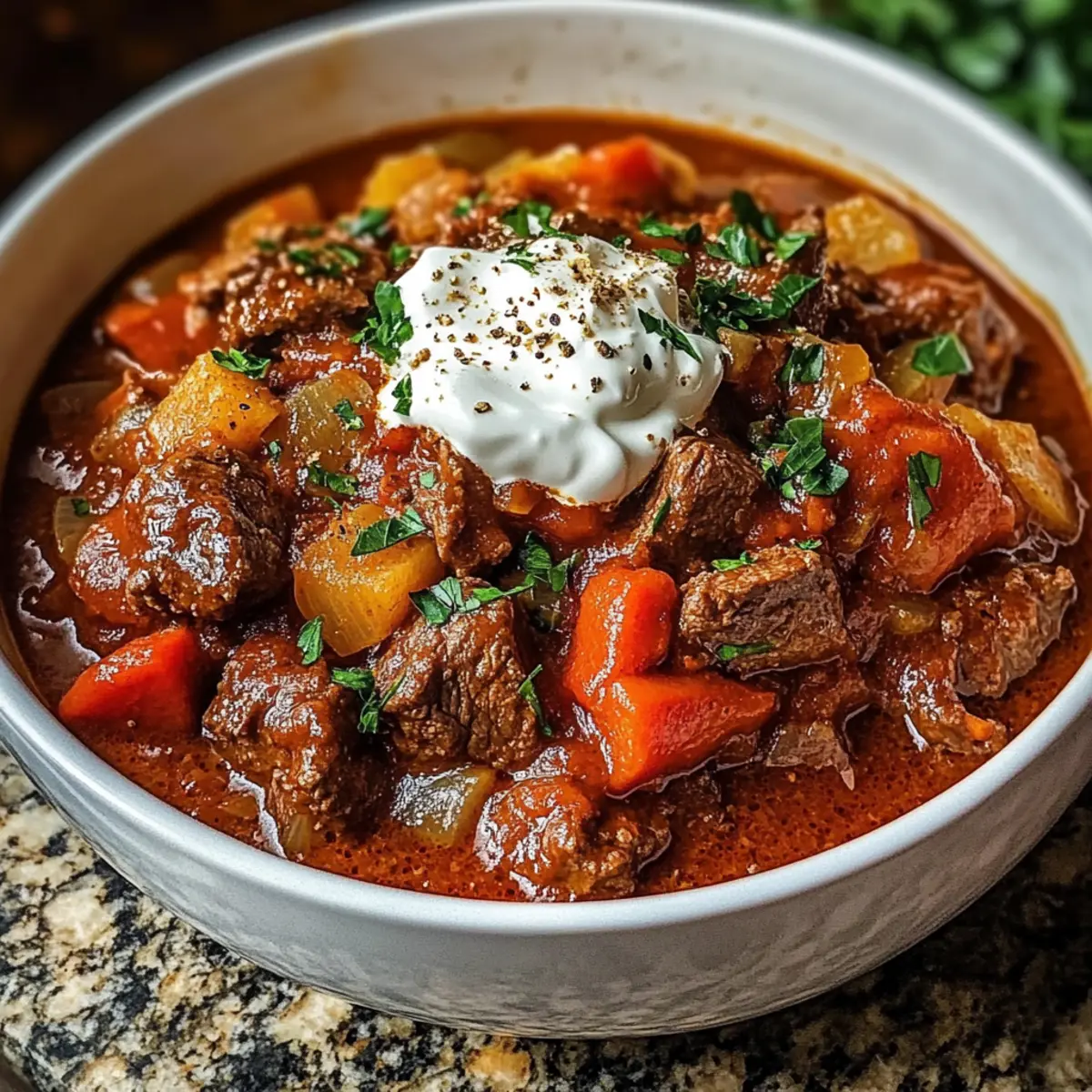 Wenn der Duft von rassigem Gulasch durch die Küche zieht, zieht es uns automatisch in die Erinnerungen an unbeschwerte Familienabende. Heute lade ich euch ein, ein gemütliches Slow Cooker Ungarisches Gulasch zuzubereiten, das nicht nur Herz und Bauch wärmt, sondern auch am Abend nach einem langen Tag eine willkommene Abwechslung bietet. Dieses Gericht vereint zartes Rindfleisch mit einer kräftigen Paprikasauce und ist einfach in der Zubereitung – perfekt für alle, die viel um die Ohren haben, aber dennoch auf Genuss nicht verzichten wollen. Und das Beste daran? Ihr könnt eine glutenfreie Variante zaubern, die jedem schmeckt. Neugierig, wie einfach es ist, diese Wohlfühlgericht auf den Tisch zu bringen? Warum wirst du dieses Gulasch lieben? Einfachheit: Mit nur wenigen Zutaten und minimalem Aufwand zauberst du ein köstliches Gericht. Herzhafter Geschmack: Die Kombination aus zartem Rindfleisch und würziger Paprikasauce sorgt für ein Geschmackserlebnis, das begeistert. Perfekte Konsistenz: Der dicke, reichhaltige Sauce umhüllt jeden Bissen, während das Fleisch weich und zart bleibt. Ideal für ein gemütliches Abendessen nach einem langen Tag – perfekt zum Servieren mit Nudeln oder frischem Brot. Vielseitigkeit: Variiere die Schärfe und die Zutaten ganz nach deinem Geschmack. Dieses Gulasch ist nicht nur für dich, sondern auch für die ganze Familie gemacht! Slow Cooker Ungarisches Gulasch Zutaten • Für ein zeitloses Rezept, perfekt für die ganze Familie: Für das Gulasch Rinderbrust – die Basisproteine bieten einen reichen Geschmack und herrliche Zartheit. Substituierbar durch Brisket oder Rinderhüfte für Abwechslung. Süßes ungarisches Paprika – die Hauptzutat für eine milde, süße Schärfe. Unverzichtbar für den authentischen Geschmack. Scharfes Paprika – sorgt für den nötigen Kick. Die Menge anpassen, je nach gewünschtem Schärfegrad. Zwiebelpulver – verstärkt den Gesamtgeschmack. Kann durch frische Zwiebeln ersetzt werden, wenn nötig. Knoblauchpulver – trägt zur Tiefe und zum Aroma bei. Ersetze durch frischen Knoblauch (4 zerdrückte Zehen). Küchen-Salz – dient zur Würze. Normales Salz kann verwendet werden, aber die Menge etwas reduzieren. Süße Zwiebel – bringt Süße und balanciert die Aromen. Kann auch durch gelbe Zwiebel ersetzt werden. Zerdrückte Knoblauchzehen – frischer Knoblauch verleiht dem Gericht eine scharfe Note. Mehl – verdickt die Sauce. Glutenfreies Mehl nutzen, wenn nötig. Rote Paprika – sorgt für Farbe und Süße. Grüne Paprika kann für einen schärferen Geschmack verwendet werden. Niedriger Natrium-Rinderbrühe – sorgt für Feuchtigkeit und Geschmack. Hühnerbrühe kann als Ersatz dienen. Zerteilte Tomaten – bilden die Basis der Sauce und sorgen für Tiefe und Säure. Kümmelsamen – traditionelle Kräuter für den Geschmack; optional, aber empfehlenswert. Brauner Zucker – optional, bringt eine angenehme Süße und mildert die Säure der Tomaten. Lorbeerblatt – für ein aromatisches Infusion während des Kochens; vor dem Servieren entfernen. Schmand – optionale Garnitur; sorgt für Cremigkeit und Würze. Kann durch griechischen Joghurt ersetzt werden. Mit diesen Zutaten zauberst du ein köstliches Slow Cooker Ungarisches Gulasch, das dich und deine Familie begeistern wird! Schritt-für-Schritt-Anleitung für Slow Cooker Ungarisches Gulasch Schritt 1: Rindfleisch vorbereiten Schneide das Rinderbrust in 3–4 cm große Stücke und wende sie in einer Mischung aus süßem und scharfem Paprika, Zwiebelpulver, Knoblauchpulver sowie Küchen-Salz. Achte darauf, das Fleisch gleichmäßig zu bedecken, um intensiven Geschmack zu gewährleisten. Dies dauert etwa 5 Minuten. Schritt 2: Zwiebeln und Knoblauch in den Slow Cooker geben Gib die gehackte süße Zwiebel, zerdrückte Knoblauchzehen und Mehl in den Slow Cooker. Vermische diese Zutaten gut, damit das Mehl gleichmäßig verteilt ist und eine Basis für die Sauce bildet. Lass das Ganze für etwa 2 Minuten stehen, damit sich die Aromen entfalten können. Schritt 3: Rindfleisch und Paprika hinzufügen Füge das gewürzte Rindfleisch zusammen mit der gehackten roten Paprika in den Slow Cooker. Rühre alles gut um, damit sich das Gemüse und das Fleisch gleichmäßig vermengen. Dies sorgt für ein harmonisches Geschmackserlebnis und dauert etwa 3 Minuten. Schritt 4: Flüssigkeiten hinzufügen Gieße die Rinderbrühe und die zerteilten Tomaten über die Mischung im Slow Cooker. Falls gewünscht, füge Kümmelsamen und optionalen braunen Zucker hinzu. Rühre alles leicht um, um die Zutaten zu kombinieren, und achte darauf, dass das Fleisch vollständig von Flüssigkeit umgeben ist. Schritt 5: Gulasch kochen Decke den Slow Cooker ab und koche das Slow Cooker Ungarische Gulasch auf niedriger Stufe für 8 Stunden oder auf hoher Stufe für 4 Stunden. Das Fleisch ist fertig, wenn es zart ist und sich leicht mit einer Gabel zerteilen lässt. Schritt 6: Finalisieren und servieren Entferne vor dem Servieren das Lorbeerblatt und schmecke das Gulasch ggf. ab. Bei Bedarf kannst du die Gewürze anpassen, bevor du das Gulasch in Schalen portionierst. Garniere es nach Belieben mit Kümmelsamen und einem Klecks Schmand für zusätzliche Cremigkeit. Aufbewahrungstipps für Slow Cooker Ungarisches Gulasch Kühlschrank: Lagere das übrig gebliebene Gulasch in einem luftdichten Behälter im Kühlschrank; es bleibt bis zu 3 Tage frisch und schmackhaft. Gefrierschrank: Du kannst das Gulasch bis zu 3 Monate lang im Gefrierbeutel oder in einem geeigneten Behälter einfrieren. Achte darauf, die Luft herauszudrücken, um Gefrierbrand zu vermeiden. Wiederaufrwärmen: Zum Wiedereinfrieren einfach im Kühlschrank über Nacht auftauen und dann langsam in einem Topf oder in der Mikrowelle bei niedriger Stufe erhitzen, bis es durchgehend warm ist. Vorbereitung: Bereite die Zutaten im Voraus vor und lagere sie im Kühlschrank, um am nächsten Tag ein schnelles und leckeres Slow Cooker Ung
