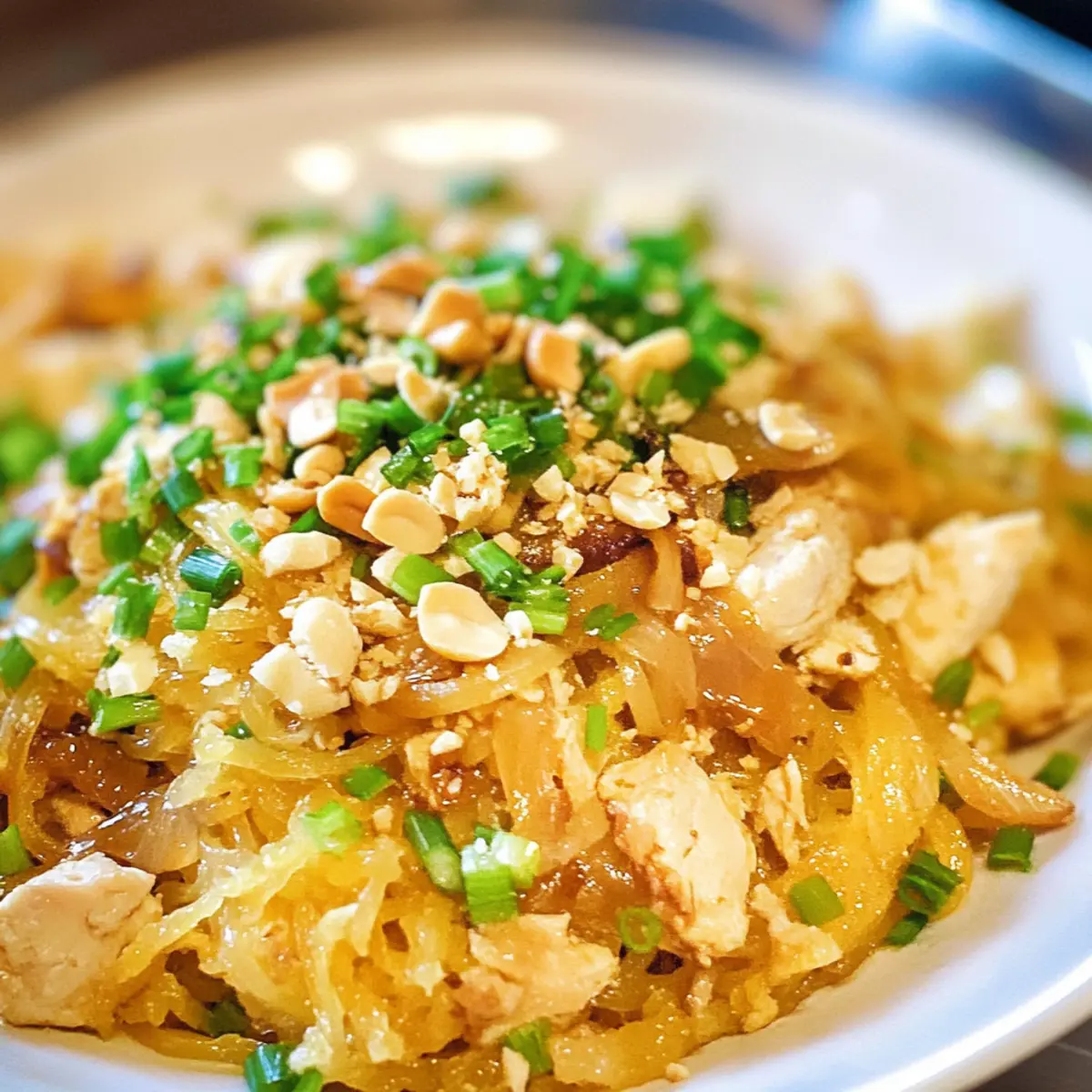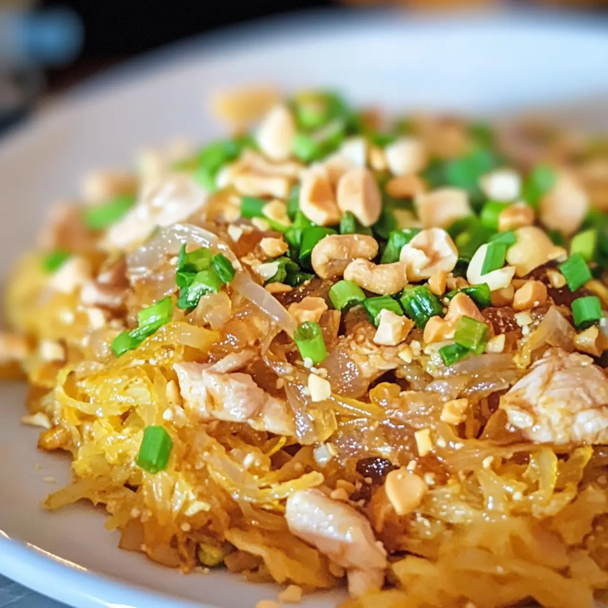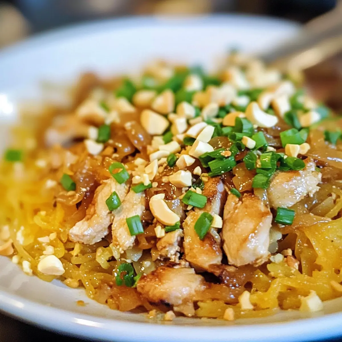 Als ich neulich in meiner Küche stand und die herrlichen Aromen von asiatischen Gewürzen einströmten, wurde mir klar, dass ich etwas Besonderes zubereiten wollte: Spaghetti-Kürbis Pad Thai. Seine zarten „Nudeln“ aus Kürbis sind nicht nur glutenfrei, sondern auch perfekt für alle, die nach einer gesunden, kohlenhydratarmen Alternative suchen. Dieses Rezept vereint die klassischen, süß-sauren Aromen der traditionellen Pad Thai mit einer ernährungsbewussten Wendung, die Sie garantiert begeistern wird. Die Kombination aus saftigem Hühnchen, knackigen Cashews und einer aromatischen Sauce macht dieses Gericht zu einer schnellen Lösung für köstliche Abende mit der Familie oder Freunden. Neugierig darauf, wie Sie Ihr Abendessen auf ein neues Level heben können? Lassen Sie uns gemeinsam kochen! Warum Spaghetti-Kürbis Pad Thai begeistern wird Einfachheit, die begeistert: Die Zubereitung ist unkompliziert und erfordert nur wenige Schritte, sodass Sie schnell ein köstliches Gericht zaubern können. Gesunde Alternative: Mit Spaghetti-Kürbis als Basis sparen Sie sich die Kohlenhydrate traditioneller Nudeln und genießen dennoch die Textur, die Sie lieben. Vielseitigkeit pur: Passen Sie das Rezept nach Belieben an, indem Sie beispielsweise Tofu oder Garnelen hinzufügen – ideal für jeden Geschmacksfan! Zeitersparnis: Perfekt für vielbeschäftigte Wochenabende – ein schnelles, nahrhaftes Abendessen ist in weniger als einer Stunde zubereitet. Gemeinsames Genießen: Dieses Gericht ist ideal für die ganze Familie oder Freunde und macht jede Dinner-Party zum Highlight. Machen Sie es sich zur Gewohnheit, gesunde Zutaten zu verwenden, und probieren Sie auch andere köstliche Rezepte wie unsere Schmackhaften Salate. Spaghetti-Kürbis Pad Thai Zutaten • Für diese köstliche und gesunde Alternative zu traditionellen Nudeln benötigen Sie folgende Zutaten: Für den „Nudel“-Basis Spaghetti-Kürbis – bietet eine kohlenhydratarme, nudelartige Textur; Zucchini kann als ähnliche Alternative verwendet werden. Für die Proteinquelle Hühnerbrust (gekocht) – bringt Geschmack und Eiweiß; jede Art von gekochtem Hähnchen ist ein guter Ersatz. Für den Geschmack Zwiebel – verleiht Süße und Tiefe; kann durch Schalotten ersetzt oder weggelassen werden, um den Kohlenhydratanteil zu reduzieren. Eier – sorgen für Reichtum und helfen, die anderen Zutaten zu verbinden; als vegane Alternative können Tofu oder Kichererbsenmehl verwendet werden. Pad Thai Sauce – verleiht den klassischen süß-sauren Geschmack; machen Sie Ihre eigene mit Tamarindenpaste oder wählen Sie eine glutenfreie Variante aus dem Supermarkt. Cashews – bieten Nussigkeit und Biss; Mandeln oder Erdnüsse sind gute Alternativen. Frühlingszwiebel – sorgt für Frische und milden Zwiebelgeschmack; kann durch Schnittlauch ersetzt oder weggelassen werden. Für die Garnitur Sriracha oder Chiliflocken – für alle, die es schärfer mögen; die Menge kann nach persönlichem Geschmack angepasst werden. Entdecken Sie das Geschmackserlebnis, das das Spaghetti-Kürbis Pad Thai bietet, und genießen Sie ein gesundes, schnelles Abendessen, das nicht nur sättigt, sondern auch glücklich macht! Schritt-für-Schritt-Anleitung für Spaghetti-Kürbis Pad Thai Step 1: Spaghetti-Kürbis vorbereiten Heizen Sie den Ofen auf 190 °C vor. Schneiden Sie den Spaghetti-Kürbis der Länge nach durch, entfernen Sie die Kerne und legen Sie die Hälften mit der Schnittfläche nach unten auf ein Backblech. Backen Sie ihn für etwa 45 Minuten, bis die Schale weich ist und sich leicht mit einer Gabel eindrücken lässt. Step 2: Kürbis „Nudeln“ herauskratzen Lassen Sie den Spaghetti-Kürbis nach dem Backen etwas abkühlen. Mit einer Gabel kratzen Sie das Fruchtfleisch heraus, um die noodleartigen Stränge zu formen. Achten Sie darauf, die „Nudeln“ vorsichtig zu lösen, damit sie nicht zerfallen. Stellen Sie diese beiseite und bereiten Sie die weiteren Zutaten vor. Step 3: Zwiebeln karamellisieren Erhitzen Sie in einer großen Pfanne bei mittlerer Hitze einen Esslöffel Öl. Fügen Sie die in Scheiben geschnittene Zwiebel hinzu und karamellisieren Sie sie für etwa 5–7 Minuten, bis sie goldbraun und weich ist. Rühren Sie gelegentlich um, um ein Anbrennen zu vermeiden, und nehmen Sie die Zwiebel aus der Pfanne, wenn sie fertig ist. Step 4: Eier braten In der gleichen Pfanne, in der Sie zuvor die Zwiebeln zubereitet haben, schlagen Sie zwei Eier auf. Bei mittlerer Hitze fügen Sie die Eier hinzu und rühren Sie sie kontinuierlich, bis sie leicht gestockt und nicht mehr flüssig sind – dies dauert etwa 2–3 Minuten. Nehmen Sie die Eier ebenfalls aus der Pfanne und stellen Sie sie beiseite. Step 5: Hühnchen und Spaghetti-Kürbis kombinieren Erhitzen Sie die Pfanne erneut und fügen Sie das gewürfelte, gekochte Hühnerfleisch hinzu, nur um es kurz zu erwärmen. Fügen Sie nun den bereits vorbereiteten Spaghetti-Kürbis und die Pad Thai Sauce hinzu, und rühren Sie alles gut um, bis die Zutaten gleichmäßig vermischt sind und von der Sauce umhüllt sind. Step 6: Alles kombinieren Geben Sie die karamellisierten Zwiebeln und die Rühreier zurück in die Pfanne mit dem Spaghetti-Kürbis Pad Thai. Vermengen Sie alles gut und lassen Sie es eine weitere Minute auf der Hitze, damit sich die Aromen verbinden. Achten Sie darauf, dass alles gut erhitzt ist, bevor Sie servieren. Step 7: Servieren und garnieren Servieren Sie Ihr Spaghetti-Kürbis Pad Thai heiß und garnieren Sie es mit frisch gehackten Frühlingszwiebeln und gerösteten Cashews. Wenn Sie es schärfer mögen, können Sie auch Sriracha oder Chiliflocken nach Belieben hinzufügen. Genießen Sie dieses gesunde Gericht mit Familie oder Freunden! Spaghetti-Kürbis Pad Thai Variationen Entdecken Sie kreative Möglichkeiten, um dieses leckere Rezept nach Ihrem Geschmack anzupassen und zu verfeinern! Keto-freundlich: Verwenden Sie Blumenkohlreis anstelle des Kürbis für eine noch niedr