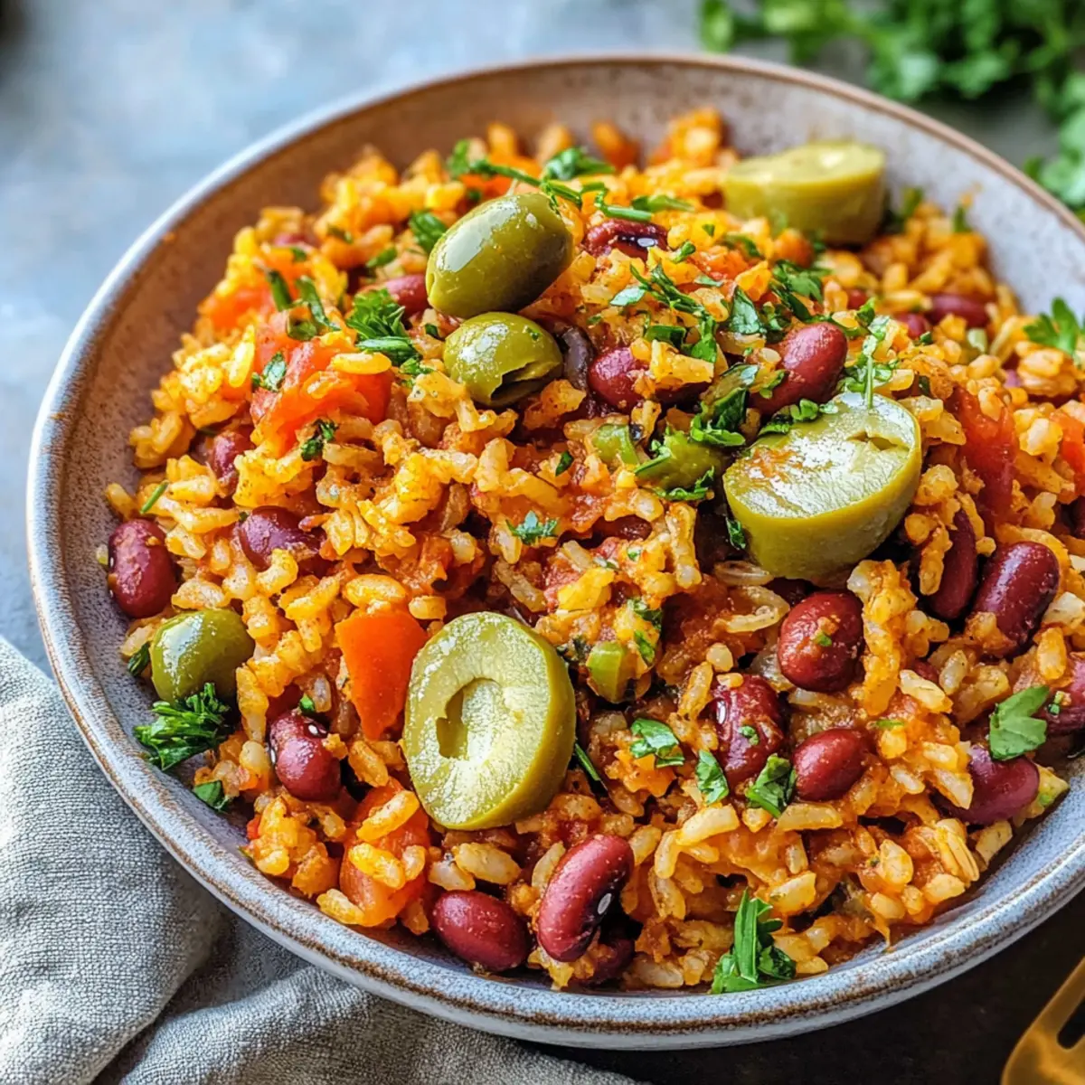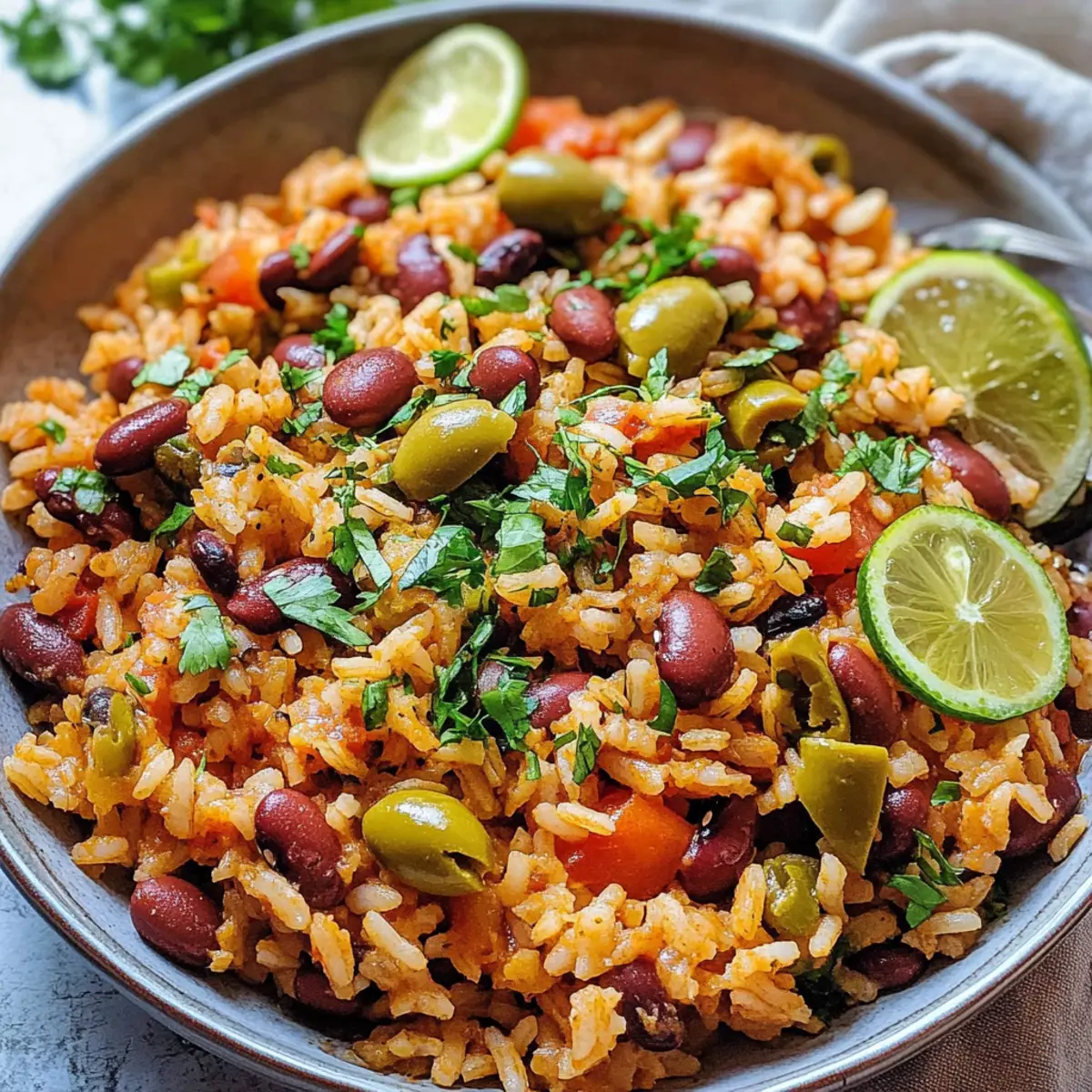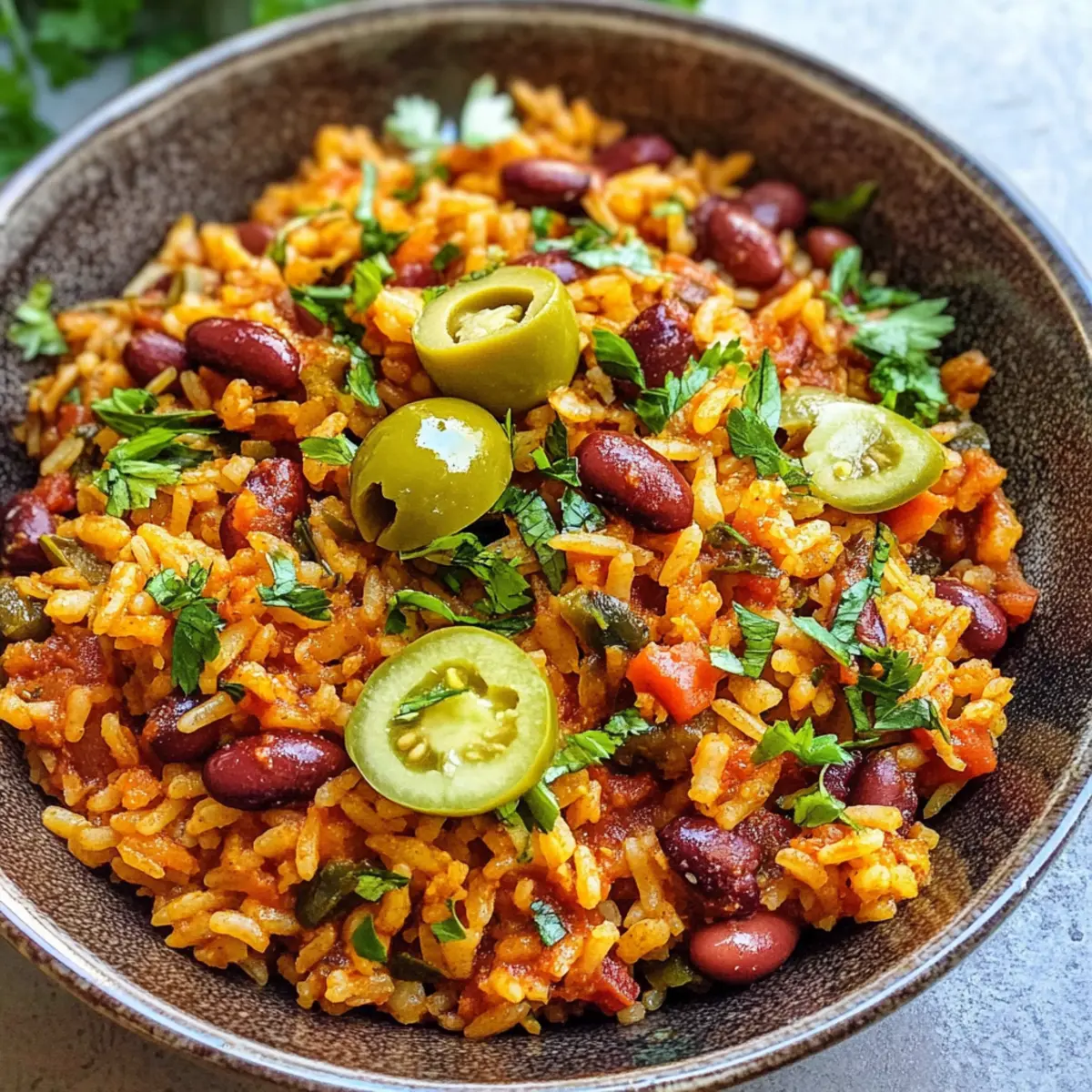 Eines Abends, während ich in meiner Küche stand und die warmen Aromen von Gewürzen durch den Raum zogen, fiel mein Blick auf eine Packung Reis und eine Dose Bohnen. Sofort wusste ich, dass es Zeit für ein herzhaftes Gericht war: Spanischer Reis und Bohnen! Diese köstliche Kombination ist nicht nur ein einfaches, sondern auch ein nahrhaftes One-Pot-Mahl, das sich perfekt für hektische Wochentage eignet. Mit der richtigen Balance aus Proteinen und Ballaststoffen fördert es ein stabiles Energieniveau und macht sich gut als vegane Speise für die ganze Familie. Und das Beste: Du kannst es ganz nach deinem Geschmack anpassen! Bist du bereit, deine eigene köstliche Version zu kreieren? Warum ist dieses Rezept unvergesslich? Einfachheit, das Rezept ist perfekt für alle Kochlevels und benötigt nur grundlegende Fertigkeiten. Vielseitigkeit, Du kannst die Bohnen und Gewürze nach Belieben anpassen und so die Grundlage für unzählige Variationen schaffen. Herzhafter Geschmack, die Kombination aus den Gewürzen lässt jeden Bissen herzlich und zufriedenstellend schmecken. Gesundheit, reich an Protein und Ballaststoffen unterstützt es eine ausgewogene Ernährung! Einfache Zubereitung, in nur einem Topf fertiggestellt – weniger Geschirr und mehr Zeit zum Genießen. Familienfreundlich, jeder wird dieses Gericht lieben, egal ob groß oder klein. Probiere auch vegetarische Alternativen für mehr Geschmack! Spanischer Reis und Bohnen Zutaten • Lass uns direkt loslegen mit den wundervollen Zutaten für dein Gericht. Für den Reis und die Bohnen Nativ extra Olivenöl – sorgt für Reichtum und Unterstützung beim Kochen; du kannst es mit jedem neutralen Öl ersetzen. Gelbe Zwiebel – bringt Süße und Tiefe in den Geschmack; fein hacken sorgt für gleichmäßiges Garen. Knoblauchzehen – verstärken das Aroma und den Geschmack; frischer Knoblauch ist am besten. Paprika – bietet Wärme und eine milde Rauchigkeit; substituiere mit geräucherter Paprika für zusätzlichen Geschmack. Koscheres Salz – hebt den Gesamtgeschmack; reguliere mit normalem Salz in kleineren Mengen nach Geschmack. Chilipulver – fügt Schärfe und Tiefe hinzu; passe die Menge nach deinem Geschmack an. Getrockneter Oregano – bringt eine kräuterliche Note; kann mit italienischen Gewürzen ersetzt werden. Schwarzer Pfeffer – fügt eine milde Würze hinzu; frisch gemahlen hat den besten Geschmack. Cayennepfeffer (optional) – für zusätzliche Schärfe; weglassen für eine mildere Variante. Langkörniger weißer Reis (Jasmin oder Basmati) – das Herzstück des Gerichts; kein direkter Ersatz; benutze keinen Instant-Reis. Feuergeröstete, gewürfelte Tomaten – bringen Säure und Feuchtigkeit; können durch Glas-Salsa ersetzt werden für mehr Geschmack. Kidneybohnen – bieten Protein und Ballaststoffe; nutze beliebige Dosenbohnen wie schwarze oder pintobohnen, gut abgetropft. Gemüse- oder Hühnerbrühe – intensiviert die Aromen im Gericht; Wasser ist ein Ersatz. In Scheiben geschnittene grüne Oliven – sorgt für einen salzigen und texturierten Genuss; weglassen, wenn nicht gewünscht. Petersilienöl (optional) – erhöht die Frische; benutze frische Petersilie, Zitronenschale und Zitronensaft gemischt mit Olivenöl. Nutze diese Zutaten für dein spanisches Reis und Bohnen Gericht und lasse es zu einem Höhepunkt deiner Küche werden! Schritt-für-Schritt-Anleitungen für Spanischer Reis und Bohnen Step 1: Zwiebeln anbraten Erhitze in einer großen Pfanne mit Deckel bei mittlerer Hitze 2 Esslöffel nativ extra Olivenöl. Füge die fein gehackte gelbe Zwiebel hinzu und dünste sie etwa 5 Minuten lang, bis sie weich und glasig ist. Rühre gelegentlich um, um ein gleichmäßiges Garen zu gewährleisten und ein Anbrennen zu vermeiden. Step 2: Gewürze hinzufügen In die Pfanne kommen jetzt 3 gehackte Knoblauchzehen sowie 1 Teelöffel Paprika, 1/2 Teelöffel koscheres Salz, 1 Teelöffel Chilipulver, 1 Teelöffel getrockneter Oregano, 1/2 Teelöffel frisch gemahlenen schwarzen Pfeffer und eventuell 1/4 Teelöffel Cayennepfeffer. Brate alles zusammen für weitere 2 Minuten, bis die Gewürze aromatisch sind und ihre Aromen freisetzen. Step 3: Reis rösten Rühre 1 Tasse langkörnigen weißen Reis (wie Jasmin oder Basmati) in die Pfanne und lasse ihn etwa 2 Minuten rösten. Dabei solltest du darauf achten, dass der Reis leicht glasig wird und duftend ist. Dies hilft, Geschmack zu entwickeln und die Körner gut vorzubereiten für das Kochen. Step 4: Flüssigkeit und Bohnen hinzufügen Gib nun 1 Dose (400 g) feuergeröstete, gewürfelte Tomaten, 1 Dose (400 g) abgetropfte und gespülte Kidneybohnen sowie 2 Tassen Gemüse- oder Hühnerbrühe in die Pfanne. Bring die Mischung zum Kochen und achte darauf, dass es an den Rändern blubbert, um eine gleichmäßige Kochtemperatur zu erreichen. Step 5: Simmer bis gar Sobald die Mischung kocht, reduziere die Hitze auf mittlere bis niedrige Stufe. Decke die Pfanne ab und lasse alles für etwa 25 Minuten sanft köcheln. Achte darauf, gelegentlich zu rühren, bis die Flüssigkeit vollständig aufgenommen ist und der Reis zart und fluffig geworden ist. Step 6: Petersilienöl zubereiten Falls du das optionale Petersilienöl zubereiten möchtest, mische in einer kleinen Schüssel 1/4 Tasse frische, gehackte Petersilie, die Schale und den Saft von einer Zitrone sowie 2 Esslöffel Olivenöl. Rühre alles gut um, bis eine homogene Mischung entsteht und stelle es beiseite, bis das Gericht fertig ist. Step 7: Servieren Nachdem der Reis und die Bohnen fertig sind, streue 1/2 Tasse in Scheiben geschnittene grüne Oliven über das Gericht. Träufle dann das vorbereitete Petersilienöl darüber, um dem Gericht eine frische Note zu verleihen. Jetzt ist dein köstlicher spanischer Reis und Bohnen bereit zum Servieren! Was passt zu Spanischem Reis und Bohnen? Eine perfekte Begleitung macht dein Essen noch spezieller – lass uns die harmonischen Aromen ergänzen und dein Dinner-Ereignis abru