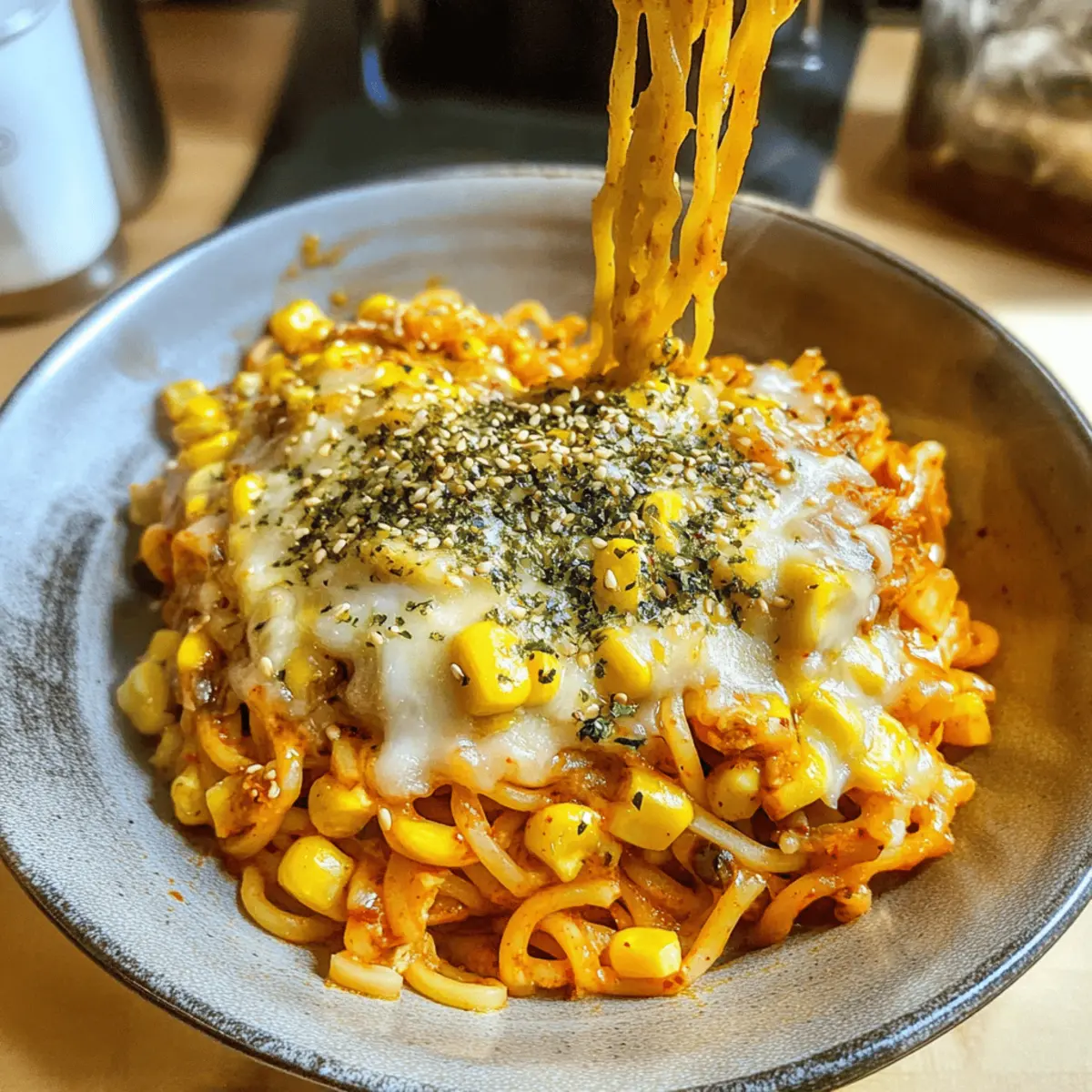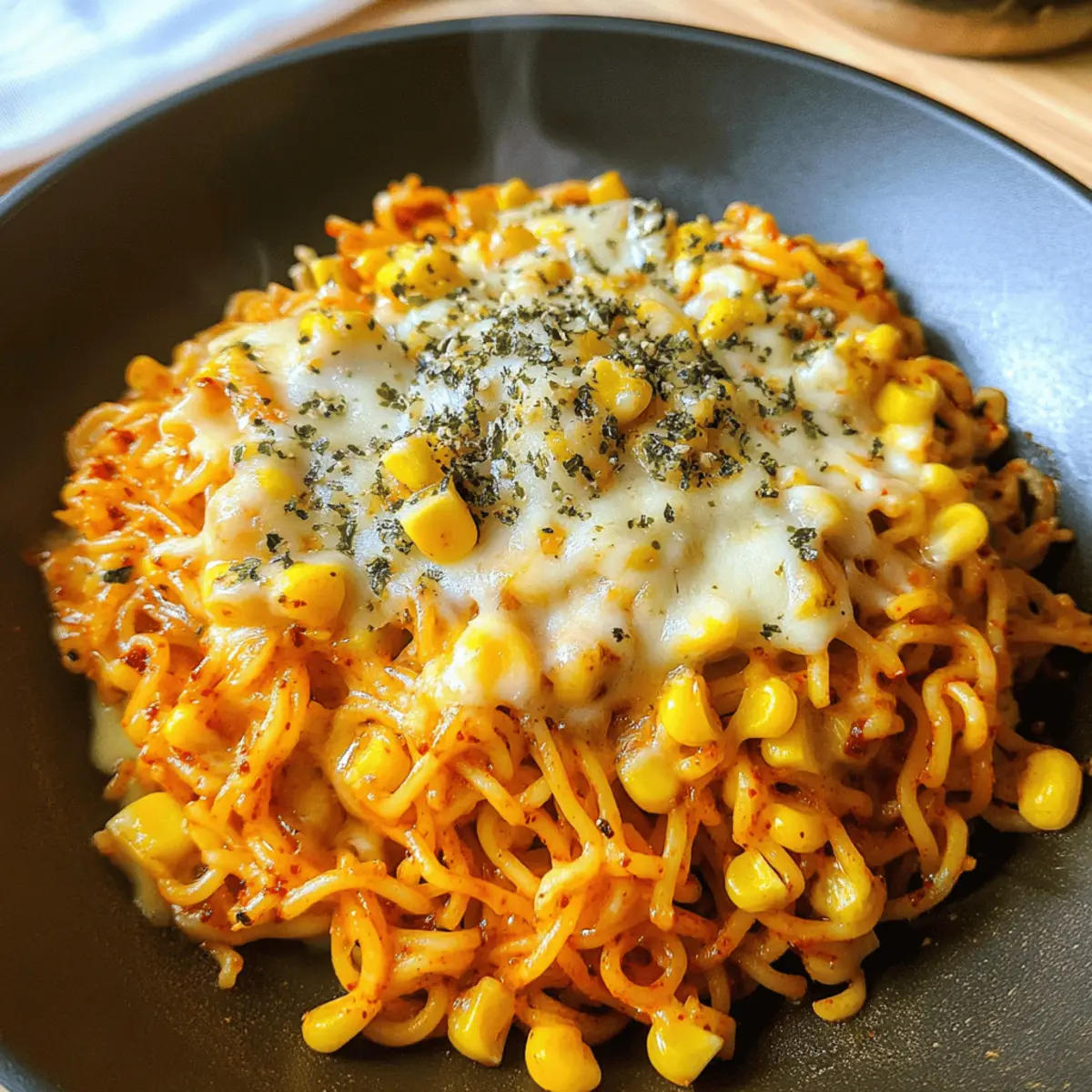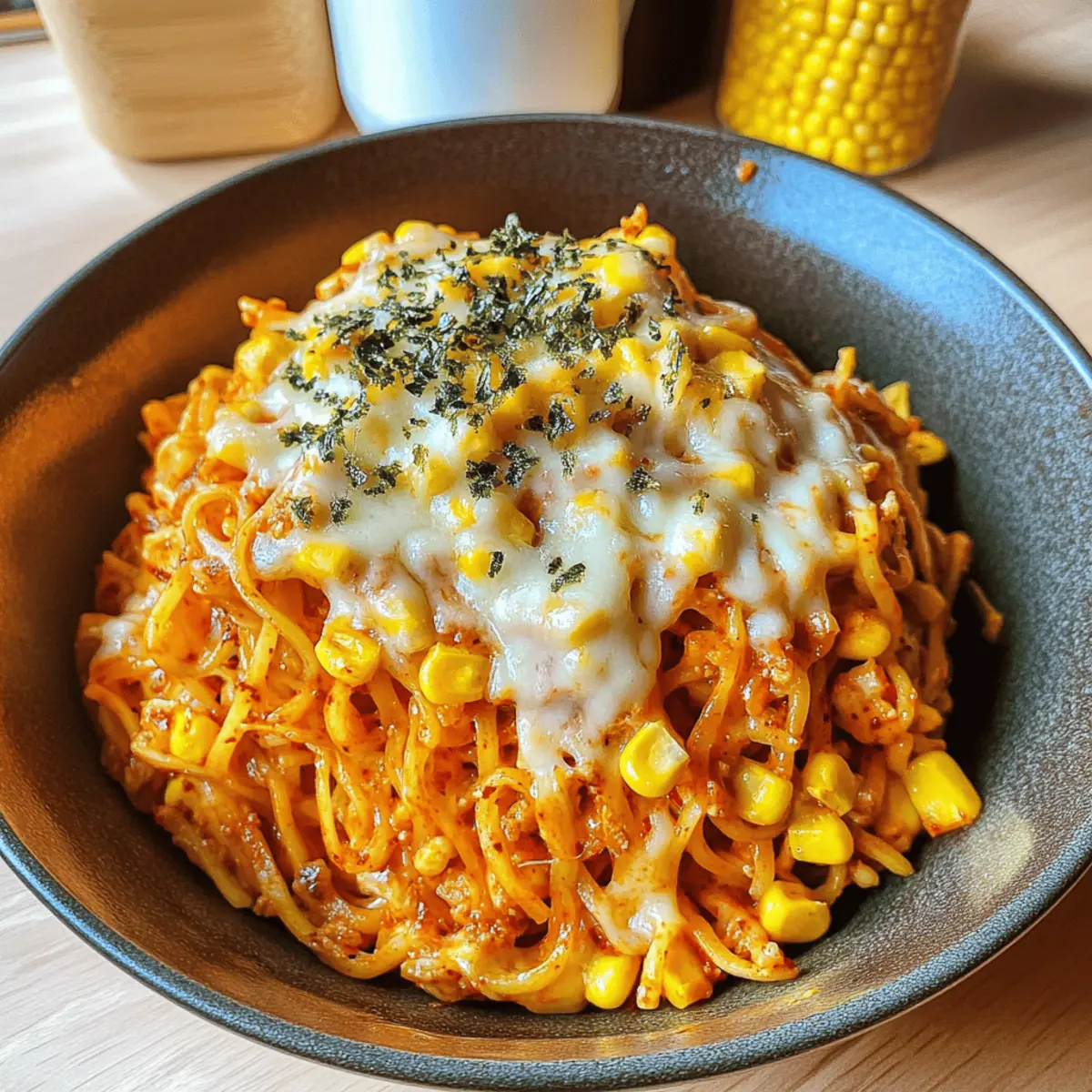 Würziger Genuss: Die Kombination aus scharfen Instant-Nudeln und cremigem Käse zusammen mit süßem Mais sorgt für ein unvergleichliches Geschmackserlebnis.