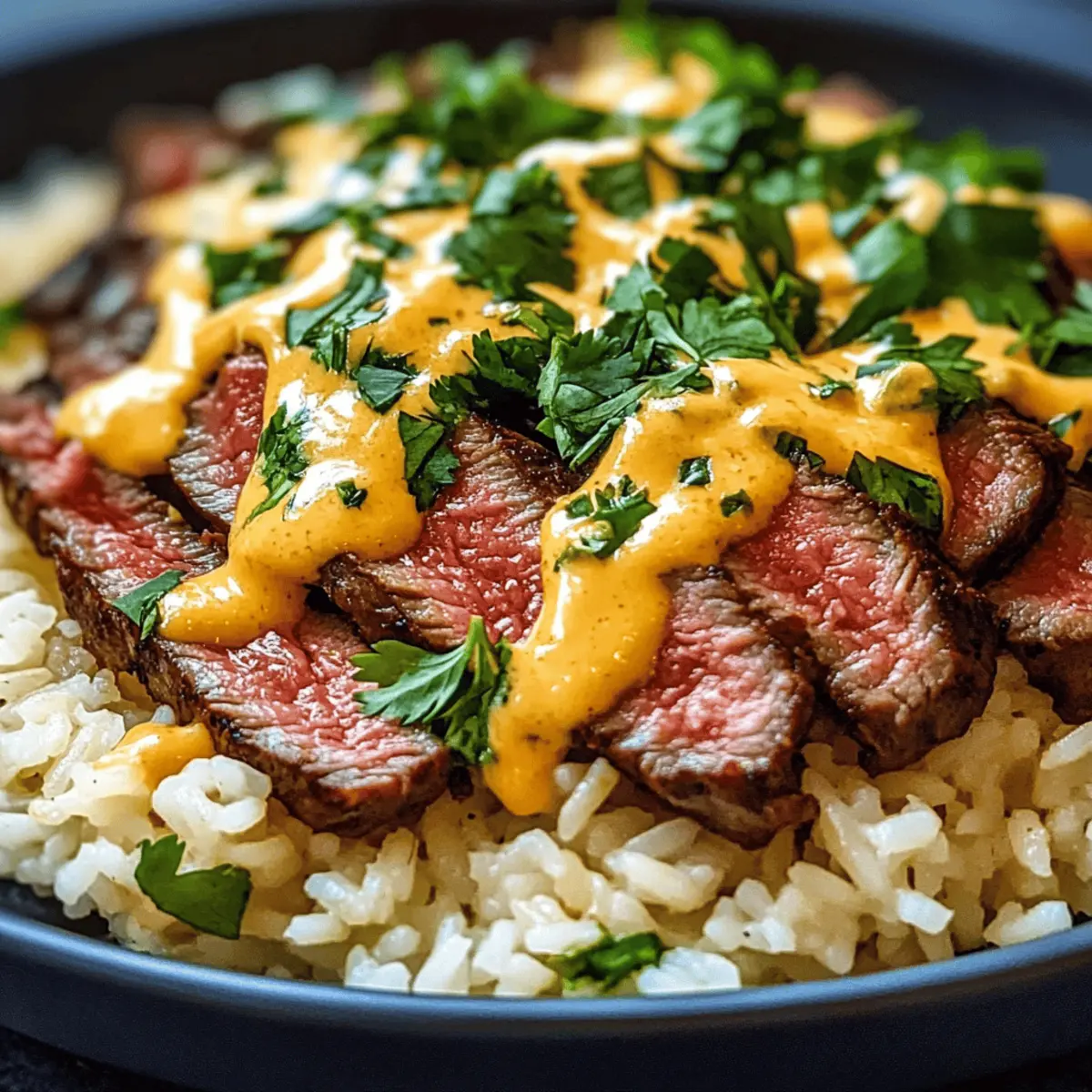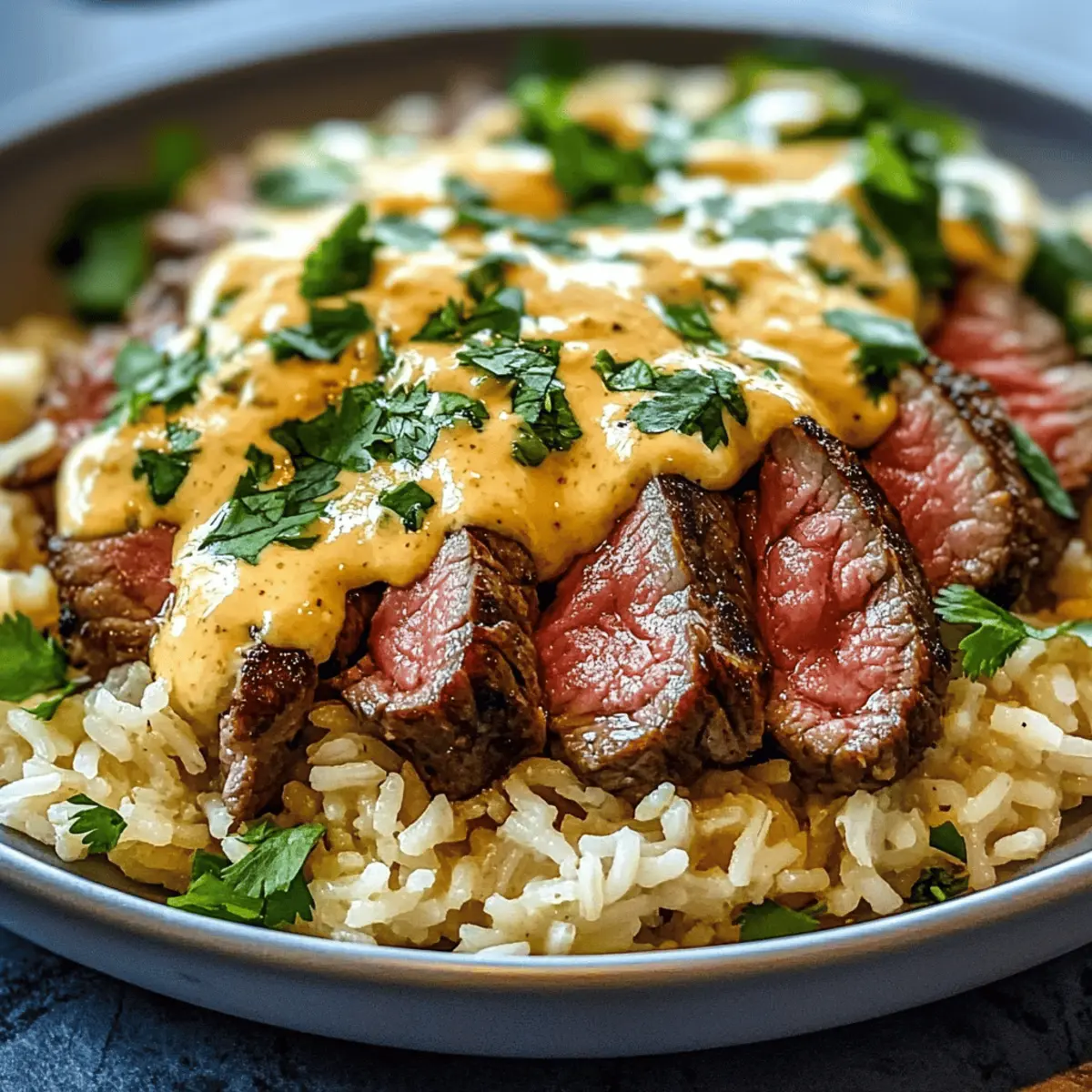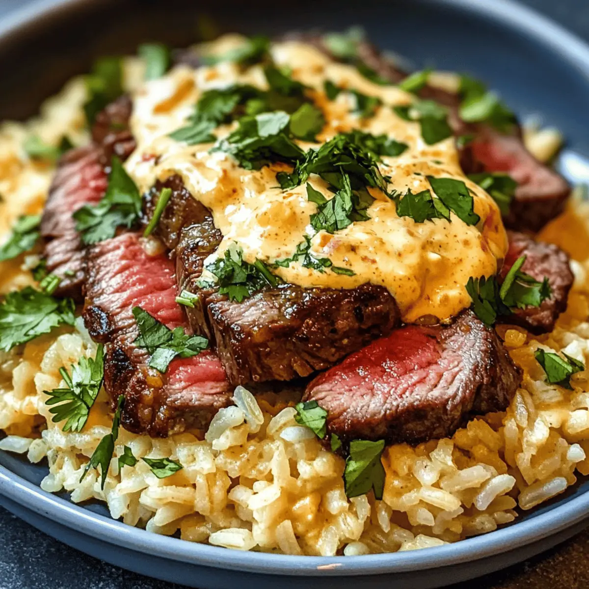 Es war ein trüber Abend und ich hatte Lust auf etwas Herzhaftes, das meine Stimmung aufhellen würde. Während ich durch meine Küchenschränke stöberte, fand ich die perfekte Kombination für ein Rezept, das schnell zubereitet ist und garantiert alle glücklich macht: Steak & Queso Rice. Diese fantastische Tex-Mex-Kreation vereint fluffy Reis, zartes Sirloin-Steak und eine cremige Käsesauce – so lecker, dass es kaum zu glauben ist! Ideal für hektische Wochentage oder gesellige Zusammenkünfte, ist dieses Gericht nicht nur einfach zuzubereiten, sondern auch ein echter Familienliebling, der Wärme und Genuss in jeden Bissen bringt. Bereit, in die Welt der köstlichen Aromen einzutauchen? Lass uns gemeinsam loslegen! Warum werden Sie dieses Rezept lieben? Vielseitigkeit: Sie können mit verschiedenen Proteinoptionen experimentieren, sei es Hähnchen oder sogar pflanzliche Alternativen. Einfachheit: In nur 35 Minuten bereiten Sie ein herzhaftes Gericht zu, das perfekt für hektische Abende ist. Reiche Aromen: Die Kombination aus Gewürzen und cremigem Queso sorgt für einen Gaumenschmaus. Familienfreundlich: Sowohl Kinder als auch Erwachsene lieben es – ideal für gesellige Zusammenkünfte! Entdecken Sie auch unser Rezept für Philly Cheesesteak Schalen oder versuchen Sie die Keto Philly Cheesesteak für eine gesunde Variante! Steak & Queso Reis Zutaten • Diese Zutaten machen Ihr Gericht zum Hit! Für den Reis • Langkornreis – Das Grundelement für eine herzliche Textur; kann durch braunen Reis für mehr Ballaststoffe ersetzt werden. • Olivenöl – Zum Anbraten von Reis und Zwiebel, sorgt für Geschmack und hilft beim Bräunen. • Zwiebel (1 kleine, fein gehackt) – Fügt Süße und Tiefe hinzu; kann durch Schalotten ersetzt werden. • Geschnittener Knoblauch (1 EL) – Liefert ein aromatisches Aroma; frischer Knoblauch ist bevorzugt. • Hühnerbrühe (2 Tassen) – Verbessert den Geschmack des Reises; für eine vegetarische Option kann Gemüsebrühe verwendet werden. • Tomatensauce (8 oz) – Fügt Feuchtigkeit und Würze hinzu; verwenden Sie natriumarme Sauces, wenn Sie auf den Salzgehalt achten. • Salz (½ TL) – Verbessert den Gesamgeschmack; nach Belieben anpassen. • Schwarzpfeffer (½ TL) – Fügt milde Schärfe hinzu. • Gemahlener Kreuzkümmel (1 TL) – Bietet den warmen, erdigen Geschmack, der typisch für Tex-Mex ist. • Getrockneter Koriander (1 TL) – Fügt eine frische, kräuterige Note hinzu; frischer Koriander kann verwendet werden, wenn verfügbar. Für das Steak • Sirloin Steak (1 lb, in Scheiben) – Hauptprotein; wählen Sie Schnitte mit guter Marmorierung für den besten Geschmack. • Butter (2 EL) – Zum Anbraten des Steaks und sorgt für reichhaltigen Geschmack. • Montreal Steakgewürz – Gewürzmischung für das Steak, verstärkt den Geschmack; nach Belieben verwenden. Für die Sauce • Pancho’s White Queso – Cremiges Topping, das das Gericht bereichert; kann durch hausgemachten Queso oder anderen Käse ersetzt werden. • Frischer Koriander (zum Garnieren) – Fügt Frische und Farbe zur Präsentation hinzu. Zum Servieren • Tortillas (zum Servieren) – Optional, für ein lustiges, interaktives Essen. Machen Sie sich bereit für eine köstliche Erfahrung mit diesem Steak & Queso Reis, der Ihre Geschmacksknospen verwöhnen wird! Schritt-für-Schritt-Anleitung für Steak & Queso Reis Step 1: Reis Toasten Erhitze 2 Esslöffel Olivenöl in einer großen Pfanne bei mittlerer Hitze. Füge 1 Tasse Langkornreis hinzu und rühre alles gut um. Lasse den Reis 3–4 Minuten anbraten, bis er leicht goldbraun ist. Dies sorgt dafür, dass der Reis seine Struktur behält und nicht matschig wird. Step 2: Zwiebel und Knoblauch Anbraten Gib 1 kleine, fein gehackte Zwiebel und 1 Esslöffel geschnittenen Knoblauch zum Reis. Brate sie weitere 2–3 Minuten an, bis die Zwiebel weich und glasig ist, und der Knoblauch aromatisch duftet. So wird dein Steak & Queso Reis schön geschmackvoll. Step 3: Brühe und Tomatensauce Hinzufügen Gieße 2 Tassen Hühnerbrühe und 8 Unzen Tomatensauce in die Pfanne. Bring alles zum Kochen und lasse es dann 2 Minuten sprudeln. Diese Flüssigkeit sorgt dafür, dass der Reis die köstlichen Aromen aufnehmen kann. Step 4: Reis Köcheln Lassen Reduziere die Hitze auf niedrig, decke die Pfanne ab und lasse den Reis 20 Minuten köcheln. Achte darauf, dass der gesamte Flüssigkeitsanteil aufgesogen wird und der Reis schön fluffig wird. Nach der Kochzeit kannst du den Deckel abnehmen und überprüfen, ob der Reis gar ist. Step 5: Steak Braten In einer separaten Pfanne, schmelze 2 Esslöffel Butter über mittlerer bis hoher Hitze. Gib 1 Pfund geschnittenes Sirloin Steak hinzu, das mit Montreal Steakgewürz gewürzt ist. Brate das Steak für 4–6 Minuten, bis es die gewünschte Garstufe erreicht hat. So wird es zart und saftig. Step 6: Reis Ruhen Lassen Nehme die Pfanne mit dem Reis vom Herd und lasse sie mit geschlossenem Deckel für weitere 10 Minuten ruhen. Dies sorgt dafür, dass der Reis weiter aufquillt und schön locker wird. Step 7: Gericht Anrichten Locker den Reis mit einer Gabel auf und platziere ihn auf einer großen Servierplatte. Schichte das köstlich gebratene Steak darüber und beträufle alles mit 8 Unzen Pancho’s White Queso. So entsteht eine reichhaltige und cremige Schicht. Step 8: Garnieren und Servieren Garnire das Gericht mit frischem Koriander für einen spritzigen Farbkontrast. Serviere den Steak & Queso Reis warm, optional mit weichen Tortillas an der Seite. So wird ein interaktives und genussvolles Esserlebnis geschaffen. Lagerungstipps für Steak & Queso Reis Raumtemperatur: Bewahre Reste nicht länger als 2 Stunden bei Raumtemperatur auf, um das Risiko von Lebensmittelvergiftungen zu vermeiden. Kühlschrank: Lagere übrig gebliebenen Steak & Queso Reis in luftdichten Behältern für bis zu 3 Tage. Achte darauf, den Reis vor dem Kühlen auf Raumtemperatur abkühlen zu lassen. Gefriertruhe