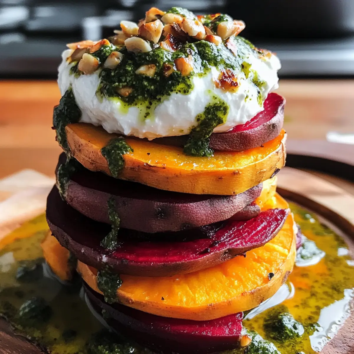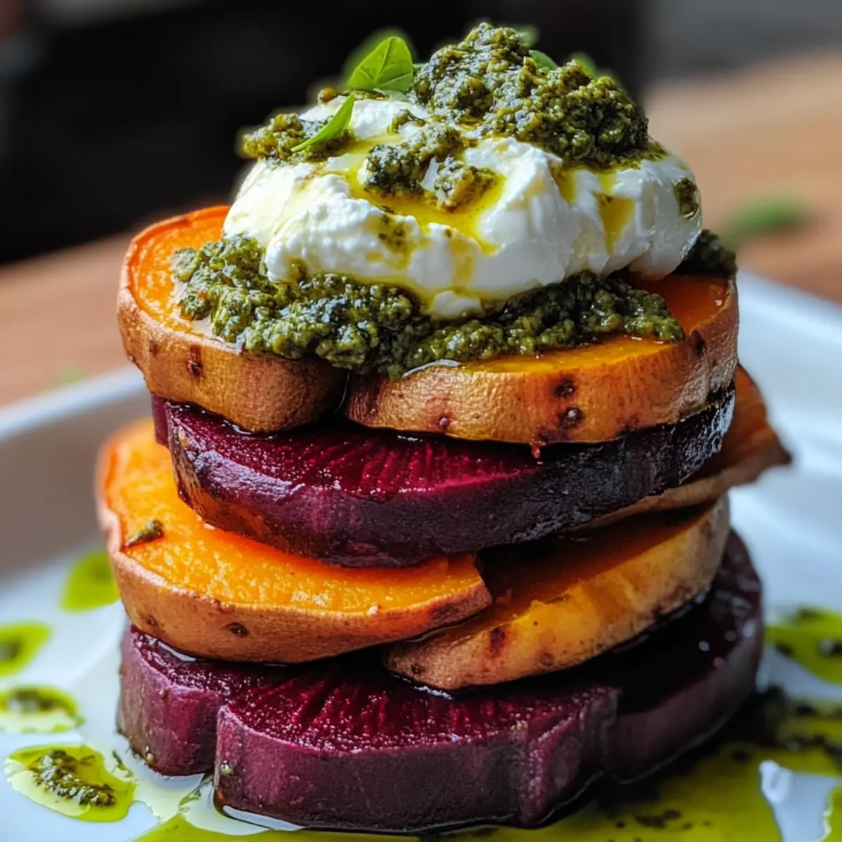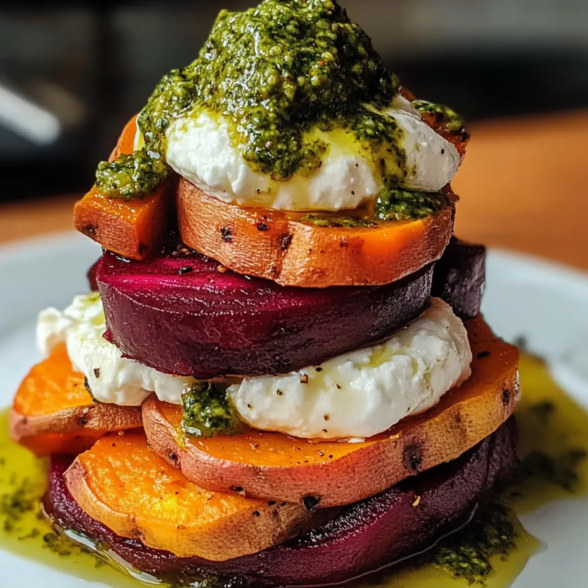 Es gibt Momente, in denen ein einfaches Gericht die Augen zum Leuchten bringt und die Sinne verführt. Wenn ich die bunten Süßkartoffel- und Rübenstapel mit Pesto und Burrata vorbereite, fühle ich mich jedes Mal wie ein Künstler in meiner eigenen Küche. Diese Rezeptur ist nicht nur ein Fest für die Augen – die zarten, gerösteten Gemüseschichten mit cremigem Burrata und frischem Pesto bieten auch eine wunderbare Harmonie von Geschmack und Textur. Ideal für ein entspanntes Abendessen zu Hause oder um Gäste zu beeindrucken, lässt sich dieses vegane Gericht schnell zubereiten und sorgt sicher für Begeisterung. Wer könnte da widerstehen, oder? Lass uns gemeinsam in diese köstliche Welt eintauchen! Warum sind diese Stapel ein Hingucker? Farbenfrohes Erlebnis: Die leuchtenden Farben der Süßkartoffel und Rüben verwandeln jede Präsentation in ein Kunstwerk und machen das Gericht sowohl visuell ansprechend als auch köstlich. Einfache Zubereitung: Mit nur wenigen grundlegenden Zutaten und einfacher Zubereitung wird jeder zum Küchenprofi! Vielseitig kombinierbar: Ideal als Hauptgericht oder Beilage, passt perfekt zu Quinoa oder frischem Salat. Überraschende Texturen: Der cremige Burrata und das aromatische Pesto stellen eine köstliche Balance dar, die sowohl zufriedenstellt als auch begeistert. Köstliches für jeden Anlass: Ob für ein intimes Abendessen oder eine elegante Dinnerparty – dieses Gericht wird garantiert Gesprächsthema sein! Schau dir auch unser Rezept für Knoblauchbutter Garnelen Lasagne an, wenn du nach weiteren beeindruckenden Gerichten suchst! Süßkartoffel- und Rübenstapel Zutaten • Entdecke die herzlichen Aromen und frischen Zutaten für dieses vegetarische Festmahl! Für die Stapel • Süßkartoffeln – sorgen für eine natürliche Süße und eine cremige Textur; bei Bedarf kannst du auch Yamswurzeln verwenden. • Rüben – bringen eine erdige Note mit, die perfekt mit der Süße der Kartoffeln harmoniert; verwende bei Zeitmangel auch vorgegarte Rüben aus der Dose (gut abtropfen und abspülen). • Olivenöl – ist unerlässlich zum Rösten und verleiht den Aromen Tiefe. • Salz und Pfeffer – sorgen für die grundlegende Würze und betonen den Geschmack der Gemüsesorten. Für das Pesto • Basilikum – liefert den klassischen Geschmack; du kannst auch Spinat oder Rucola verwenden, wenn du eine interessante Variation möchtest. • Pinienkerne – bringen einen nussigen Geschmack; ersetze sie durch Sonnenblumenkerne, um das Pesto nussfrei zu halten. • Parmesan – fügt dieser Mischung eine salzige Tiefe hinzu; ihn durch Hefeflocken zu ersetzen kann eine großartige vegane Option sein. • Knoblauch – bringt eine aromatische Schärfe in dein Pesto; passe die Menge nach deinem Geschmack an. • Zitronensaft – sorgt für Frische und Helligkeit im Pesto; du kannst auch Limettensaft verwenden, wenn du etwas Anderes ausprobieren möchtest. Für die Garnitur • Burrata – gibt dem Gericht seine cremige Konsistenz; falls nicht verfügbar, kann frischer Mozzarella verwendet werden, jedoch ist der weniger cremig. • Mikrogreens oder frischer Basilikum – erhöhen die Farbe und Frische; fühle dich frei, hier kreativ zu werden! Lass uns gemeinsam in die Zubereitung dieser köstlichen Süßkartoffel- und Rübenstapel mit Pesto und Burrata eintauchen! Schritt-für-Schritt-Anleitung für Süßkartoffel- und Rübenstapel mit Pesto und Burrata Step 1: Ofen vorheizen Heize deinen Ofen auf 200 °C vor und bereite zwei Backbleche mit Backpapier vor. Dies erleichtert die Reinigung und sorgt dafür, dass die Süßkartoffeln und Rüben gleichmäßig rösten. Während der Ofen aufheizt, kannst du mit der Vorbereitung der Gemüsescheiben beginnen. Step 2: Gemüse vorbereiten Schneide die Süßkartoffeln und Rüben in gleichmäßige Scheiben, damit sie gleichmäßig garen. Verteile die Süßkartoffelscheiben auf einem Backblech und die Rübenscheiben auf dem anderen. Beträufle beide mit Olivenöl und würze sie mit Salz und Pfeffer. Mische die Scheiben gründlich, sodass sie gleichmäßig überzogen sind. Step 3: Rösten der Gemüsescheiben Schiebe die Backbleche in den vorgeheizten Ofen. Röste die Süßkartoffeln für etwa 25-30 Minuten, wobei du sie nach der Hälfte der Zeit umdrehst. Die Rüben benötigen 30-35 Minuten, bis sie zart und leicht karamelisiert sind. Achte darauf, dass sie beim Herausnehmen aus dem Ofen einen schönen goldbraunen Farbton haben. Step 4: Pesto zubereiten Während das Gemüse im Ofen ist, kannst du das Pesto zubereiten. Gib frisches Basilikum, Pinienkerne, Parmesan, Knoblauch und Zitronensaft in eine Küchenmaschine. Püriere die Mischung und träufle langsam 80 ml Olivenöl hinzu, bis das Pesto eine cremige Konsistenz erreicht. Schmecke es ab und passe gegebenenfalls die Würze an. Step 5: Stapeln der Gemüsescheiben Sobald das Gemüse aus dem Ofen gekommen ist und leicht abgekühlt ist, beginne mit dem Stapeln. Lege eine Scheibe Süßkartoffel auf einen Teller, gefolgt von einer Scheibe Rübe. Wiederhole das Schichten, bis du die gewünschte Höhe erreichst. Achte darauf, die Farben ansprechend anzuordnen. Step 6: Garnieren Sobald die Süßkartoffel- und Rübenstapel fertig sind, gib einen Klecks des frisch zubereiteten Pestos obenauf. Setze ein großes Stück Burrata als Krönung auf jeden Stapel. Sie schmilzt leicht bei Raumtemperatur und verleiht dem Gericht eine großartige cremige Note. Step 7: Anrichten und Servieren (Optional) Garniere die Stapel mit Mikrogreens oder frischem Basilikum für einen zusätzlichen Farbtupfer. Ein kleiner Schuss Olivenöl darüber bringt ein schönes Aroma. Serviere die Süßkartoffel- und Rübenstapel sofort als beeindruckendes Hauptgericht oder Beilage. Lagerungstipps für Süßkartoffel- und Rübenstapel mit Pesto und Burrata Kühlschrank: Bewahre die Reste der Süßkartoffel- und Rübenstapel in einem luftdichten Behälter auf, um die Frische bis zu 3 Tage zu erhalten. Halte Pe