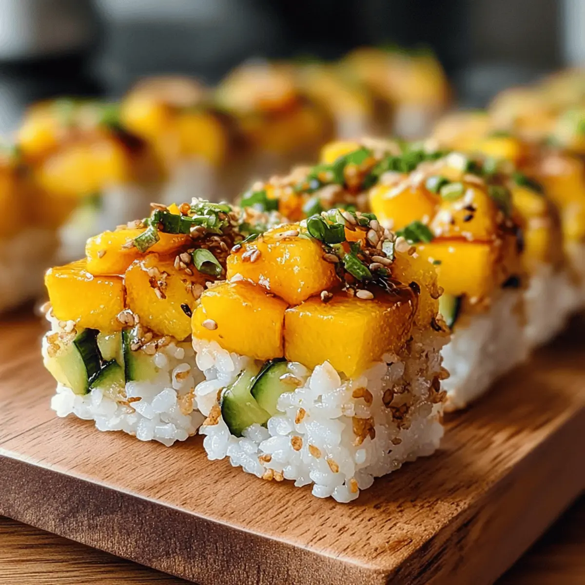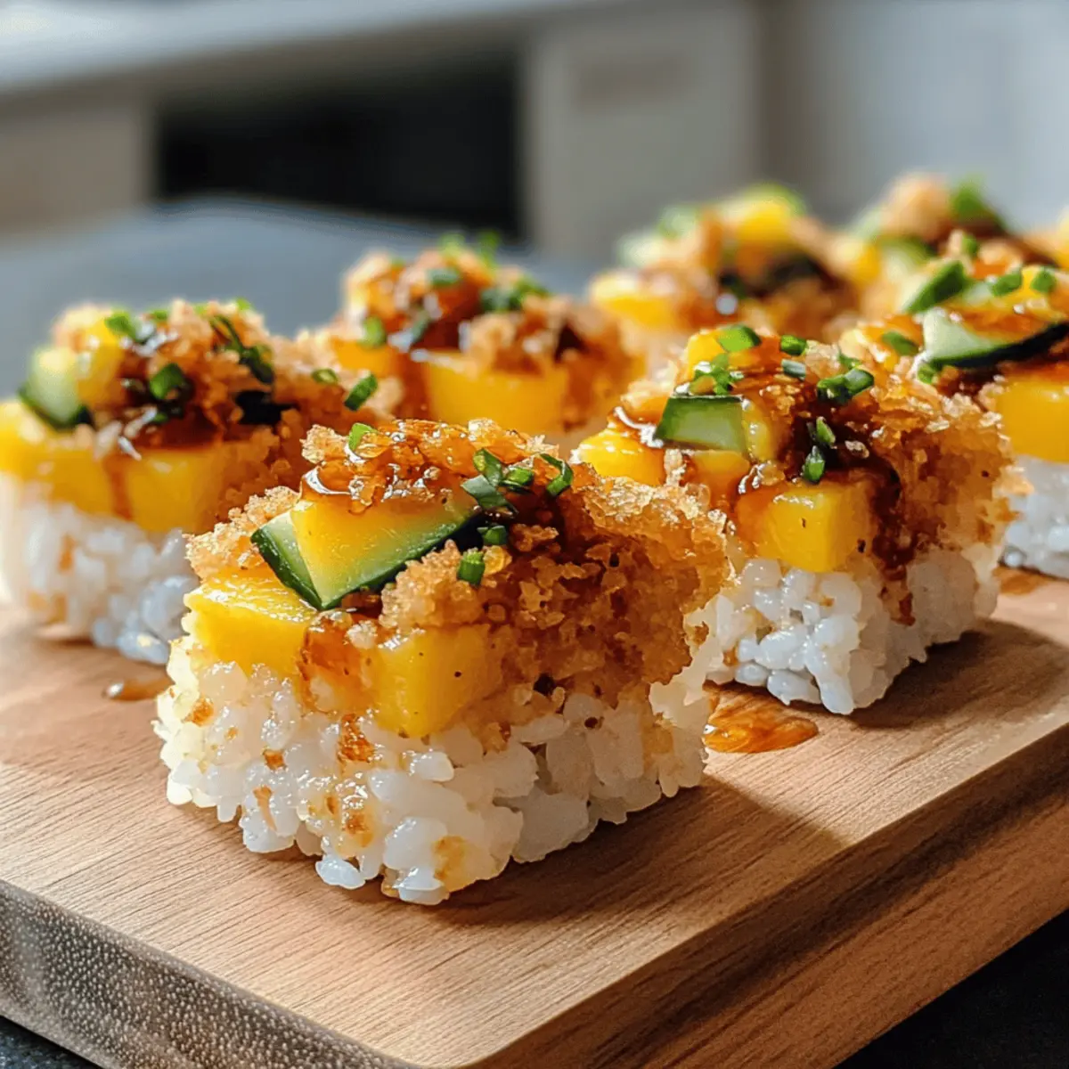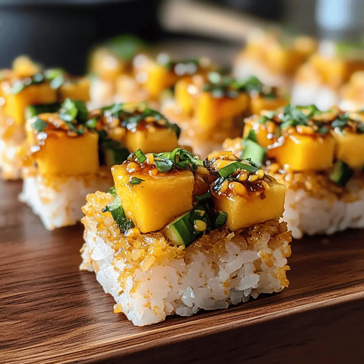 Während ich in der Küche stehe, um ein neues Gericht auszuprobieren, fängt mein Geist an, die Aromen und Texturen zu visualisieren, die ich kreieren möchte. Heute präsentiere ich euch meine aufregende Interpretation von Swicy Mango Crispy Rice Sushi – eine köstliche vegane Vorspeise, die jedem Essen einen fruchtigen und würzigen Akzent verleiht. Die perfekte Kombination aus knusprigem, luftgegartem Sushi-Reis und süßer, scharfer Mango-Tartare ist nicht nur einfach zuzubereiten, sondern auch ideal für gesellige Abende oder als leichtes Mittagessen. Und das Beste daran? Dieses Rezept überrascht nicht nur den Gaumen, sondern ist auch vielseitig genug für verschiedene Ernährungsanforderungen, sei es glutenfrei oder vegan. Neugierig, wie ihr diese bunten Sushi-Bisse selbst zubereiten könnt? Warum wirst du dieses Rezept lieben? Einfachheit: Die Zubereitung ist unkompliziert und benötigt nur grundlegende Kochkenntnisse. Jeder kann zum Küchenprofi werden! Fruchtiger Genuss: Die Mischung aus süßer Mango und würziger gochujang Mayo schafft einen aufregenden Geschmack, der begeistert. Vielfältige Variationen: Ob mit Avocado oder Ananas, die Anpassungsmöglichkeiten sind endlos – ideal für jeden Geschmack. Perfekte Texturen: Die Kombination aus knusprigem Reis und saftiger Füllung bringt ein aufregendes Mundgefühl. Gesunde Wahl: Dieses Rezept ist nicht nur lecker, sondern auch vegan und glutenfrei – perfekt für einen bewussten Genuss! Geselliges Kochen: Ideal für Partys oder ein leichtes Mittagessen, diese bunten Sushi-Bisse sind der Hit auf jeden Tisch! Zutaten für Swicy Mango Crispy Rice Sushi Für den Reis • Sushi-Reis – bildet die Basis und sorgt für die klebrige Textur; japanischer Rundkornreis hat die besten Ergebnisse. • Wasser – hydratisiert den Reis während des Kochens. • Reisessig – bringt Säure ins Spiel und balanciert die Aromen. • Zucker – verstärkt die Süße im Reis. • Salz – würzt und hebt den Gesamtgeschmack. Für die Füllung • Reife Mango – sorgt für tropische Süße und Frische; kann durch reife Avocado oder gewürfelte Ananas ersetzt werden. • Gurke – fügt Crunch hinzu; unbedingt die Kerne entfernen für eine bessere Textur. • Rote Zwiebel – sorgt für eine scharfe Note; fein gehackt, um andere Aromen nicht zu überdecken. • Limettensaft – hellt die Tartare auf und verbessert die Geschmackskomposition. • Sojasauce – unerlässlich für Umami; tamari ist eine glutenfreie Option. • Geröstetes Sesamöl – bringt nussige Tiefe in die Tartare. • Sesamkörner – für Garnierung und Textur. • Chiliflocken – optional für Schärfe; je nach Vorliebe anpassen. Für die Sauce • Vegane Mayonnaise – sorgt für die cremige Komponente in der Gochujang-Mayo; kann durch normale Mayo ersetzt werden. • Gochujang – koreanische Chilipaste, die für eine würzige Tiefe sorgt; darauf achten, dass sie glutenfrei ist. • Honig/Ahornsirup – süßt und balanciert die Schärfe des Gochujang. Für die Garnierung • Nori – für die Garnierung oder als Basis; fügt Geschmack und authentischen Sushi-Charme hinzu. • Geschnittene Frühlingszwiebeln – für Frische und Crunch in der Garnierung. Mit diesen Zutaten zauberst du die perfekten Swicy Mango Crispy Rice Sushi – ein köstliches, pflanzliches Erlebnis, das deine Geschmacksknospen verzaubert! Schritt-für-Schritt-Anleitungen für Swicy Mango Crispy Rice Sushi Step 1: Reis vorbereiten Spüle den Sushi-Reis gründlich, bis das Wasser klar ist, um überschüssige Stärke zu entfernen. Koche den Reis mit der entsprechenden Menge Wasser in einem Reiskocher oder einem Topf, bringe ihn zum Kochen und lasse ihn dann 10–12 Minuten köcheln. Decke den Reis ab und lasse ihn 10 Minuten ruhen, um die perfekte Konsistenz zu erreichen. Step 2: Reis würzen Vermische in einer kleinen Schüssel Reisessig, Zucker und Salz, bis sich alles aufgelöst hat. Füge diese Mischung vorsichtig zum gekochten Reis hinzu und falte sie sanft unter. Lasse den gewürzten Reis auf Zimmertemperatur abkühlen, damit er später besser formbar ist. Step 3: Forme und kühle den Reis Drücke den abgekühlten Reis gleichmäßig in eine 20×20 cm große Auflaufform. Die Schicht sollte fest und kompakt sein, damit die Sushi-Basis gut zusammenhält. Decke die Form mit Frischhaltefolie ab und stelle sie für mindestens 30 Minuten in den Kühlschrank. Der Reis sollte fest werden und gut halten. Step 4: Luftig frittieren Sobald der Reis fest ist, schneide ihn in rechteckige Stücke. Sprühe die Stücke leicht mit einem neutralen Ölspray ein. Heize die Airfryer auf 200°C vor und frittierte die Reiskstücke für 12–15 Minuten. Wende sie nach der Hälfte der Zeit, bis sie goldbraun und knusprig werden. Step 5: Tartare zubereiten In einer Schüssel mische gewürfelte Mango, Gurke, rote Zwiebel, Limettensaft, Sojasauce, geröstetes Sesamöl, Sesamkörner und nach Belieben Chiliflocken. Rühre alles gut um, bis die Zutaten gut vermischt sind. Diese fruchtige Tartare wird die Grundlage für dein Swicy Mango Crispy Rice Sushi. Step 6: Mayo vorbereiten Vermenge in einer kleinen Schüssel vegane Mayonnaise, Gochujang, Limettensaft und Honig oder Ahornsirup. Schlage die Mischung kräftig mit einem Schneebesen, bis sie glatt und cremig ist. Diese scharfe Sauce wird das Geschmackserlebnis deines Sushis perfekt abrunden. Step 7: Anrichten Nehme die knusprigen Reisstücke aus der Airfryer und platziere jeweils einen Löffel der Mango-Tartare darauf. Beträufle die Tartare mit der Gochujang-Mayo und garniere nach Belieben mit Nori, Sesamkörnern und geschnittenen Frühlingszwiebeln. Serviere die Sushi-Bisse sofort, um die perfekte Knusprigkeit zu genießen. Expertentipps für Swicy Mango Crispy Rice Sushi Reis richtig kochen: Achte darauf, den Sushi-Reis gründlich zu spülen und die richtige Wassermenge zu verwenden, damit er die perfekte Klebrigkeit erhält. Kühlen für Knusprigkeit: Lasse den Reis nach 
