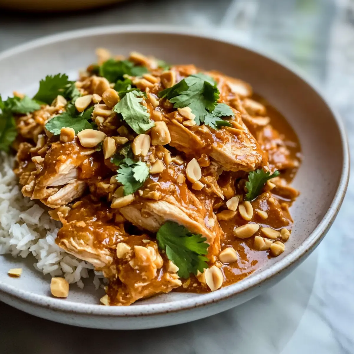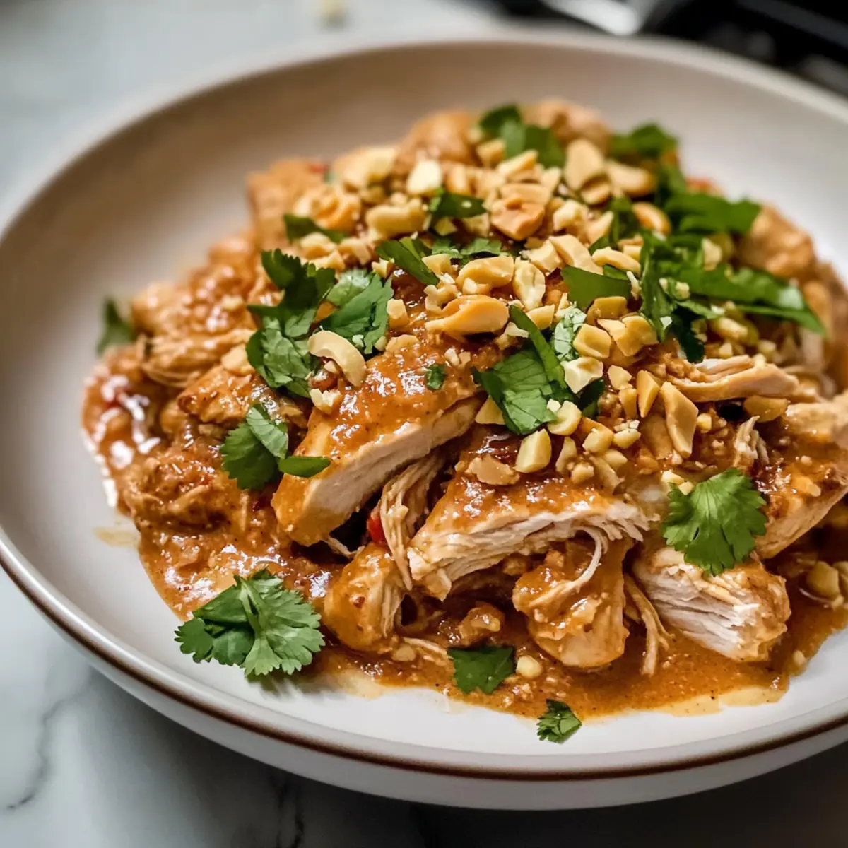 5. Das Thai Erdnuss-Hühnchen anrichten und nach Belieben mit gehackten Erdnüssen und frischem Koriander oder Frühlingszwiebeln garnieren.
