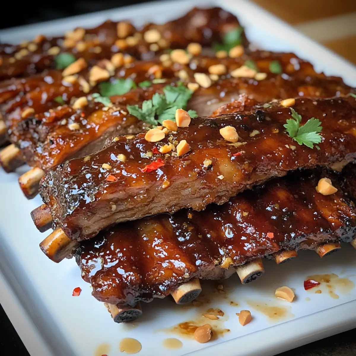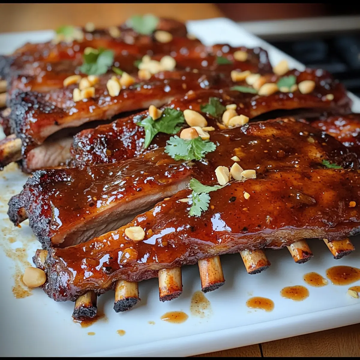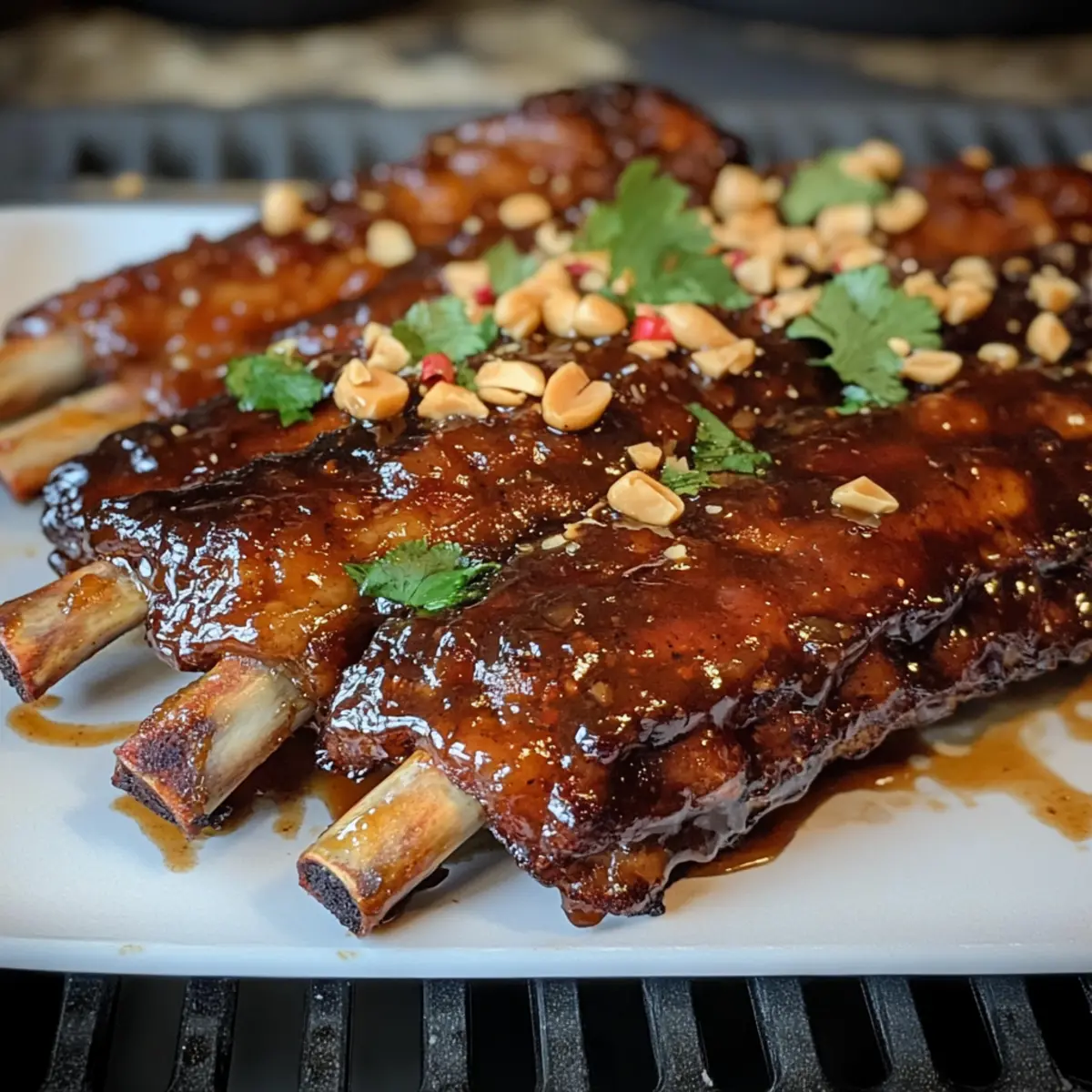 Als ich das erste Mal die Aromen der thailändischen Küche entdeckte, war ich sofort überwältigt von der Kombination aus Süße und Schärfe. Diese Phänomenalität in der Küche spiegelt sich perfekt in meinen Thailändischen Süß-Chili-Rippchen wider. Zart und saftig, überzogen mit einer köstlichen, klebrigen Glasur, sind sie nicht nur ein Genuss für den Gaumen, sondern auch die perfekte Wahl für ein unkompliziertes, wochentägliches Abendessen. Diese Rippchen sind leicht zuzubereiten und machen sich im Handumdrehen zur perfekten Mahlzeit für Familie und Freunde. Wer kann schon den verführerischen Aromen widerstehen? Kommt mit mir auf diese köstliche Reise und entdeckt, wie einfach es ist, ein Stück Thailand nach Hause zu bringen – hast du deine Löffel bereit? Warum lieben wir thailändische Süß-Chili-Rippchen? Einfachheit: Der gesamte Prozess ist so unkompliziert, dass selbst Kochanfänger mit Leichtigkeit mitmachen können. Aromenexplosion: Die Kombination aus süßer und scharfer Glasur bringt deinen Gaumen zum Tanzen und erweckt Erinnerungen an Thailand. Zartheit: Diese Rippchen sind so zart, dass sie direkt vom Knochen fallen – ein echter Genuss! Vielseitigkeit: Perfekt als Hauptgericht oder zu einem frischen Salat, sie ergänzen jede Mahlzeit. Familienfreundlich: Diese Rippchen sind ein Hit bei Jung und Alt und machen aus jedem Abendessen ein Fest. Nutze auch diese Tipps zur Zubereitung geschmackvoller Rippchen und entdecke die Freude am Kochen mit frischen Zutaten! Zutaten für thailändische Süß-Chili-Rippchen • Für die Rippchen: Baby back ribs – Hauptprotein; bietet reichhaltiges, zartes Fleisch. Spare Rippchen sind als Ersatz geeignet. Salz und Pfeffer – Gewürze; verstärken den Geschmack. Nach persönlichem Geschmack anpassen. • Für die Gewürzmischung: Knoblauchpulver – Geschmackskomponente; sorgt für Tiefe. Frischer Knoblauch kann auch verwendet werden. Zwiebelpulver – Geschmackskomponente; verleiht Süße. Frische Zwiebel ist aufgrund des Feuchtigkeitsgehalts nicht empfehlenswert. Räucherpulver – Fügt Rauchigkeit und Farbe hinzu. Normales Paprika kann für einen milderen Geschmack verwendet werden. • Für die Glasur: Thailändische Süß-Chili-Sauce – Hauptsauce; sorgt für Süße und Schärfe. Hoisin-Sauce kann für ein anderes Geschmacksprofil verwendet werden. Sojasauce – Fügt Salzigkeit und Umami hinzu; kann durch Tamari für eine glutenfreie Version ersetzt werden. Fischsauce – Essentiell für den authentischen Geschmack; kann für eine vegetarische Option weggelassen werden. Honig – Süßungsmittel; balanciert die Aromen. Ahornsirup kann als veganer Ersatz verwendet werden. Reisessig – Fügt Säure hinzu; kann durch Apfelessig ersetzt werden. Sriracha – Optional für zusätzliche Schärfe; kann nach Wunsch erhöht oder weggelassen werden. Knoblauch, gehackt – Frischer Geschmacksverstärker; für einen intensiveren Knoblauchgeschmack ggf. mehr verwenden. Ingwer, gerieben – Fügt Wärme und Würze hinzu; kann weggelassen werden, falls nicht verfügbar. Limonenschale und -saft – Macht die Aromen frischer; Zitrussaft kann durch Zitronensaft ersetzt werden. • Für die Garnitur: Gehackte geröstete Erdnüsse – Garnitur; sorgt für Knusprigkeit. Kann durch Sesamsamen für eine nussfreie Option ersetzt werden. Frischer Koriander, gehackt – Kräuter-Garnitur; kann für einen anderen Geschmack durch Petersilie ersetzt werden. Rote Chilischote oder Fresno-Pfeffer, gewürfelt – Optionale Garnitur; sorgt für Farbe und Schärfe. Paprika kann für einen milderen Geschmack verwendet werden. Limettenviertel – Zum Servieren; hebt die Frische des Gerichts hervor. Erlebe die köstlichen Aromen dieser thailändischen Süß-Chili-Rippchen und bringe ein Stück Thailand in deine Küche! Schritt-für-Schritt-Anleitung für Thailändische Süß-Chili-Rippchen Step 1: Rippchen vorbereiten Die Baby back Rippchen sorgfältig bearbeiten, indem du die Silberhaut entfernst und die Rippchen trocken tupfst. Mit Salz, Pfeffer, Knoblauchpulver, Zwiebelpulver und Räucherpulver gleichmäßig würzen. Lass die Rippchen für mindestens 30 Minuten ruhen, damit die Gewürze gut einziehen können. Bereite währenddessen das Backblech und Folie vor. Step 2: Langsam backen Heize den Ofen auf 150°C vor. Wickel die Rippchen in Folie und lege sie auf das Backblech. Backe die Rippchen für etwa 2½ Stunden, bis sie zart sind, aber noch zusammenhalten. Achte darauf, dass die Folie fest verschlossen ist, damit der Dampf die Rippchen schön saftig hält. Step 3: Die Glasur zubereiten In einem kleinen Topf die thailändische Süß-Chili-Sauce, Sojasauce, Fischsauce, Honig, Reisessig, Sriracha, gehackten Knoblauch, geriebenen Ingwer, Limonenschale und -saft vermengen. Die Mischung zum Kochen bringen und 5-7 Minuten bei mittlerer Hitze einkochen lassen, bis sie eindickt und glänzend wird. Diese Glasur verleiht den Thailändischen Süß-Chili-Rippchen eine köstliche Süße und Schärfe. Step 4: Glasieren und überbacken Entpacke die Rippchen aus der Folie und lege sie auf ein Backblech. Bestreiche sie großzügig mit der Glasur und stelle den Ofen auf Grillfunktion. Broil die Rippchen für 3-5 Minuten, bis die Glasur karamellisiert und sprudelt. Achte darauf, die Rippchen dabei gut im Auge zu behalten, um ein Verbrennen zu vermeiden. Step 5: Garnieren und servieren Nehme die Rippchen aus dem Ofen und lass sie kurz ruhen. Bestreue sie mit gehackten Erdnüssen, frischem Koriander und gewürfeltem Chili für einen zusätzlichen Farbtupfer und etwas Schärfe. Serviere die Thailändischen Süß-Chili-Rippchen mit Limettenvierteln, die beim Servieren über die Rippchen gedrückt werden können, um die Aromen zu intensivieren. Vorbereitung der thailändischen Süß-Chili-Rippchen für stressfreie Abende Diese thailändischen Süß-Chili-Rippchen sind perfekt für die Vorbereitung im Voraus, was dir an hektischen Wochentagen Zeit spart! Du kannst die R
