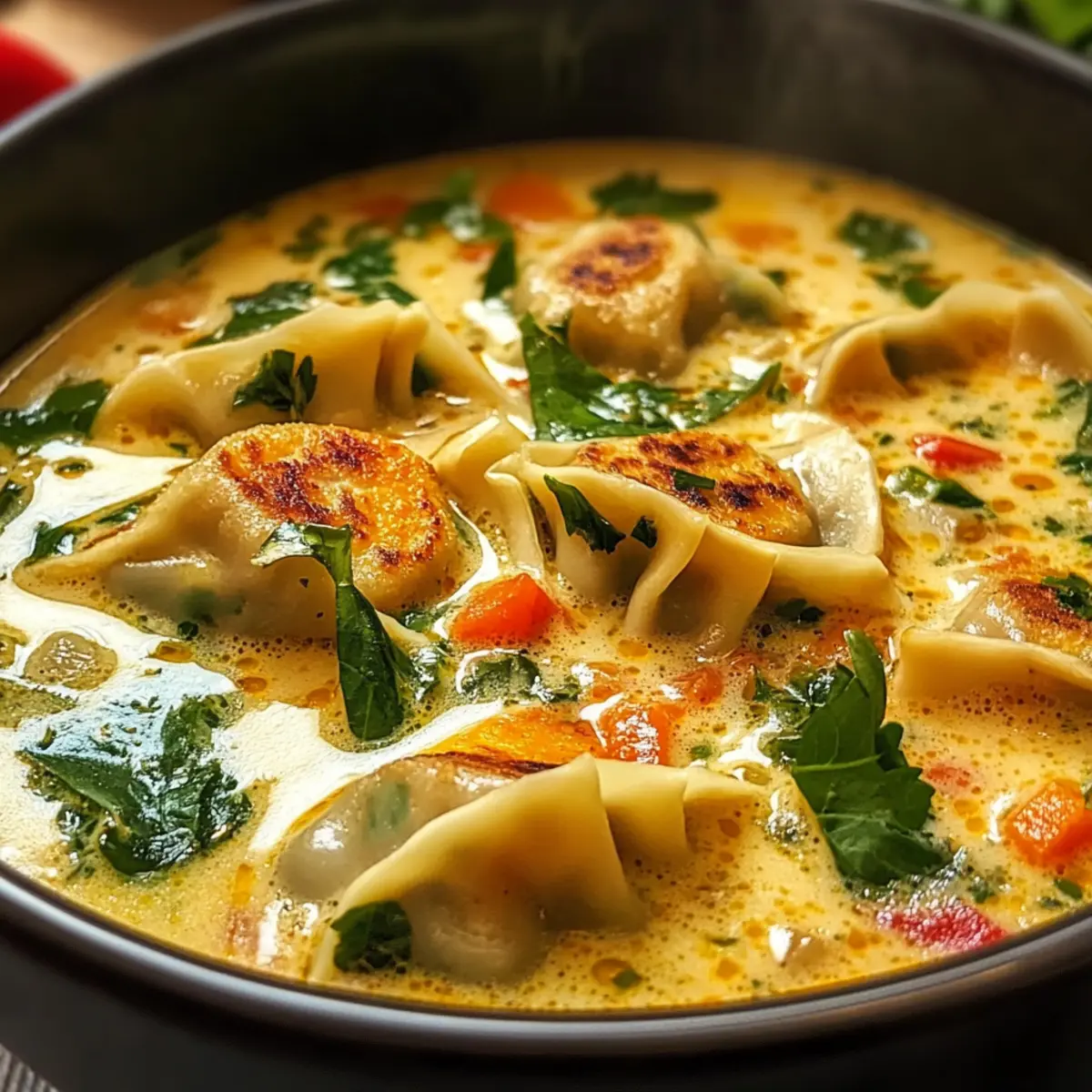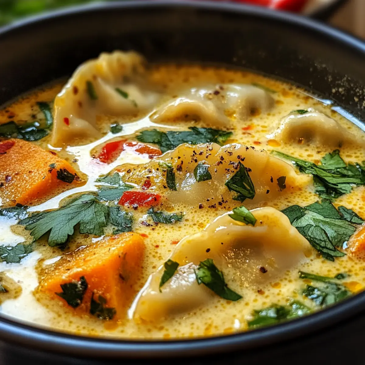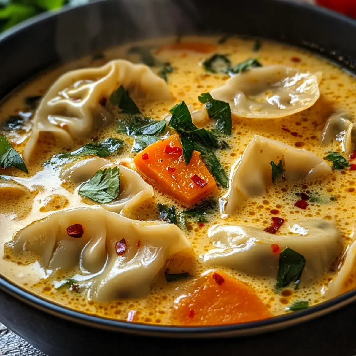 Wenn ich an den letzten kalten Abend denke, erinnere ich mich an den verlockenden Duft, der durch meine Küche zog, während ich die Thailändische Teigtaschen-Kokosnuss-Suppe zubereitete. Diese unglaubliche Suppe kombiniert herzliche, gefüllte Teigtaschen mit knackigen Paprika und süßen Kartoffeln in einer reichhaltigen Kokosmilch-Basis, die mit mildem roten Currypaste verfeinert wird. Was diese Suppe zu einem absoluten Favoriten macht, sind nicht nur die schnellen Zubereitungszeiten, sondern auch die Vielseitigkeit der Zutaten – egal ob für Vegetarier oder Fleischliebhaber, hier ist für jeden etwas dabei. Während die Aromen harmonisch miteinander verschmelzen, schaffe ich mir nicht nur ein schnelles Abendessen, sondern auch ein Gefühl von wohltuender Geborgenheit. Neugierig auf mein Geheimnis, um diese Geschmacksexplosion zu erreichen? Lass uns gemeinsam kochen! Warum ist diese Suppe so besonders? Vielseitigkeit: Diese thailändische Teigtaschen-Kokosnuss-Suppe ist für alle Geschmäcker geeignet. Egal ob mit fleischgefüllten oder vegetarischen Teigtaschen, die Auswahl ist riesig! Schnelle Zubereitung: In weniger als 30 Minuten steht ein köstliches Gericht auf dem Tisch. Perfekt für hektische Abende! Wohltuende Aromen: Die Kombination aus Kokosmilch und rotem Curry sorgt für ein unvergleichliches Geschmackserlebnis, das nach Urlaub schmeckt. Gesund und Nahrhaft: Mit frischem Gemüse ist diese Suppe eine geschmackvolle Möglichkeit, Vitamine zu genießen. Einfache Anpassungen: Verändere die Zutaten je nach Saison oder Vorlieben. Verwendest du zum Beispiel Kabocha, machst du es zu einem besonderen Genuss! Erlebe einfach die Vielfalt, indem du deine Lieblingsgemüsesorten aus dem Kühlschrank verwendest und so deine ganz persönliche Note in dieses Rezept zauberst! Thailändische Teigtaschen-Kokosnuss-Suppe Zutaten Hinweis: Diese Zutatenliste umfasst alles, was du für die Zubereitung der köstlichen thailändischen Teigtaschen-Kokosnuss-Suppe benötigst. Für die Suppe Olivenöl – sorgt für Geschmack beim Sautéen; alternativ kann auch Pflanzenöl verwendet werden. Knoblauch (2 Zehen, gehackt) – bringt eine aromatische Tiefe ins Gericht; frischer Knoblauch ist die beste Wahl. Zwiebel (1 mittelgroß, gewürfelt) – fügt Süße und Basisgeschmack hinzu; Schalotten können ersetzt werden. Rote Paprika (1, gewürfelt) – sorgt für Süße und Farbe; jede süße Paprika kann an ihrer Stelle verwendet werden. Süßkartoffel (1 medium, geschrubbt und gewürfelt) – bietet Cremigkeit und Nährstoffe; Butternusskürbis oder Karotten sind ebenfalls akzeptable Alternativen. Rote Currypaste (2 Esslöffel) – bringt milde bis moderate Schärfe und Tiefe; passe die Menge nach persönlichem Schärfewunsch an. Kokosmilch (1 Dose, 400 ml) – sorgt für eine cremige Textur; suche nach ungesüßten Varianten oder verwende Mandel- oder Cashewmilch für eine milchfreie Option. Gemüsebrühe (4 Tassen) – bildet die Basis der Suppe; Hühnerbrühe sorgt für einen herzhaften Geschmack, Wasser kann in der Not verwendet werden. Teigtaschen (1 Paket, 370 g) – Hauptbestandteil; wähle zwischen fleischgefüllten oder vegetarischen Teigtaschen; achte auf glutenfreie Optionen, wenn nötig. Frischer Spinat (2 große Tassen) – fügt Nährstoffe und Farbe hinzu; Alternativen sind Babygrün oder Napa-Kohl. Limonensaft (Saft von 1 Limette) – hebt den Geschmack mit seiner Spritzigkeit; verwende Zitronensaft, falls keine Limette verfügbar ist. Frischer Koriander (zum Garnieren) – sorgt für einen frischen, herzhaften Abschluss; kann durch Frühlingszwiebeln oder Petersilie ersetzt werden. Erlebe die Aromen der thailändischen Teigtaschen-Kokosnuss-Suppe und lasse dich von ihrer Vielseitigkeit begeistern! Schritt-für-Schritt-Anleitung für die Thailändische Teigtaschen-Kokosnuss-Suppe Step 1: Gemüse anbraten Erhitze in einem großen Suppentopf das Olivenöl bei mittlerer bis hoher Hitze. Füge den gehackten Knoblauch, die gewürfelte Zwiebel, die rote Paprika und die geschälte sowie gewürfelte Süßkartoffel hinzu. Brate diese Mischung für 3–4 Minuten, bis das Gemüse leicht weich und duftend ist. Step 2: Currypaste hinzufügen Rühre die rote Currypaste in das angebratene Gemüse ein und koche alles für etwa 1 Minute weiter, bis sich die Aromen entfalten und die Mischung duftet. Achte darauf, die Paste gut im Gemüse zu verteilen, um einen gleichmäßigen Geschmack für die Thailändische Teigtaschen-Kokosnuss-Suppe zu gewährleisten. Step 3: Brühe und Kokosmilch einrühren Gib nun die Kokosmilch und die Gemüsebrühe in den Topf. Verrühre alles gut mit einem Schneebesen, bis die Mischung glatt ist. Bringe die Suppe zum Kochen und beobachte, wie sie leicht zu blubbern beginnt, bevor du mit dem nächsten Schritt fortfährst. Step 4: Teigtaschen hinzufügen Sobald die Suppe kocht, füge die Teigtaschen – sei es die vegetarische oder fleischgefüllte Variante – hinzu. Reduziere die Hitze auf mittlere Stufe und lasse alles für 6–8 Minuten sanft köcheln, bis die Suppe leicht eindickt und die Teigtaschen durchgegart sind. Halte dabei regelmäßig ein Auge auf den Kochprozess. Step 5: Spinat und Limette einrühren Füge den frischen Spinat und den Limettensaft in die Suppe ein und koche alles für weitere 1–2 Minuten, bis der Spinat zusammengefallen ist und lebendig grün aussieht. Diese frischen Zutaten verleihen der Thailändischen Teigtaschen-Kokosnuss-Suppe nicht nur Geschmack, sondern auch Nährstoffe. Step 6: Servieren und Garnieren Sobald der Spinat gewelkt ist, nimm die Suppe vom Herd. Schöpfe die köstliche Mischung in Schalen und garniere jede Portion mit frischem Koriander. Serviere die Thailändische Teigtaschen-Kokosnuss-Suppe sofort heiß und genieße diesen aromatischen Schalenfüller! Perfekte Vorbereitung für die Thailändische Teigtaschen-Kokosnuss-Suppe Diese Thailändische Teigtaschen-Kokosnuss-Suppe ist ideal für die Vorbereitung, besonders an hektisch