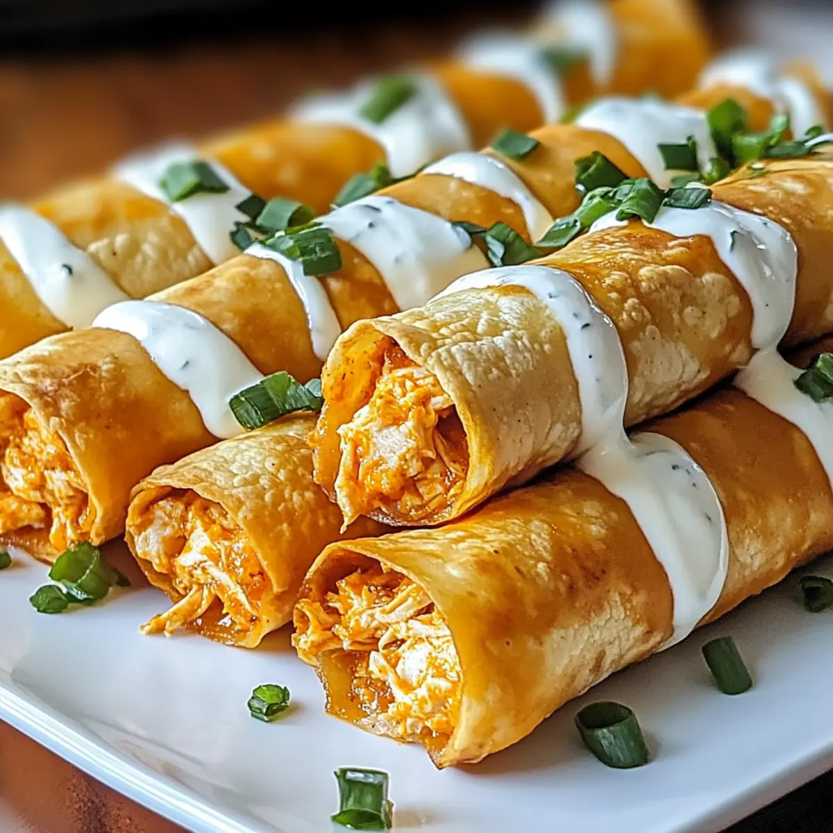 Würzige Knusprigkeit: Mit einer knusprigen Außenschicht und einem feurigen, cremigen Inneren sind diese überbackenen Buffalo-Hühnchen-Taquitos ein geschmackliches Highlight.