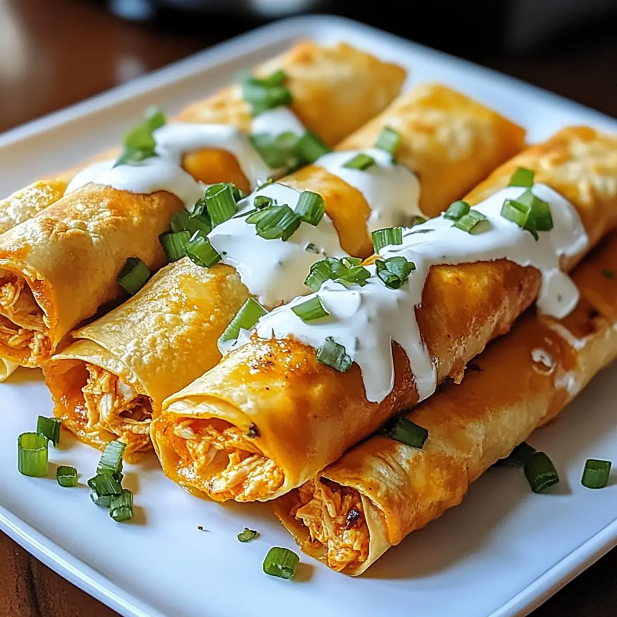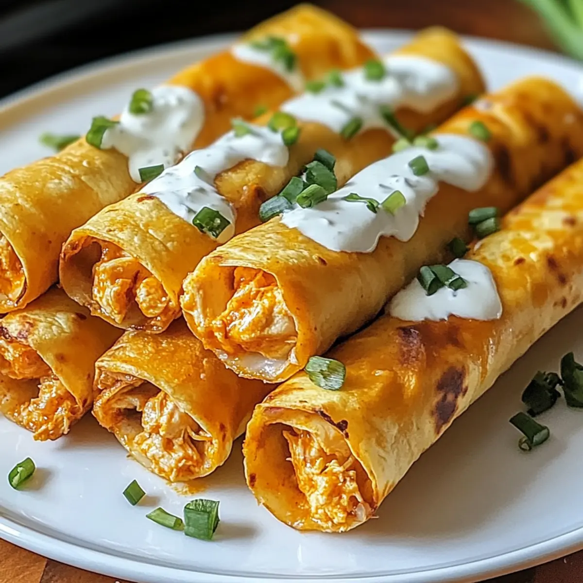 5. Nehme die Überbackenen Buffalo-Hühnchen-Taquitos aus dem Ofen und lasse sie kurz abkühlen. Bestreue sie mit chopped Frühlingszwiebeln für eine frische Note und serviere sie zusammen mit Sauerrahm als Dip.