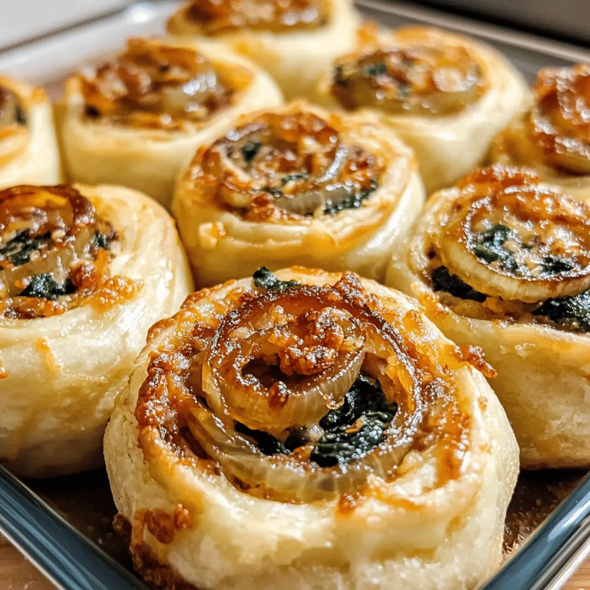 1. Bestäube eine Arbeitsfläche mit Mehl und rolle den Teig gleichmäßig zu einem Rechteck aus. Verteile Marinara-Sauce auf dem Teig, gefolgt von der Füllung mit Zwiebeln und Spinat. Rolle den Teig auf und schneide die Rolle in gleichmäßige Stücke.