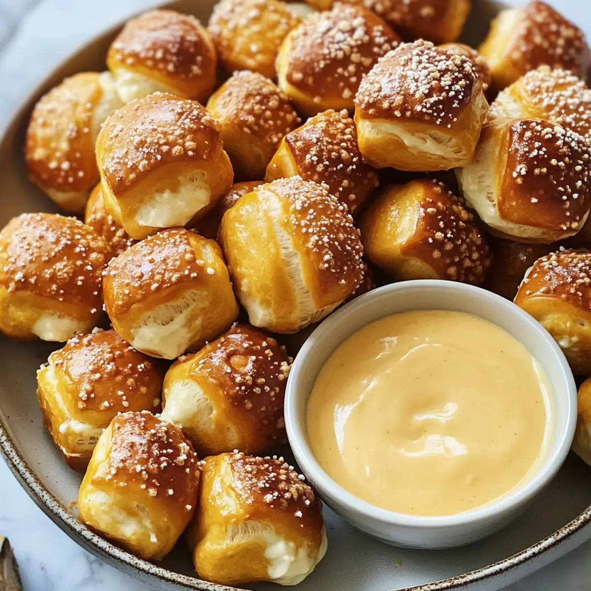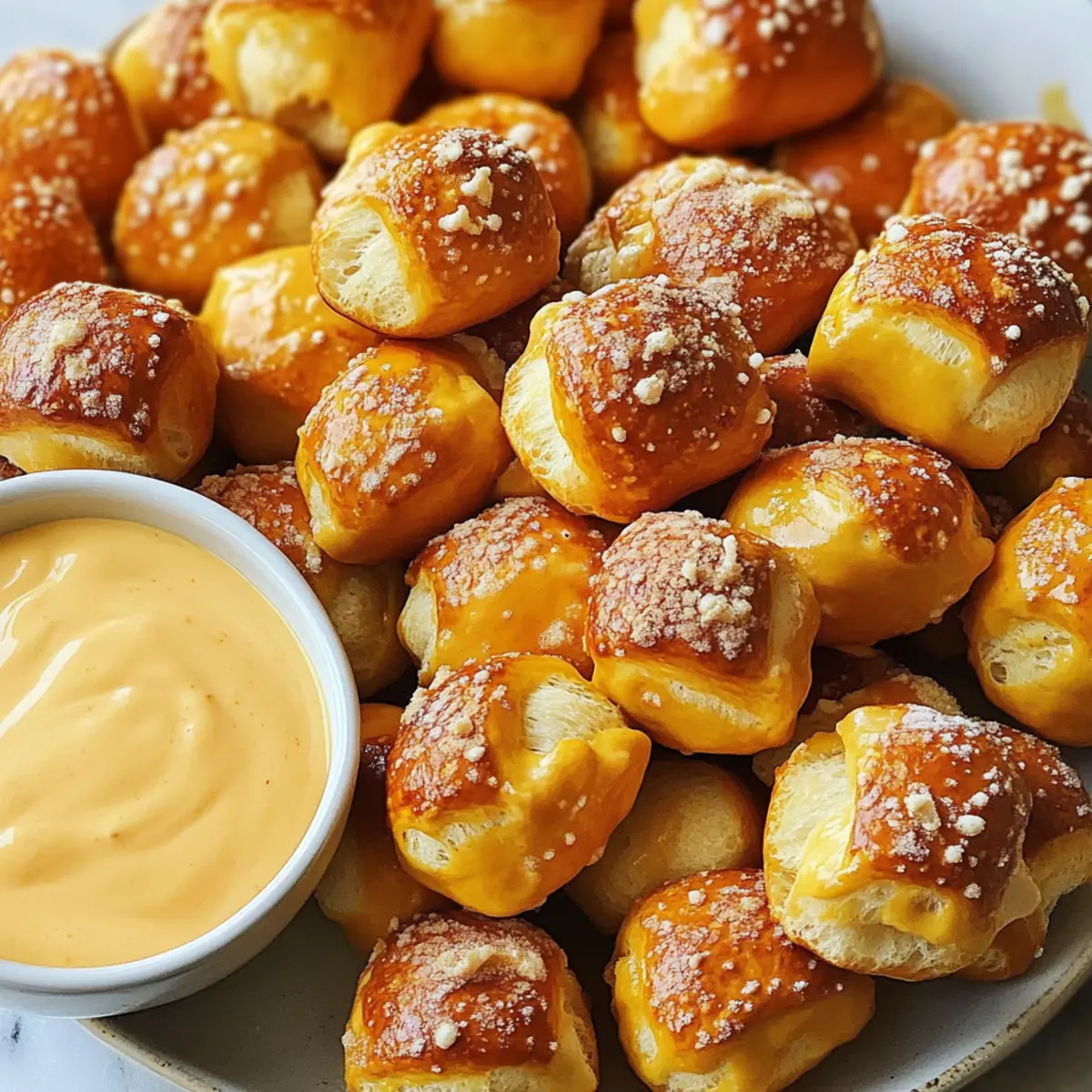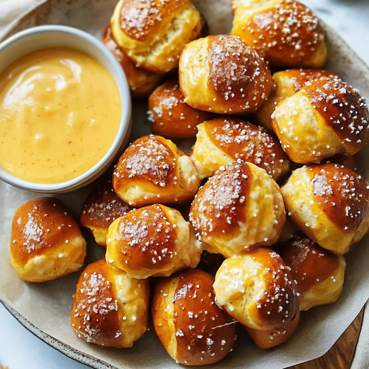 “Es war einmal ein Sonntag, an dem ich spontan entschieden habe, meine Freunde zu einem Spielabend einzuladen. Die Nervosität überkam mich – was könnte ich nur servieren, das alle lieben würden? Dann kam mir der Gedanke: Weiche Brezelstücke! Diese kleinen, geselligen Snacks sind einfach unwiderstehlich und wecken Erinnerungen an warme, mallig verspeiste Brezeln. Sie sind nicht nur ein Hit bei jedem Anlass, sondern auch blitzschnell zubereitet und perfekt für gesellige Runden. Mit ihrem herzhaften Geschmack und der Möglichkeit, sie mit einem reichhaltigen Bierkäse-Dip zu kombinieren, sind diese Brezelstücke einfach ein Muss für jedes Treffen. Bist du bereit, diese unwiderstehlichen, flauschigen Köstlichkeiten selbst zu schaffen?” Warum könnte man diese Brezelstücke lieben? Einfachheit: Diese Weichen Brezelstücke sind unkompliziert zubereitet und erfordern keine besonderen Fähigkeiten – jeder kann sie meistern! Herzhafter Genuss: Mit ihrer goldbraunen Kruste und dem weichen Inneren versetzen sie dich direkt in die Brezelbude deiner Kindheit. Geselligkeit: Ideal für Spielabende oder Partys, diese Snacks bringen Freunde zusammen und sorgen für gute Stimmung. Vielseitig: Ob mit Bierkäse-Dip oder senf – du kannst deine eigenen Kombinationen kreieren und variieren. Und wenn du eine süße Note willst, probiere sie mit Zimt-Zucker! Für noch mehr Snack-Ideen, schau dir unsere Mediterrane Inspirierte Vorspeisen an. Zeitersparnis: In nur 30 Minuten hast du köstliche Brezelstücke auf dem Tisch, die alle begeistern werden! Weiche Brezelstücke Zutaten Für den Teig Instanthefe – sorgt für eine fluffige Konsistenz der Brezelstücke; du kannst sie auch durch aktive Trockenhefe im 1:1 Verhältnis ersetzen, aber erwarte eine längere Gärzeit von 15-20 Minuten. Hellbrauner Zucker – verleiht eine angenehme Süße und fördert die Bräunung; ersetzbar durch normalen Zucker, wenn nötig. Warmes Wasser (ca. 43°C) – aktiviert die Hefe; achte darauf, dass das Wasser nicht zu heiß ist, um die Hefe nicht abzutöten. Abgekühlte, geschmolzene Butter (oder neutrales Öl) – sorgt für Feuchtigkeit und Reichhaltigkeit; jedes neutrale Öl ist hier geeignet. Feines Meersalz – verstärkt den Geschmack der Brezelstücke; kleinste Mengen von Tafelsalz sind als Ersatz möglich, vermeide jedoch große Kristalle wie grobes Meersalz direkt. Allzweckmehl – gibt den Brezelstücken Struktur. Natron – wird im Kochbad verwendet, um der Brezelkruste den typischen Geschmack zu verleihen; nicht durch Backpulver ersetzbar. Wasser (für das Natronbad) – benötigt, um die Badlösung herzustellen. Großes Ei – dient als Ei-Wäsche, damit das Salz haftet und die Farbe verstärkt wird; kann weggelassen werden, wenn du eine eifreie Variante möchtest, beeinflusst aber die Farbe. Brezelsalz (oder grobes Meersalz) – wird zum Bestreuen verwendet und gibt zusätzlichen Geschmack; grobes Meersalz kann im Ersatz verwendet werden. Für deine nächste gesellige Runde sind diese weichen Brezelstücke einfach perfekt! Schritt-für-Schritt-Anleitung für Weiche Brezelstücke Step 1: Hefe aktivieren In einer Schüssel warmes Wasser (ca. 43°C) mit hellbraunem Zucker und Instanthefe vermengen. Rühre die Mischung leicht um, und lasse sie für etwa 5 Minuten stehen, bis sie schaumig und blubbern wird. Dies zeigt an, dass die Hefe aktiv ist und bereit ist, für fluffige Weiche Brezelstücke zu sorgen. Step 2: Teig zubereiten Füge die abgekühlte, geschmolzene Butter und das feine Meersalz zur Hefemischung hinzu. Rühre alles gut um, bis die Zutaten gut vermischt sind. Schütte nach und nach das Allzweckmehl dazu, während du weiter rührst, bis ein grober Teig entsteht. Dies wird die Grundlage für deine köstlichen Brezelstücke. Step 3: Teig kneten Bestäube eine saubere Arbeitsfläche leicht mit Mehl und stürze den Teig darauf. Beginne, den Teig etwa 5-7 Minuten lang kräftig zu kneten, bis er glatt und elastisch ist. Wenn der Teig zu klebrig ist, kannst du nach Bedarf etwas mehr Mehl hinzufügen. Der gut geknetete Teig wird die Grundlage für die weich und fluffig gebackenen Brezelstücke. Step 4: Teig gehen lassen Lege den gekneteten Teig in eine leicht geölte Schüssel und decke ihn mit einem sauberen Geschirrtuch ab. Lass ihn an einem warmen Ort für etwa 1 Stunde ruhen, bis er sich in der Größe verdoppelt hat. Dies sichert ein perfektes Aufgehen und macht deine Weichen Brezelstücke schön luftig. Step 5: Backofen vorheizen Heize deinen Backofen auf 220°C vor und bereite das Natronbad vor, indem du in einem großen Topf Wasser zum Kochen bringst und das Natron hinzufügst. Achte darauf, dass das Wasser sprudelnd kocht, um die richtige Konsistenz für die Brezelkruste zu erzielen. Dies wird entscheidend für den unverwechselbaren Geschmack deiner Brezelstücke sein. Step 6: Brezelstücke formen Teile den gegangenen Teig in kleine Portionen und forme jede Portion zu einem etwa 3-4 cm großen Stück. Rolle die Stücke zu kleinen, gleichmäßigen Bällchen. Diese Bällchen werden die weichen Brezelstücke, die du für dein Spiel oder deine gesellige Runde zubereitest. Step 7: Brezelstücke kochen Vermenge die geformten Stücke im sprudelnden Natronbad und koche sie für etwa 30 Sekunden. Dies verleiht den Brezelstücken den klassischen Biss und die charakteristische Kruste. Achte darauf, die Stücke nicht zu lange im Wasser zu lassen, damit sie ihre Form behalten. Step 8: Brezelstücke backen Nimm die gekochten Brezelstücke vorsichtig aus dem Wasser und lege sie auf ein mit Backpapier ausgelegtes Backblech. Bestreiche sie mit einer Ei-Wäsche und bestreue sie großzügig mit Brezelsalz. Backe die Brezelstücke im vorgeheizten Ofen für 12-15 Minuten oder bis sie goldbraun sind. Lass sie etwas abkühlen, bevor du sie servierst. Lagerungstipps für Weiche Brezelstücke Raumtemperatur: Bewahre die abgekühlten Weichen Brezelstücke in einem luftdichten Behälter bei Raumtemperatur für bis zu 