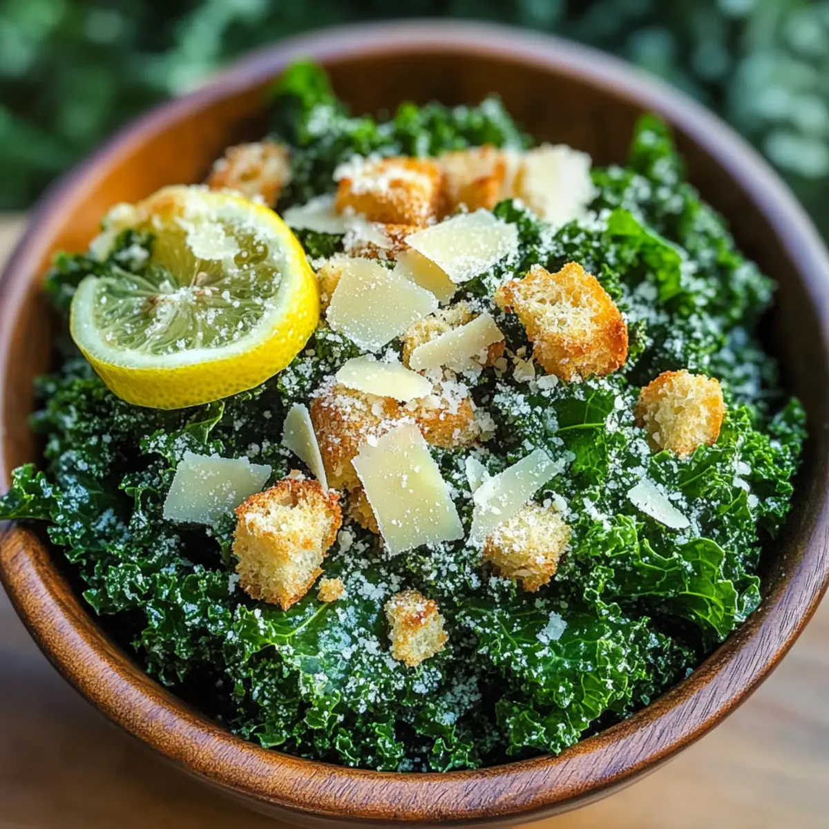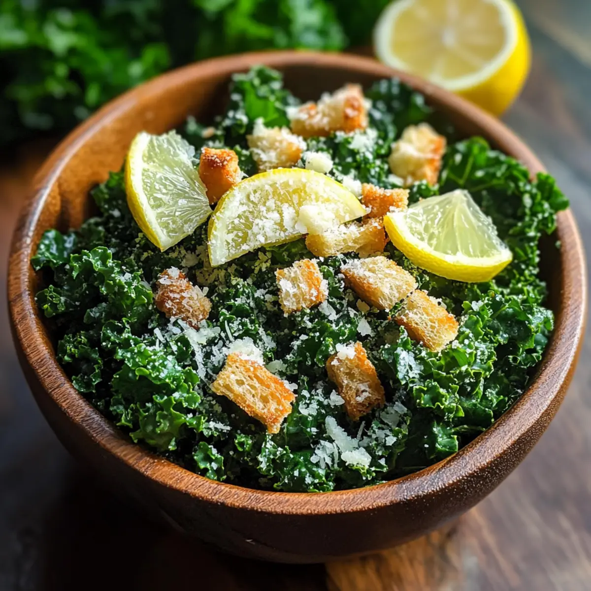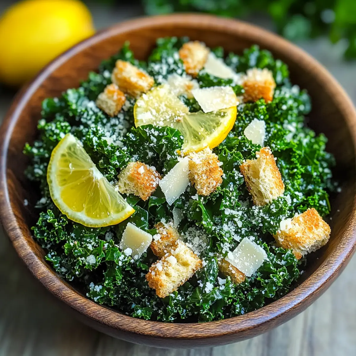 Während ich zwischen meinen Küchenschränken stöberte, fiel mir ein frischer Kopf Grünkohl in die Hände, der nur darauf wartete, ein star des Gerichts zu werden. Der Zitronen-Parmesan-Grünkohlsalat ist nicht nur das perfekte Rezept für alle, die schnell und gesund essen möchten, sondern auch ein geschmackliches Erlebnis, das selbst an hektischen Tagen zu einem Highlight wird. In nur 15 Minuten zaubert man eine frische und nahrhafte Mahlzeit, die sowohl für Freunde als auch für die Familie ein Genuss ist. Kombiniert mit den würzigen Noten von Parmesan und einem kräftigen Spritzer Zitrone, ist dieser Salat eine genussvolle Ergänzung für jede Tafel. Neugierig, wie einfach es ist, mit ein paar Zutaten so viel Geschmack zu kreieren? Warum ist dieser Salat so besonders? Frische Zutaten: Der Zitronen-Parmesan-Grünkohlsalat vereint knackigen Grünkohl mit zesty Zitrone, was ihm eine erfrischende Note verleiht. Dieser Salat ist ideal, um schnell eine gesunde Wahl zu treffen! Einfachheit: In nur 15 Minuten zubereiten, ist er perfekt für stressige Wochentage. Vielfältige Variationen: Fügen Sie Nüsse oder getrocknete Früchte hinzu, um den Geschmack zu variieren und das Rezept an Ihre Vorlieben anzupassen. Schmackhafte Balance: Die Kombination aus salzigem Parmesan und cremigem Olivenöl sorgt für einen harmonischen Geschmack, der Ihre Sinne begeistert. Direkt servierbar: Am besten sofort genießen, damit die Textur der Croutons und der Grünkohl frisch bleibt. Dieser Salat wird sicher zum Hit auf jedem Tisch! Zutaten für Zitronen-Parmesan-Grünkohlsalat • Frisch und knackig, dieser Salat benötigt nur eine Handvoll Zutaten, um Ihnen ein Geschmackserlebnis zu bieten. Für den Salat Grünkohl – bildet die nahrhafte Basis und sollte frisch und leuchtend grün sein für den besten Geschmack. Frischer Zitronensaft – bringt eine erfrischende Säure, die die Aromen des Salates hebt. Extra Vergine Olivenöl – fügt Cremigkeit hinzu und hilft, den Grünkohl zu zartem Genuss zu machen. Frischer gehackter Knoblauch – sorgt für einen intensiven Geschmack, der das Gericht aufwertet. Salz – balanciert die Aromen und hebt die Frische des Grünkohls hervor. Schwarzer Pfeffer – bringt eine subtile Wärme, die die Zitrone wunderbar ergänzt. Für die Garnitur Croutons – verleihen eine knusprige Textur; verwenden Sie frisch zubereitete für den besten Crunch. Frisch geriebener Parmesan – bringt eine nussige, salzige Note, die den Salat vollendet. Genießen Sie diesen Zitronen-Parmesan-Grünkohlsalat! Schritt-für-Schritt-Anleitung für Zitronen-Parmesan-Grünkohlsalat Step 1: Grünkohl vorbereiten Waschen Sie 4 Tassen frischen Grünkohl gründlich unter fließendem Wasser, um Schmutz zu entfernen. Trocknen Sie die Blätter mit einem Küchentuch oder einer Salatschleuder. Entfernen Sie die harten Stiele und schneiden Sie die Blätter in feine Streifen. Diese vorbereiteten Grünkohlblätter bilden die nahrhafte Basis für Ihren Zitronen-Parmesan-Grünkohlsalat. Step 2: Grünkohl schneiden Geben Sie die fein geschnittenen Grünkohlblätter in eine große Salatschüssel. Achten Sie darauf, dass die Blätter locker und nicht zu fest gepackt sind. Dies ermöglicht eine gleichmäßige Verteilung des Dressings später. Die frische, grüne Farbe des Grünkohls sollte leuchtend und knackig erscheinen, was auf die Qualität der Zutaten hinweist. Step 3: Dressing anrühren In einer kleinen Schüssel vermengen Sie 2 Esslöffel frischen Zitronensaft, 2 Esslöffel extra vergine Olivenöl, ¼ Teelöffel gehackten Knoblauch, ¼ Teelöffel Salz und ⅛ Teelöffel schwarzen Pfeffer. Whisk die Zutaten kräftig, bis eine homogene Mischung entsteht, die eine glatte, cremige Konsistenz hat. Das Dressing sollte frisch duften und einen zesty Kick haben, ideal für Ihren Zitronen-Parmesan-Grünkohlsalat. Step 4: Grünkohl massieren Gießen Sie einen kleinen Teil des Dressings über die Grünkohlblätter und massieren Sie es sanft mit Ihren Händen ein. Dabei sollten die Blätter für etwa 1-2 Minuten kräftig geknetet werden, bis sie dunkler und zarter erscheinen. Diese Massage hilft dabei, den Geschmack des Dressings besser aufzunehmen und die Textur des Grünkohls zu verbessern. Step 5: Dressing hinzufügen Fügen Sie das restliche Dressing zu den Grünkohlblättern hinzu und vermengen Sie alles gut, sodass die Blätter gleichmäßig mit Dressing überzogen sind. Achten Sie darauf, dass es keine trockenen Stellen gibt; jede Grünkohlzeile sollte glänzend und appetitlich aussehen. Dies ist der entscheidende Moment für den vollmundigen Geschmack Ihres Zitronen-Parmesan-Grünkohlsalats. Step 6: Parmesan und Croutons hinzufügen Streuen Sie ¼ Tasse frisch geriebenen Parmesan über die massierten Grünkohlblätter und heben Sie ihn vorsichtig unter. Dieser Schritt gibt eine nussige, salzige Tiefe zur gesamten Mischung. Zerdrücken Sie ½ Tasse Croutons in kleine Stücke und streuen Sie die Crunchy-Stücke auf den Salat. Diese Schicht sorgt für einen aufregenden Texturkontrast. Step 7: Servieren und genießen Servieren Sie den Zitronen-Parmesan-Grünkohlsalat sofort, damit die Frische der Zutaten und der Crunch der Croutons optimal zur Geltung kommen. Achten Sie darauf, eine schöne Portion auf die Teller zu geben, und erfreuen Sie sich an der leuchtenden Farbenvielfalt. Dieser Salat ist nicht nur gesund, sondern auch ein echter Genuss auf jedem Tisch! Experten Tipps für Zitronen-Parmesan-Grünkohlsalat Kale Massieren: Massieren Sie den Grünkohl gut, um seine Textur zu verbessern und den Geschmack des Dressings optimal aufzunehmen. Dressingsparsamkeit: Beginnen Sie mit einer kleinen Menge Dressing; Sie können immer mehr hinzufügen, aber zu viel macht den Salat matschig. Glutenfreie Variante: Ersetzen Sie die Croutons durch Nüsse oder Samen für eine knusprige, glutenfreie Option. Frische Zutaten: Verwenden Sie immer frische Zutaten; welker Grünkohl oder alte Croutons beeinträchtigen den Geschmack