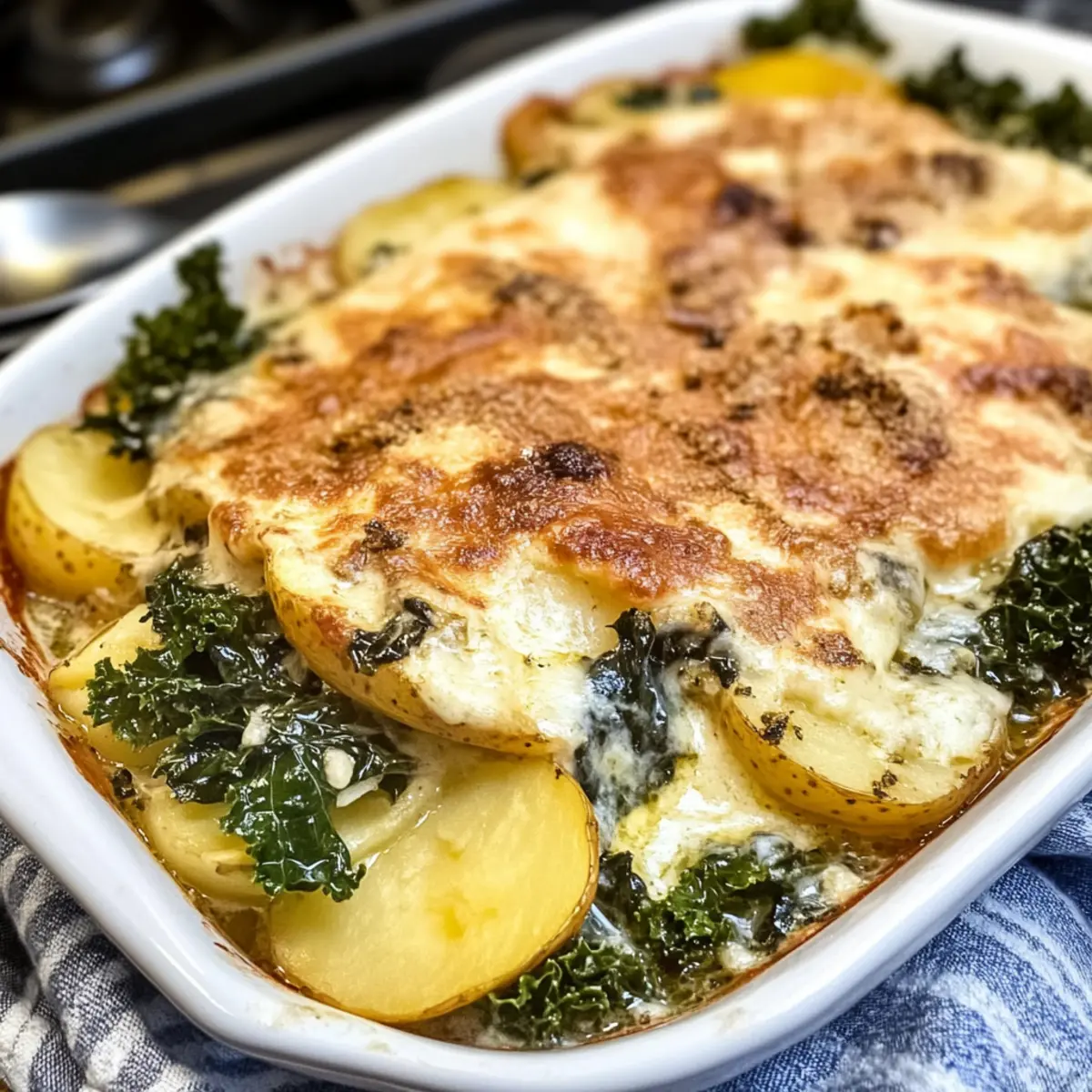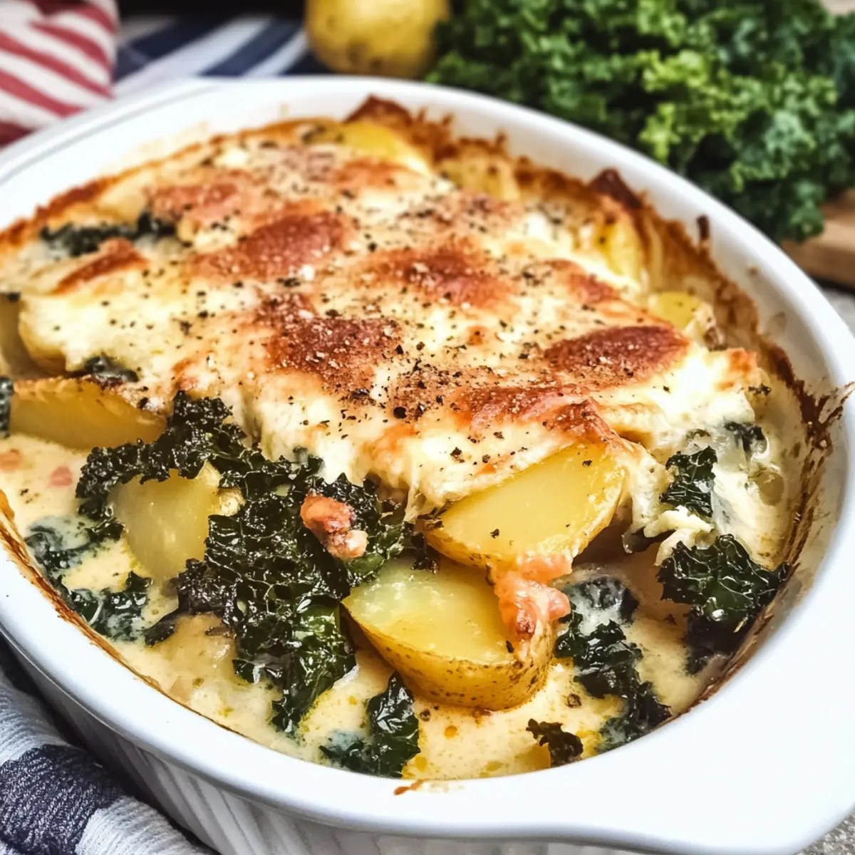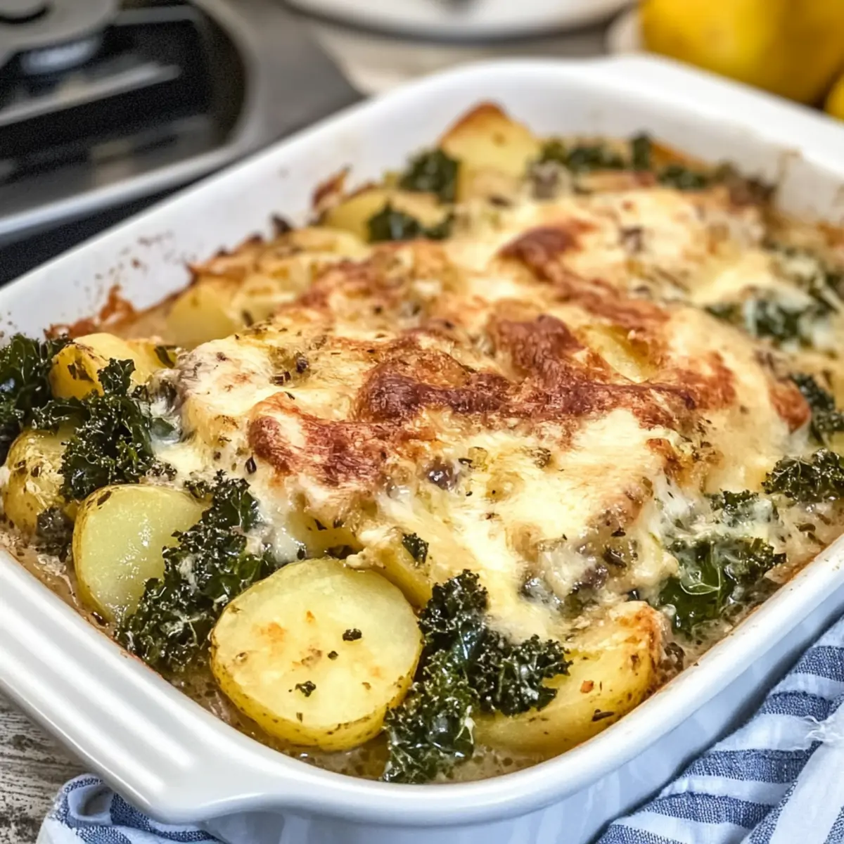 Welcher Komfort, wenn der Duft von frisch gebackenem Auflauf durch die Küche zieht! Heute lade ich dich ein, dein Abendessen mit meinem herzhaften Zuppa Toscana Auflauf zu bereichern. Diese schmackhafte Variante des klassischen italienischen Suppenrezepts kombiniert zarte Kartoffeln, würzige italienische Wurst, rauchigen Speck und nährstoffreiche Grünkohlblätter zu einem sättigenden Gericht, das sowohl den Gaumen als auch das Herz erfreut. Der Zuppa Toscana Auflauf ist nicht nur ein echter Hingucker auf dem Tisch, sondern überzeugt auch mit einfacher Zubereitung und einer Cremigkeit, die jeden Bissen zum Genuss macht. Ideal für Familienessen oder gemütliche Abende mit Freunden – lass uns gemeinsam in die Welt der italienischen Küche eintauchen! Bist du bereit, diesen köstlichen Auflauf auszuprobieren? Warum ist Zuppa Toscana Auflauf so besonders? Satisfaction garantiert! Der Zuppa Toscana Auflauf bringt die Aromen eines italienischen Klassikers direkt auf deinen Tisch. Einfachheit in der Zubereitung: Dieser Auflauf ist auch für Kochanfänger ein Kinderspiel. Vielfalt der Zutaten: Mit seinen zarten Kartoffeln, würzigen Wurststücken und nährstoffreichem Grünkohl wird jeder Biss zu einem Geschmackserlebnis. Kreativität ist gefragt! Du kannst gerne frische Pilze oder verschiedene Käsesorten hinzufügen, um deinem Auflauf eine persönliche Note zu verleihen. Zeitersparnis ist ebenfalls ein Pluspunkt: Bereite ihn am Vortag vor und schiebe ihn einfach in den Ofen, wenn Gäste da sind. Entdecke auch tolle Beilagen wie Erdbeer Spinat Genuss für ein rundum gelungenes Menü! Zuppa Toscana Auflauf Zutaten Hinweis: Für einen köstlichen Zuppa Toscana Auflauf benötigst du diese herzhaften Zutaten. Für die Schichtung • Bacon – sorgt für einen rauchigen und herzhaften Geschmack; bewahre 1/4 Tasse vom Bacon-Fett für die Sauce auf. • Italienische Wurst – bietet eine würzige, herzhafte Basis; stelle sicher, dass sie gekocht und zerbröselt ist, bevor du sie hinzufügst. • Russet-Kartoffeln – bildet die Basis und sorgt für eine angenehme Textur; dünn schneiden für gleichmäßiges Garen. • Weiße Zwiebel – verstärkt den Geschmack durch das Sautieren; jede Zwiebel-Variante kann als Ersatz genutzt werden. • Knoblauchpaste – verleiht aromatische Tiefe; frischer Knoblauch kann auch verwendet werden. • Grünkohl – trägt zur Nährstoffdichte und Farbe bei; gut waschen, hacken und die Stiele entfernen. Für die Sauce • Mehl – bindet die Sahnesauce für eine reichhaltige Konsistenz; kann durch glutenfreies Mehl ersetzt werden. • Hühnerbrühe – Basis der Sahnesauce; niedrigen Natriumgehalt für einen stärkeren Geschmack wählen. • Schlagsahne – sorgt für eine cremige Textur; Halbfettmilch kann eine leichtere Option sein. • Ei – fungiert als Bindemittel in der Sauce; gut temperieren, um ein Rührei zu vermeiden. • Salz und Pfeffer – nach Geschmack würzen; nach Vorliebe anpassen. • Parmesankäse – fügt einen herzhaften Käsegeschmack hinzu; kann für zusätzlichen Reichtum mit Mozzarella kombiniert werden. Step-by-Step Instructions für Zuppa Toscana Auflauf Step 1: Ofen vorheizen Heize den Ofen auf 200 °C (400 °F) vor und besprühe eine 23×33 cm große Auflaufform mit antihaftbeschichtendem Spray. Dadurch wird sichergestellt, dass dein Zuppa Toscana Auflauf nach dem Backen leicht herausgenommen werden kann, ohne an der Form festzukleben. Step 2: Kartoffeln schichten Verteile die dünn geschnittenen Russet-Kartoffeln gleichmäßig auf dem Boden der vorbereiteten Auflaufform. Diese Kartoffelschicht bildet die Basis und wird beim Backen weich und zart. Daraufhin schichtung die vorgegarte italienische Wurst und der zerbröselte Speck in einer gleichmäßigen Schicht. Step 3: Zwiebeln und Knoblauch sautieren Erhitze das reservierte Bacon-Fett in einer großen Pfanne bei mittlerer Hitze. Füge die gewürfelten Zwiebeln und die Knoblauchpaste hinzu und brate sie etwa 3-4 Minuten lang an, bis sie weich und leicht durchscheinend sind. Dies bringt Aromen in den Zuppa Toscana Auflauf und sorgt für eine aromatische Grundlage. Step 4: Grünkohl hinzufügen Gib den gehackten Grünkohl in die Pfanne und koche ihn weiter, bis er zusammengefallen ist, was etwa 2-3 Minuten dauert. Der Grünkohl fügt wertvolle Nährstoffe hinzu und wird in der Cremesauce wunderbar zart. Step 5: Sauce zubereiten Streue das Mehl über das Gemüse in der Pfanne und koche es für etwa 1 Minute unter Rühren. Dies hilft, die Sauce zu verdicken. Gieße dann langsam die Hühnerbrühe hinzu, während du ständig rührst, und lasse die Mischung köcheln, bis sie eindickt und blubbert. Step 6: Cremige Konsistenz erreichen Rühre die Schlagsahne unter die eindickende Mischung in der Pfanne. Temperiere das Ei, indem du es mit etwas von der heißen Flüssigkeit vermischst, bevor du es zurück in die Pfanne gibst. Gut vermischen, um ein gleichmäßiges und cremiges Ergebnis für den Zuppa Toscana Auflauf zu erzielen. Step 7: Käse und Sauce kombinieren Gib die Hälfte des geriebenen Parmesans in die Pfanne und rühre, bis der Käse geschmolzen und gut in die Sauce integriert ist. Gieße die cremige Sauce gleichmäßig über die Schichten aus Kartoffeln, Wurst und Speck in der Auflaufform. Step 8: Backen Decke die Auflaufform mit Aluminiumfolie ab und backe den Zuppa Toscana Auflauf für 50-60 Minuten. Entferne die Folie und bestreue den Auflauf mit dem restlichen Parmesan. Backe ihn danach für weitere 25-30 Minuten, bis der Auflauf goldbraun und sprudelnd ist. Step 9: Ruhen lassen Lass den Zuppa Toscana Auflauf nach dem Backen etwa 10 Minuten ruhen, bevor du ihn servierst. Diese Ruhezeit ermöglicht es der Sauce, sich zu setzen, was zu einer angenehmeren Textur beim Servieren führt. Zuppa Toscana Auflauf Variationen Lass deiner Kreativität freien Lauf und entdecke, wie du diesen Auflauf nach deinem Geschmack anpassen kannst! Leicht und gesund: Ersetze die italienische Wurst d
